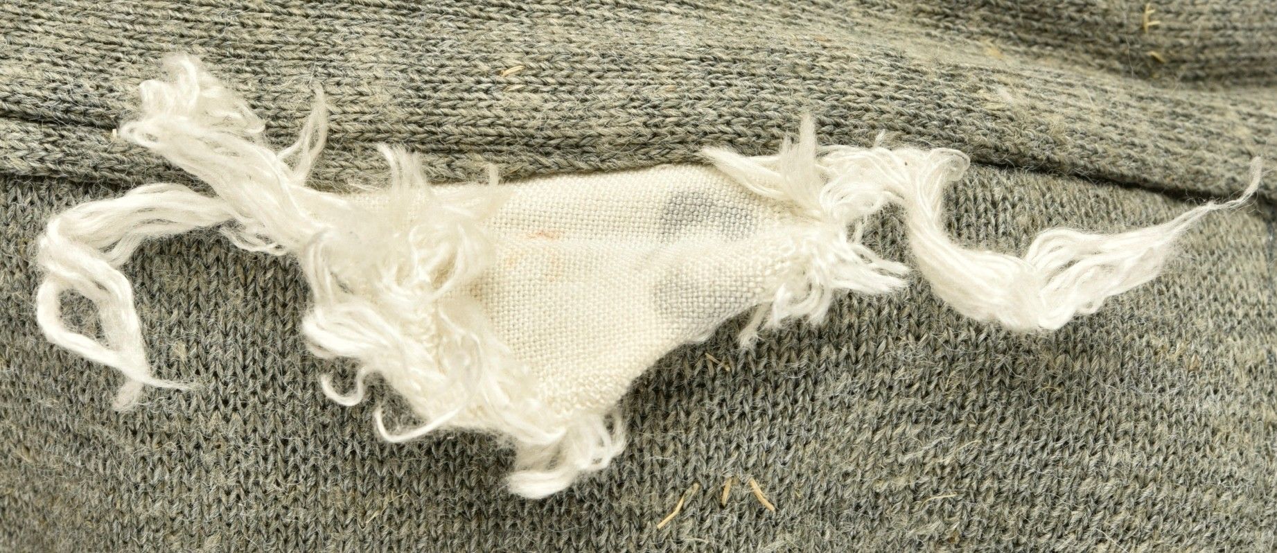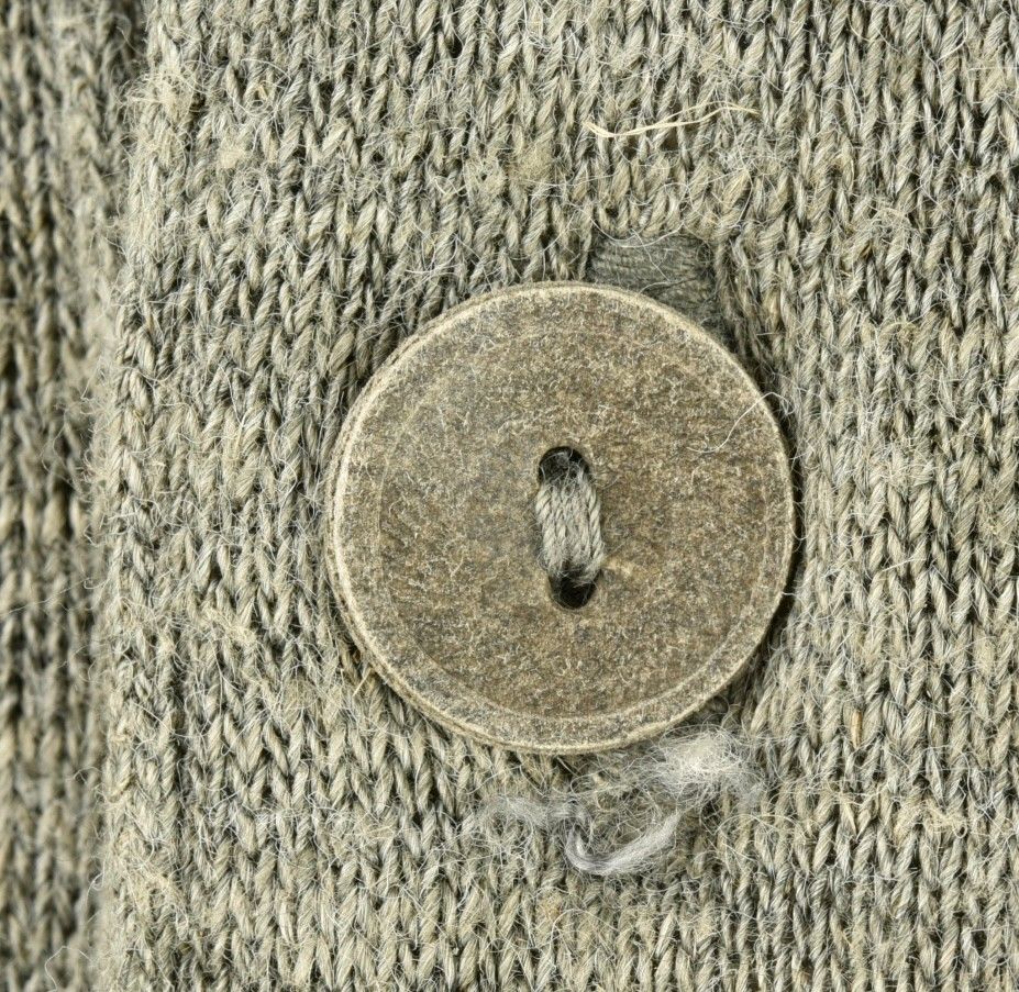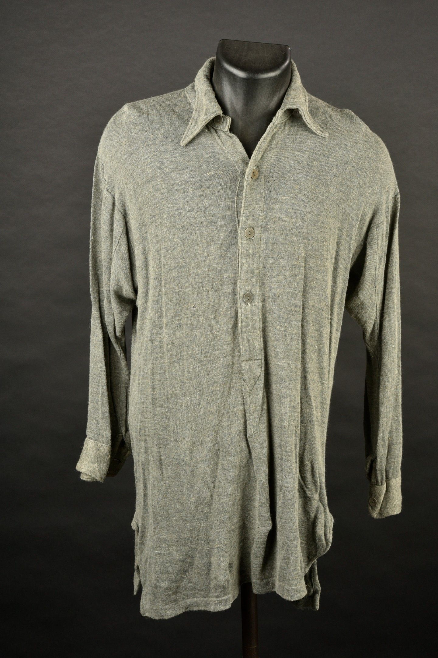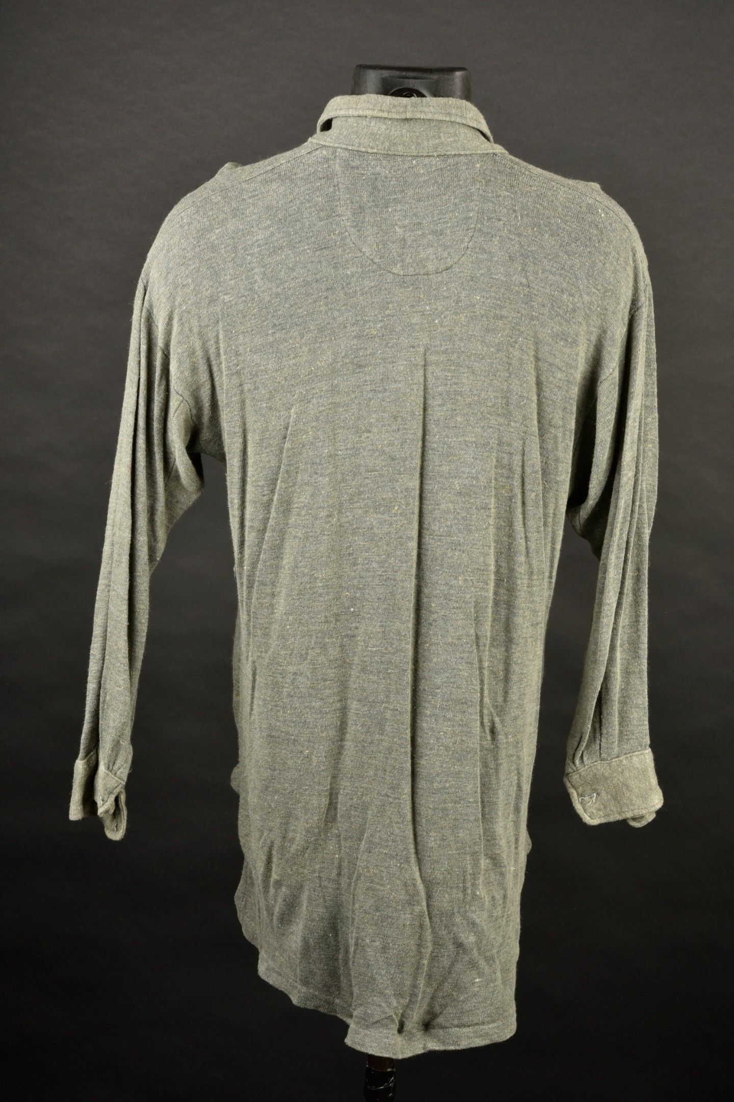 Chemise aertex. En tissu coton gris. Tous les boutons sont présents. Etiquette illisible dans le col. A noter une certaine usure et patine de la pièce, ainsi que quelques tâches. Etat II+. Collection Lemarchand Normandie. Aertex shirt in grey cotton fabric. All buttons present. Label inside collar illegible. Some wear, patina, and stains visible. Condition II+. Lemarchand Normandie Collection.