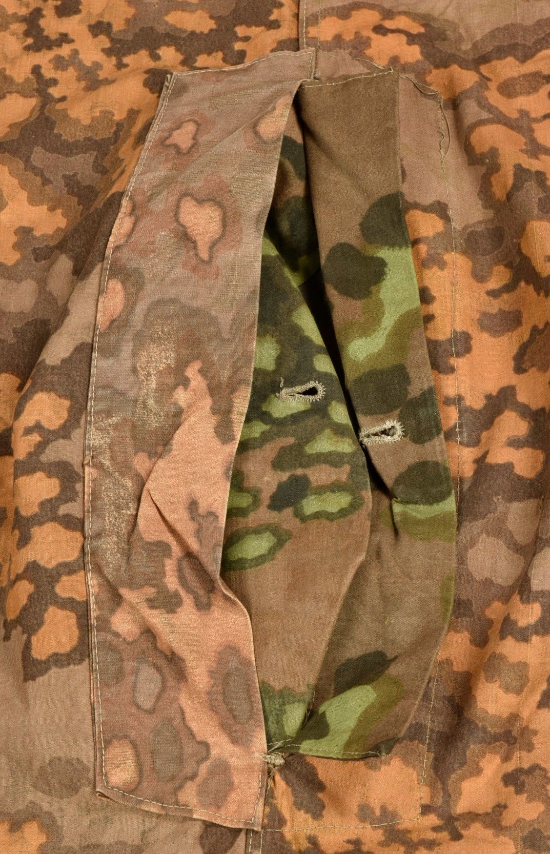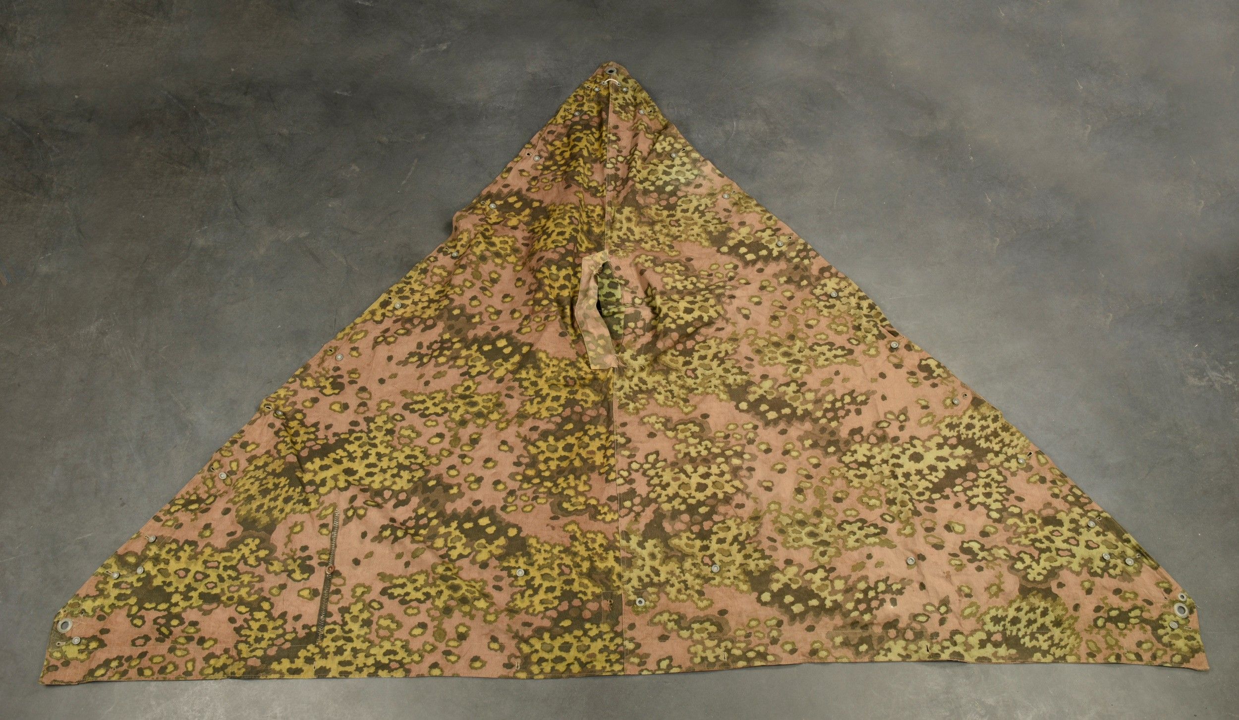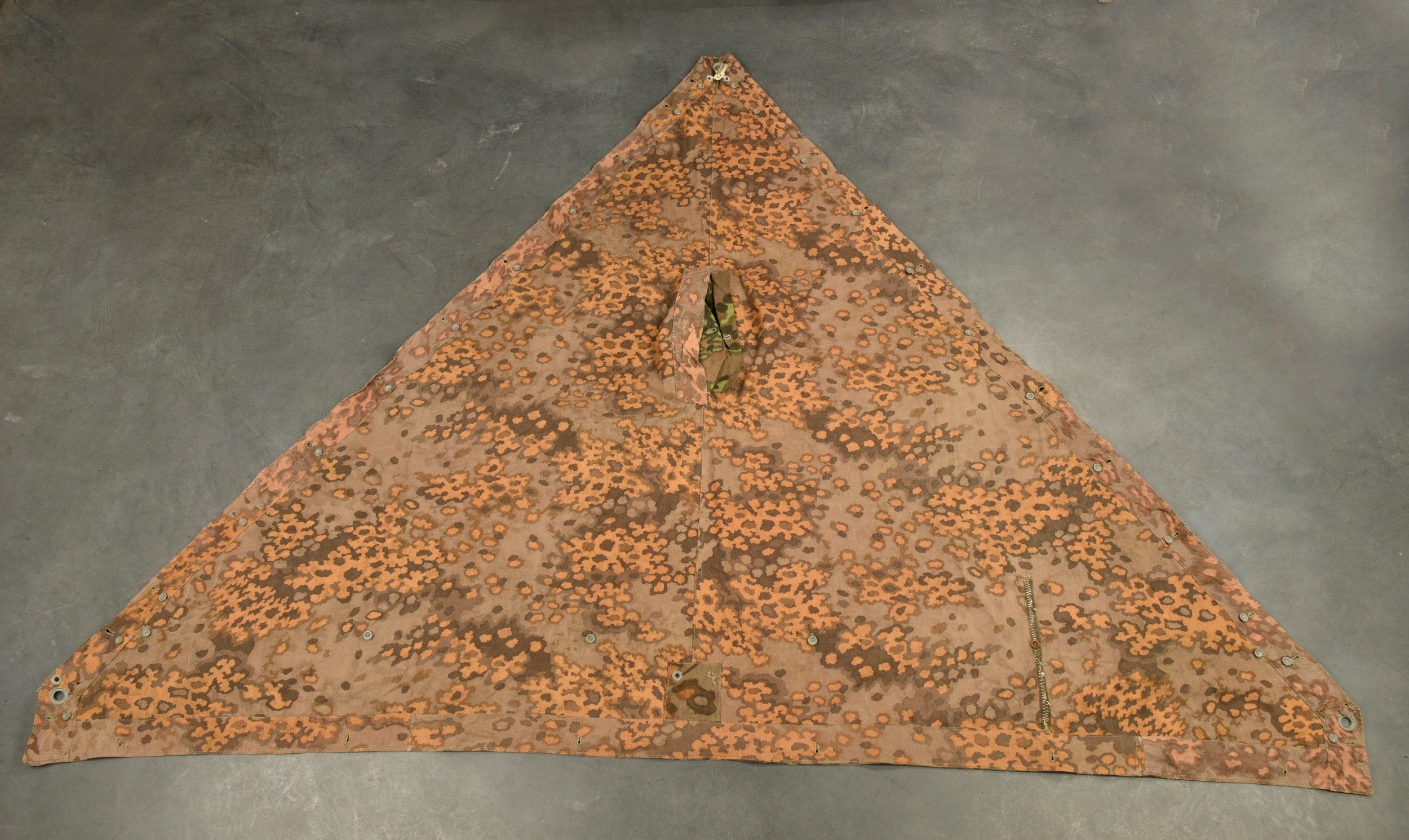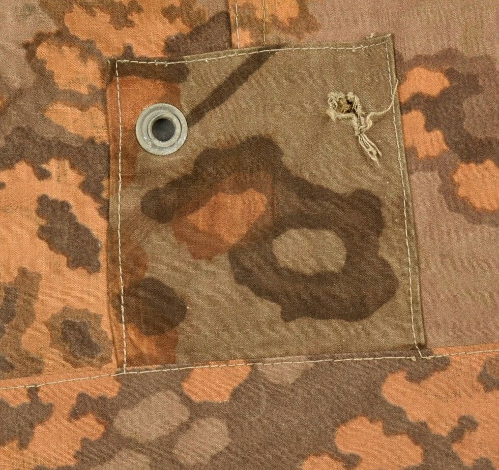 Toile de tente de la Waffen SS. En tissu camouflé feuilles de chêne. Le côté estival est composé de deux sortes de tissu différents, l'un tirant sur la couleur verte, et le second tirant sur la couleur jaune. La majorité des boutons sont présents. Certaines cordelettes sont absentes. A noter une certaine usure et patine de la pièce, ainsi que quelques tâches et accrocs. Etat II+. Collection Lemarchand Normandie. Waffen-SS camouflage shelter quarter in oak leaf pattern. Summer side made of two different fabric tones, one green and one yellow. Most buttons intact, some cords missing. Shows wear, patina, stains and small tears consistent with field use. Condition II+. Lemarchand Collection, Normandy.