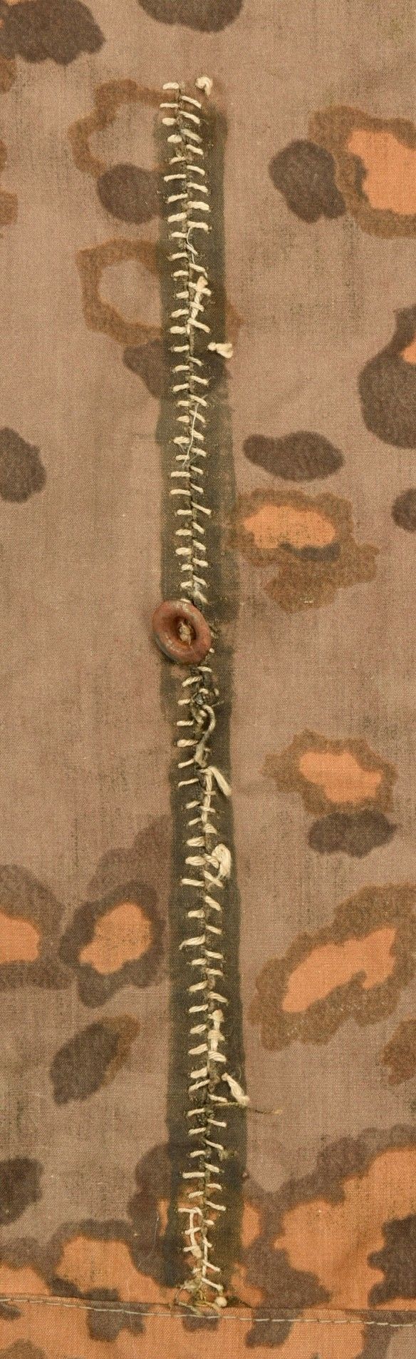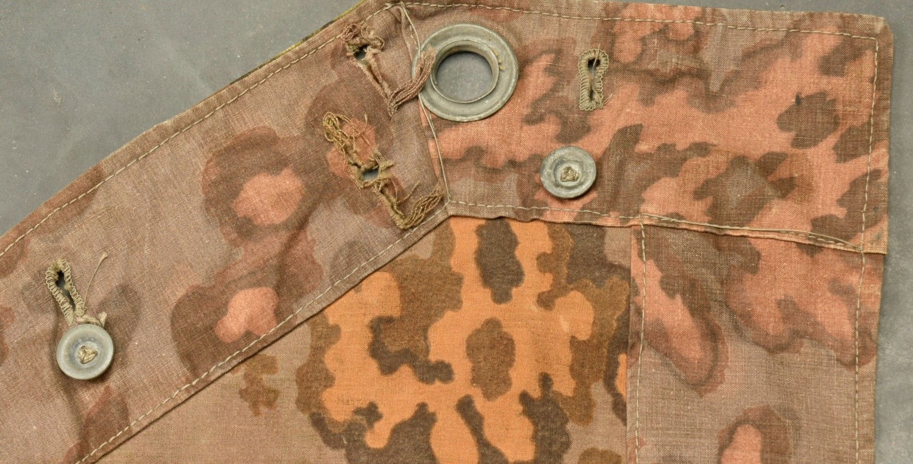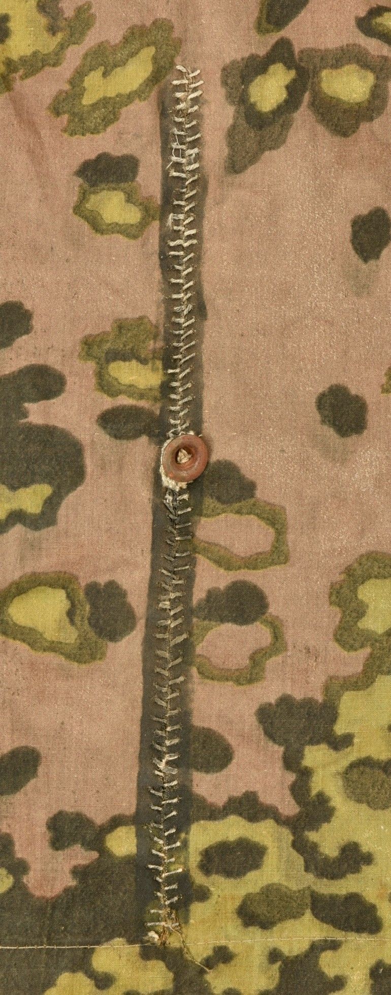 Toile de tente de la Waffen SS. En tissu camouflé feuilles de chêne. Le côté estival est composé de deux sortes de tissu différents, l'un tirant sur la couleur verte, et le second tirant sur la couleur jaune. La majorité des boutons sont présents. Certaines cordelettes sont absentes. A noter une certaine usure et patine de la pièce, ainsi que quelques tâches et accrocs. Etat II+. Collection Lemarchand Normandie. Waffen-SS camouflage shelter quarter in oak leaf pattern. Summer side made of two different fabric tones, one green and one yellow. Most buttons intact, some cords missing. Shows wear, patina, stains and small tears consistent with field use. Condition II+. Lemarchand Collection, Normandy.