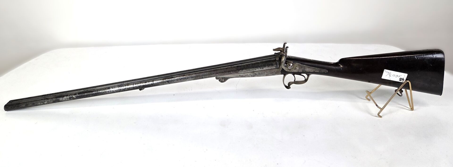 Fusil juxtaposé à broche système Lefaucheux, calibre 16, garnie avec reste de nickelage surligné d'un filet doré. Mécanisme fonctionnel.