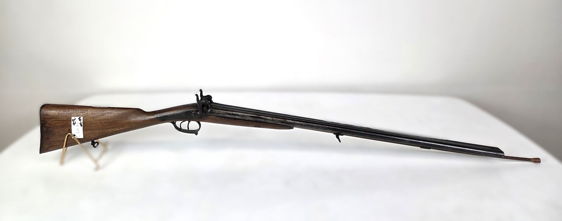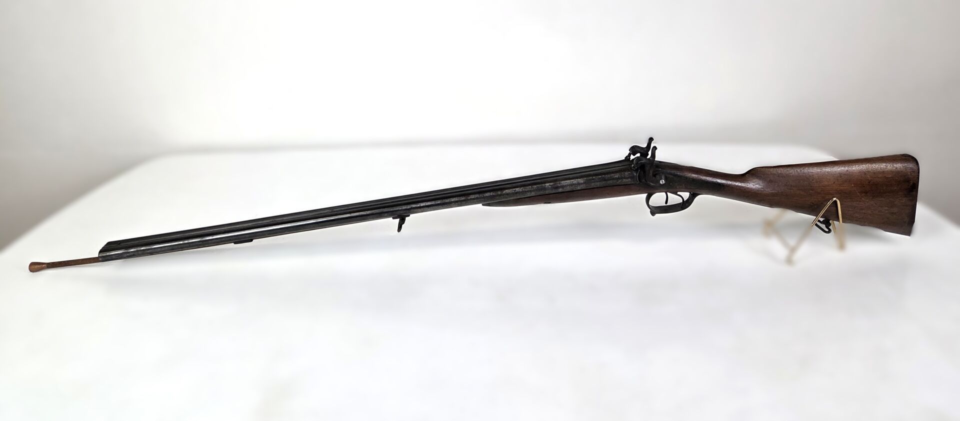 Fusil juxtaposé à percussion et platines à l'arrière canon en table lisse au calibre de 16 balles à la livre. Visse de carré de noix à gauche remplacé, alignement des chiens non synchronisé à l'armé, mécanisme fonctionnel.