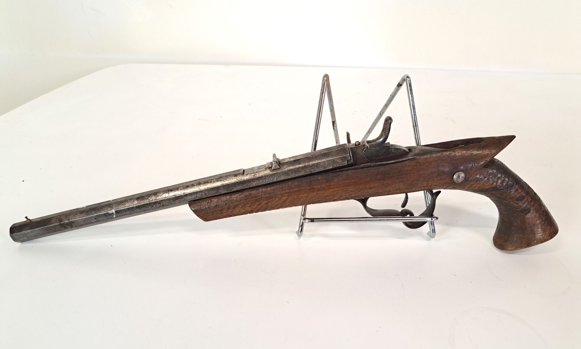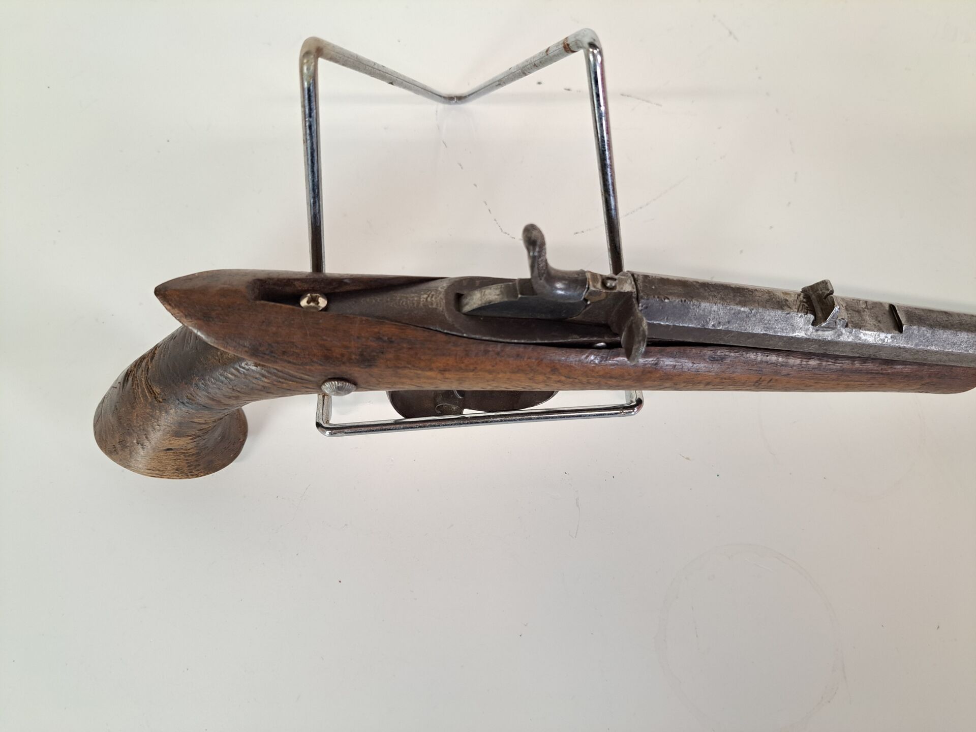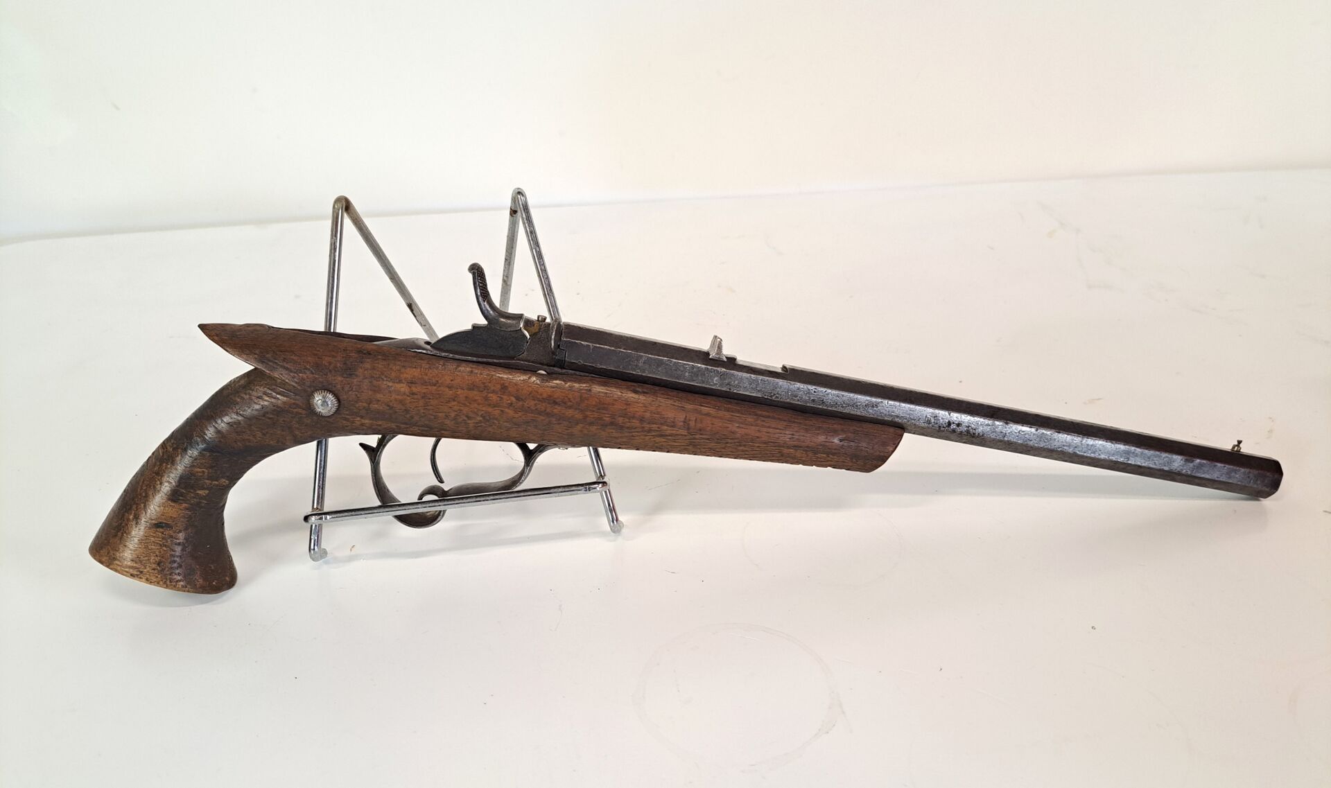 Transformation en pistolet de manière artisanale une carabine système Flobert mono coup calibre 9 mm, hausse remplacée, monture de la carabine modifiée en pistolet, mécanisme fonctionnel, Etat 2