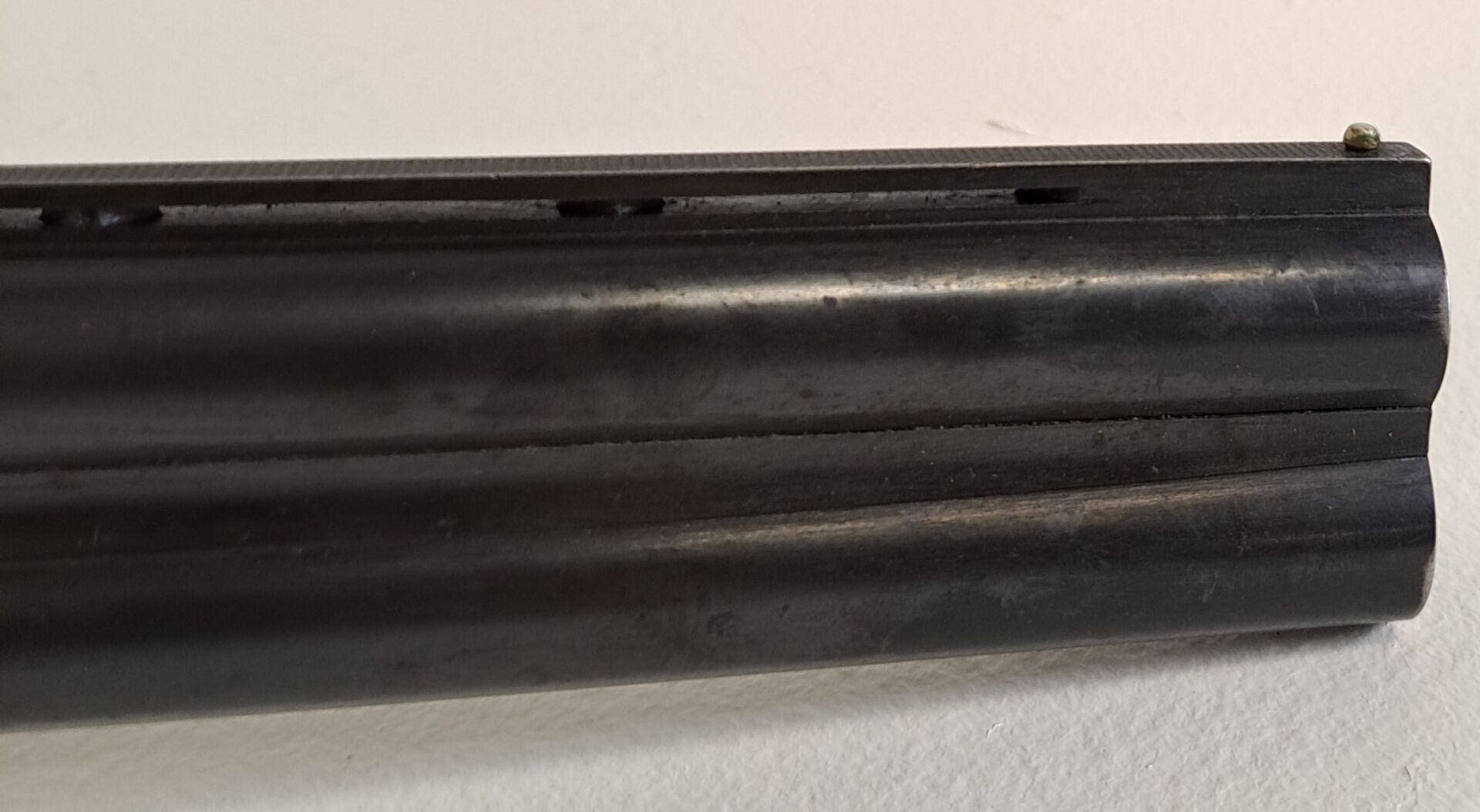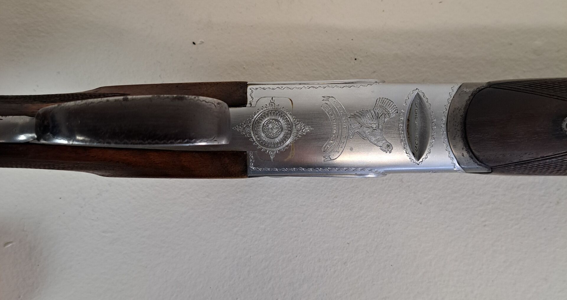Fusil superposé italien calibre 12/70 à extracteur, fabrication CESARE PELI pour Rostain armurier à Toulouse, arme numéro 7314, canon à bandes ventilées de 700 mm de long, bascule vieil argent à décor sur les flancs de volutes florales et sous la bascule d'un tétras au chant. Crosse demi pistolet en noyé vernis de 390mm de long avec rallonge bois de 45mm de long et plaque anti-recul slip ad. Mécanisme fonctionnel pas de jeu double détente