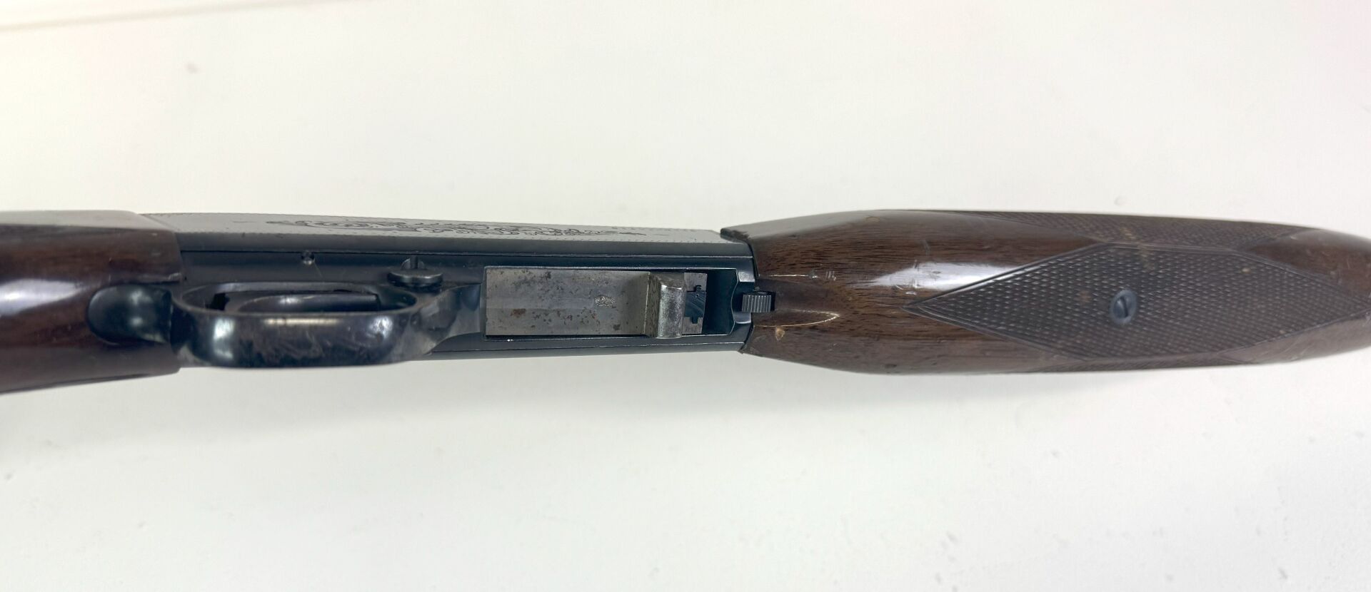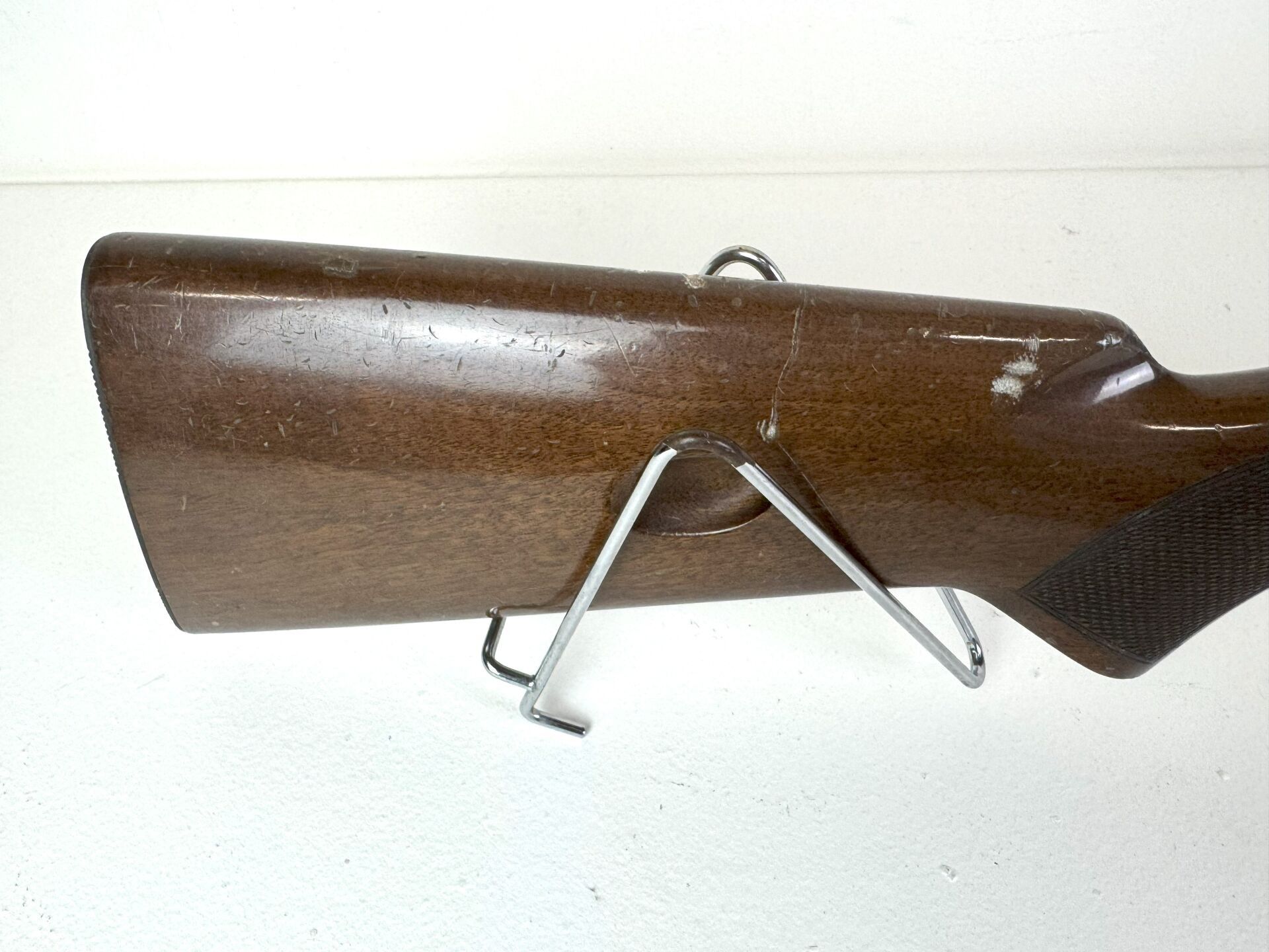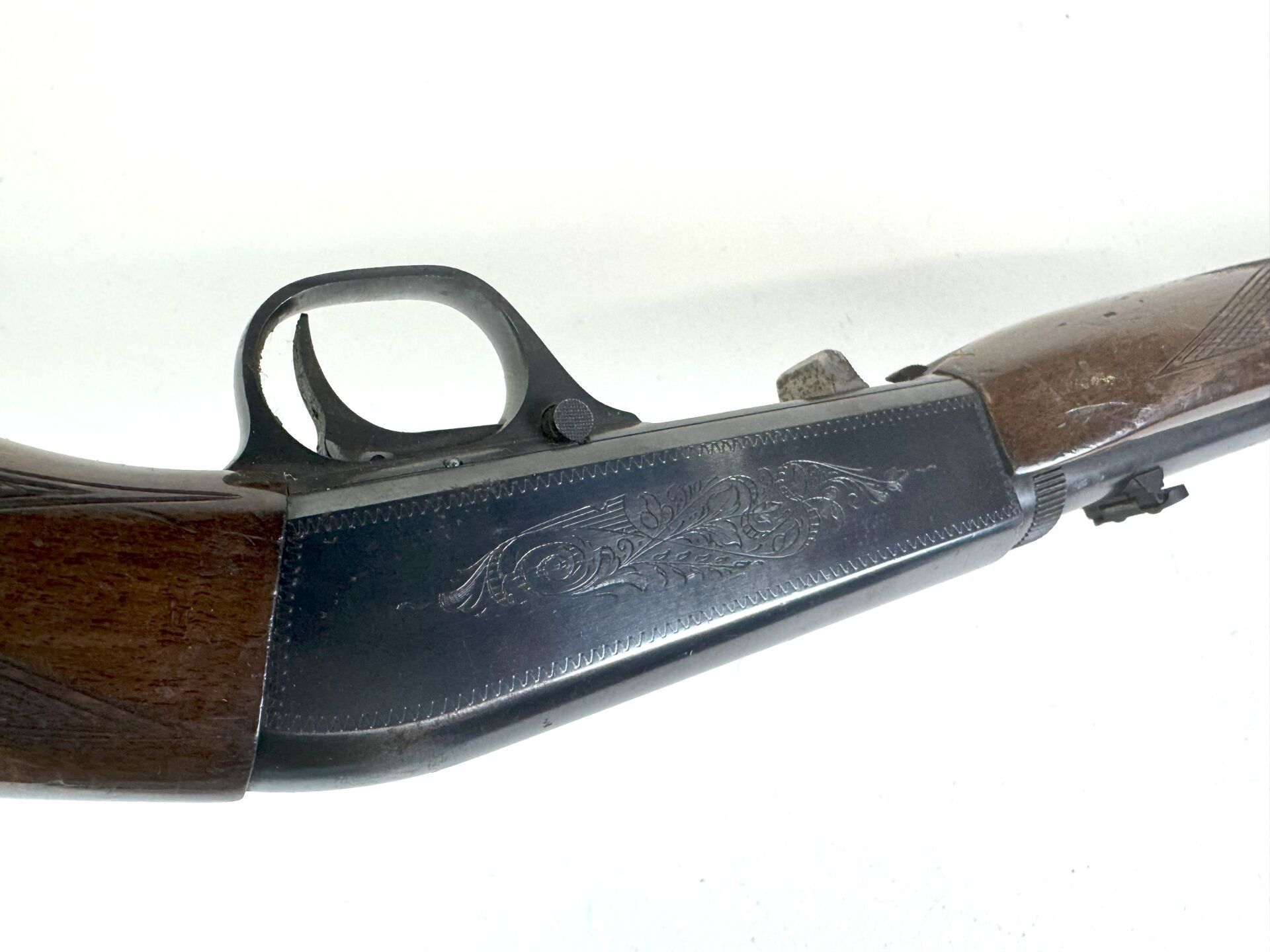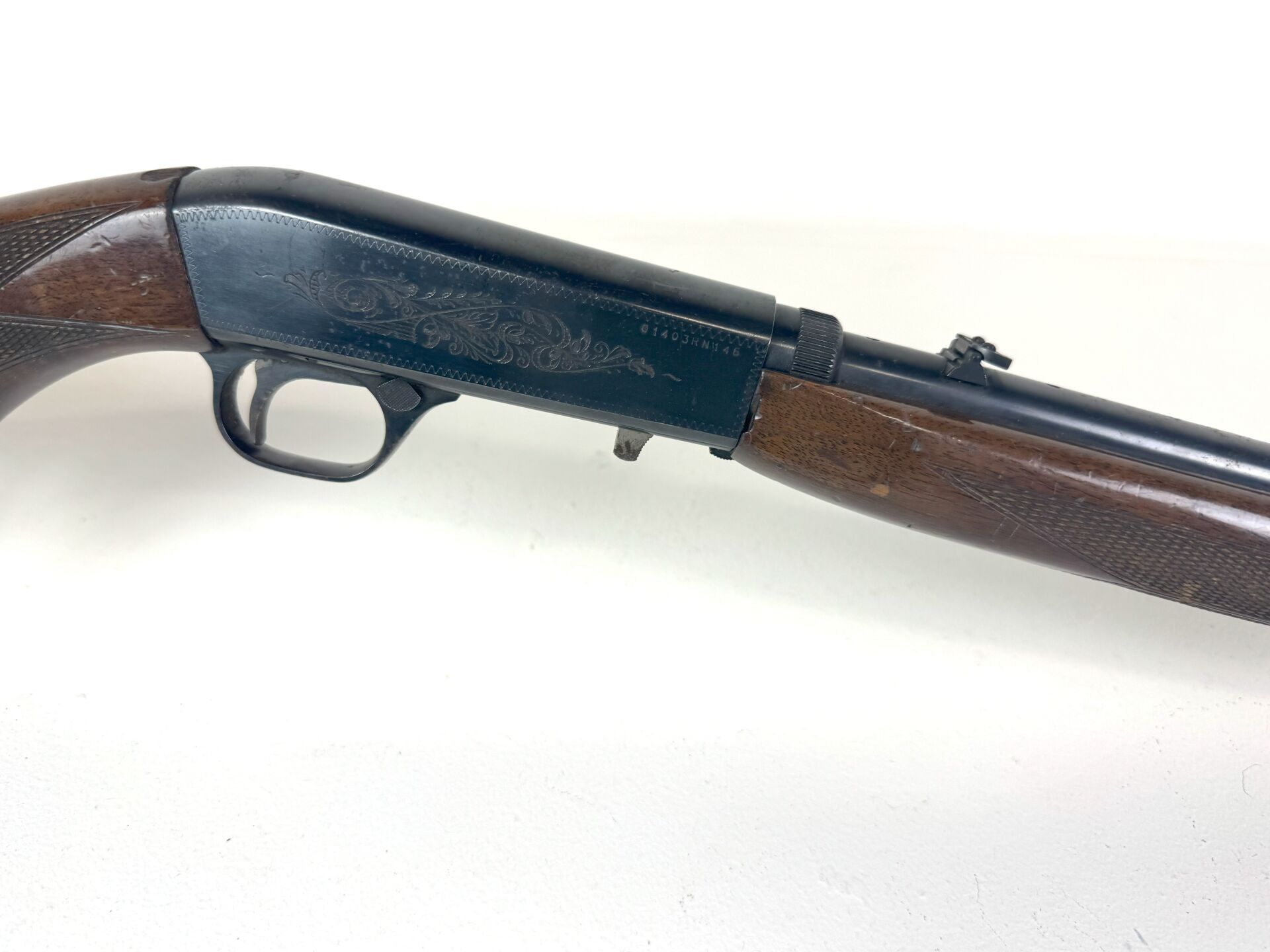 Carabine semi-automatique Browning calibre 22short Fabrication japonaise, chargement par magasin tubulaire dans la crosse. Modèle démontable "Takedown" Canon de 550mm Léger jeu au devant. Beau canon a nettoyer. Défaut de percussion numéro 01403RN146