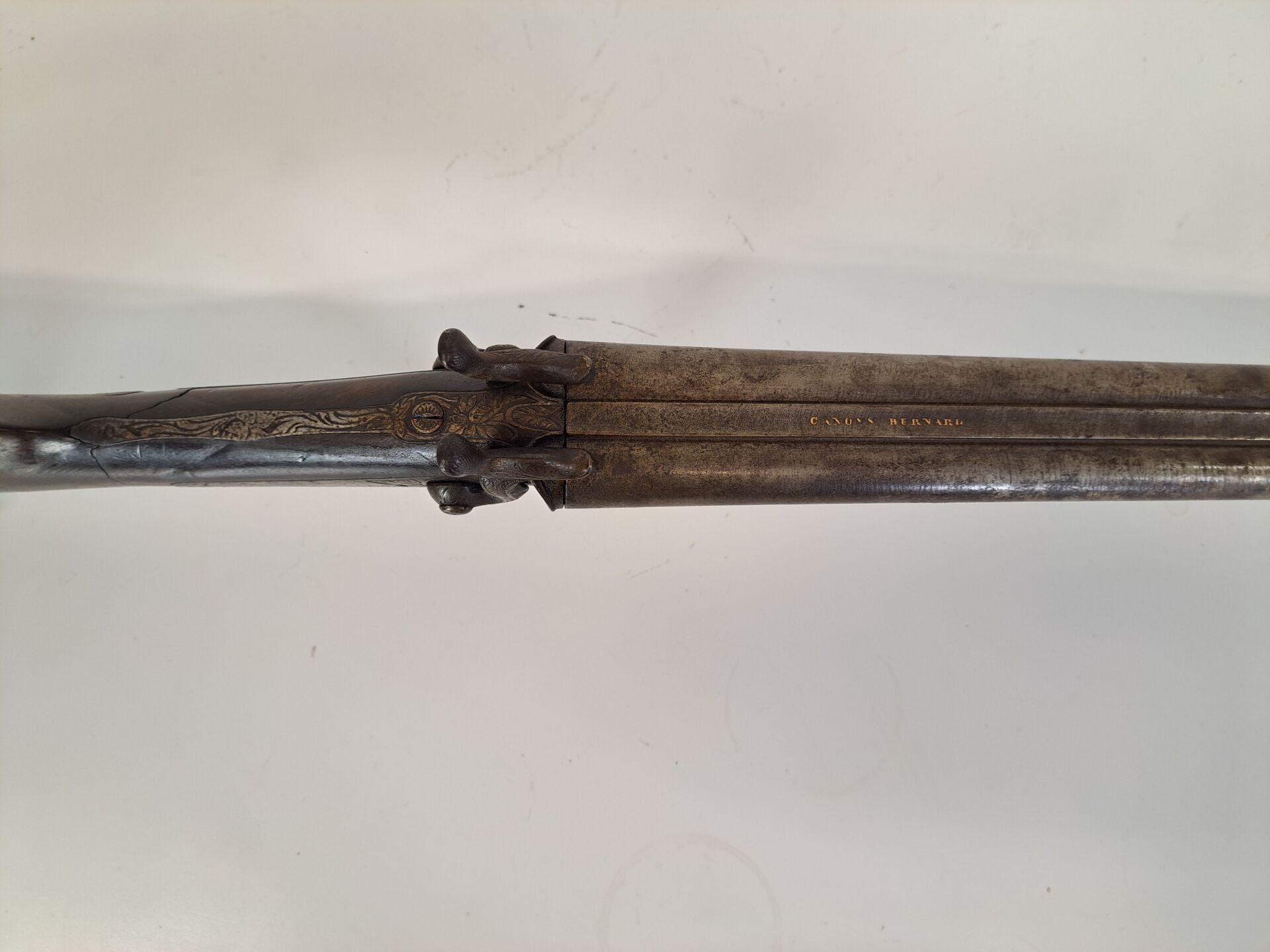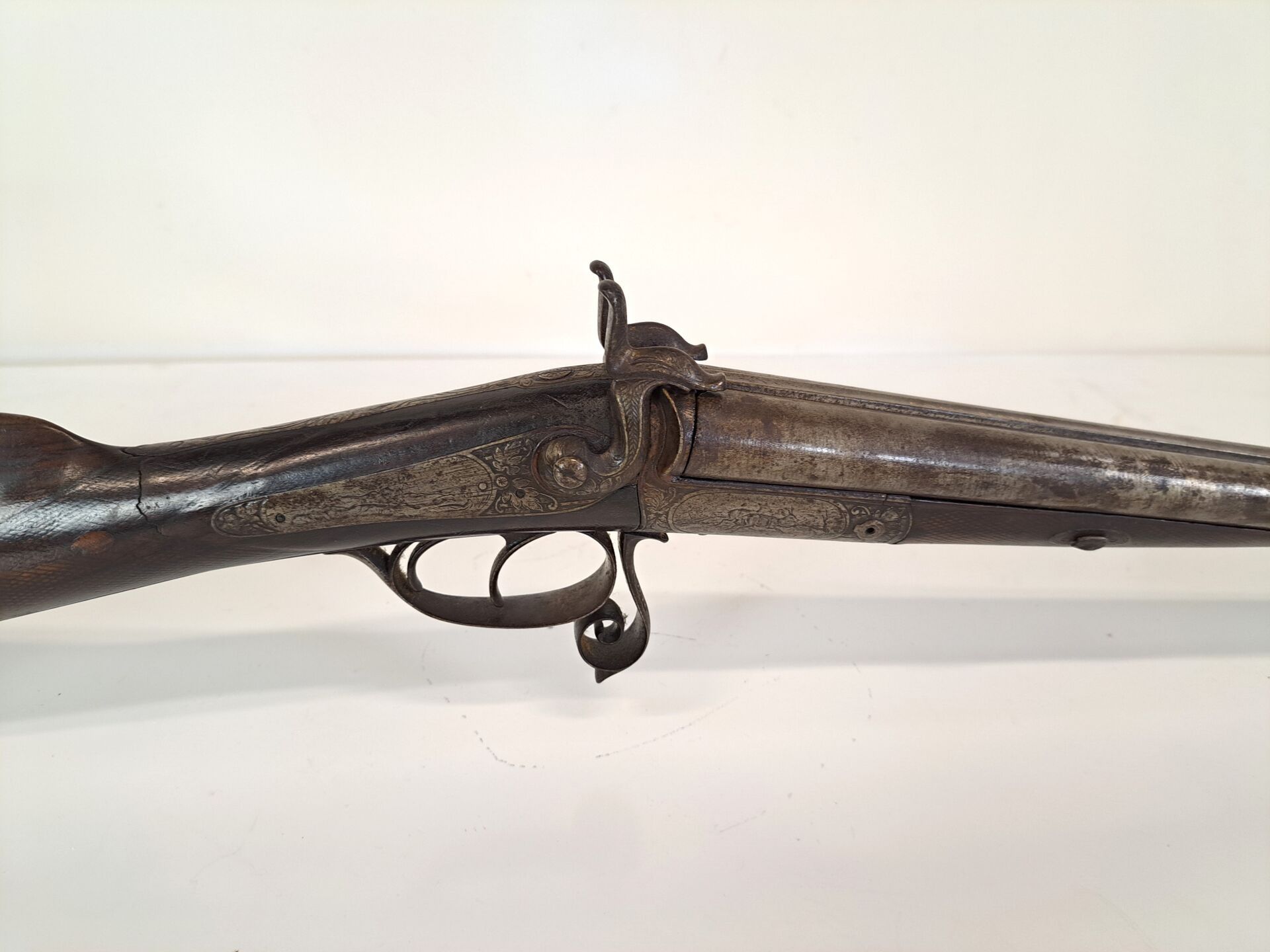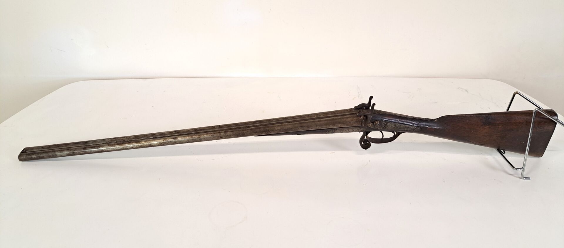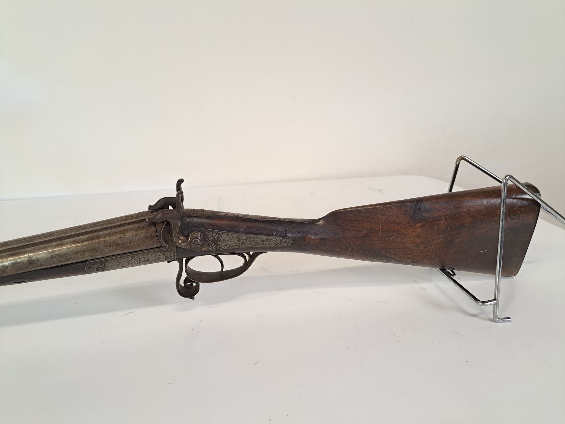 Fusil juxtaposé a broche calibre 16 à broche. Ouverture par clef sous le pontet. Modèle gravé