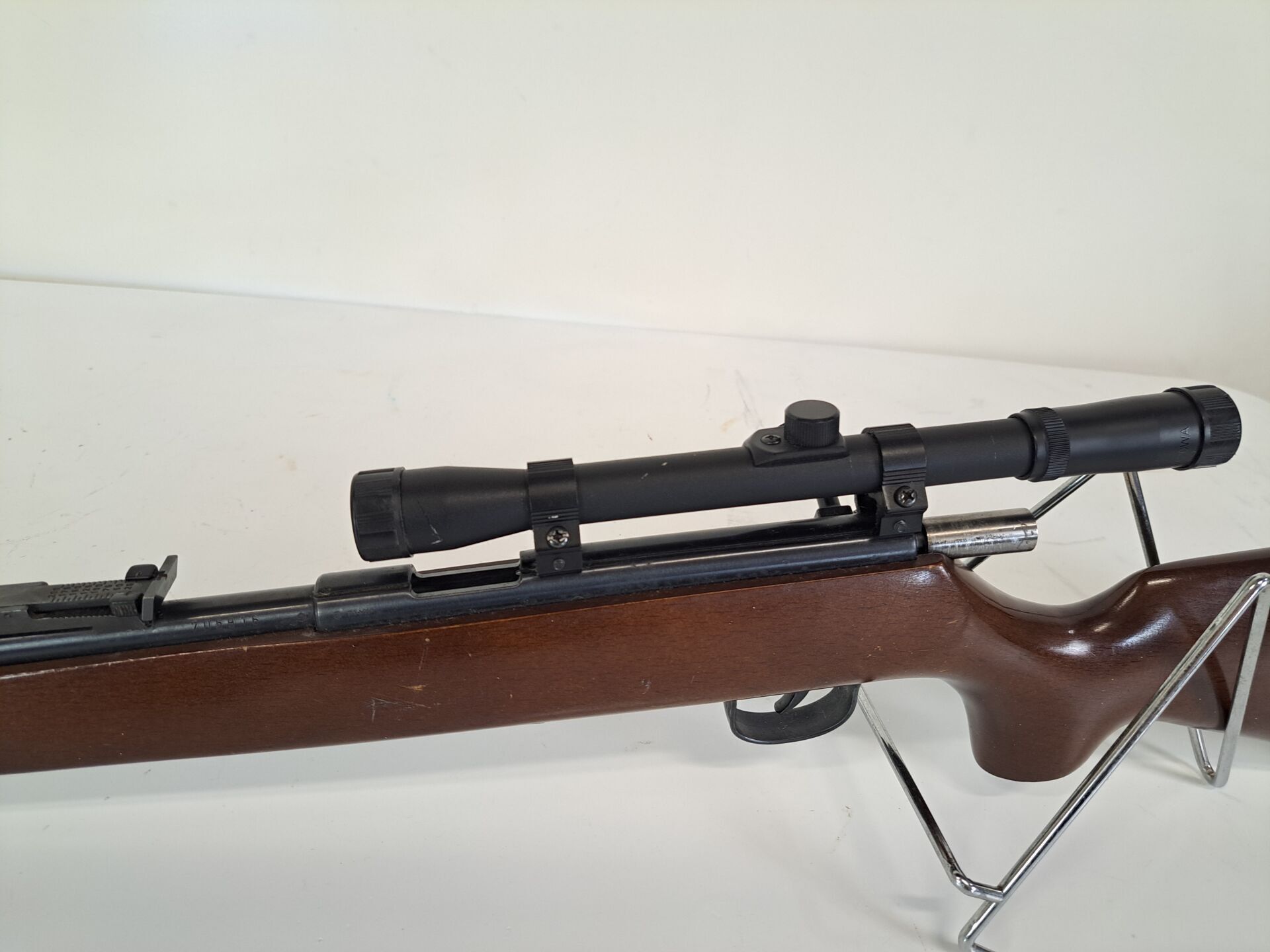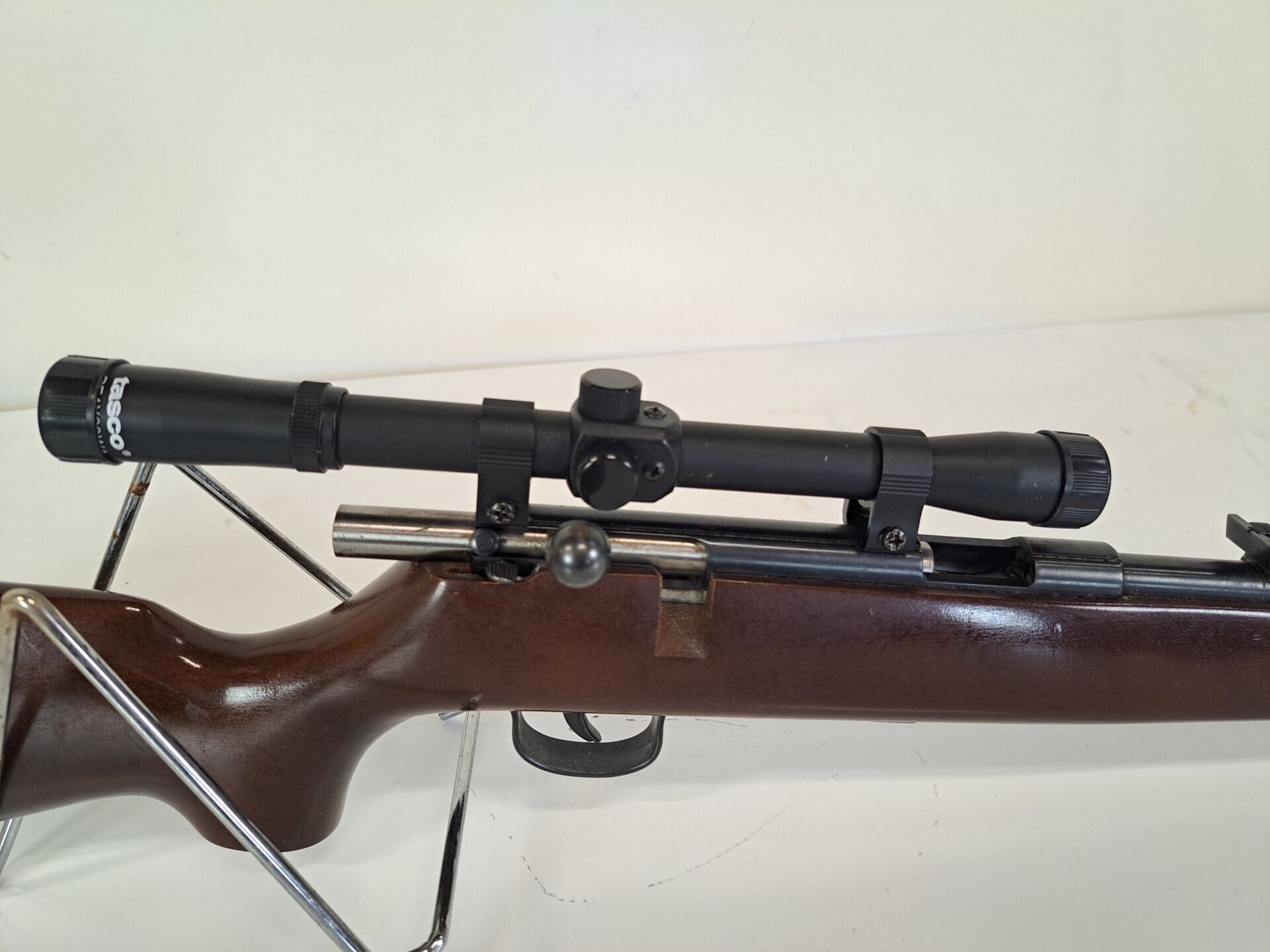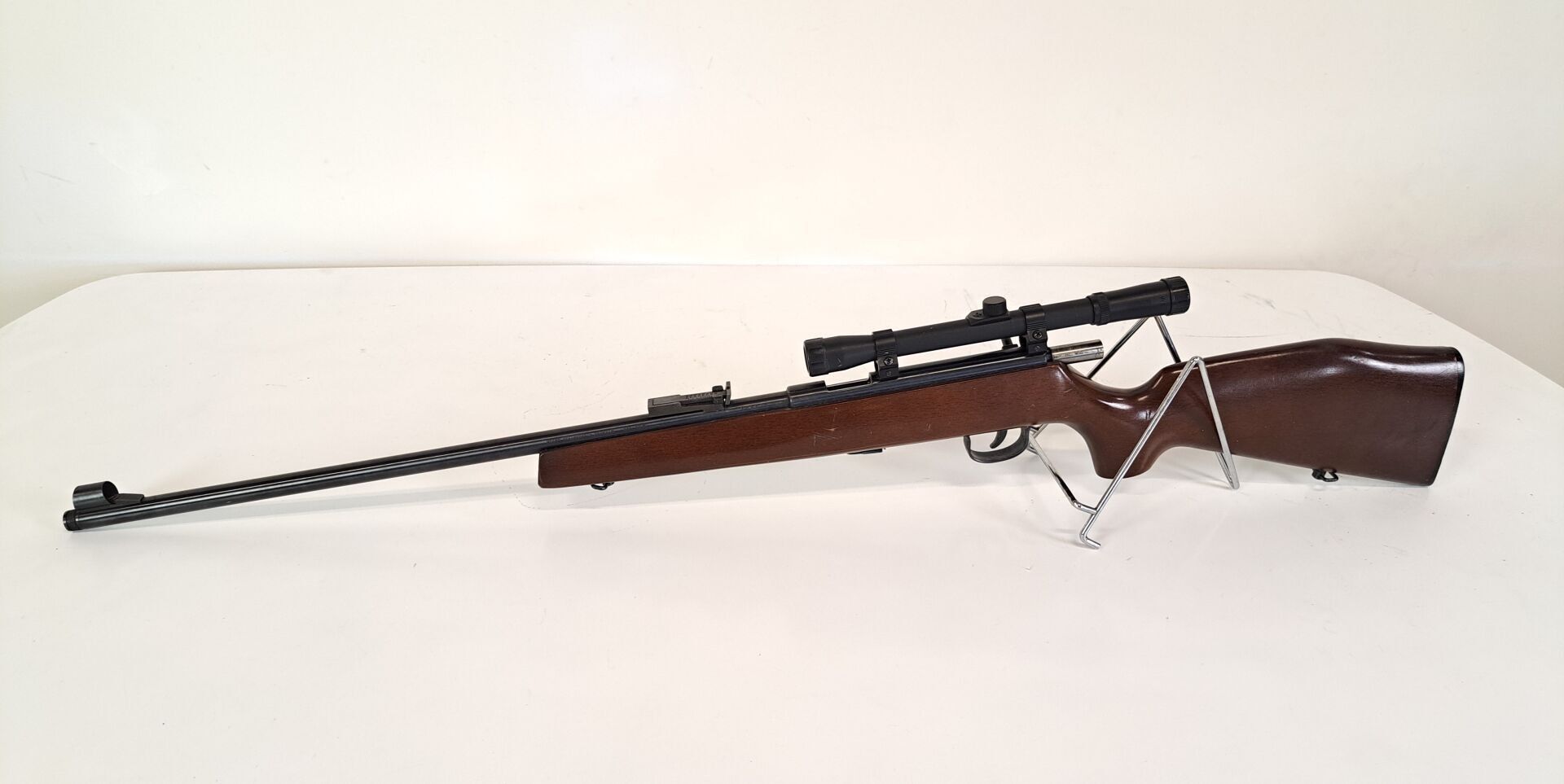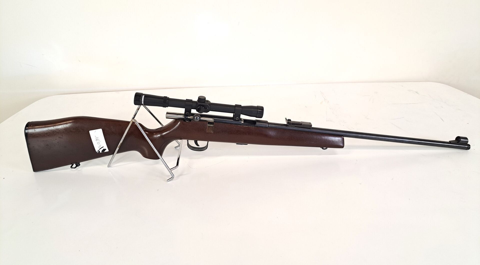 Carabine à répétition manuelle fabrication allemande VOERE, canon 22 LR, 5 coups, canon de 545 mm fileté pour silencieux, crosse pistolet en bois verni, arme livrée avec une lunettes de carabine à air comprimé (buée dans la lentille de sortie, netteté difficile à obtenir), arme numéro 705916, RGA AQ252, Etat 1, mécanisme fonctionnel. Catégorie C