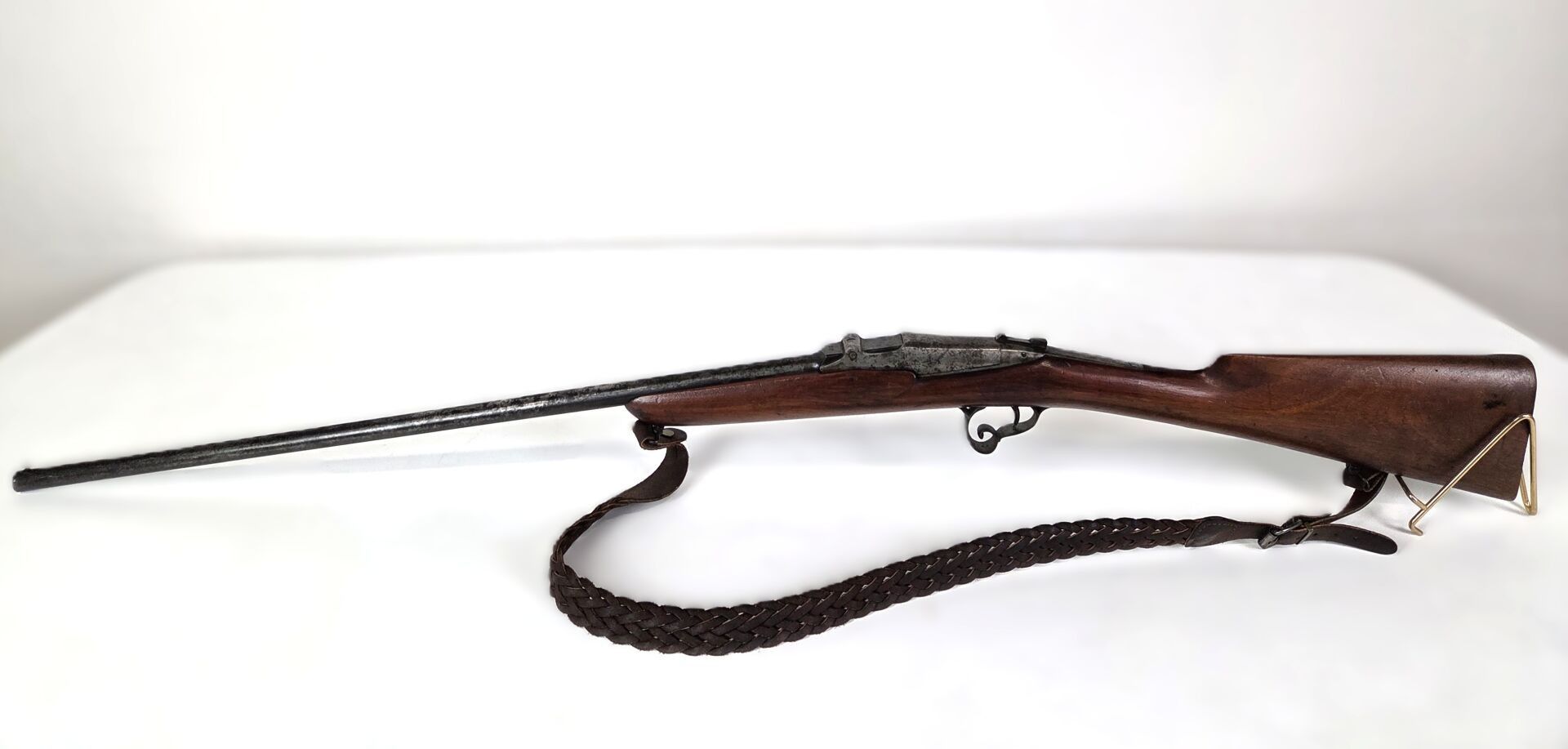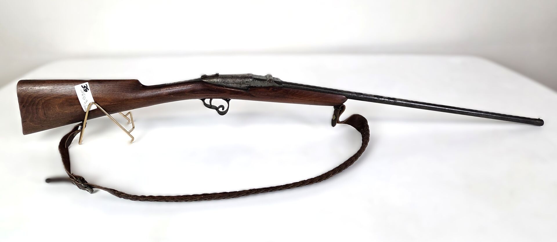 Carabine système Warnant à ouverture et éjection automatique (lorsqu'on tire le levier de verrouillage la culasse se lève brusquement et l'extracteur se recule induisant l'éjection de la douille). Canon rond, calibre 14 mm. Plat du canon marqué JG, pontet à volute. Armement du chien par basculement de la culasse vers l'avant du canon. Mécanisme fonctionnel.