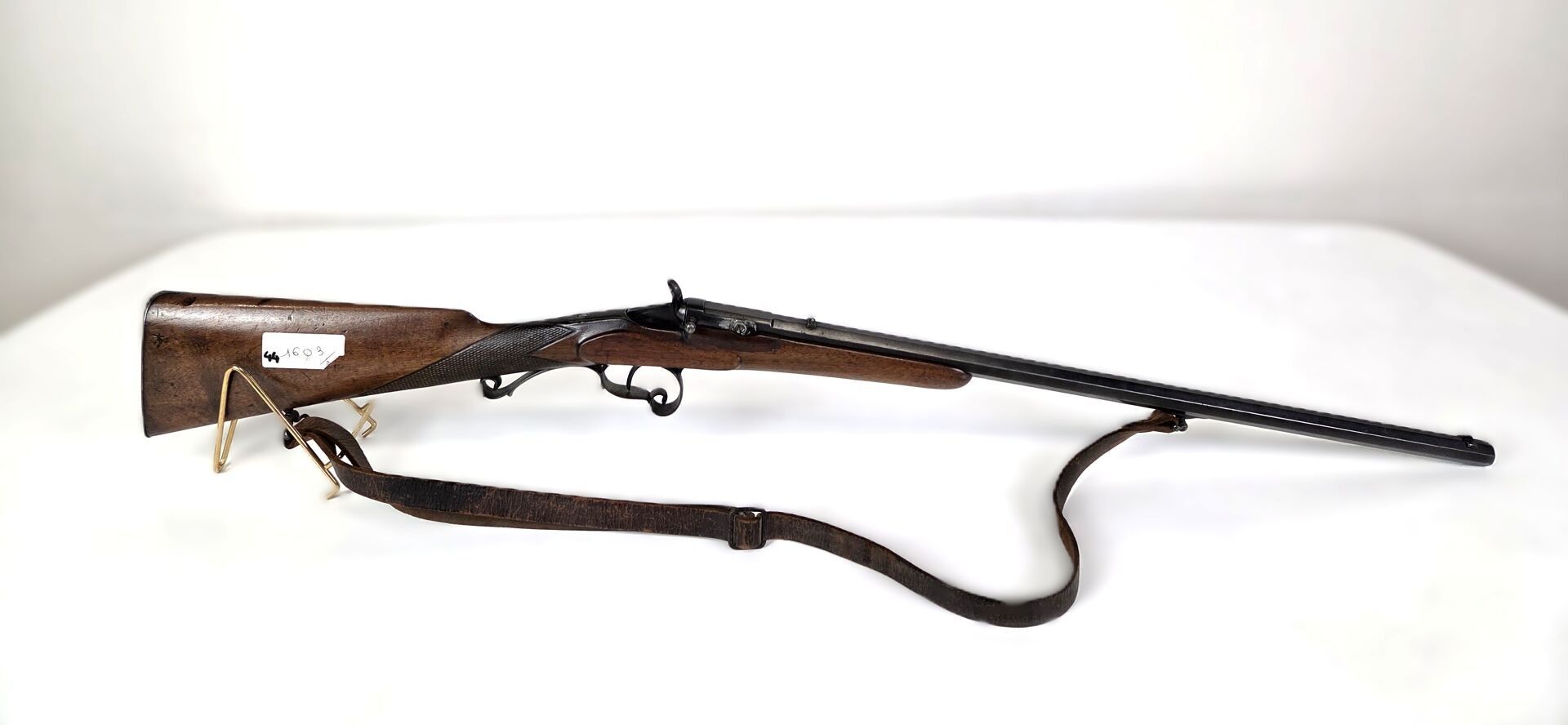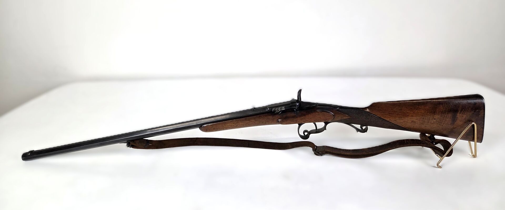 Carabine de jardin système Flobert, calibre 9 mm Flobert, culasse ascentionnelle (ressoudée au niveau des visses de basculage), canon octogonal sur queue d'aronde, pontet à volute et repose paume, crosse anglaise quadrillée, mécanisme fonctionnel. Etat 1 - Catégorie D