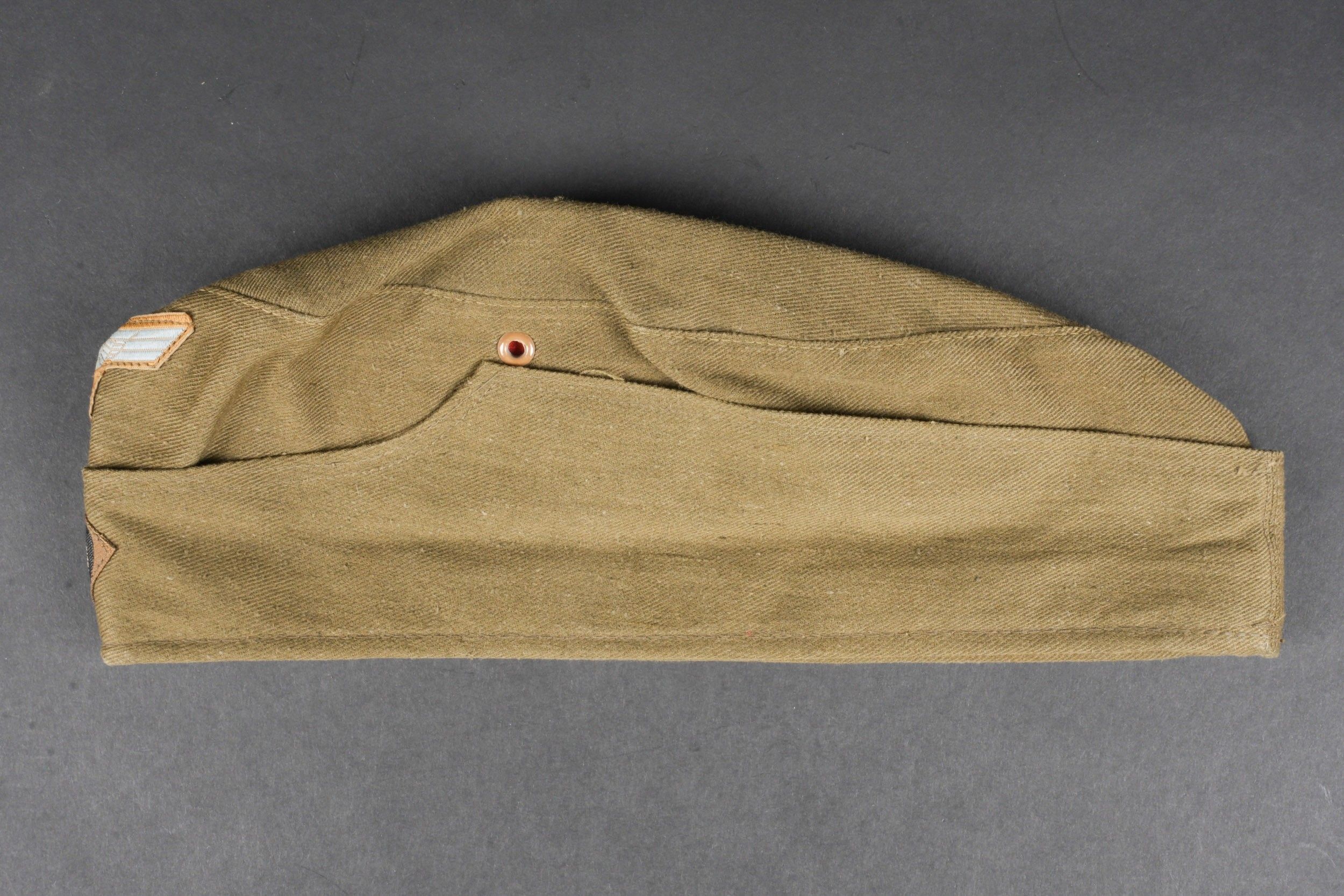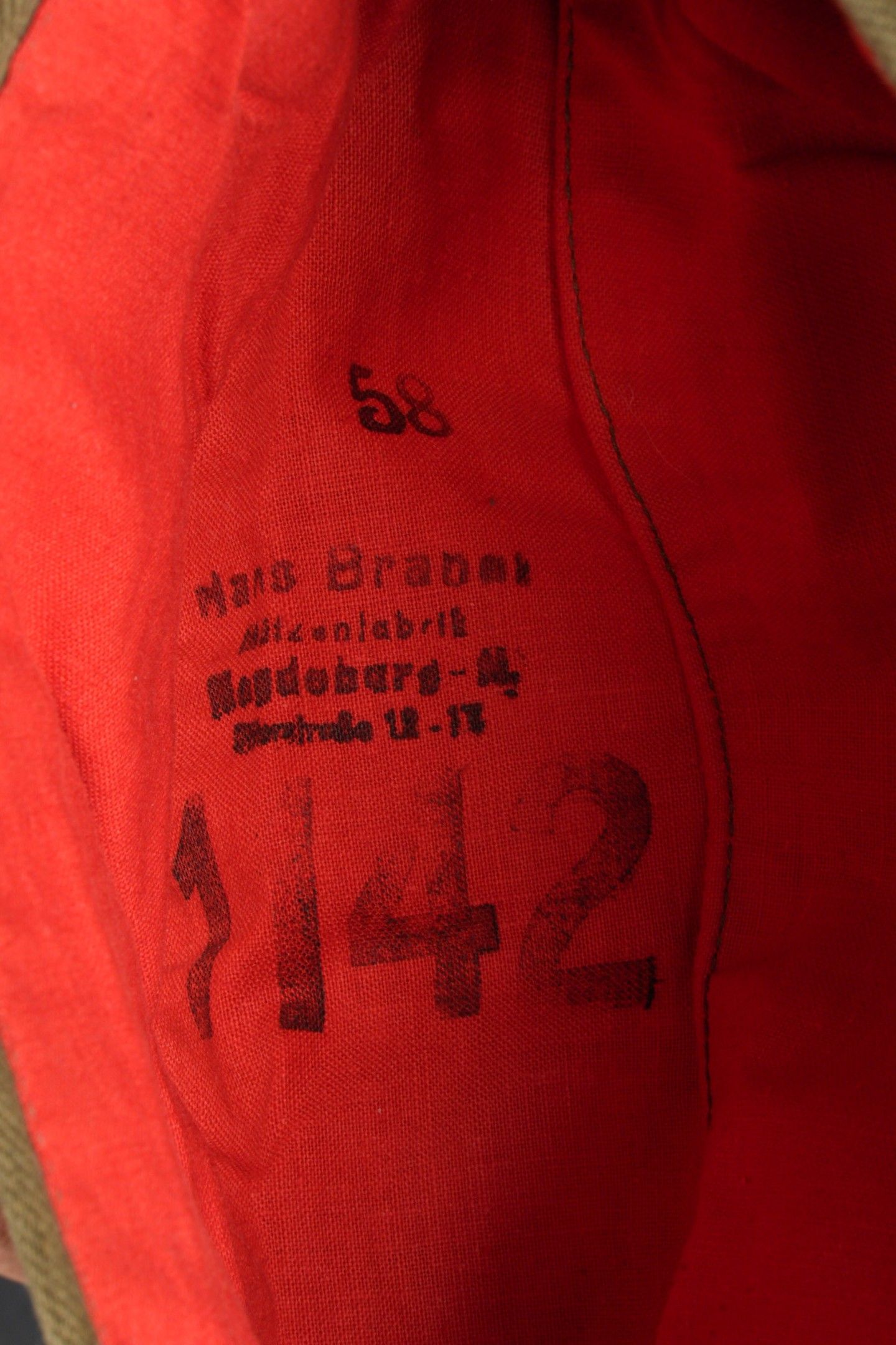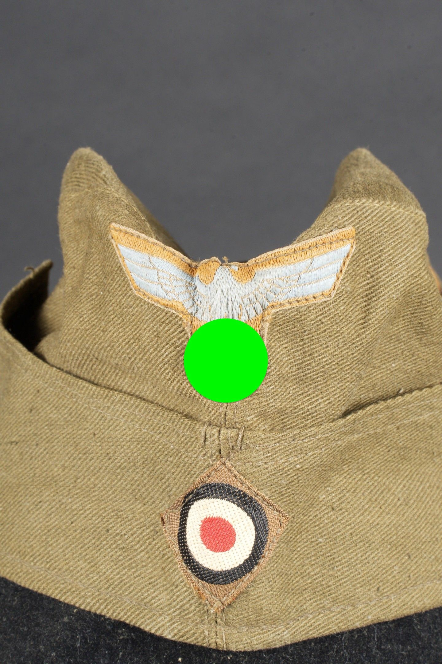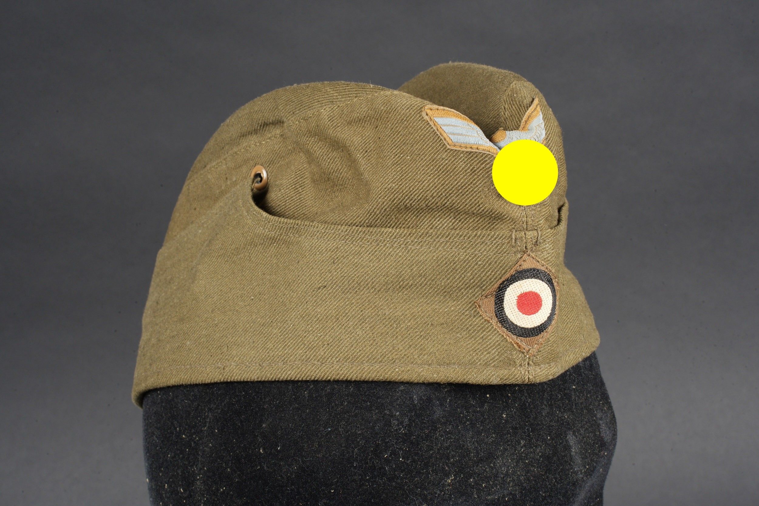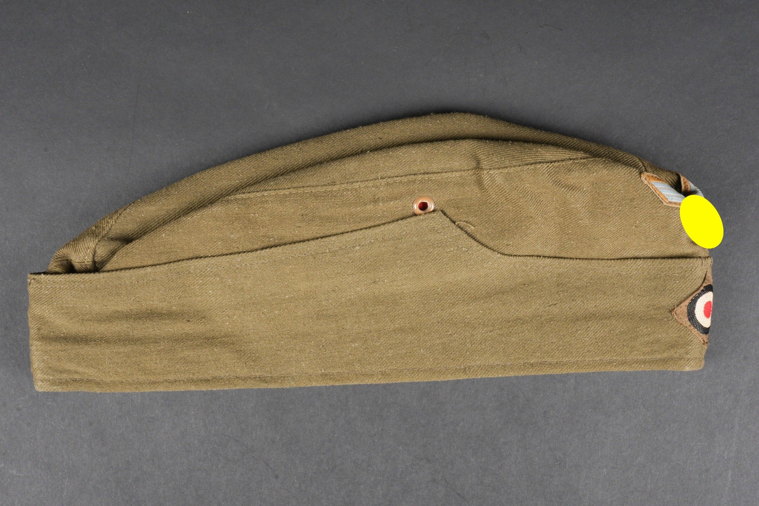 Calot tropical Heer. En tissu coton vert olive. Aigle et cocarde Bevo sur fond couleur jaune sable, cousus d'origine. Un œillet d'aération en couleur d'origine. Intérieur doublé en tissu coton rouge. Marquages Hans Brabek Mützenfabrik Magdeburg 1142. Taille 58. A noter une légère usure et patine de la pièce. Etat I-. Heer tropical side cap Olive-green cotton fabric with Bevo-woven eagle and cockade on a tan backing, machine-sewn in place. Original ventilation grommet. Interior lined with red cotton fabric. Marked Hans Brabek Mützenfabrik Magdeburg 1142. Size 58. Shows slight wear and patina. Condition I–.