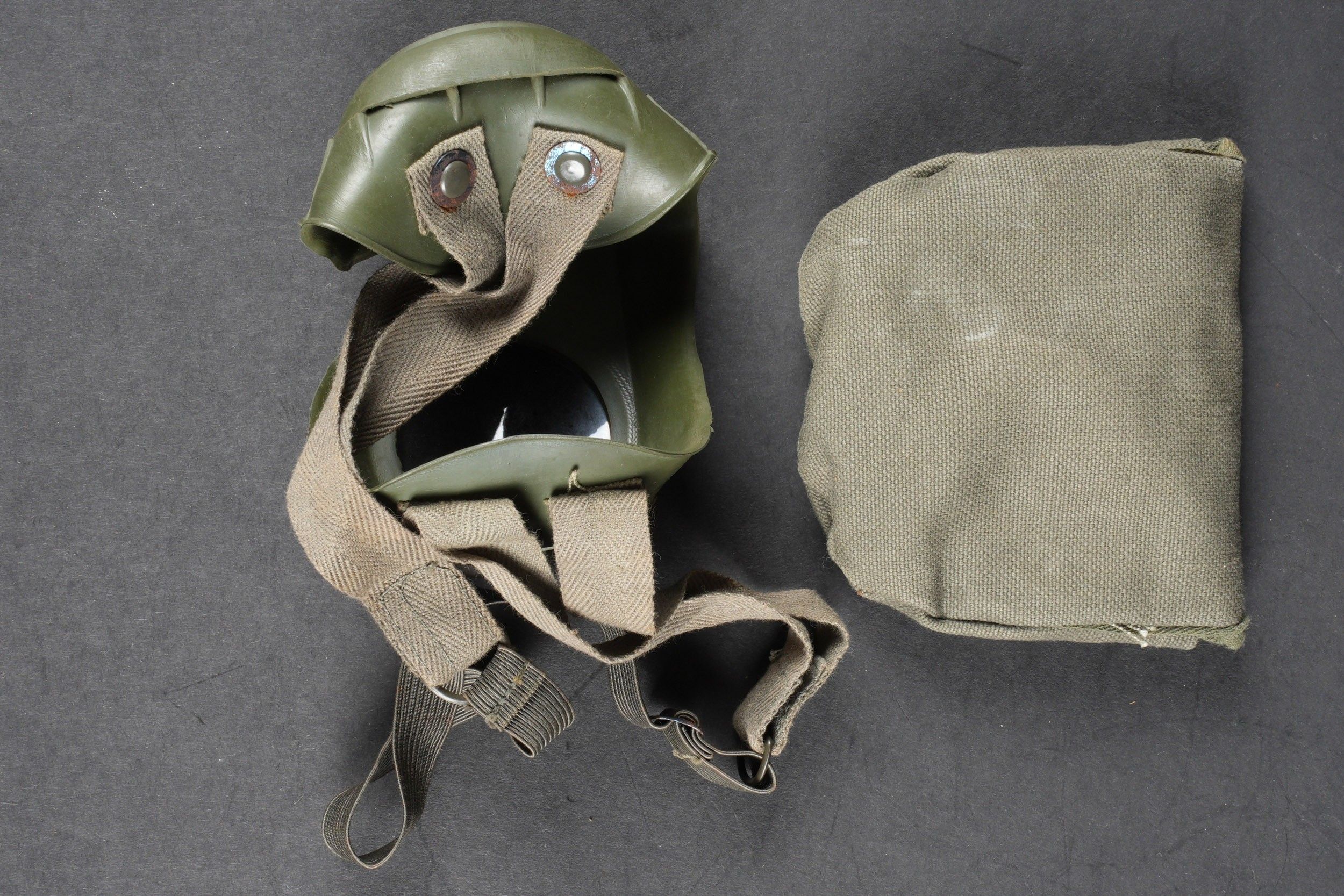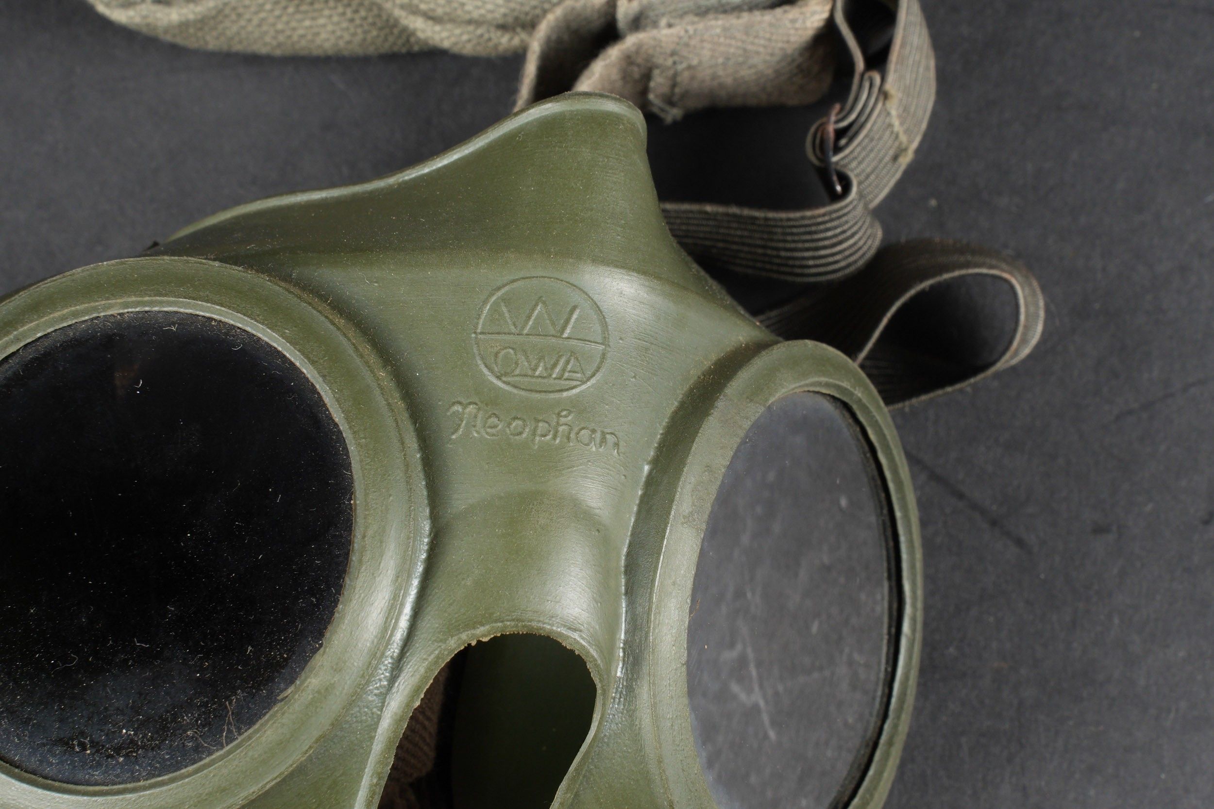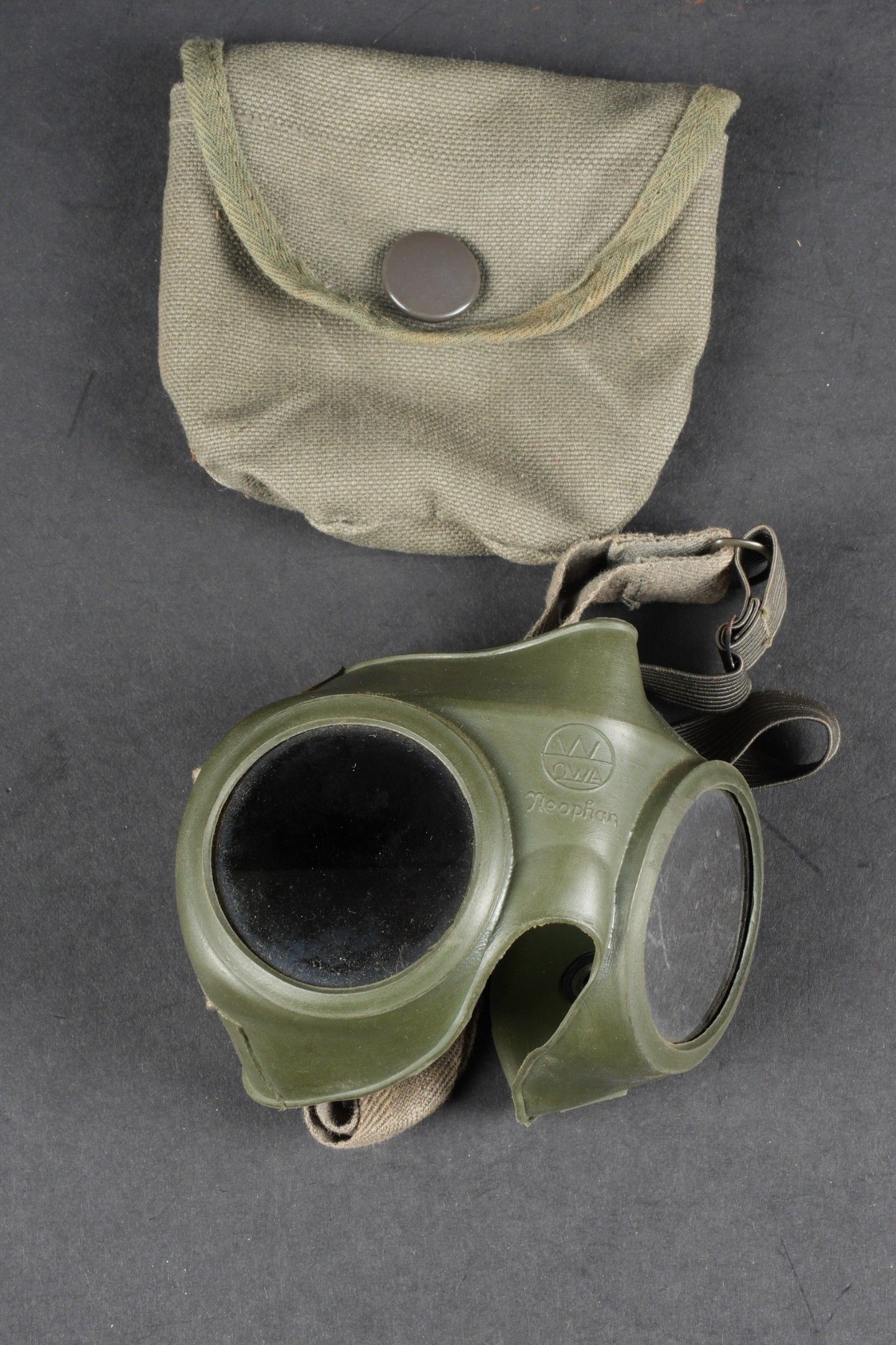 Lunette Neophan. Armature en caoutchouc Feldgrau, marquée W QWA Neophan. Les verres sont fumés. Elastique complet et souple. Housse en toile coton Feldgrau, le bouton pression est fonctionnel. A noter une certaine usure et patine de la pièce. Etat II+. Neophan goggles Feldgrau rubber frame marked W QWA Neophan. Smoked lenses. Elastic strap complete and supple. Feldgrau cotton carrying pouch with functional press stud. Shows some wear and patina. Condition II+.