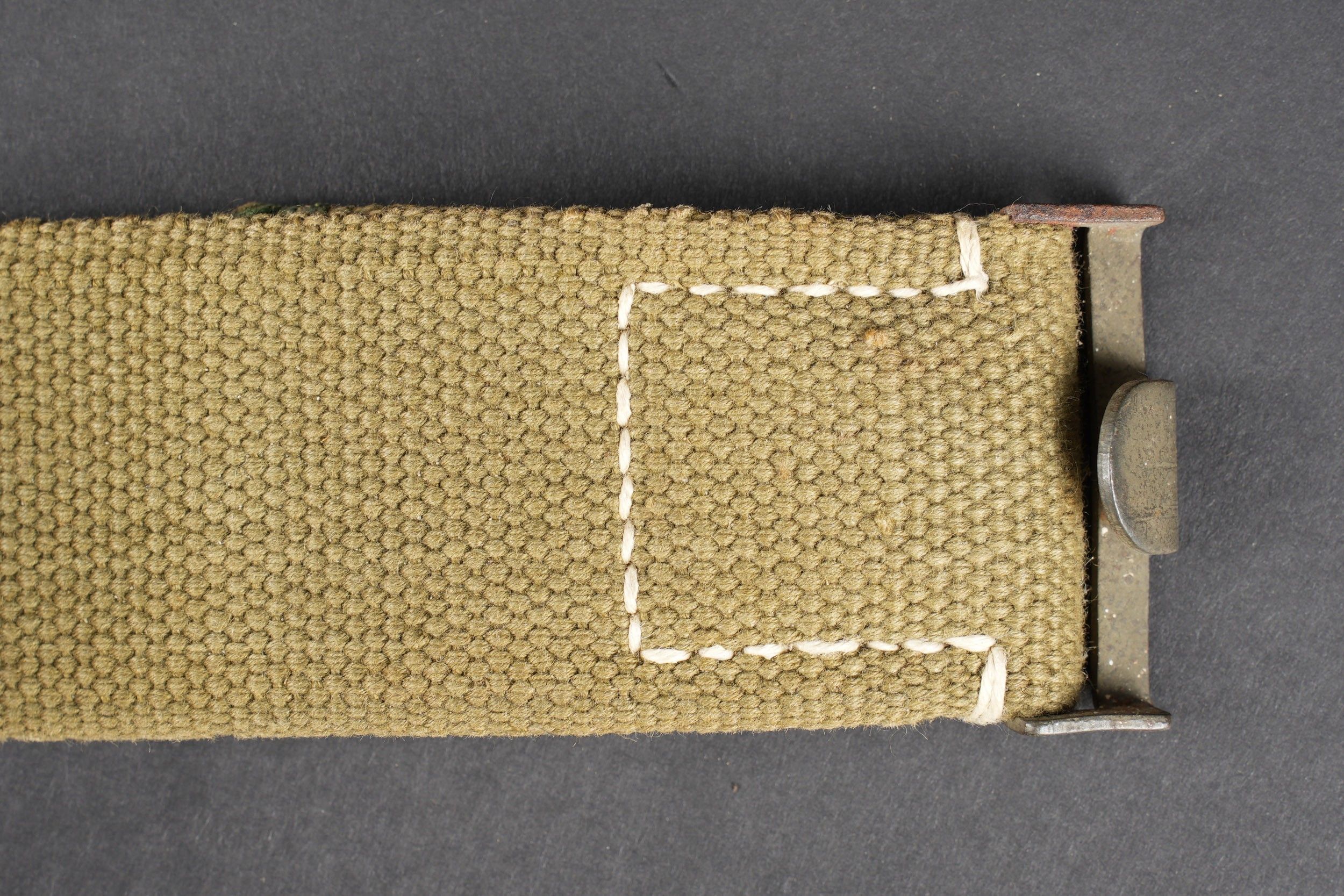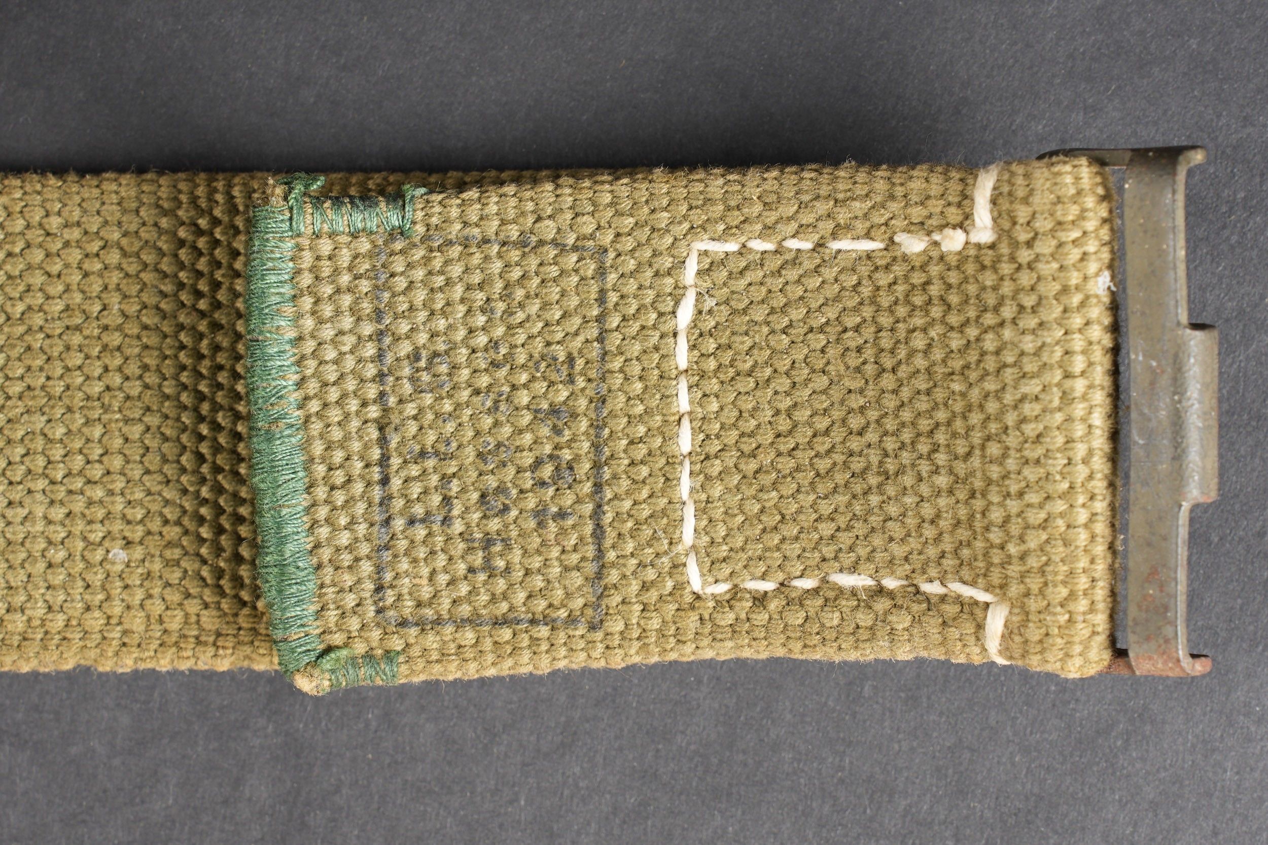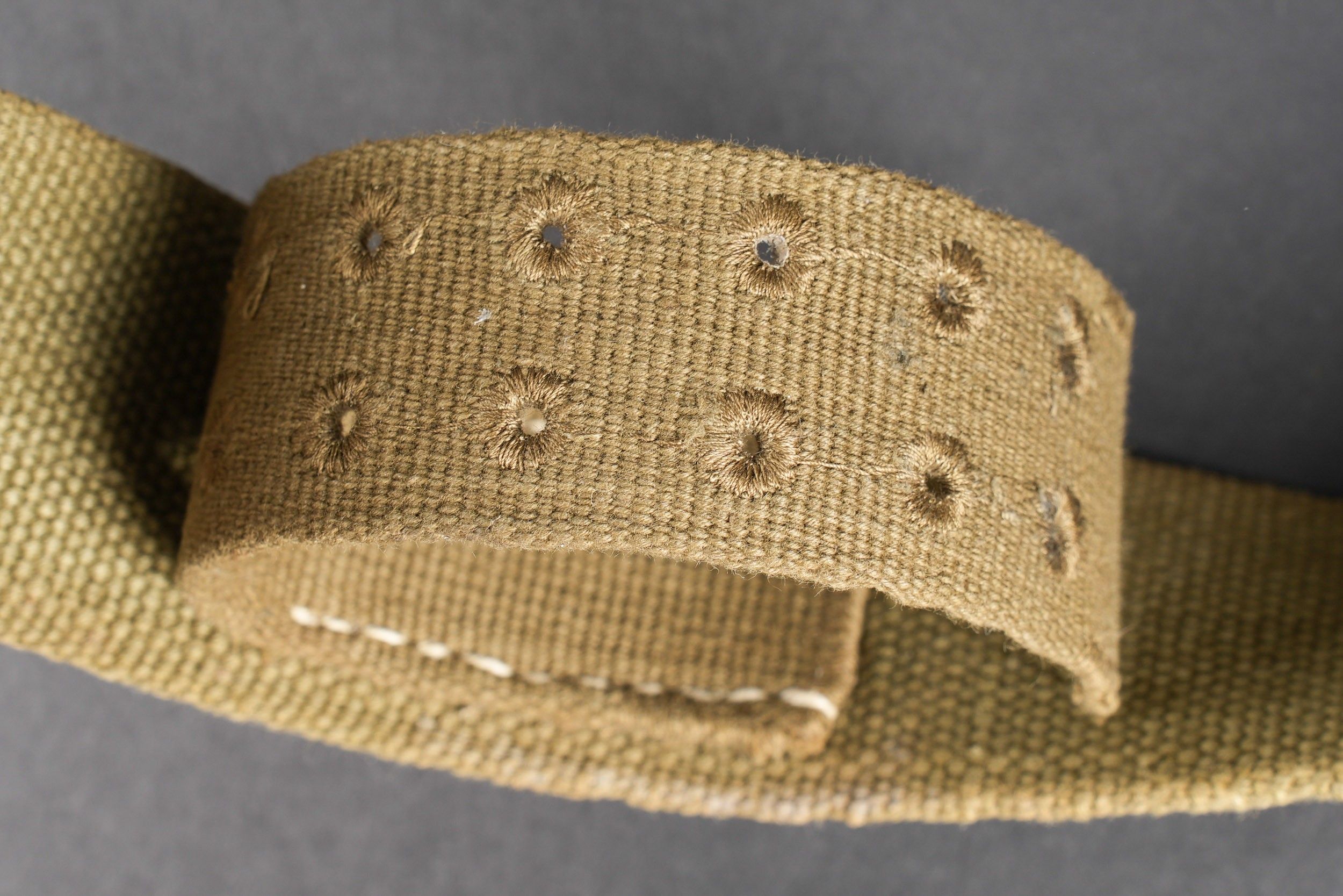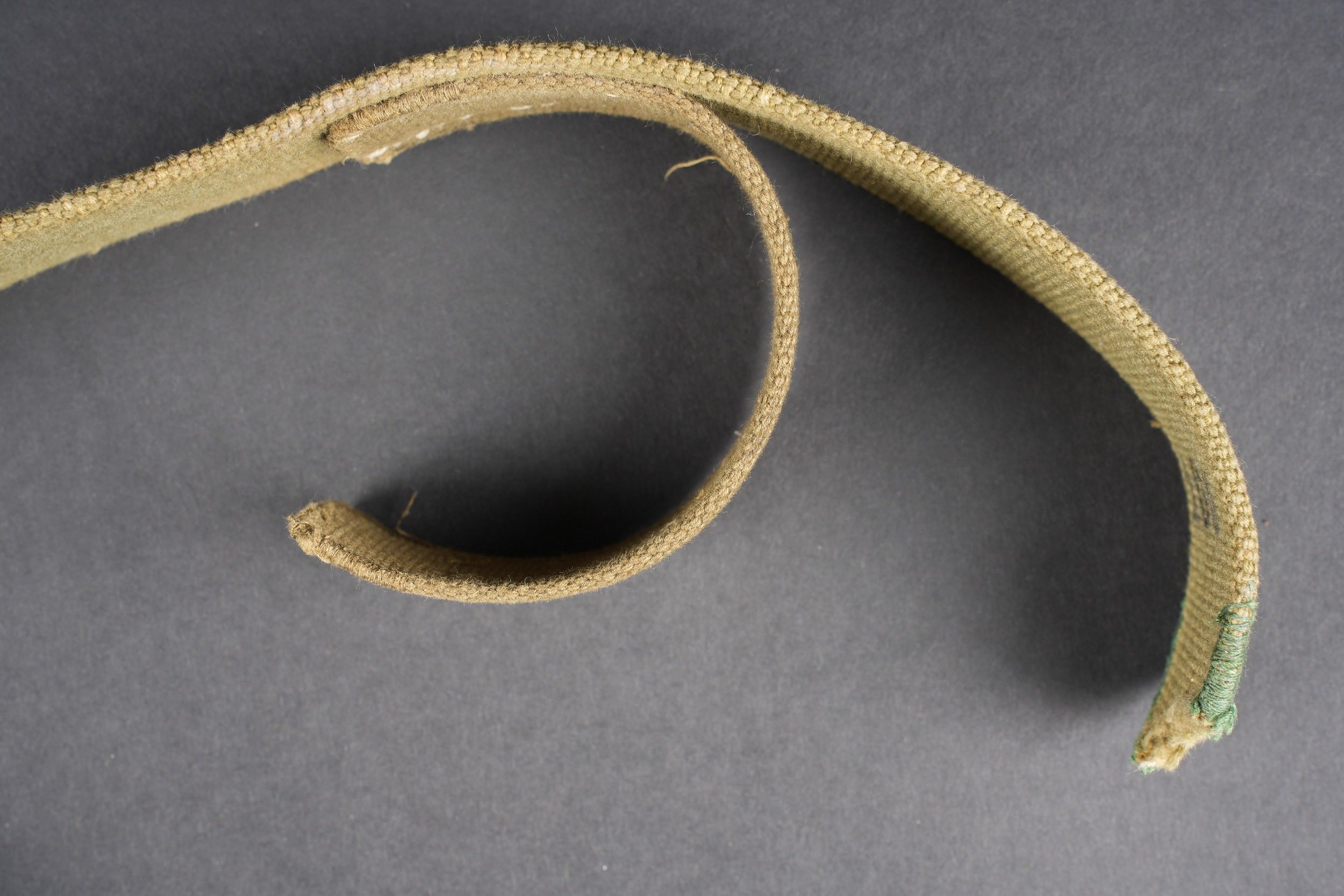 Ceinturon tropical. Ceinturon en épaisse toile couleur jaune sable. Bouclerie en métal, peinture à 70%. Fabrication LFG 1942. Patte de réglage complète. Boucle de ceinturon en métal, peinture gris bateau à 80%. Fabrication SC 1940. Patte en toile complète cousue d'origine, sans marquages visibles. A noter une certaine usure et patine de la pièce. Etat II+. Tropical belt Thick sand-colored canvas with 70% paint remaining on metal buckle. Maker LFG 1942. Adjustment tab complete. Belt buckle in grey-painted metal, 80% paint remaining, maker SC 1940. Canvas tab sewn in place, no visible markings. Shows wear and patina. Condition II+.