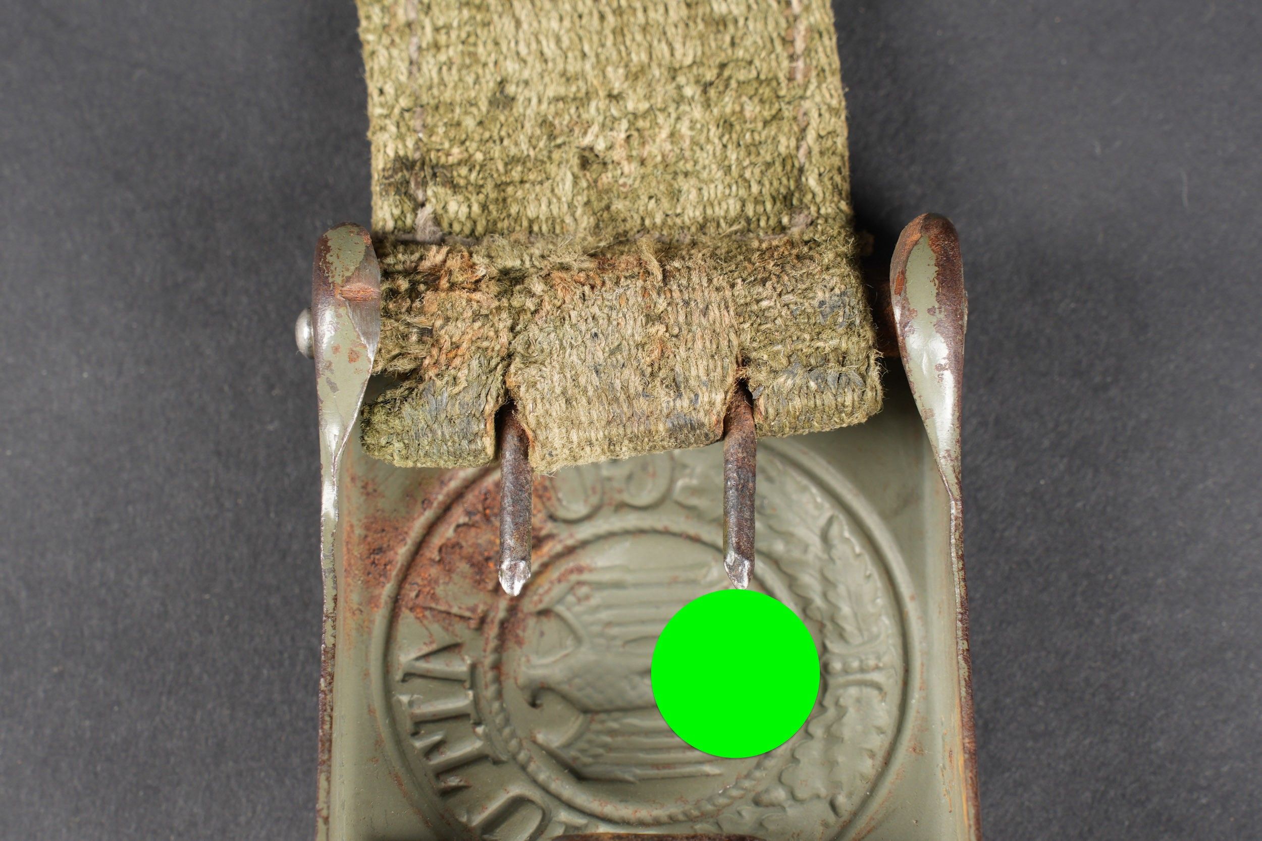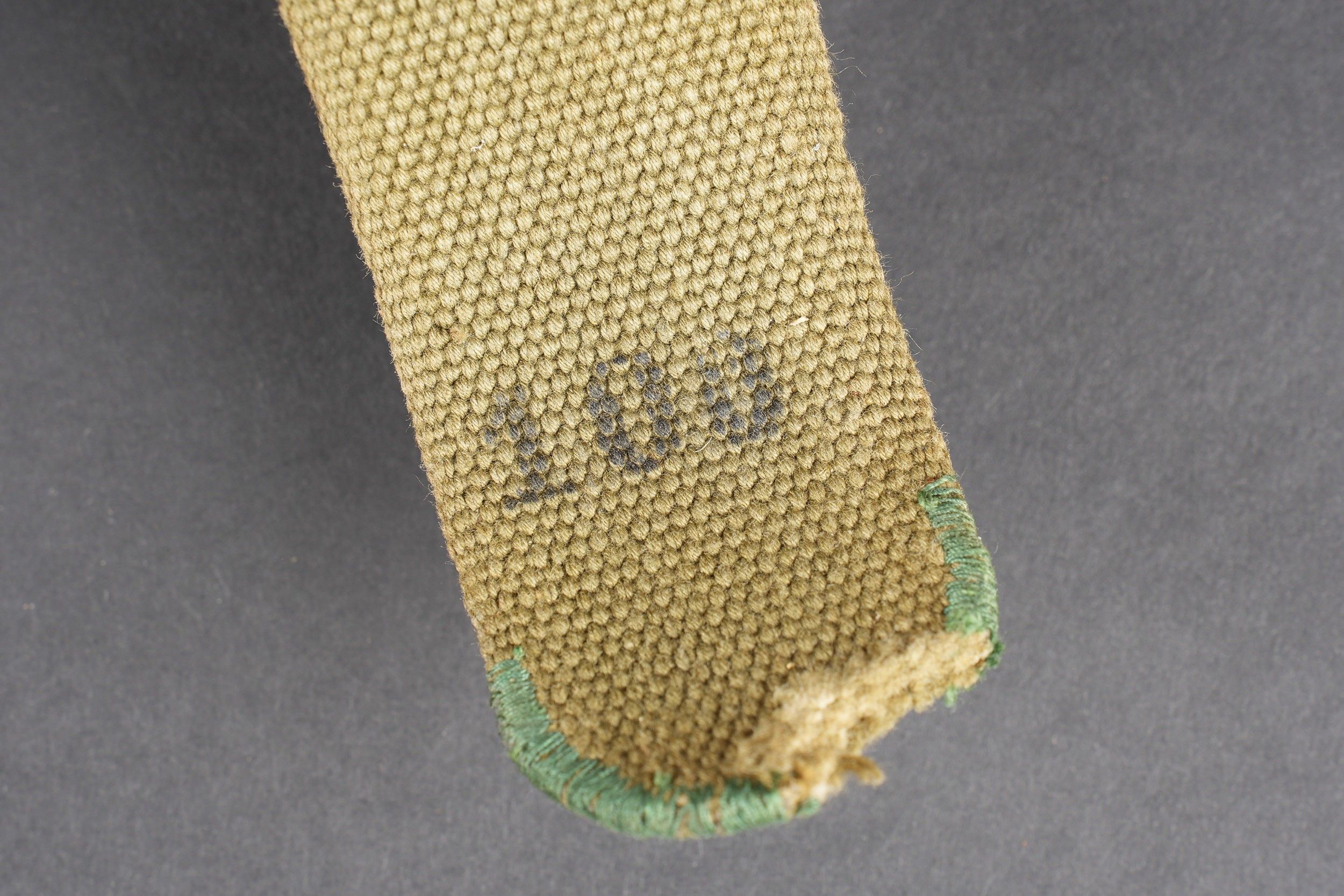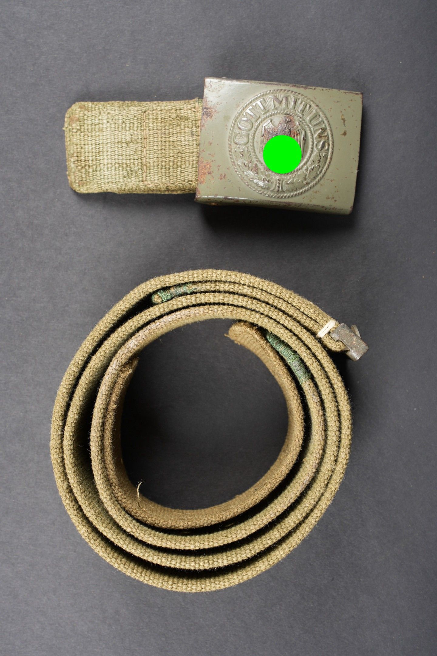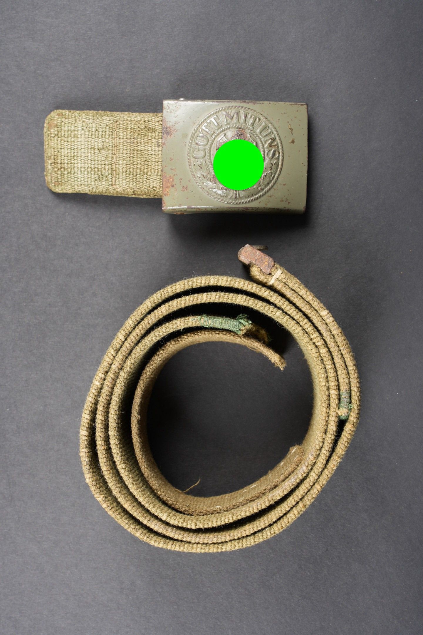 Ceinturon tropical. Ceinturon en épaisse toile couleur jaune sable. Bouclerie en métal, peinture à 70%. Fabrication LFG 1942. Patte de réglage complète. Boucle de ceinturon en métal, peinture gris bateau à 80%. Fabrication SC 1940. Patte en toile complète cousue d'origine, sans marquages visibles. A noter une certaine usure et patine de la pièce. Etat II+. Tropical belt Thick sand-colored canvas with 70% paint remaining on metal buckle. Maker LFG 1942. Adjustment tab complete. Belt buckle in grey-painted metal, 80% paint remaining, maker SC 1940. Canvas tab sewn in place, no visible markings. Shows wear and patina. Condition II+.