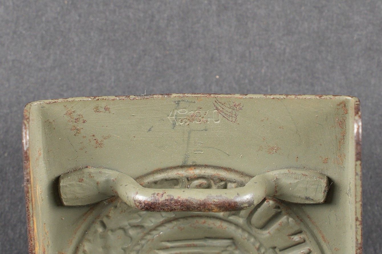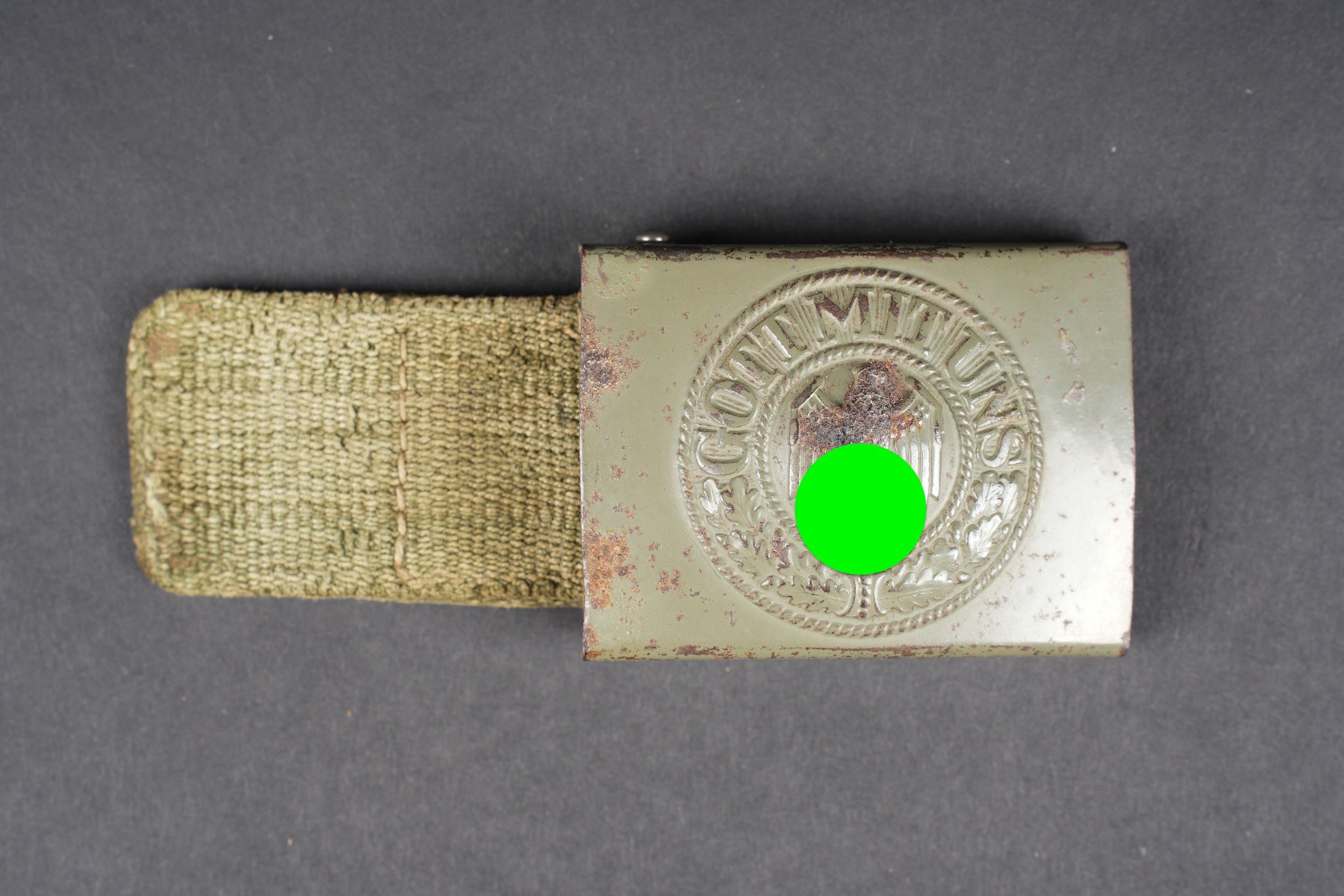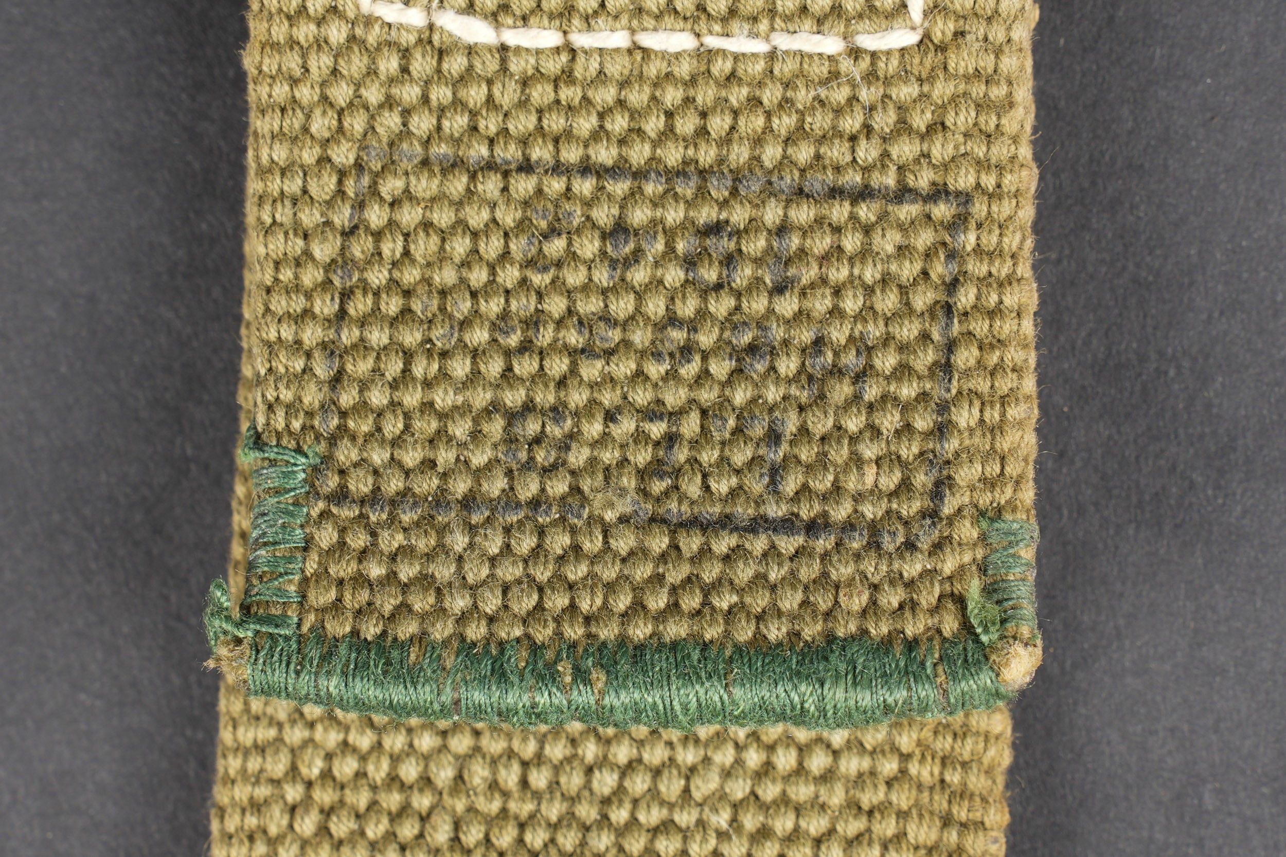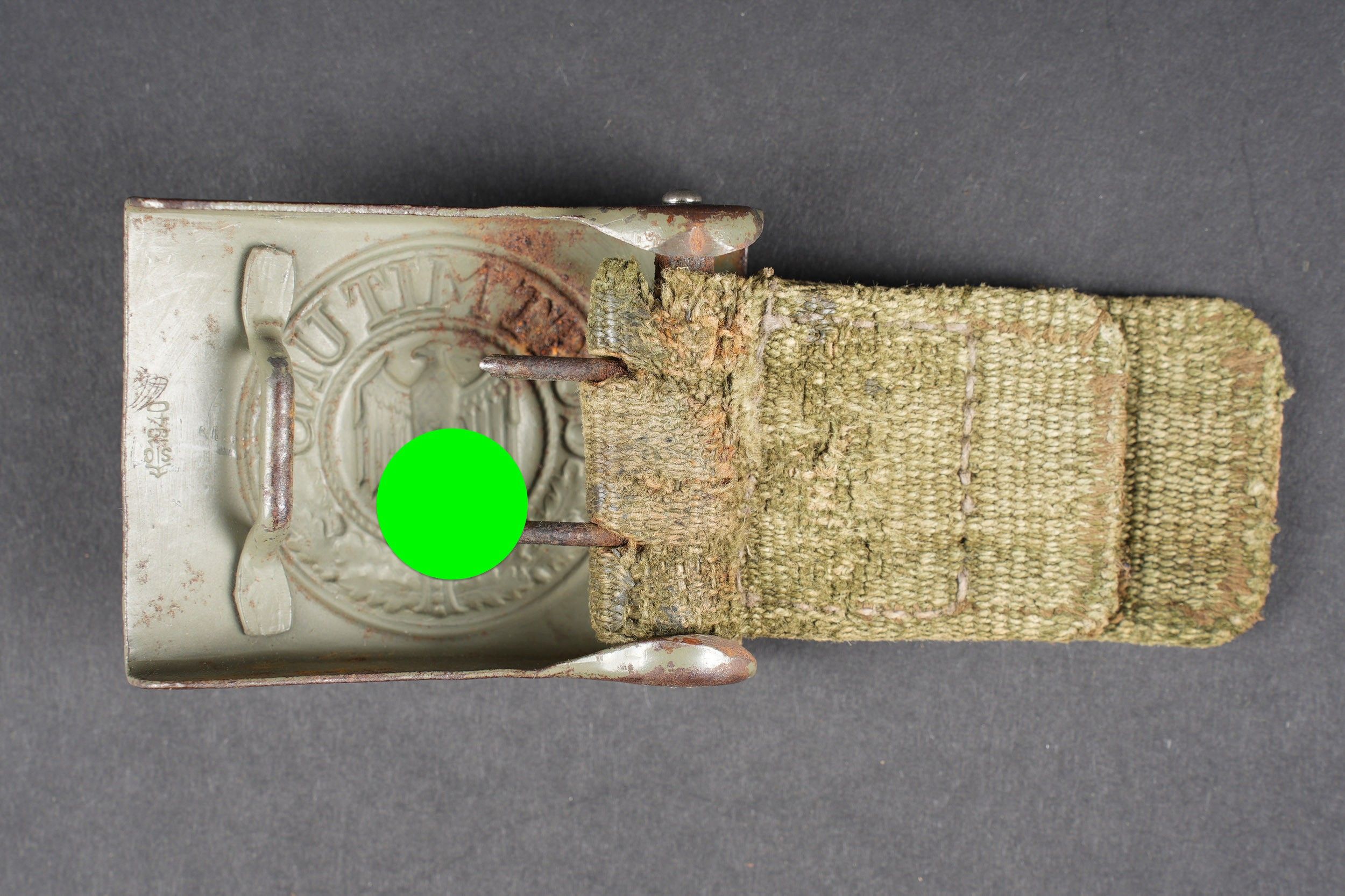 Ceinturon tropical. Ceinturon en épaisse toile couleur jaune sable. Bouclerie en métal, peinture à 70%. Fabrication LFG 1942. Patte de réglage complète. Boucle de ceinturon en métal, peinture gris bateau à 80%. Fabrication SC 1940. Patte en toile complète cousue d'origine, sans marquages visibles. A noter une certaine usure et patine de la pièce. Etat II+. Tropical belt Thick sand-colored canvas with 70% paint remaining on metal buckle. Maker LFG 1942. Adjustment tab complete. Belt buckle in grey-painted metal, 80% paint remaining, maker SC 1940. Canvas tab sewn in place, no visible markings. Shows wear and patina. Condition II+.