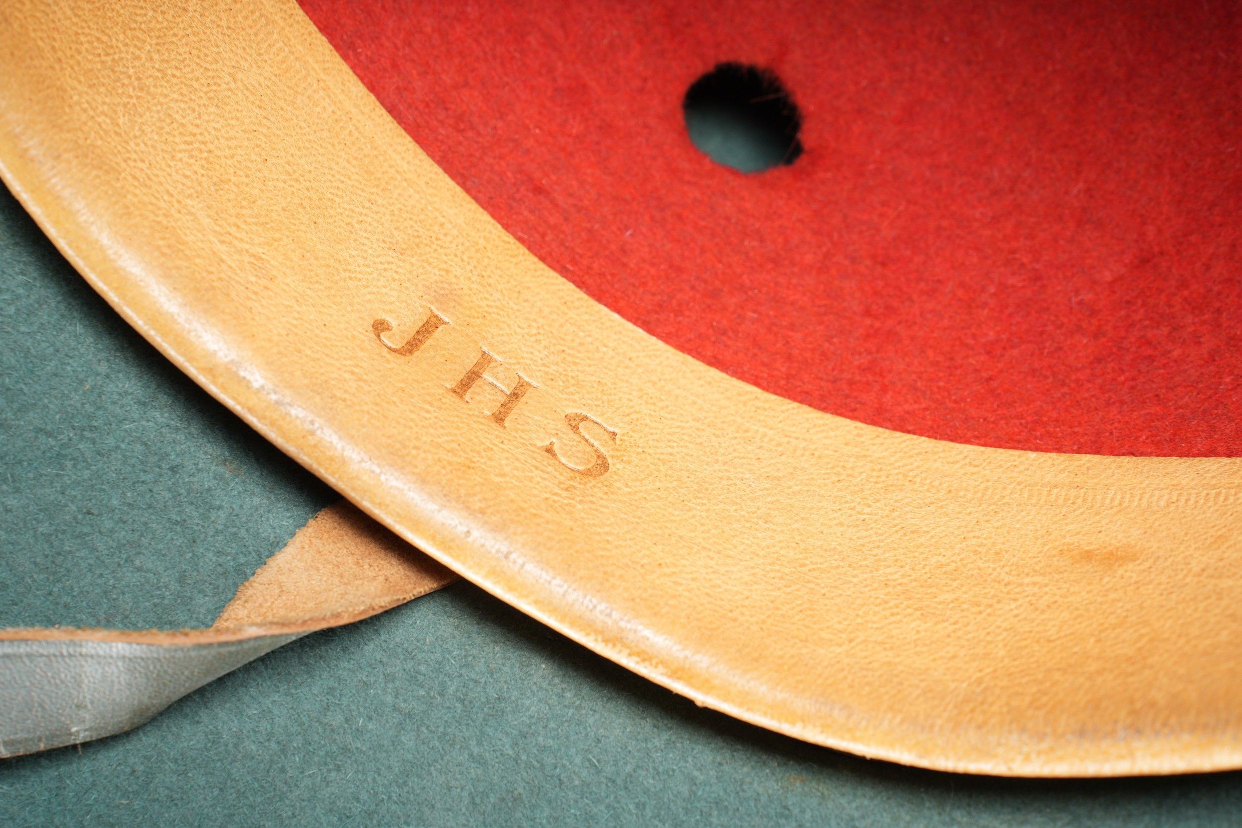 Casque tropical allemand. En feutrine vert olive. La bordure en cuir est en très bon état. Les insignes sont présents. Ils n'ont pas été démontés afin de vérifier les attaches. Jugulaire en cuir complète. Intérieur doublé en feutrine rouge, quelques fissures visibles. Bandeau de sudation en cuir fauve, marquages JHS. Taille 57, daté 1942. A noter une légère usure et patine de la pièce. Un trou de mite au niveau de la doublure verte. Etat I-. German tropical helmet Olive-green felt body with leather edge in very good condition. Original insignia present and untouched. Complete leather chinstrap. Red felt interior lining with minor cracks. Brown leather sweatband marked JHS. Size 57, dated 1942. Slight wear and patina, one moth hole in green liner. Condition I–.