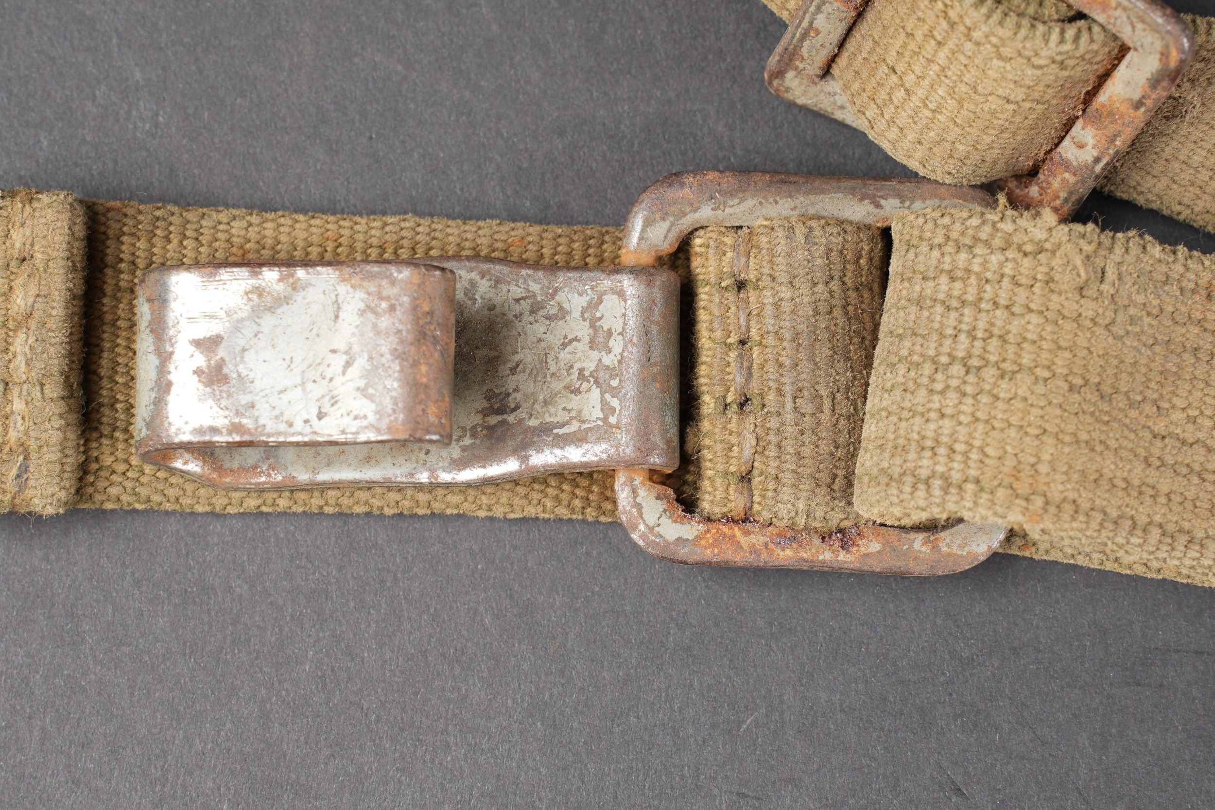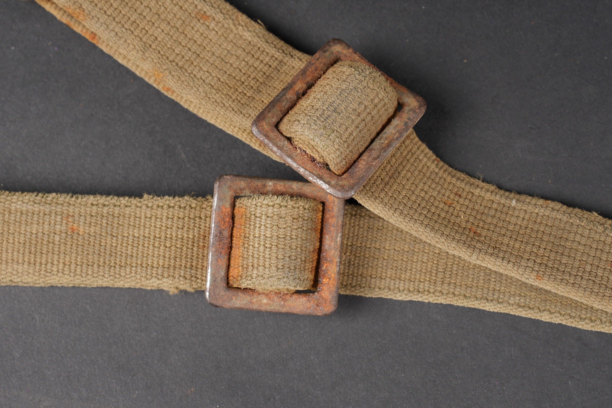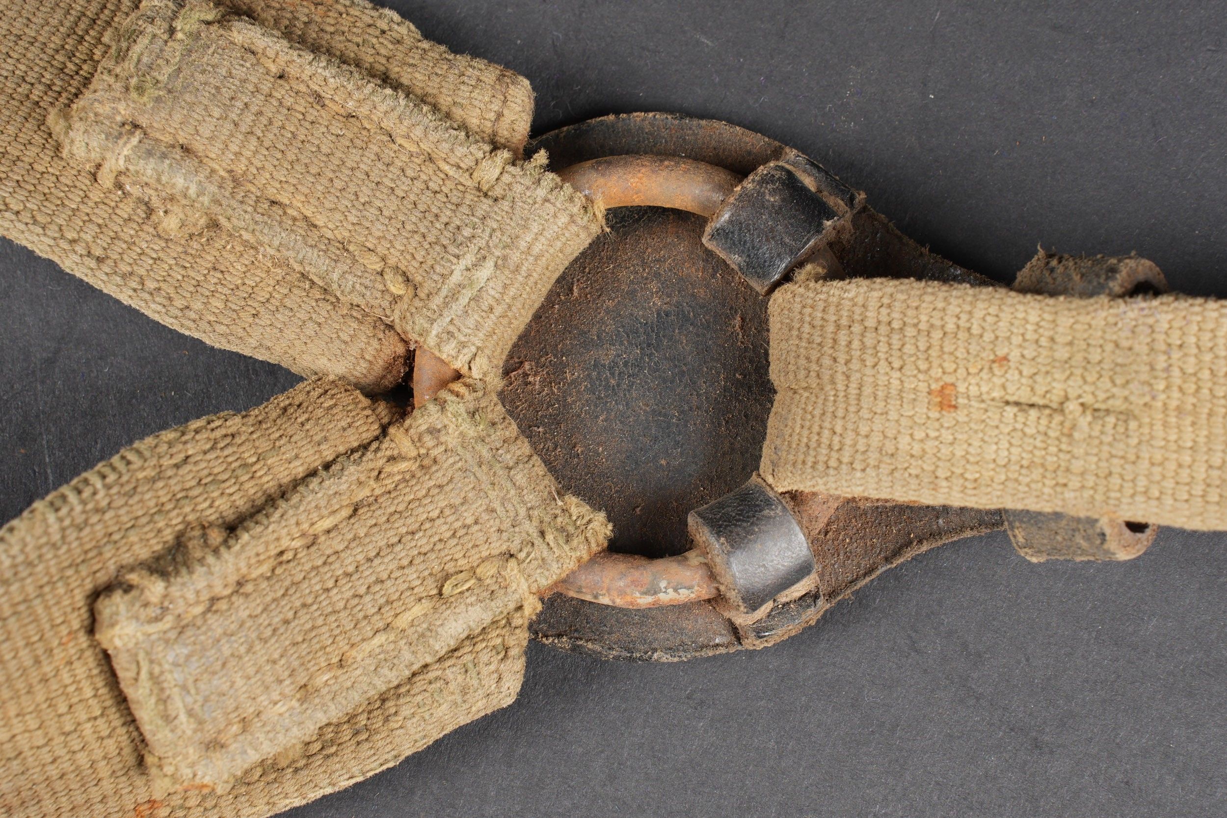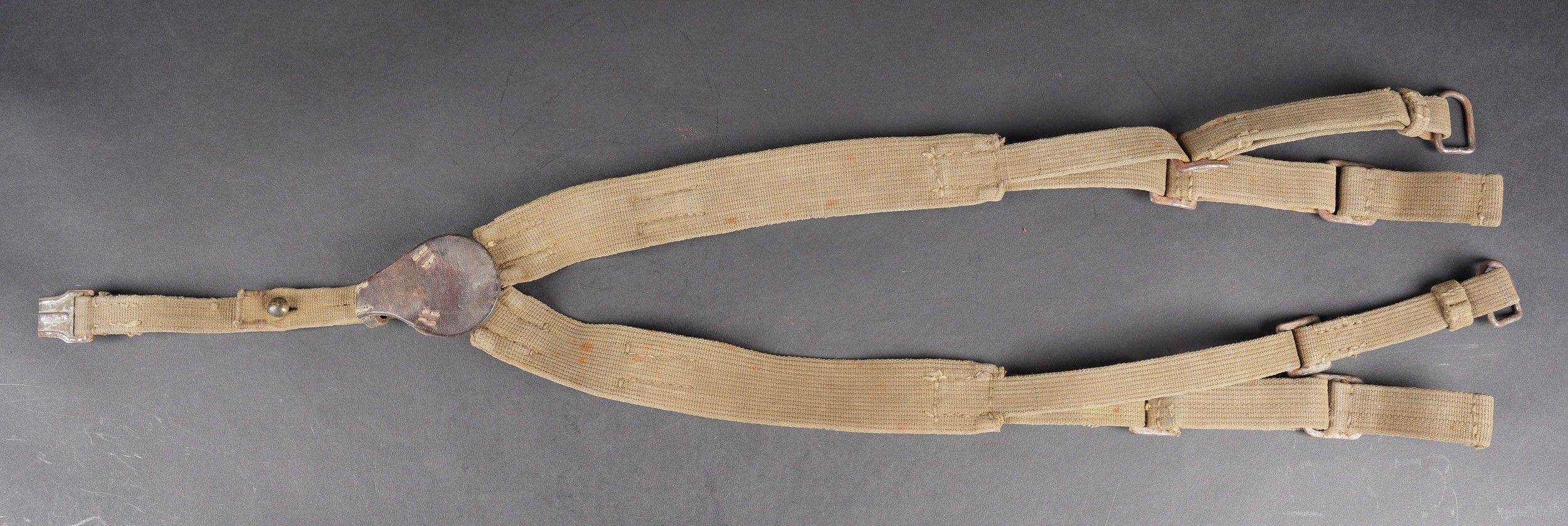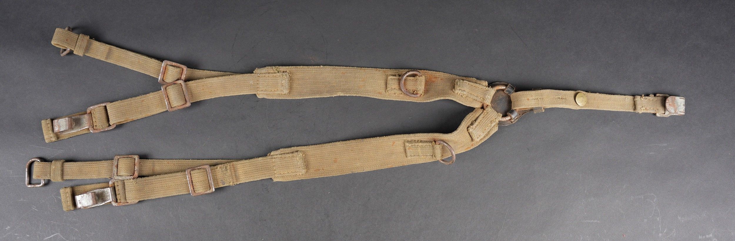 Brelage tropical. En épaisse toile couleur jaune sable et cuir noir. Les garnitures métalliques sont en couleur d'origine à 70%. Fabrication FUQ 41. A noter une certaine usure et patine de la pièce, ainsi que quelques tâches. Etat II+. Tropical Y-straps Thick sand-colored canvas with black leather reinforcements. Metal fittings retain 70% original finish. Maker FUQ 41. Shows wear and patina, with light stains. Condition II+