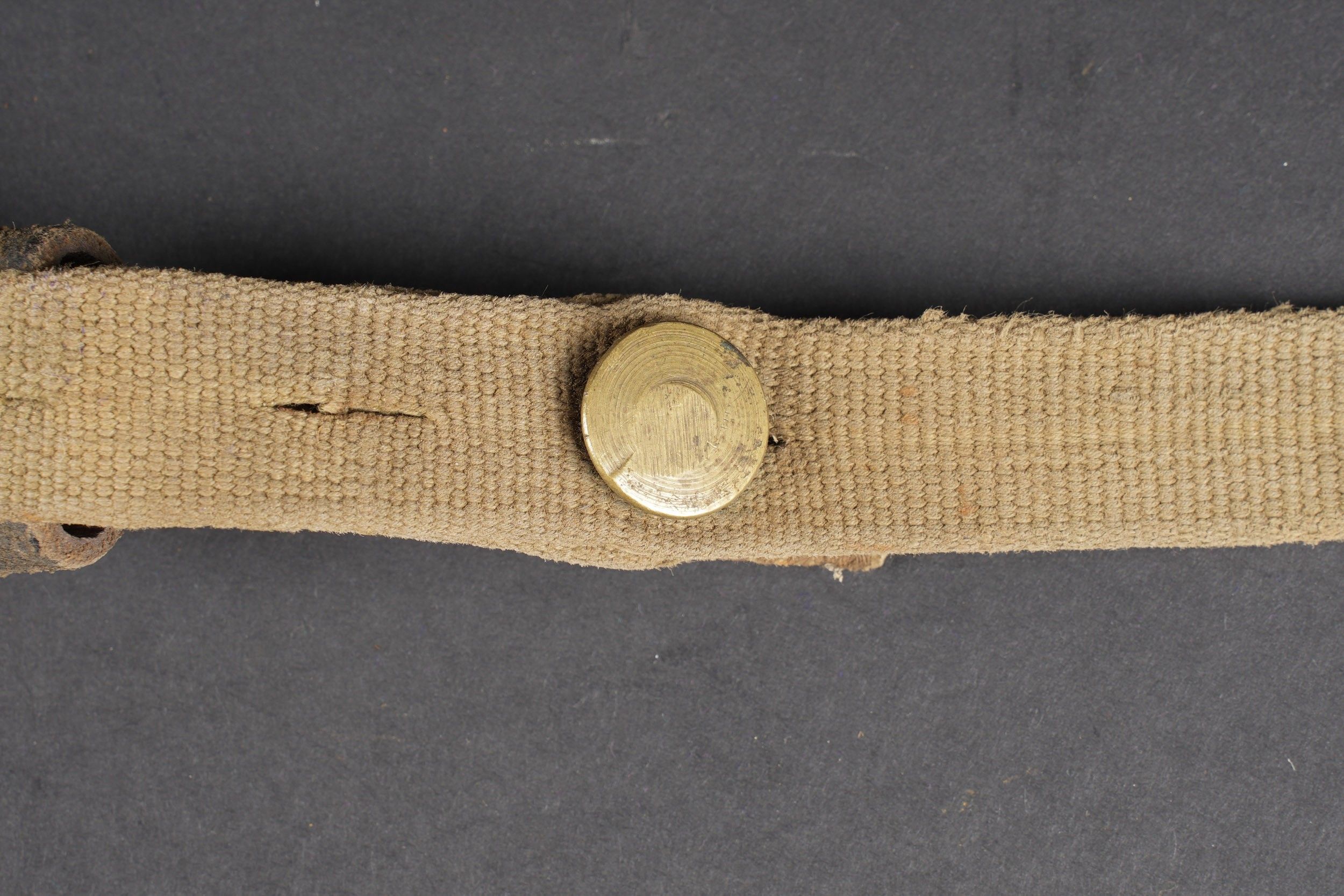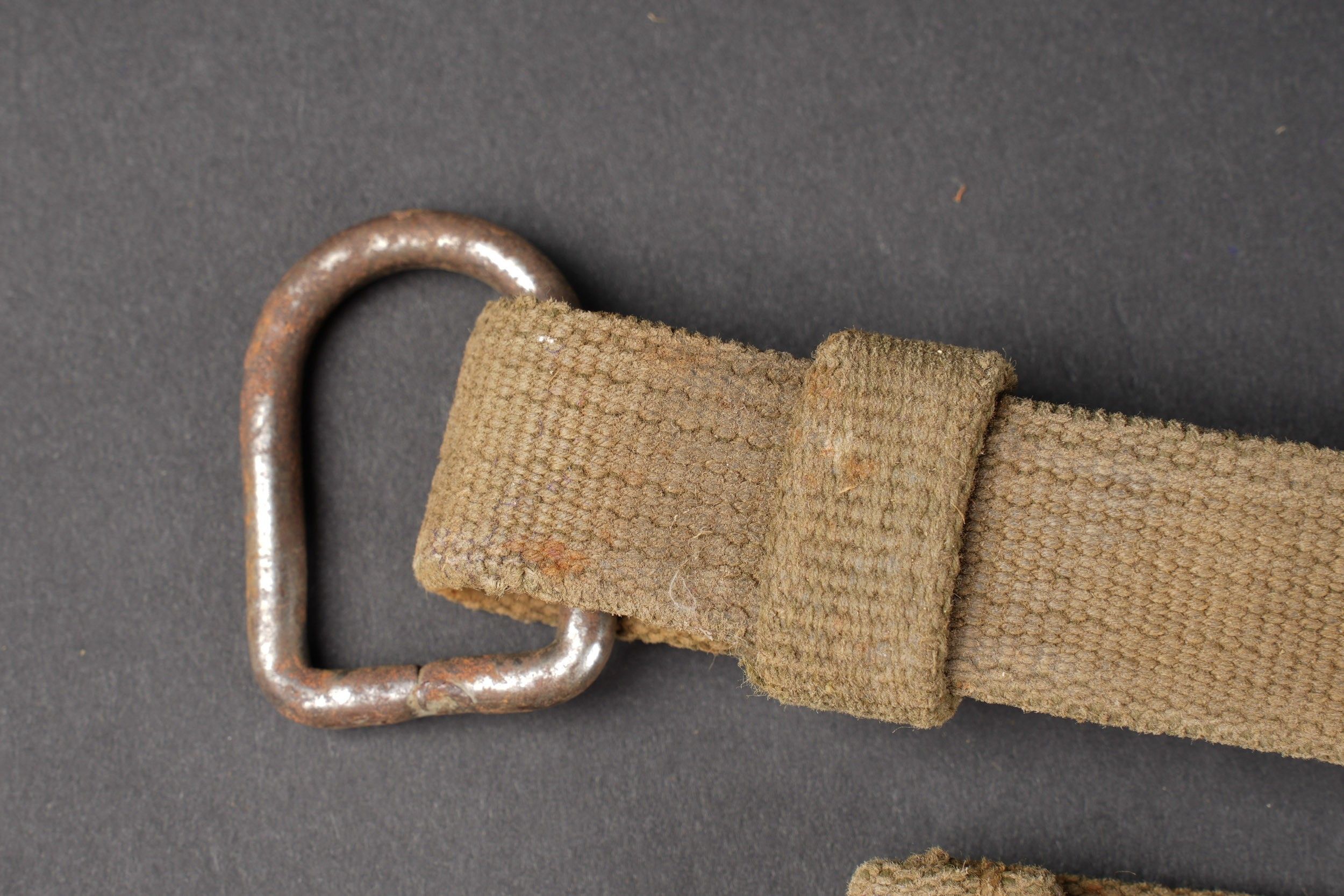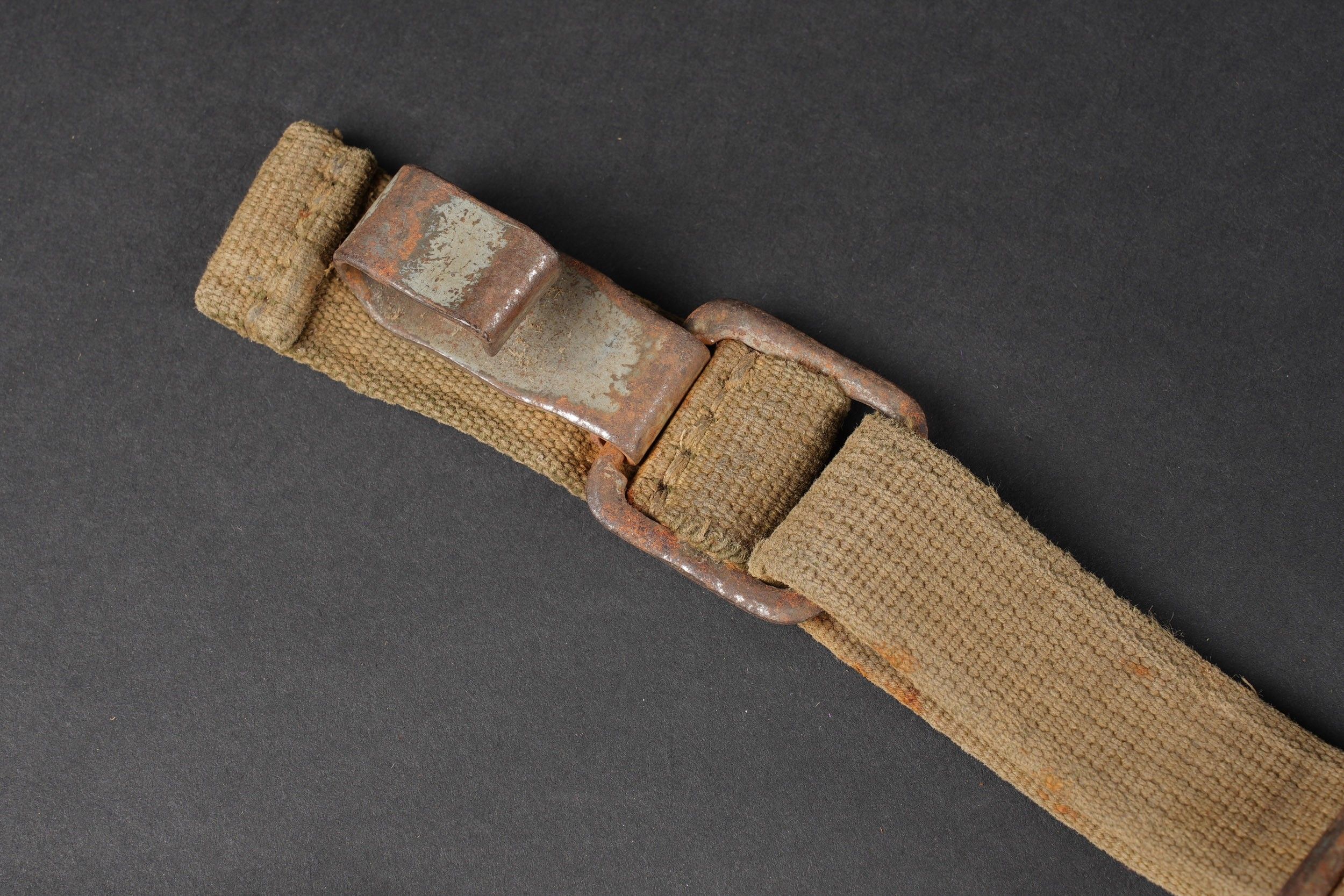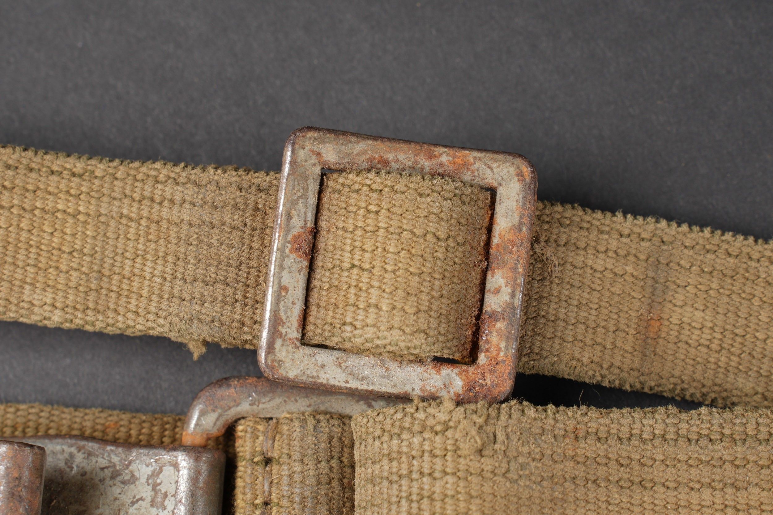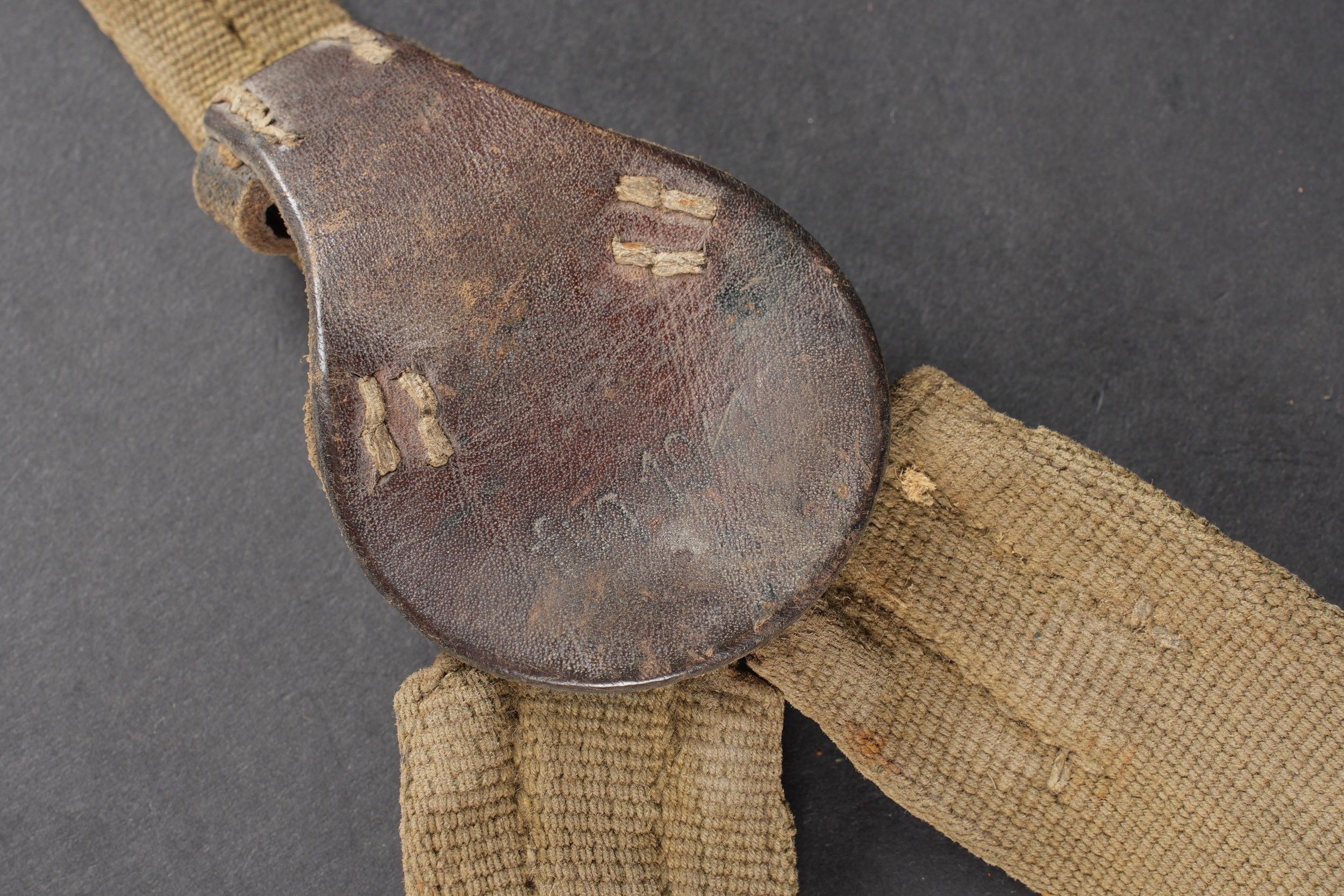 Brelage tropical. En épaisse toile couleur jaune sable et cuir noir. Les garnitures métalliques sont en couleur d'origine à 70%. Fabrication FUQ 41. A noter une certaine usure et patine de la pièce, ainsi que quelques tâches. Etat II+. Tropical Y-straps Thick sand-colored canvas with black leather reinforcements. Metal fittings retain 70% original finish. Maker FUQ 41. Shows wear and patina, with light stains. Condition II+