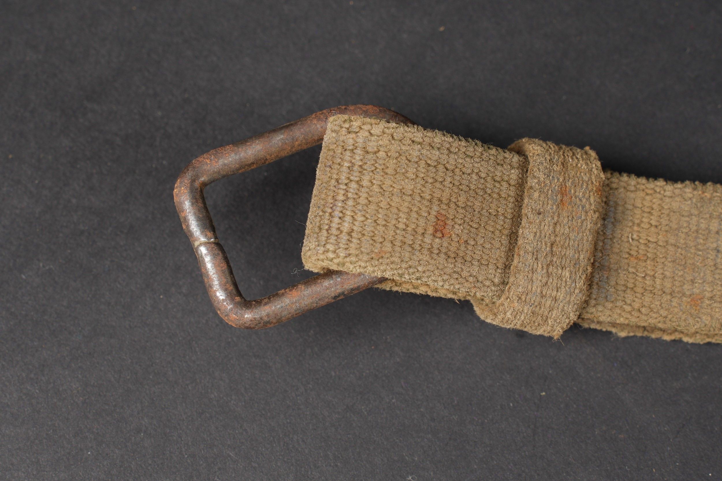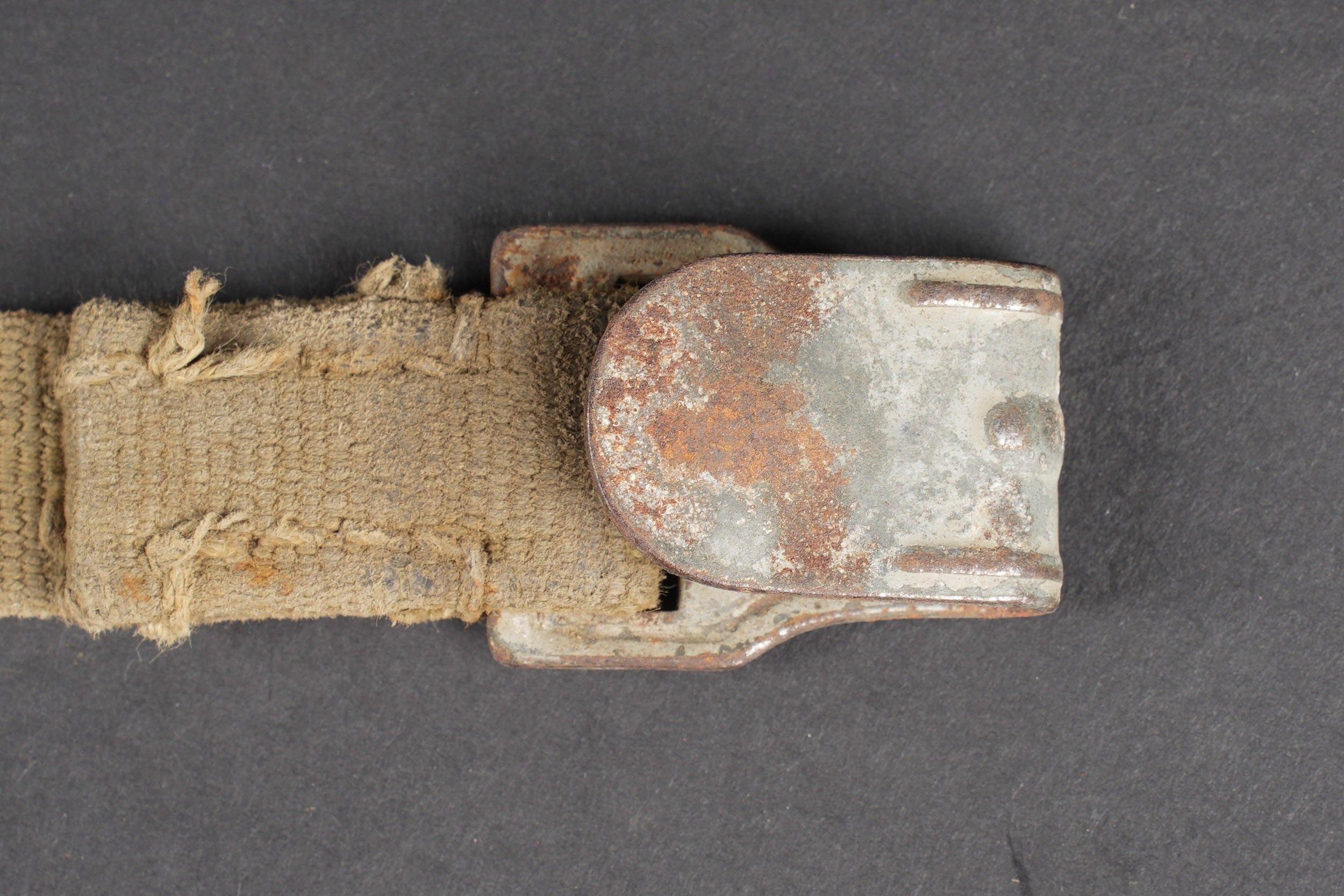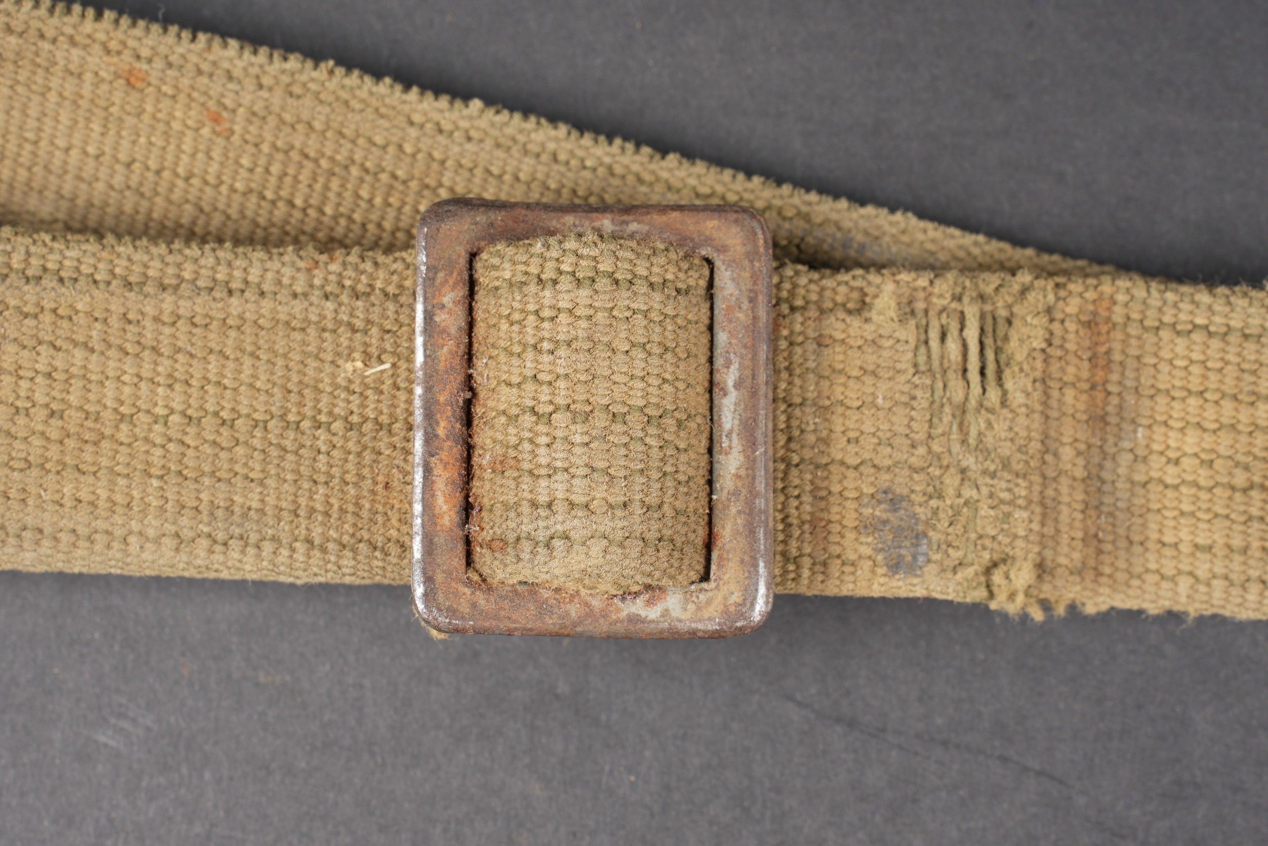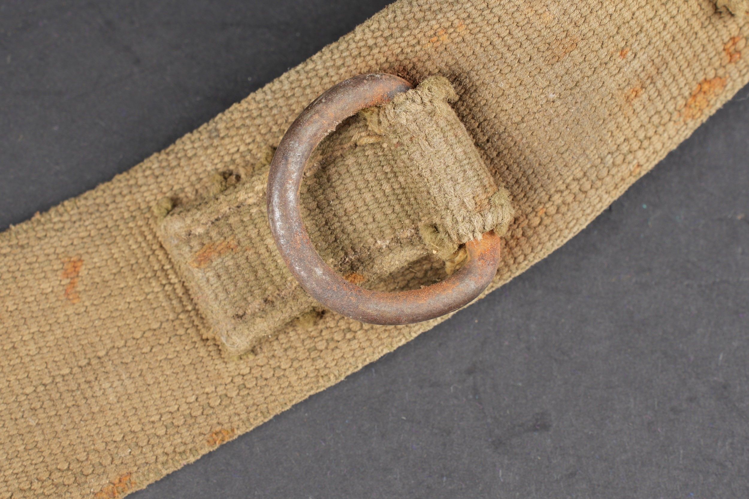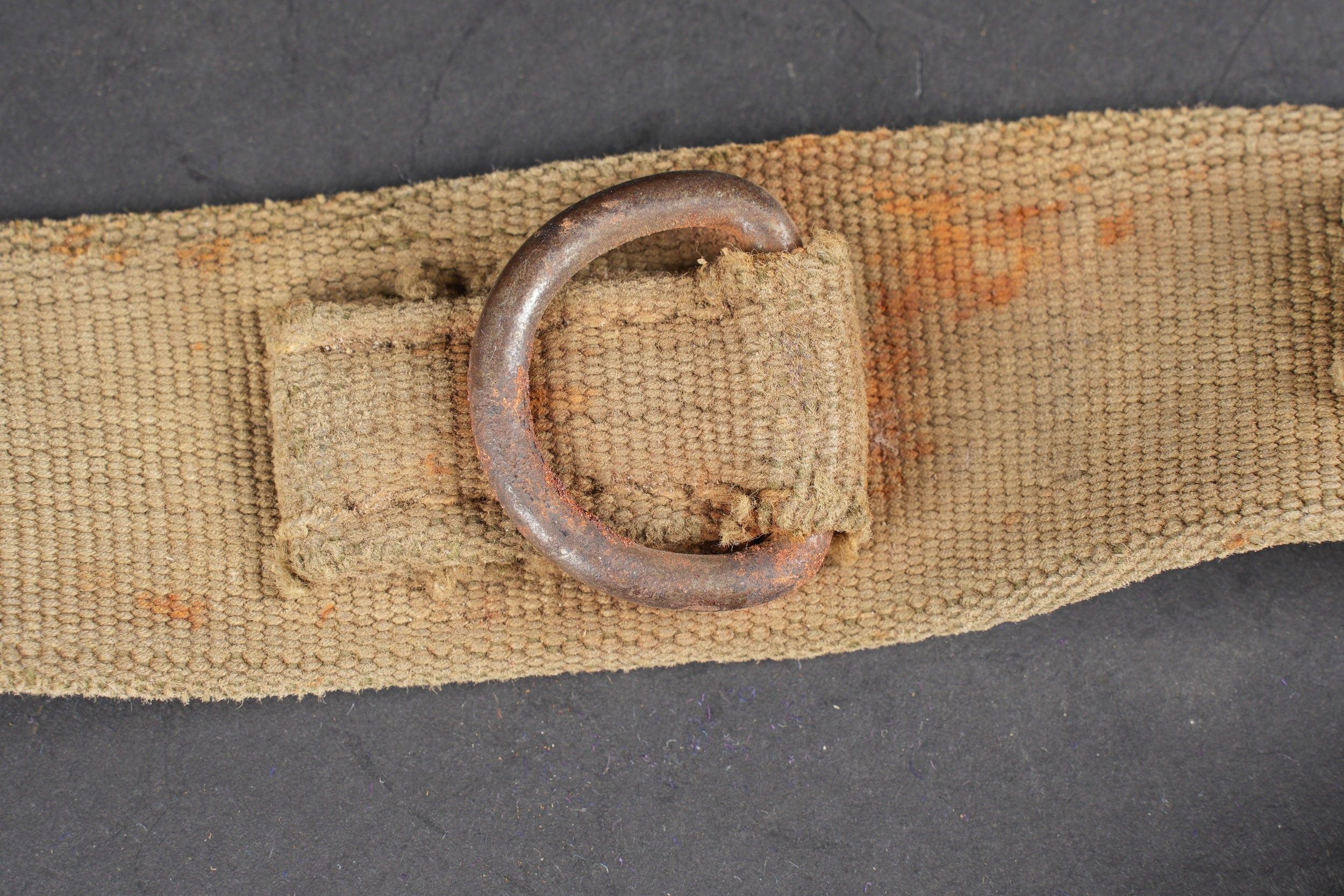 Brelage tropical. En épaisse toile couleur jaune sable et cuir noir. Les garnitures métalliques sont en couleur d'origine à 70%. Fabrication FUQ 41. A noter une certaine usure et patine de la pièce, ainsi que quelques tâches. Etat II+. Tropical Y-straps Thick sand-colored canvas with black leather reinforcements. Metal fittings retain 70% original finish. Maker FUQ 41. Shows wear and patina, with light stains. Condition II+