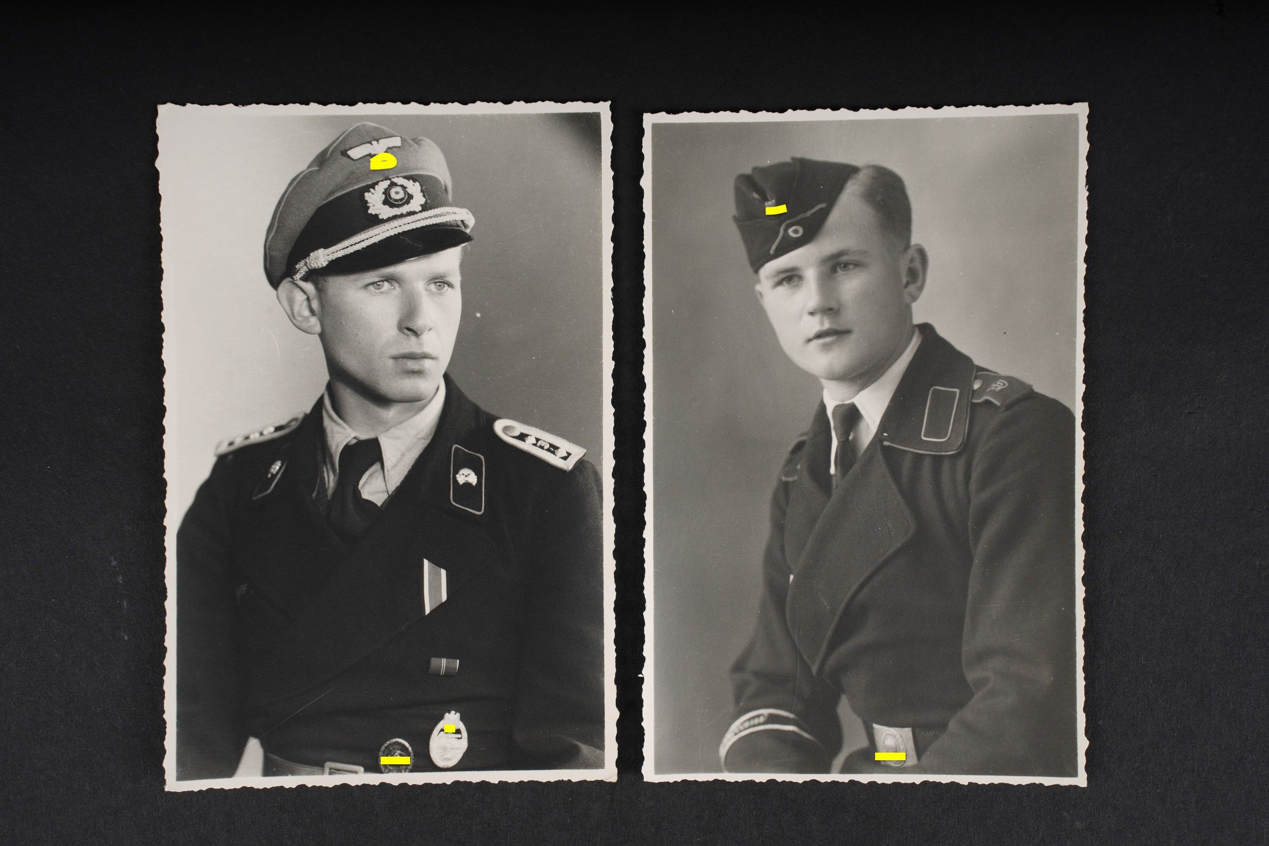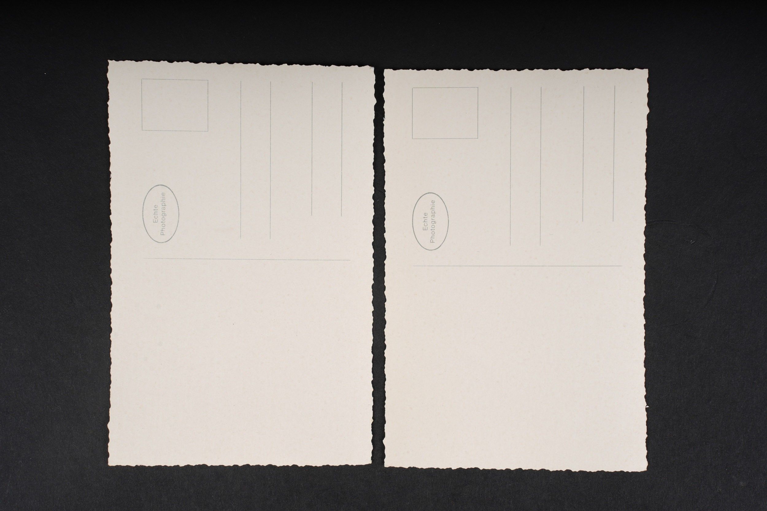 Photos Panzer. Deux photos cartes postales représentant deux soldat des unités blindées. Marquages au dos Echte Photographie. A noter une certaine usure et patine des pièces. Etat II+. Panzer photographs. Two postcard-size photographs depicting German armored troops. Reverse marked Echte Photographie. Slight wear and patina. Condition II+.