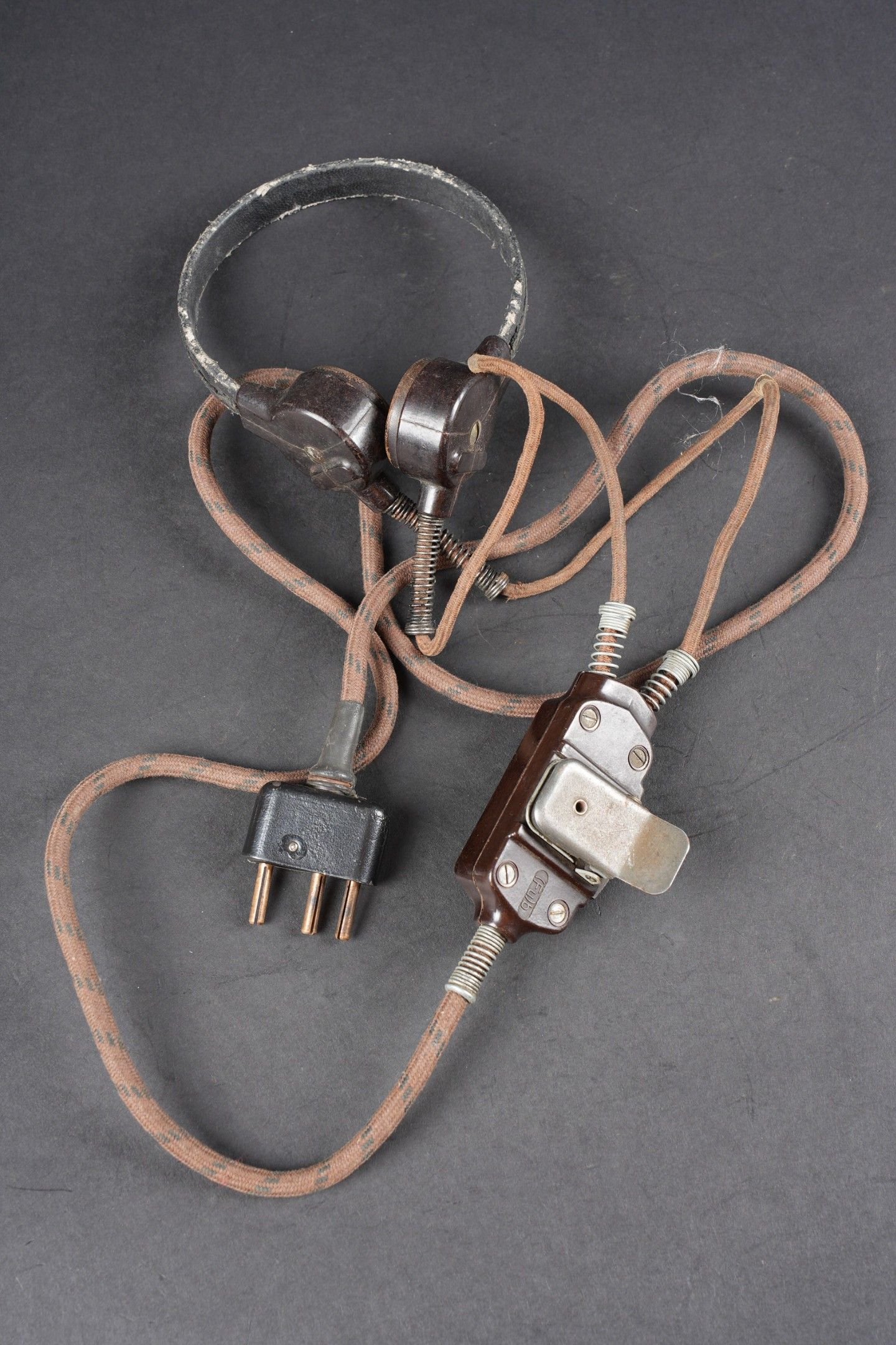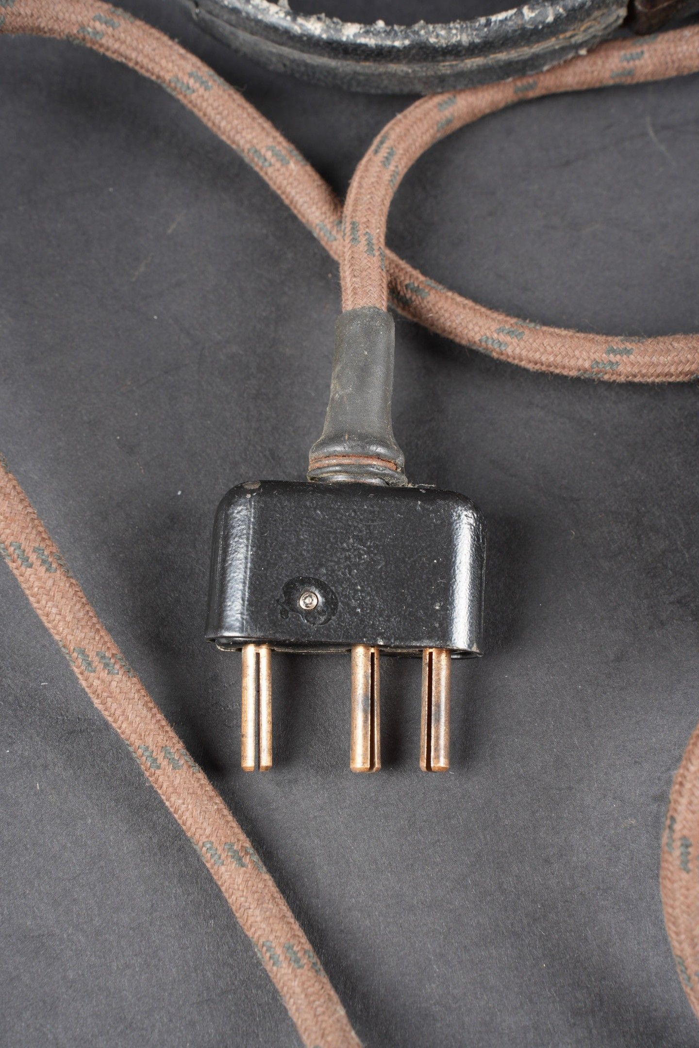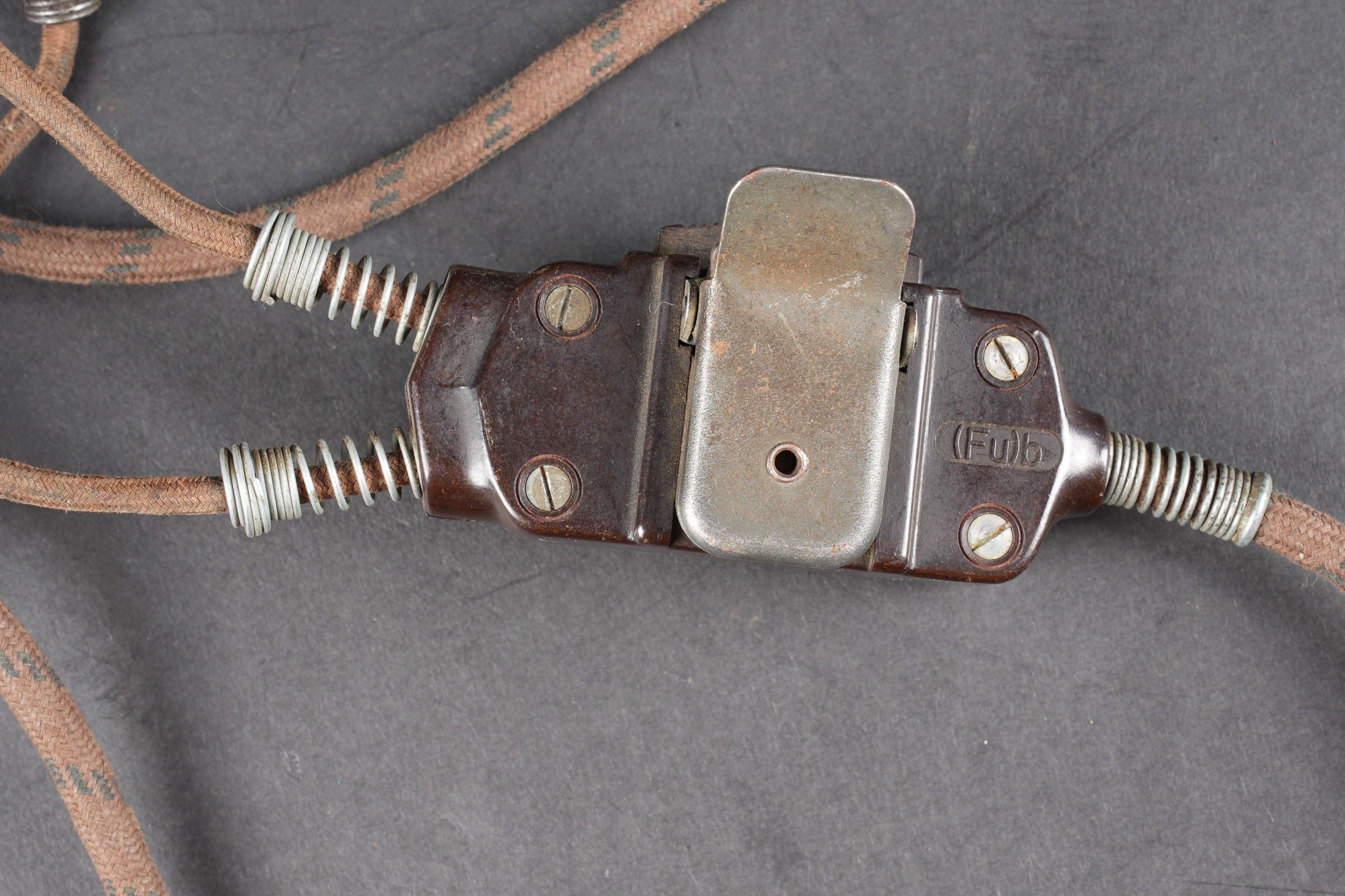 Laryngophone Panzer. Armature en métal, recouverte d'un cuir noir, présentant des marques d'usure. Parties en bakélite complètes. Câble complet avec sa prise. Boitier en bakélite complet avec sa pince fonctionnelle. Toutes les pièces mobiles sont fonctionnelles. Marquages FuB. A noter une certaine usure et patine de la pièce. Etat II+. Panzer throat microphone. Metal frame covered in black leather showing wear. Complete bakelite components. Cable and plug complete. Bakelite control box present with functional clip. All moving parts functional. Marked FuB. Some wear and patina. Condition II+.
