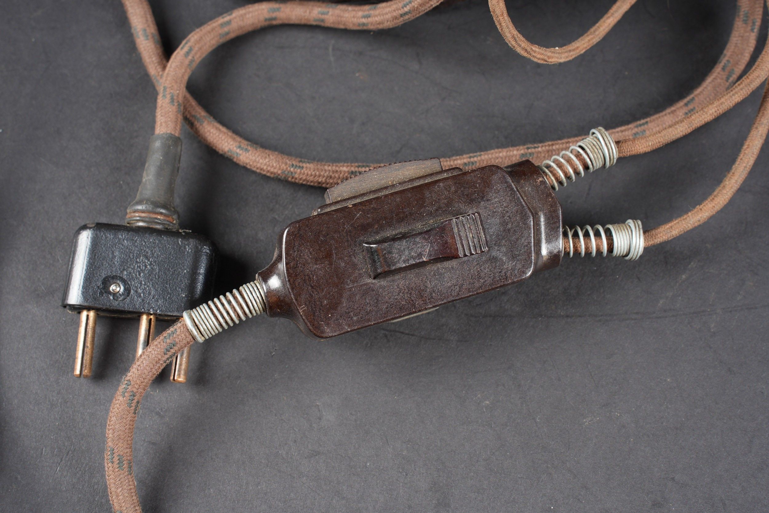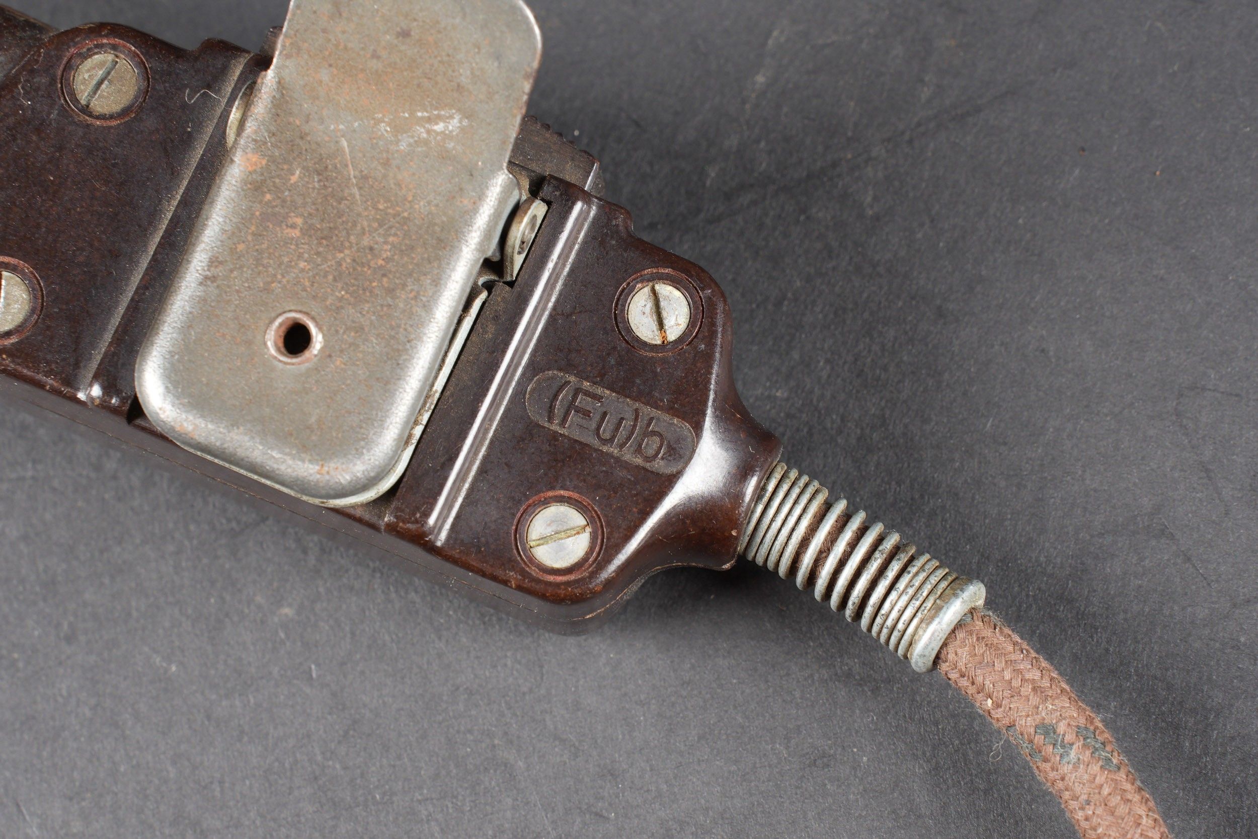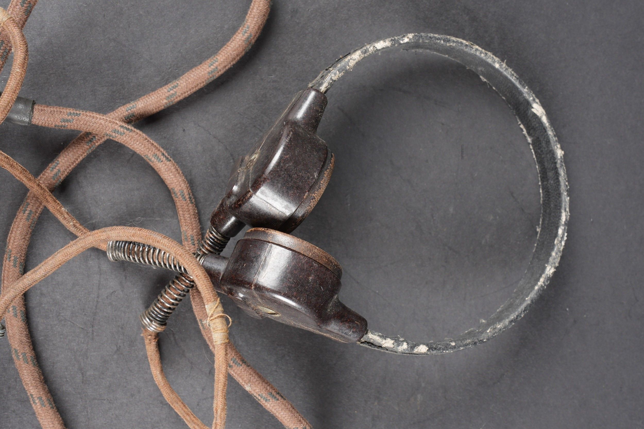 Laryngophone Panzer. Armature en métal, recouverte d'un cuir noir, présentant des marques d'usure. Parties en bakélite complètes. Câble complet avec sa prise. Boitier en bakélite complet avec sa pince fonctionnelle. Toutes les pièces mobiles sont fonctionnelles. Marquages FuB. A noter une certaine usure et patine de la pièce. Etat II+. Panzer throat microphone. Metal frame covered in black leather showing wear. Complete bakelite components. Cable and plug complete. Bakelite control box present with functional clip. All moving parts functional. Marked FuB. Some wear and patina. Condition II+.