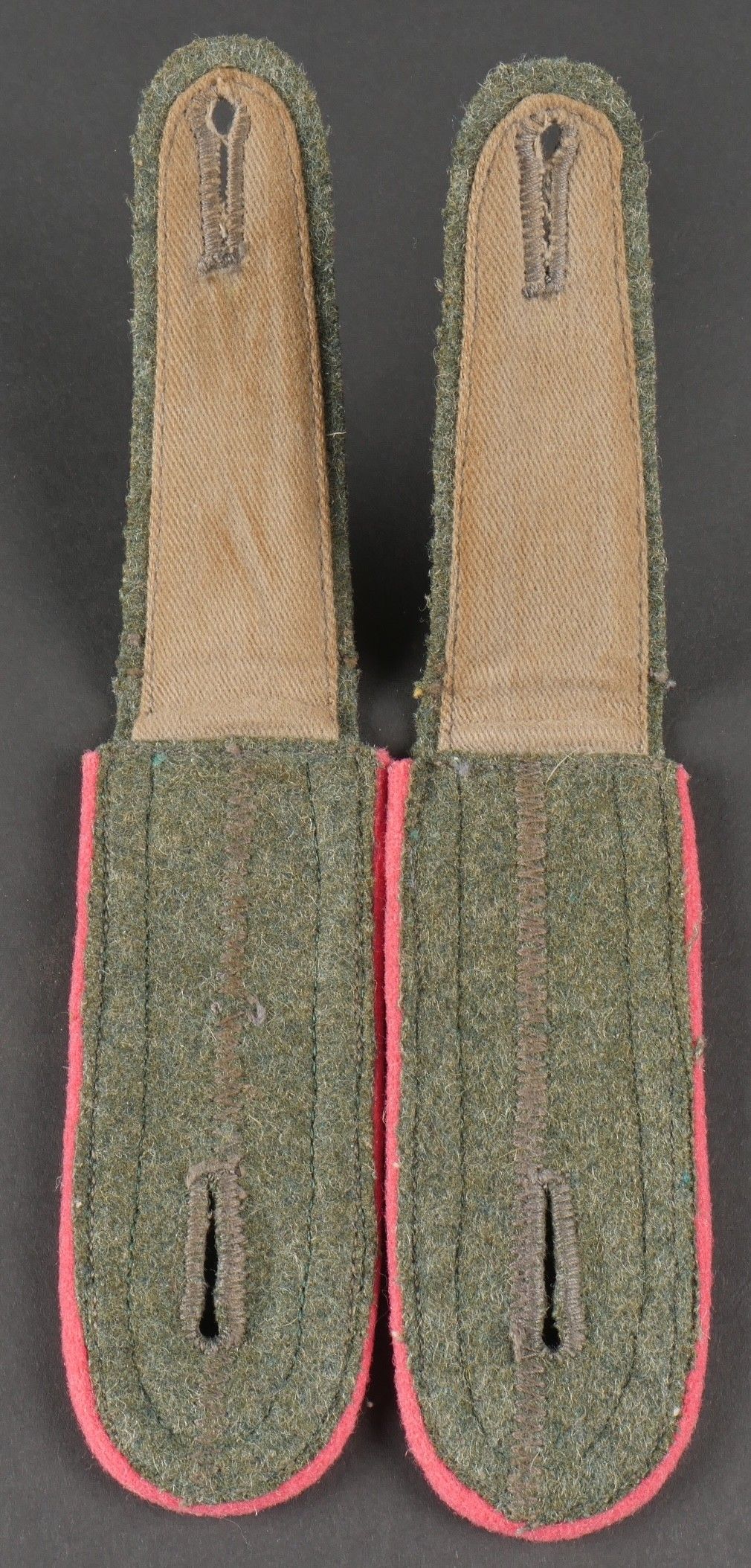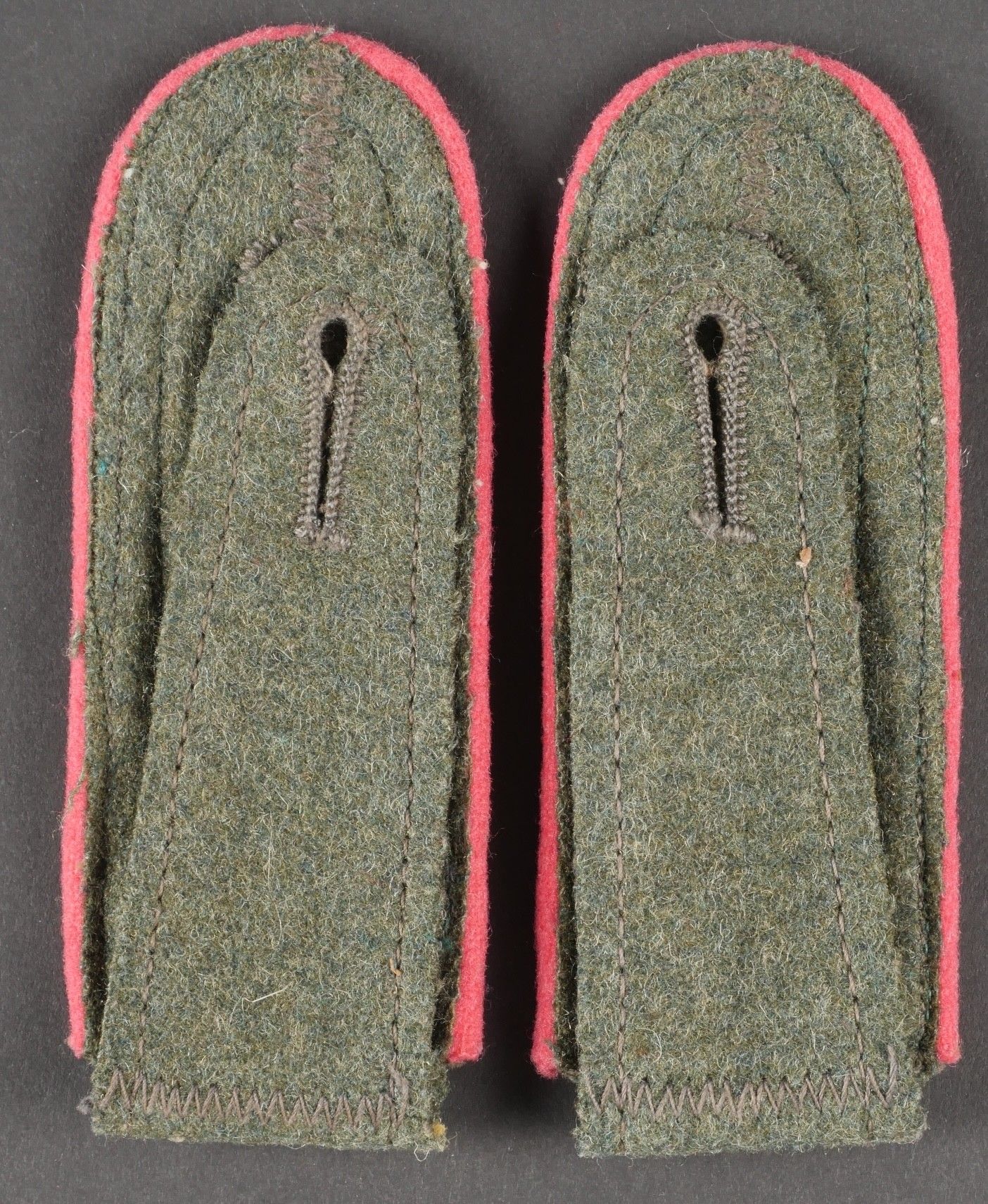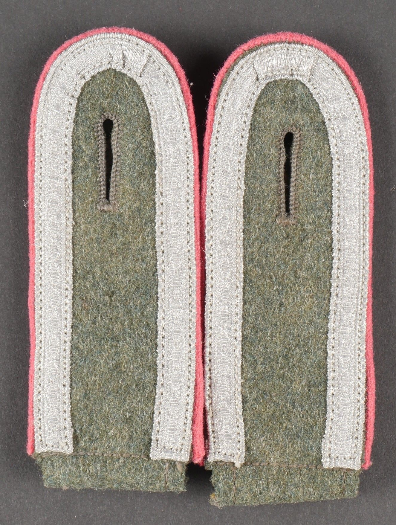Paire de patte d'épaule Panzer. Modèle pour Unteroffizier. Paire homogène en drap Feldgrau. Liseré rose des unités blindées. Galon argent faisant en parti le tour des pièces. A noter une certaine usure et patine des pièces. Etat II+. Pair of Panzer shoulder boards. Model for Unteroffizier. Matching pair made of Feldgrau wool with pink piping for armored units. Silver tresse partially surrounding the edges. Showing light wear and patina. Condition II+.