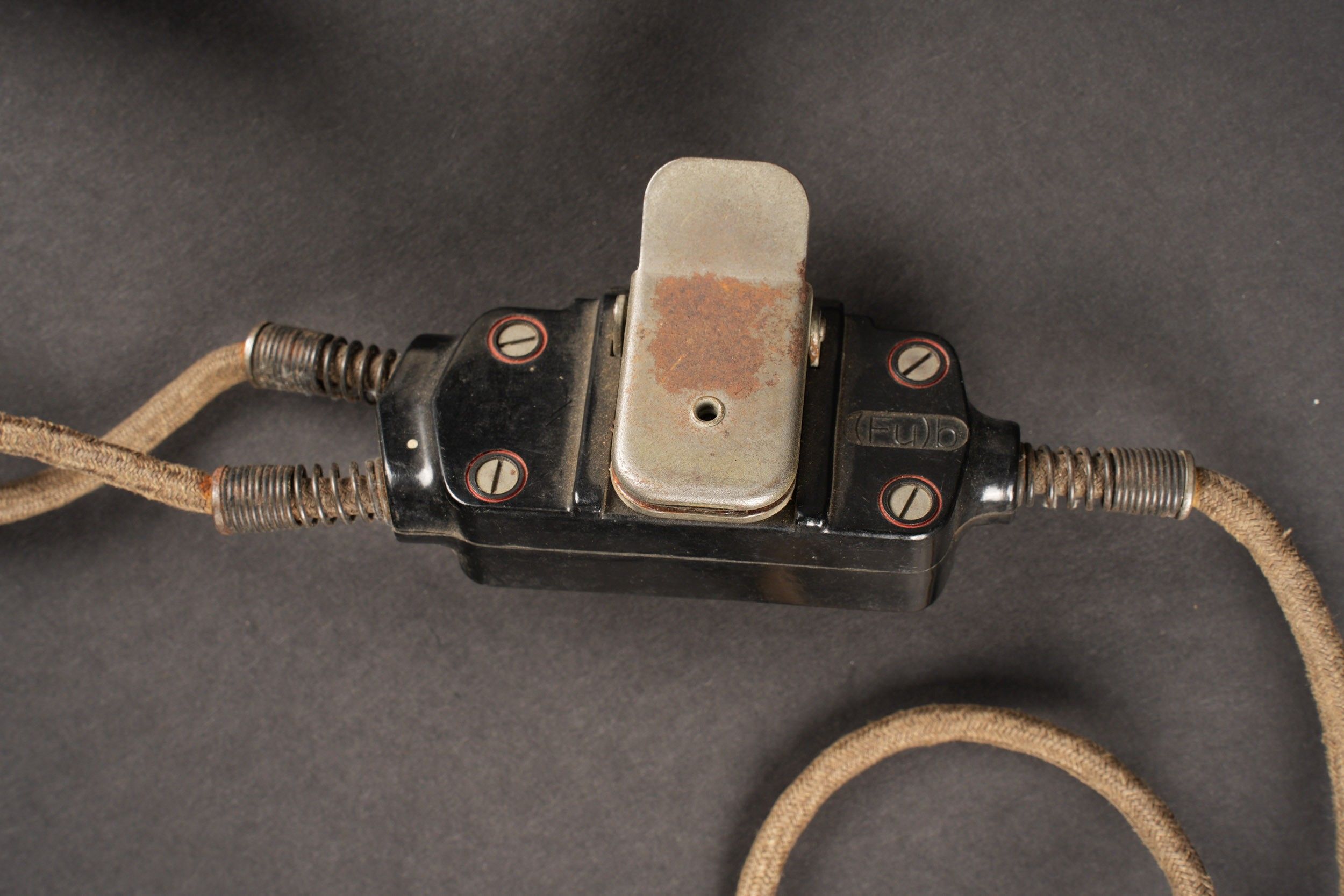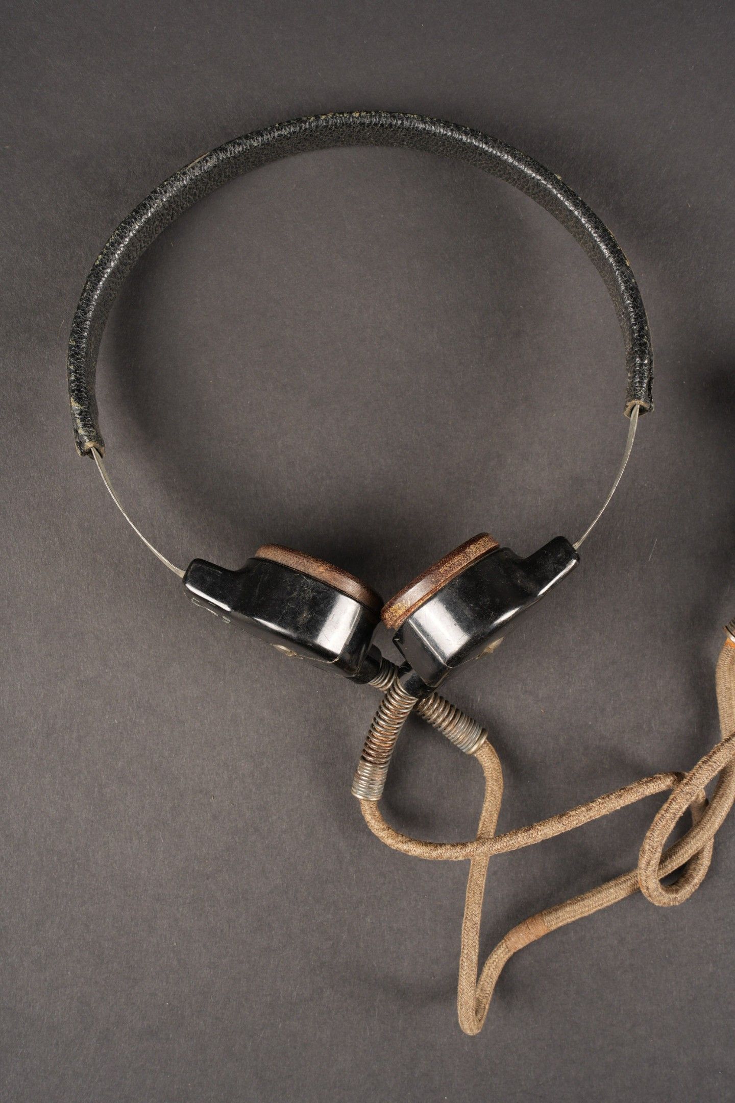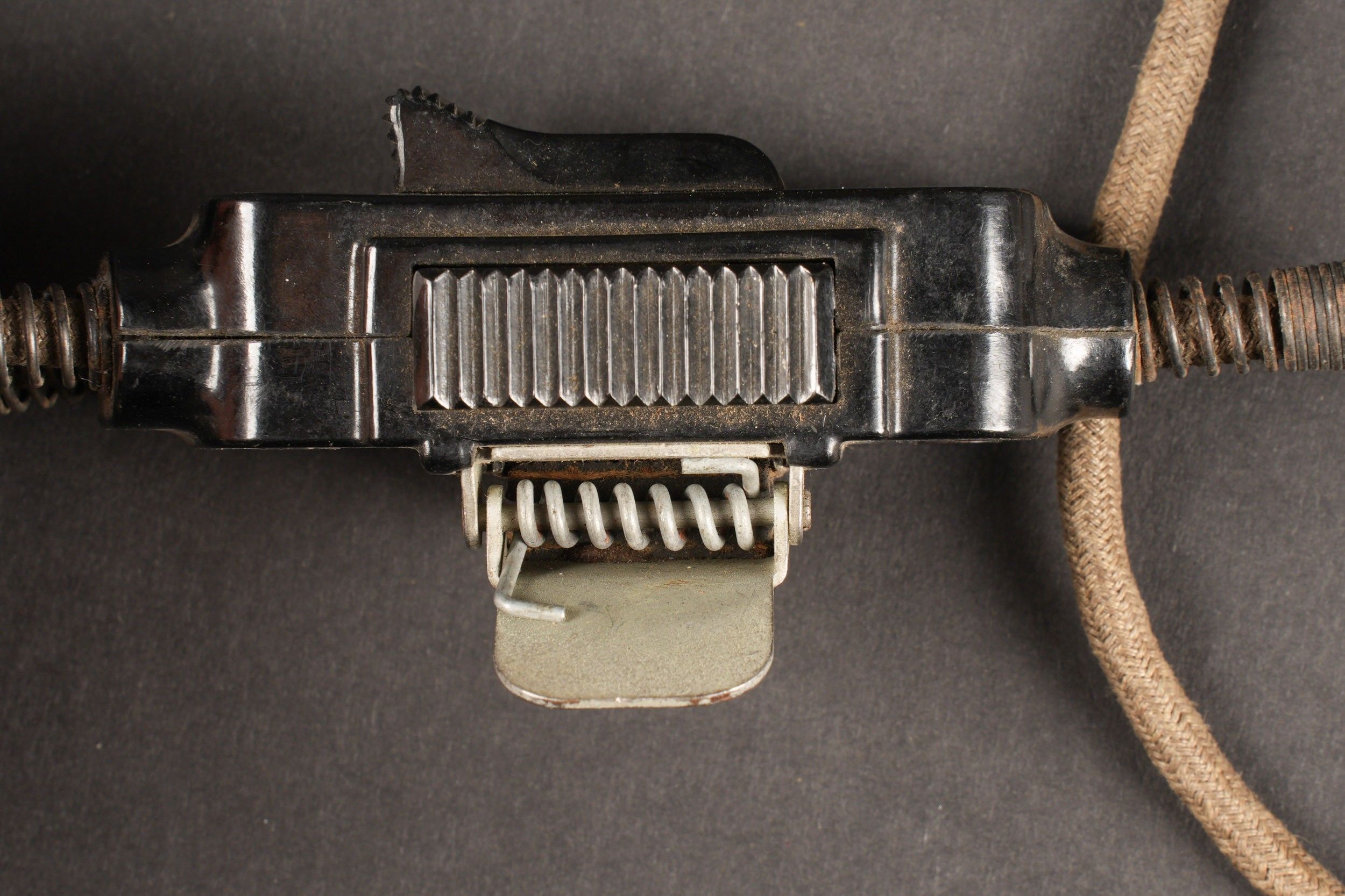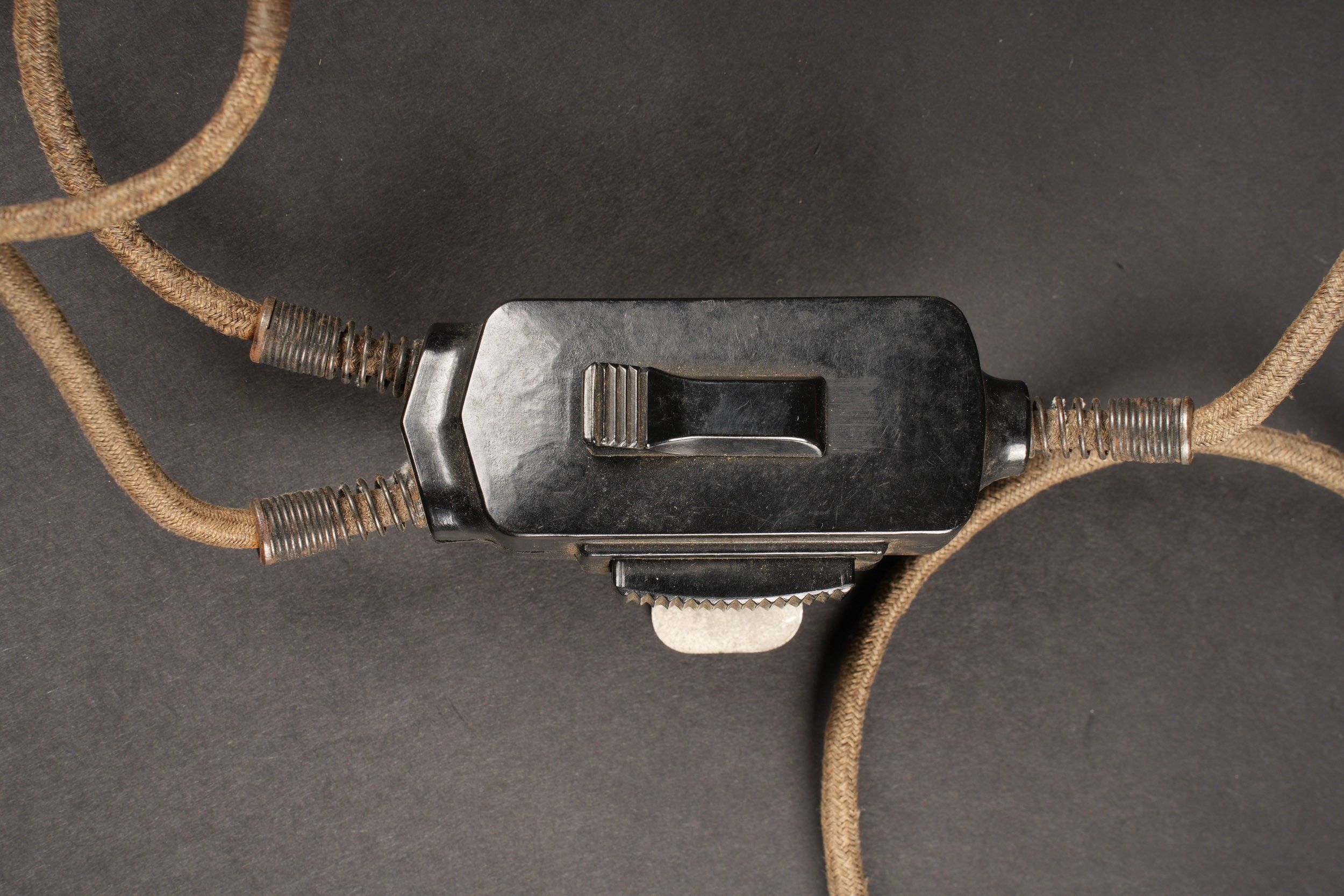 Laryngophone Panzer. Armature en métal, recouverte d'un cuir noir, présentant des marques d'usure. Parties en bakélite complètes. Câble complet avec sa prise. Boitier en bakélite complet avec sa pince fonctionnelle. Toutes les pièces mobiles sont fonctionnelles. A noter une certaine usure et patine de la pièce. Etat II+. Panzer throat microphone. Metal frame covered in black leather showing wear. Complete bakelite components. Complete cable and plug. Bakelite control box with functional clip. All parts operational. Some wear and patina. Condition II+.