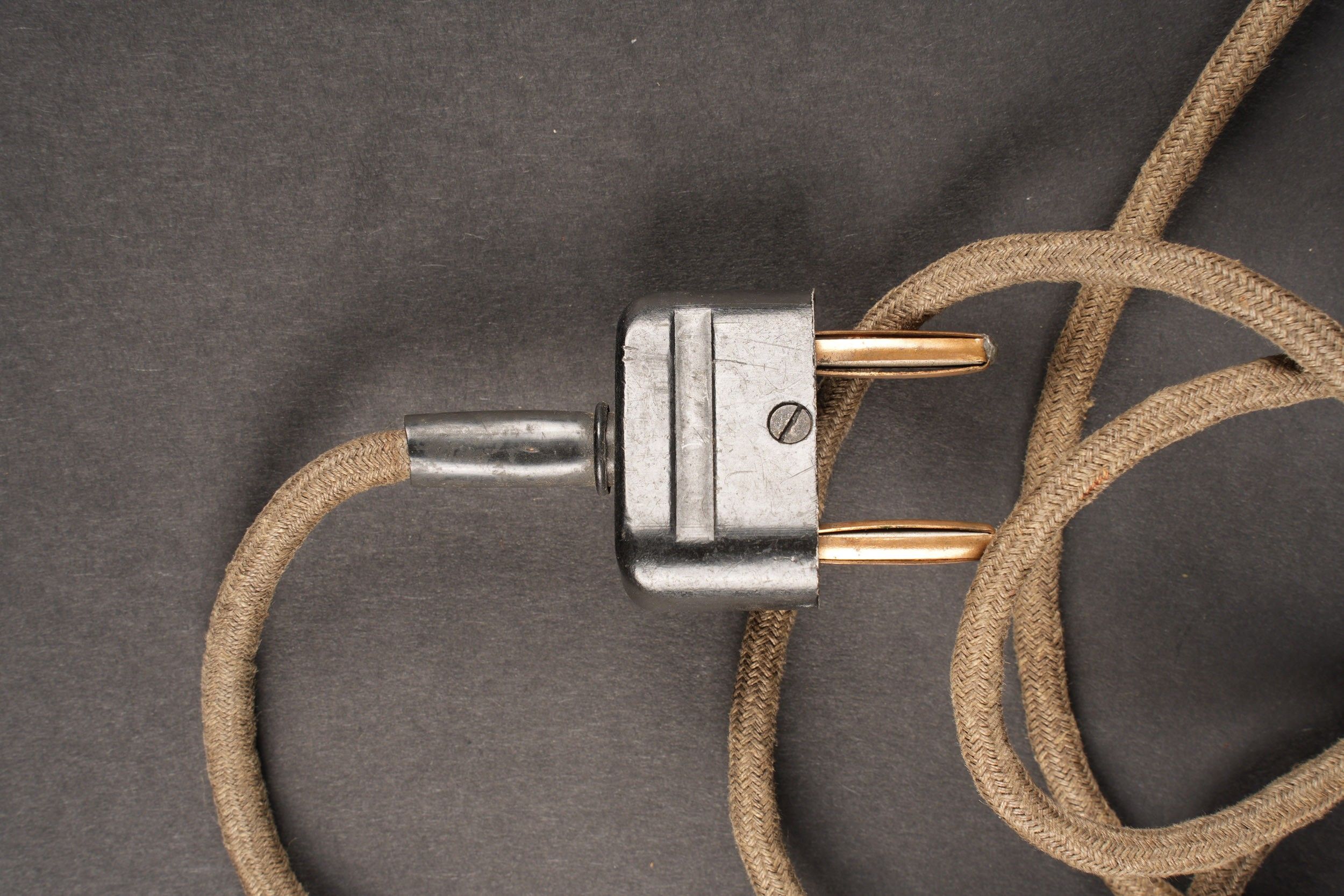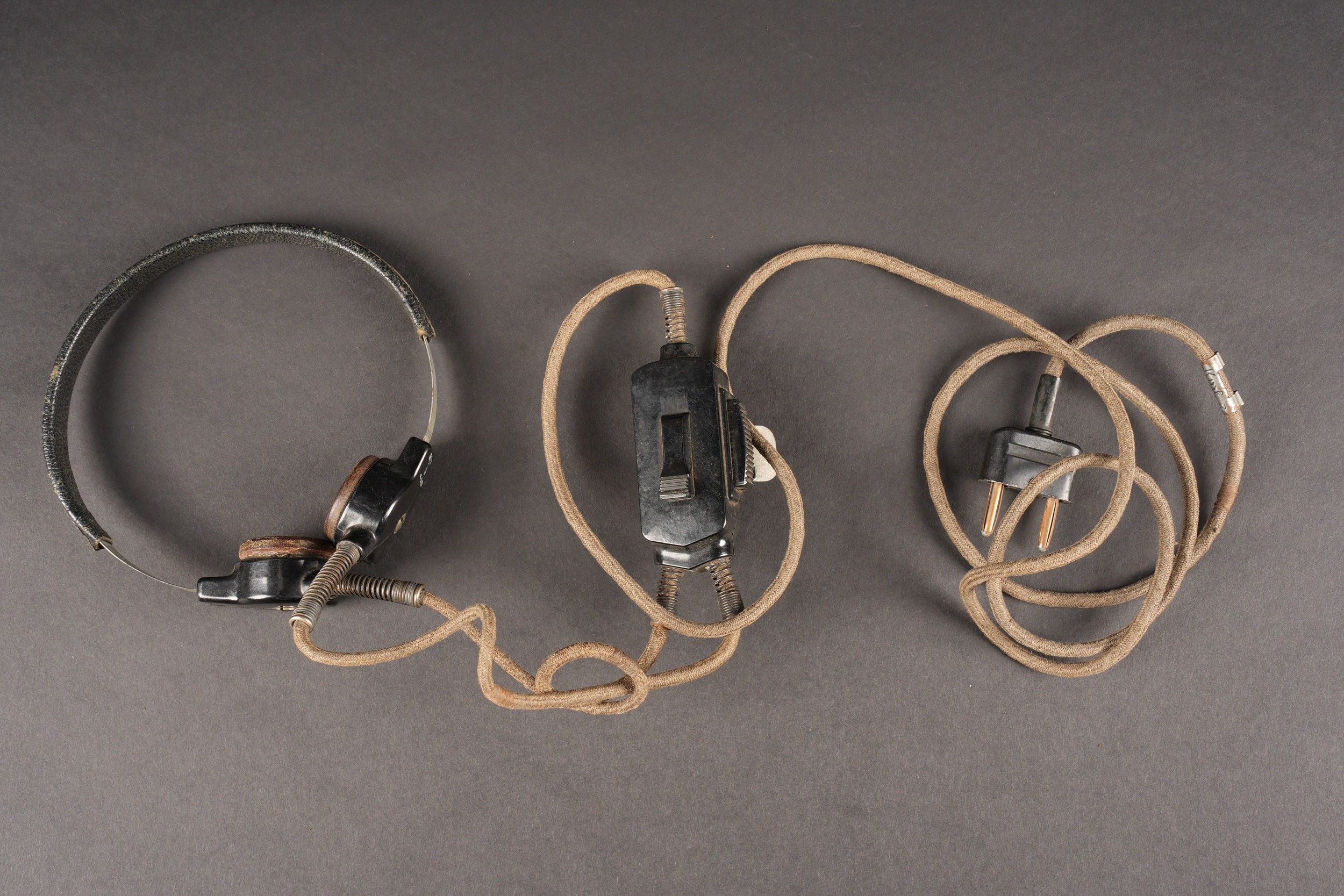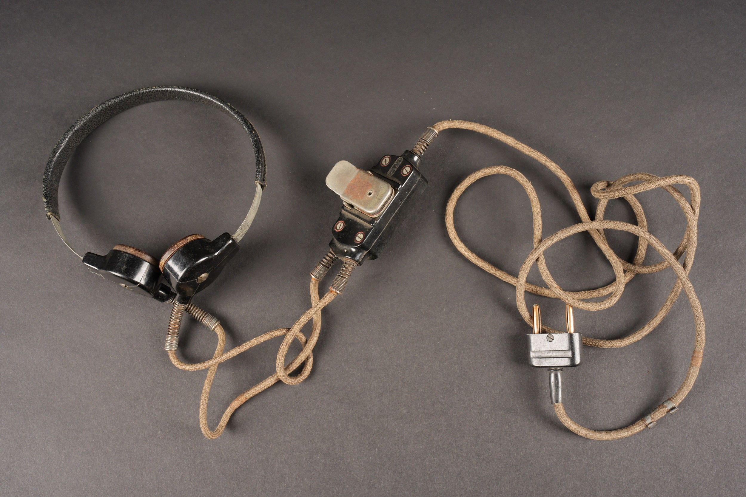 Laryngophone Panzer. Armature en métal, recouverte d'un cuir noir, présentant des marques d'usure. Parties en bakélite complètes. Câble complet avec sa prise. Boitier en bakélite complet avec sa pince fonctionnelle. Toutes les pièces mobiles sont fonctionnelles. A noter une certaine usure et patine de la pièce. Etat II+. Panzer throat microphone. Metal frame covered in black leather showing wear. Complete bakelite components. Complete cable and plug. Bakelite control box with functional clip. All parts operational. Some wear and patina. Condition II+.