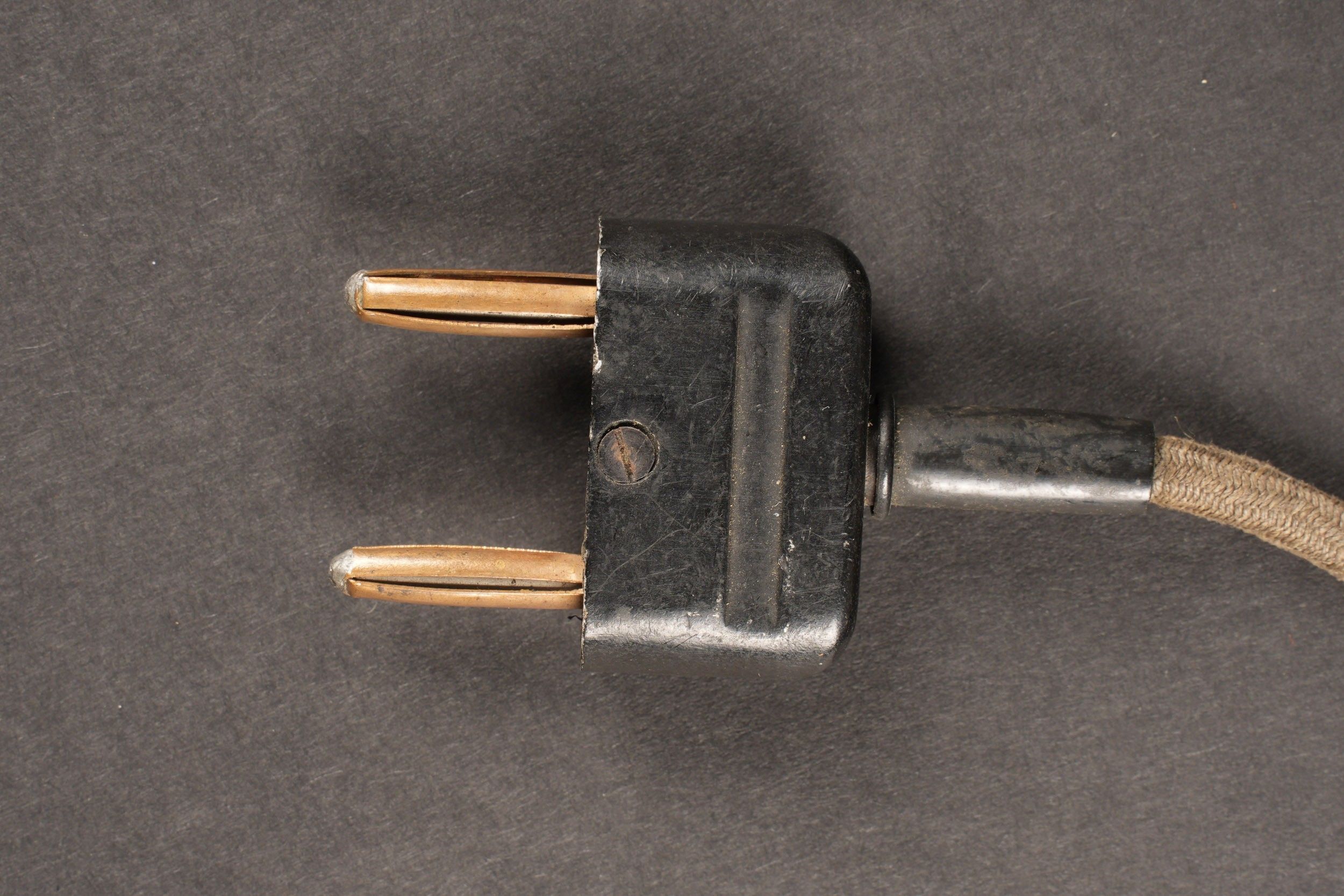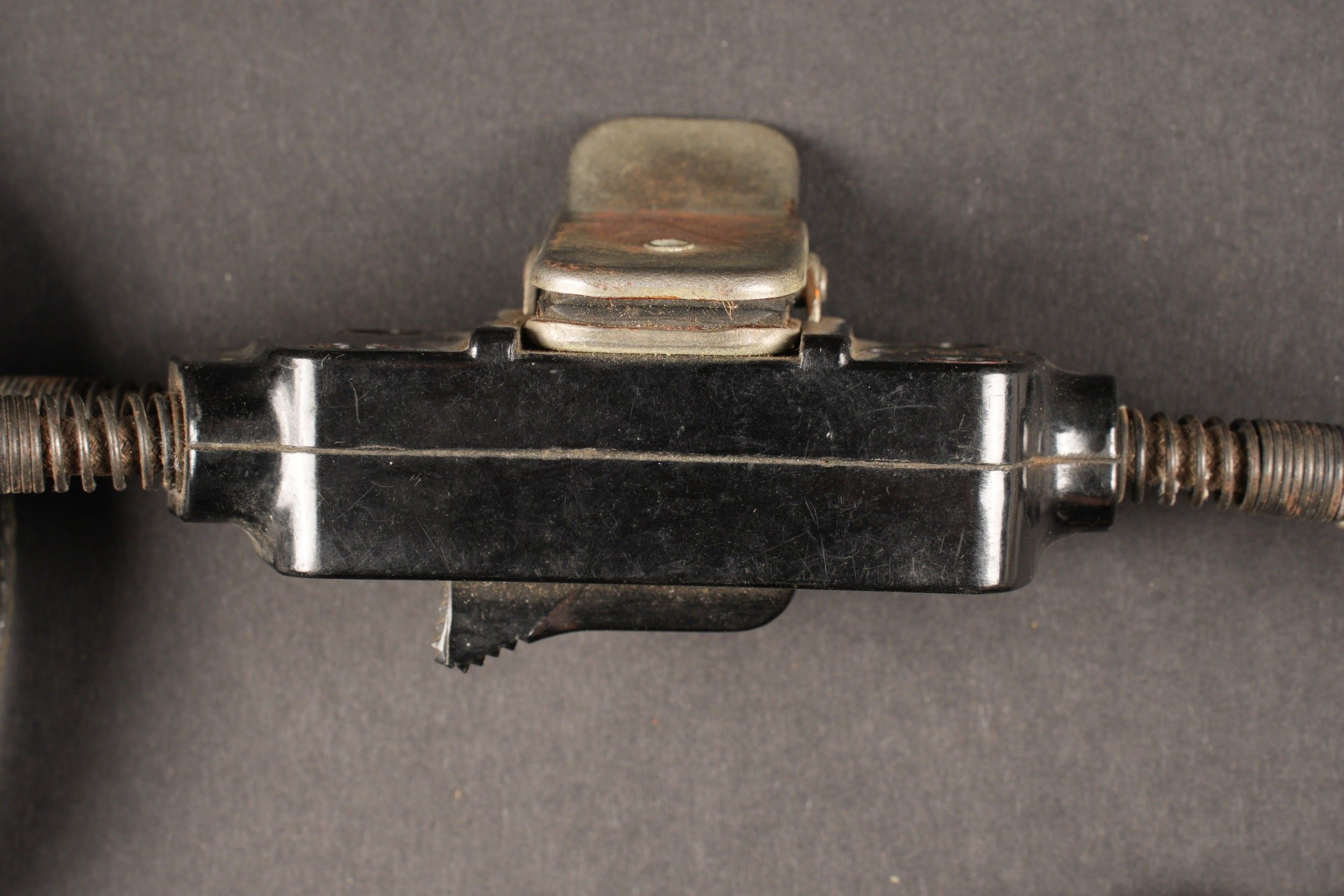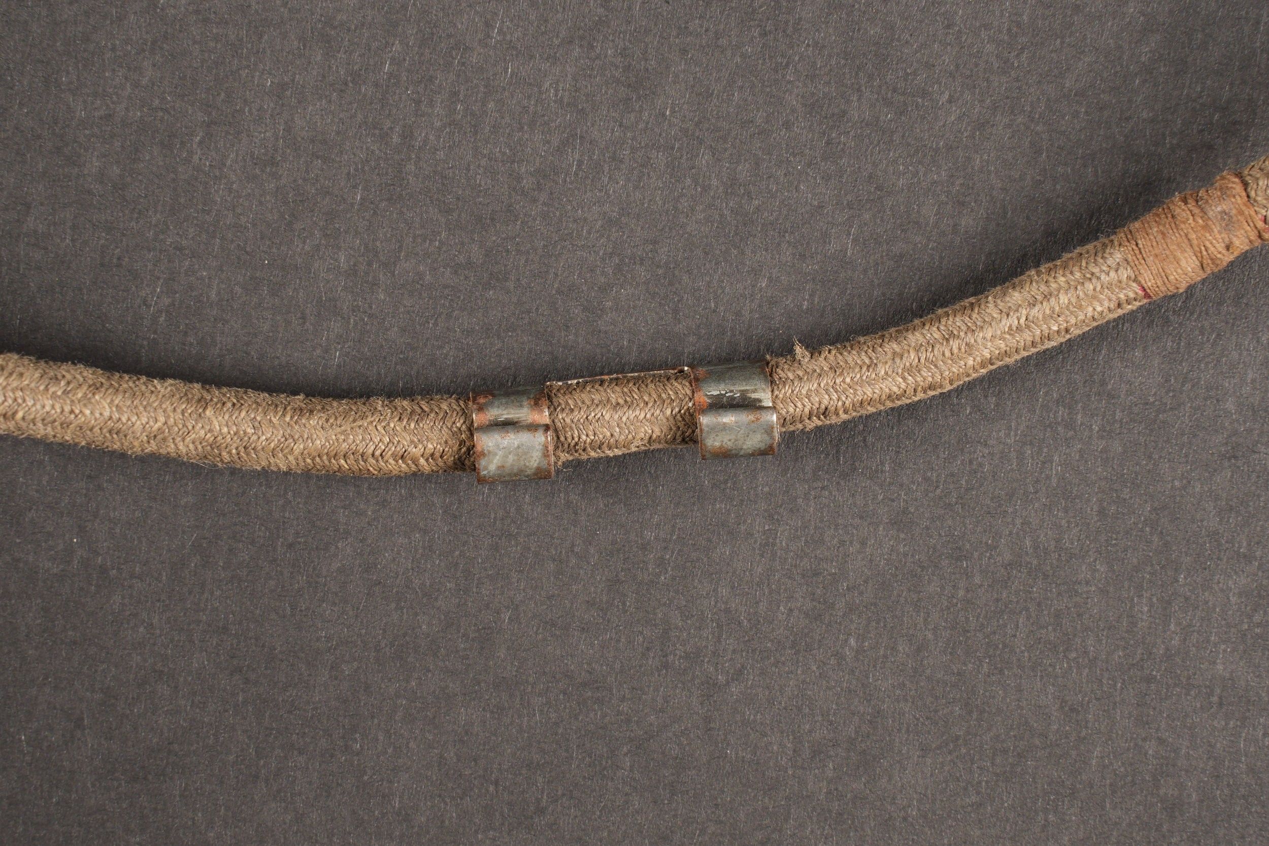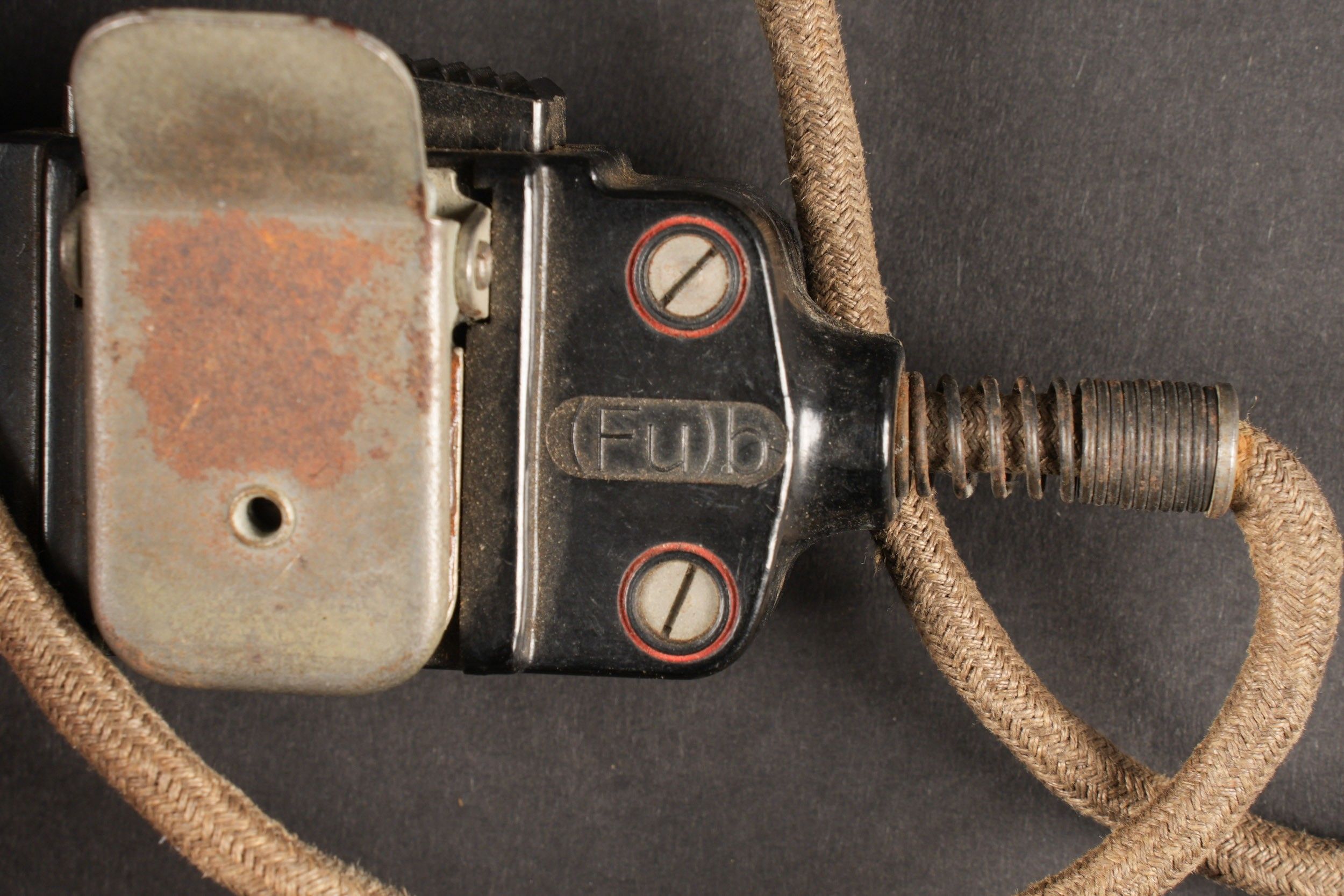 Laryngophone Panzer. Armature en métal, recouverte d'un cuir noir, présentant des marques d'usure. Parties en bakélite complètes. Câble complet avec sa prise. Boitier en bakélite complet avec sa pince fonctionnelle. Toutes les pièces mobiles sont fonctionnelles. A noter une certaine usure et patine de la pièce. Etat II+. Panzer throat microphone. Metal frame covered in black leather showing wear. Complete bakelite components. Complete cable and plug. Bakelite control box with functional clip. All parts operational. Some wear and patina. Condition II+.