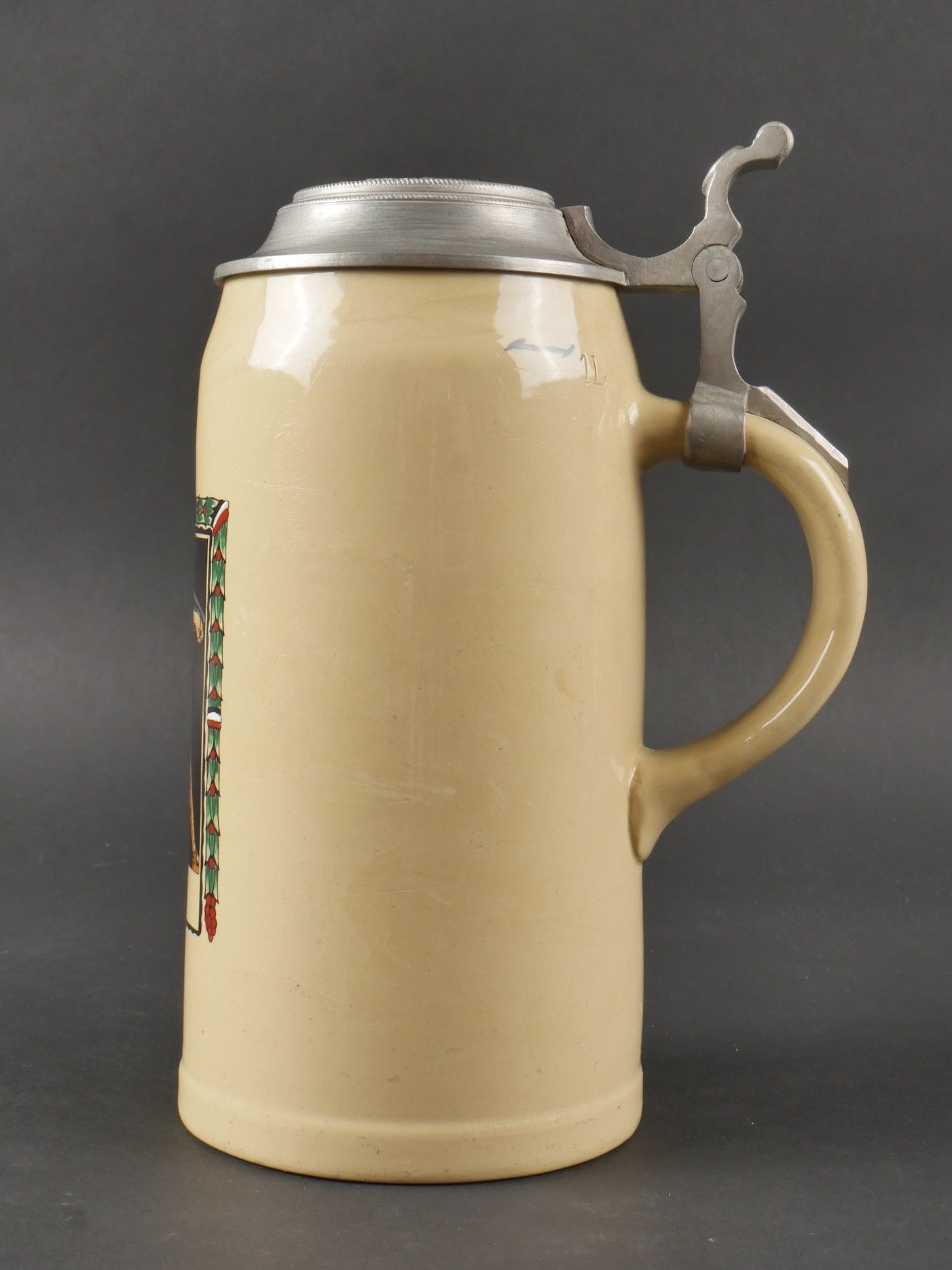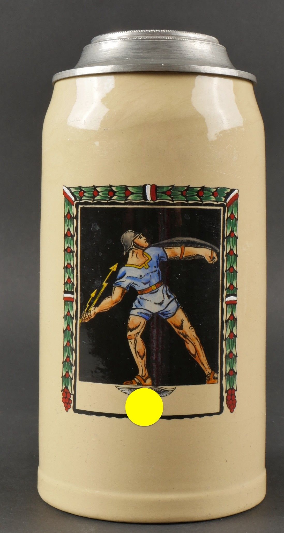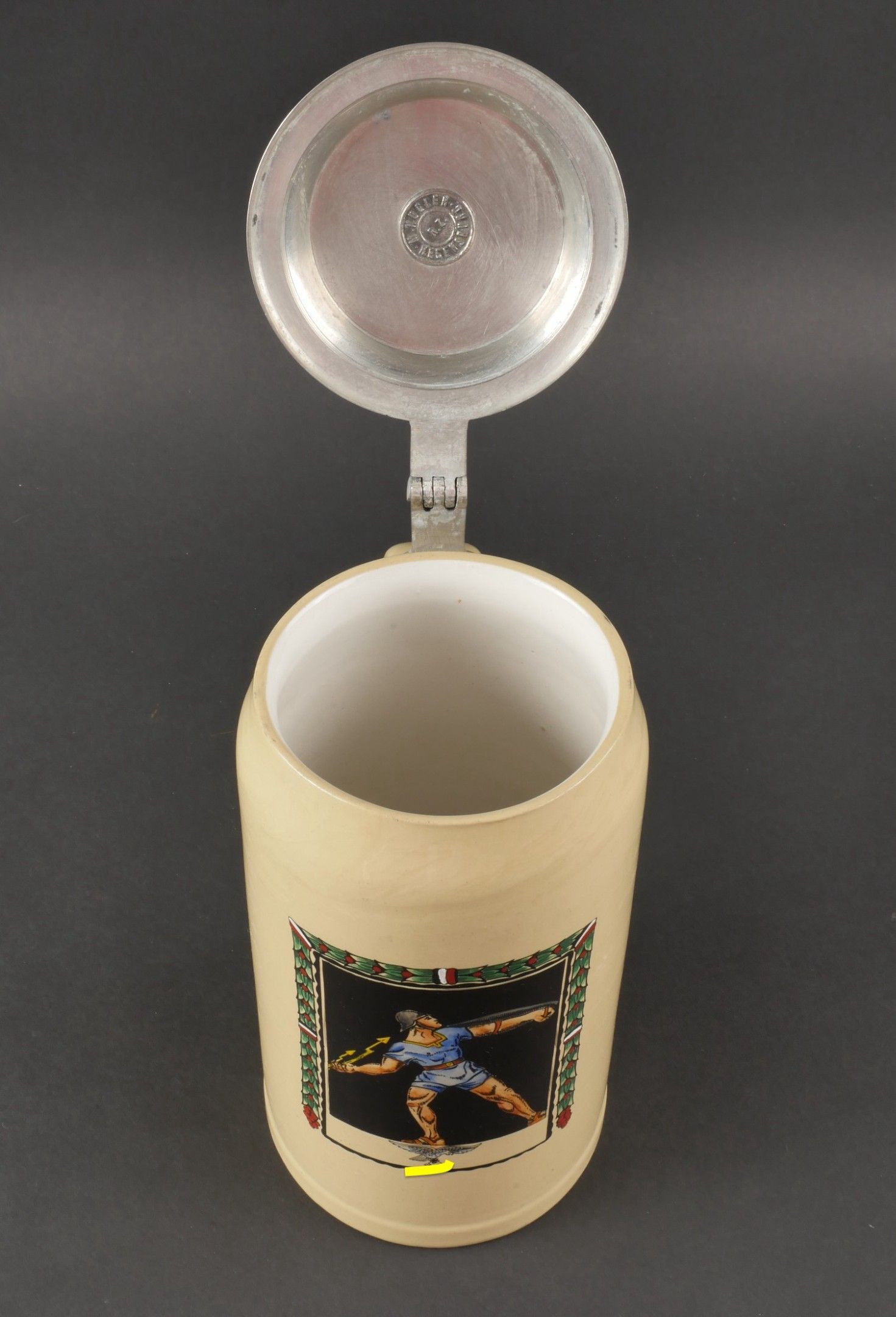 Chope de la Luftwaffe. En grès peint. Décors d'un soldat grec peint, bel aigle de la Luftwaffe du premier type. Couvercle disposant d'un casque avec insigne national allemand et d'insignes nationaux. 1 litre. Fabrication Kugler Regensburg. A noter une certaine usure et patine de la pièce. Etat II+. Luftwaffe beer stein. Stoneware, hand-painted. Depicts a Greek soldier and features a first-type Luftwaffe eagle. Pewter lid surmounted by a helmet with German national emblem and other insignia. Capacity 1 Litre. Maker: Kugler Regensburg. Shows some wear and patina. Condition II+.
