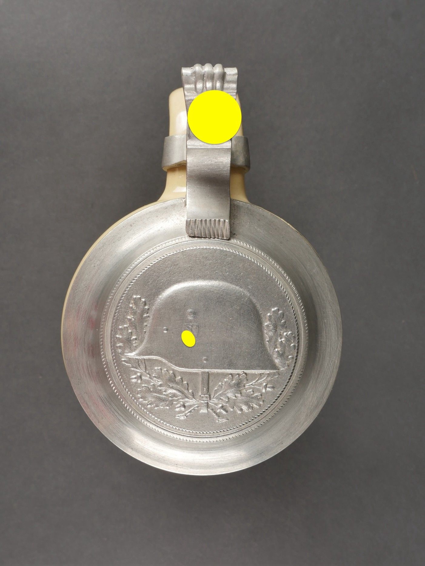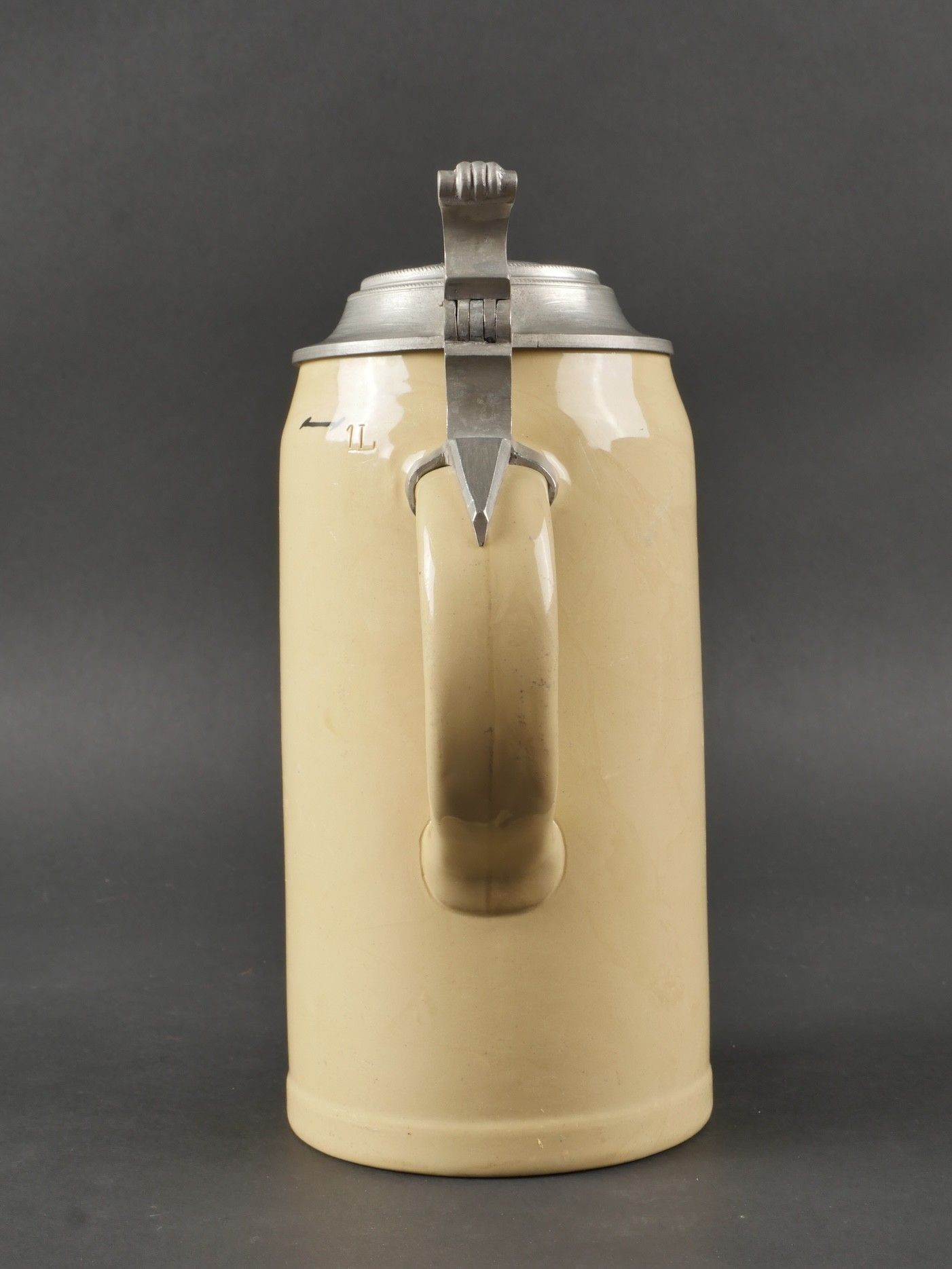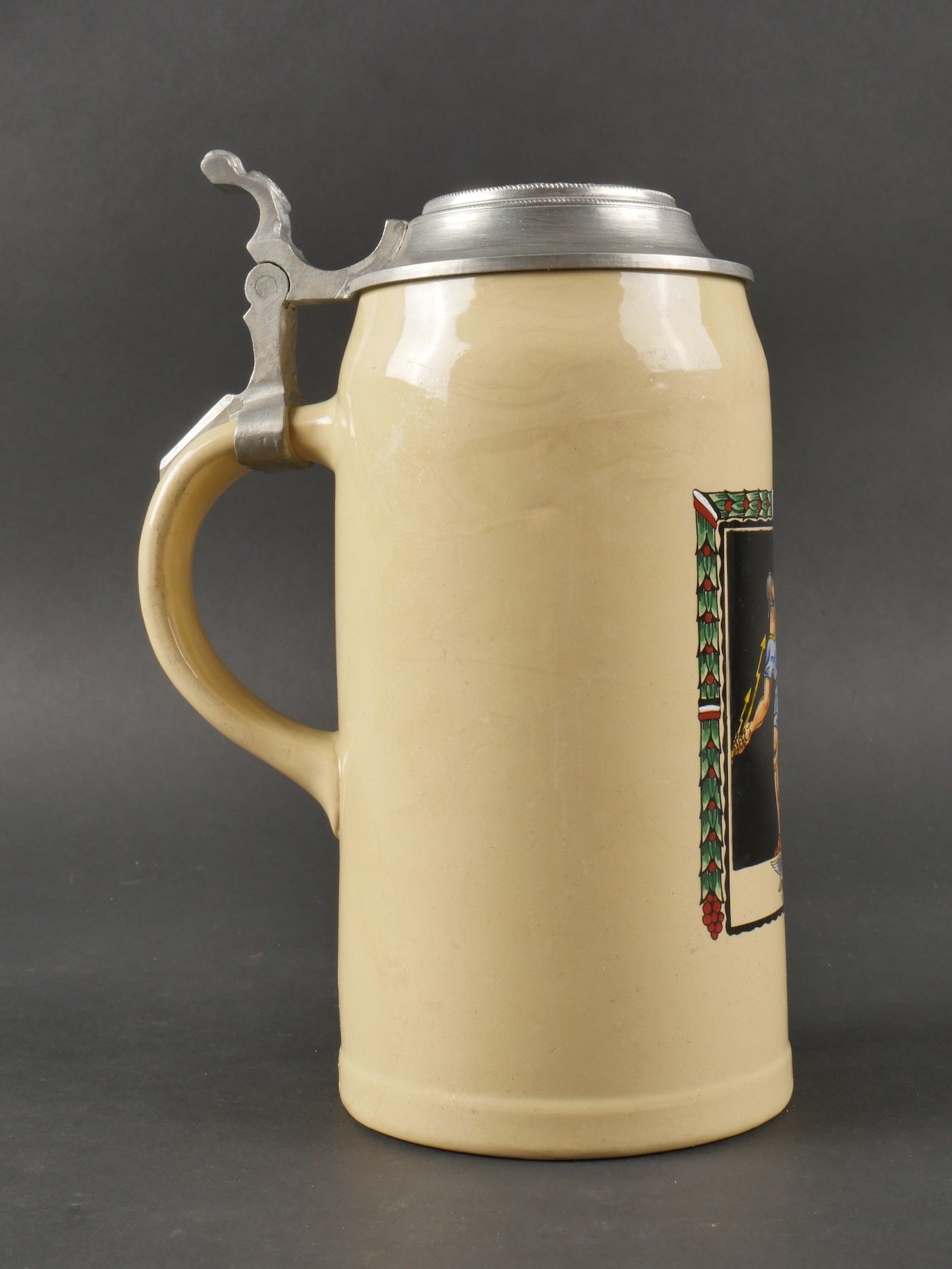 Chope de la Luftwaffe. En grès peint. Décors d'un soldat grec peint, bel aigle de la Luftwaffe du premier type. Couvercle disposant d'un casque avec insigne national allemand et d'insignes nationaux. 1 litre. Fabrication Kugler Regensburg. A noter une certaine usure et patine de la pièce. Etat II+. Luftwaffe beer stein. Stoneware, hand-painted. Depicts a Greek soldier and features a first-type Luftwaffe eagle. Pewter lid surmounted by a helmet with German national emblem and other insignia. Capacity 1 Litre. Maker: Kugler Regensburg. Shows some wear and patina. Condition II+.