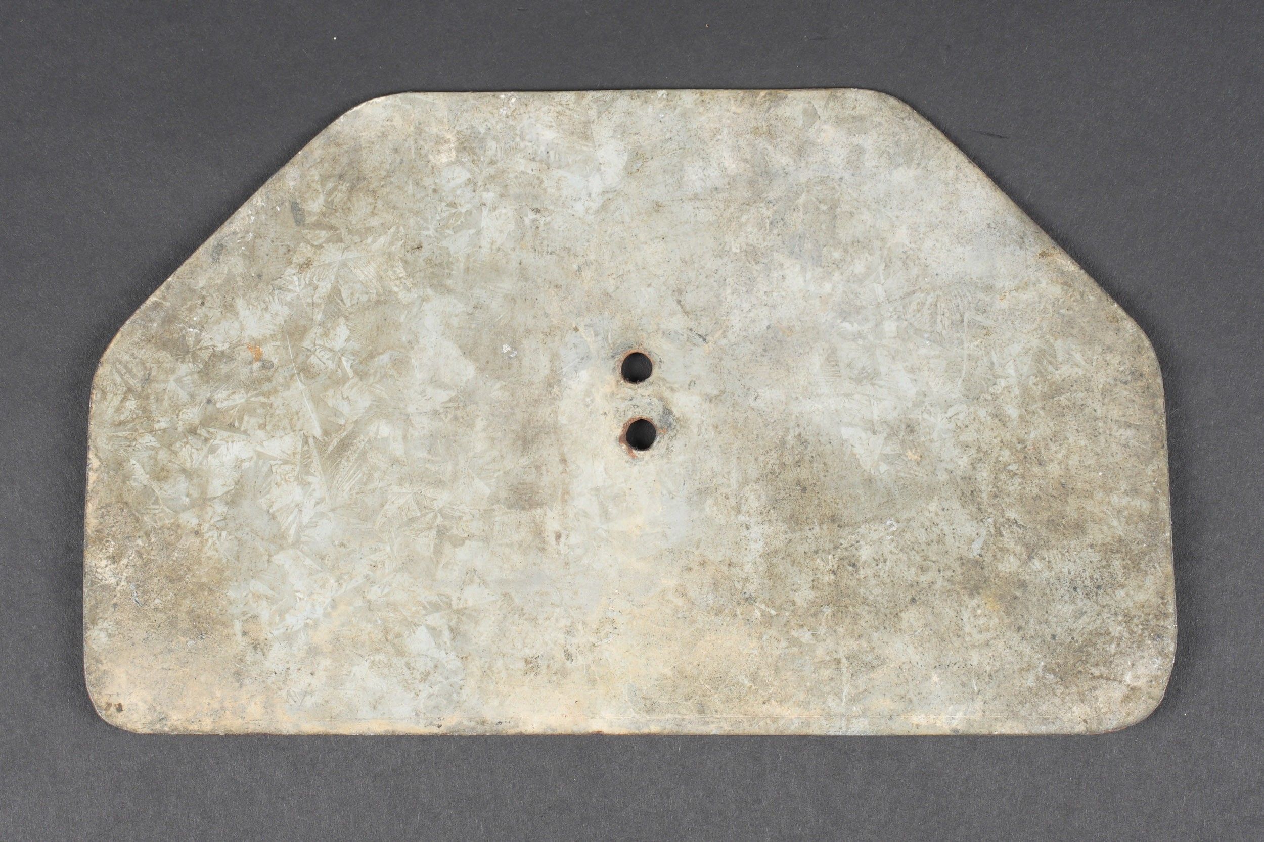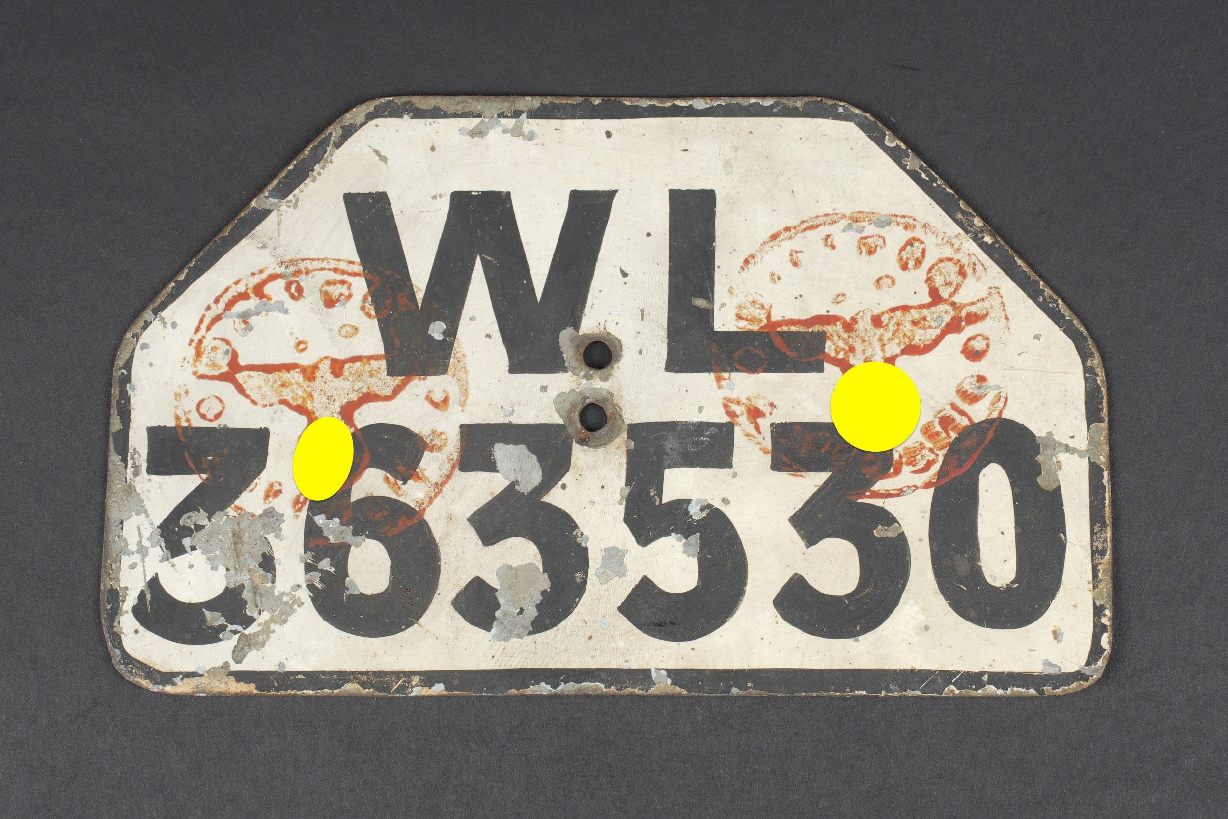 Plaque d'immatriculation de la Luftwaffe. En métal, bordure de couleur noir. Fond blanc. Marquages au pochoir WL 363530. Deux aigles allemand à la peinture rouge, les marquages sont illisibles. Deux points de fixation. Dimensions 12,2 x 20 cm. A noter une certaine usure et patine de la pièce. Etat II+. Luftwaffe license plate. Metal plate with black border and white background. Stenciled markings WL 363530. Two red-painted German eagles, markings partly illegible. Two mounting holes. Size 12.2 × 20 cm. Shows wear and patina. Condition II+.