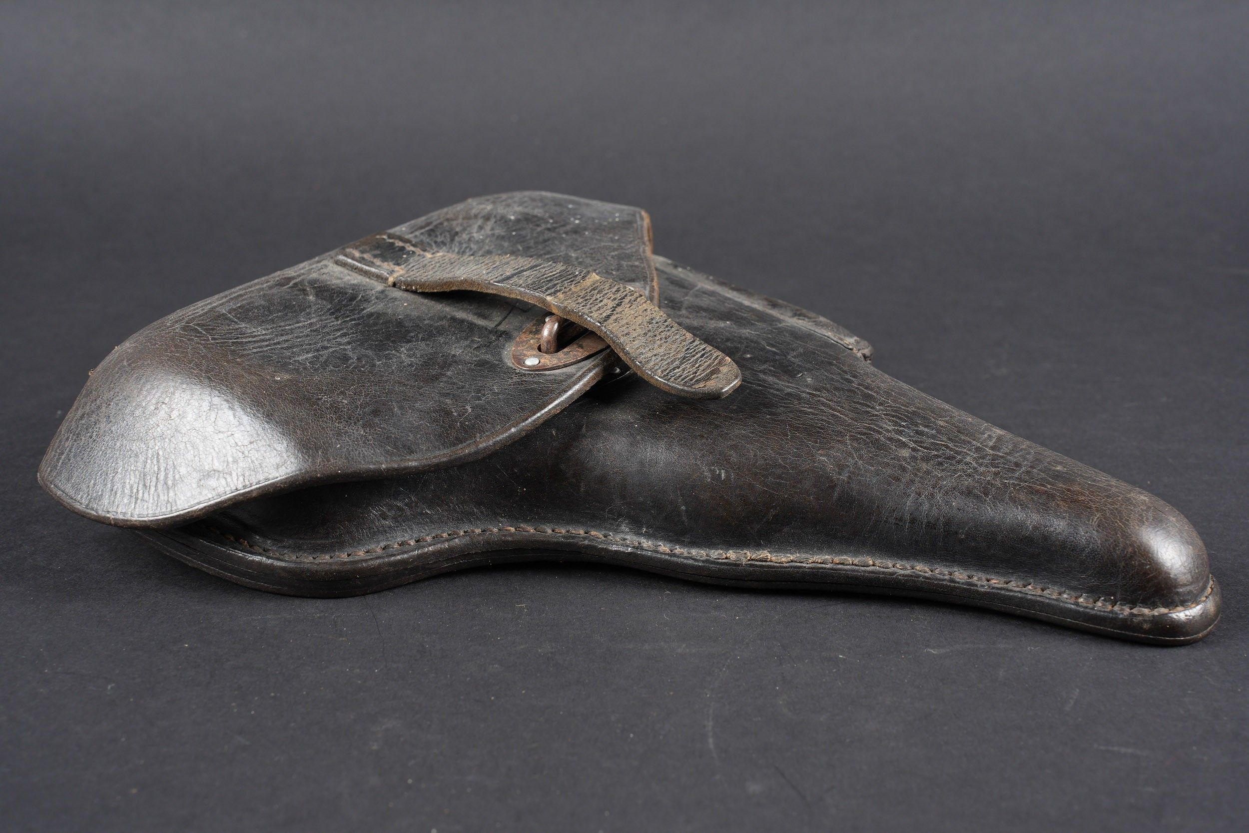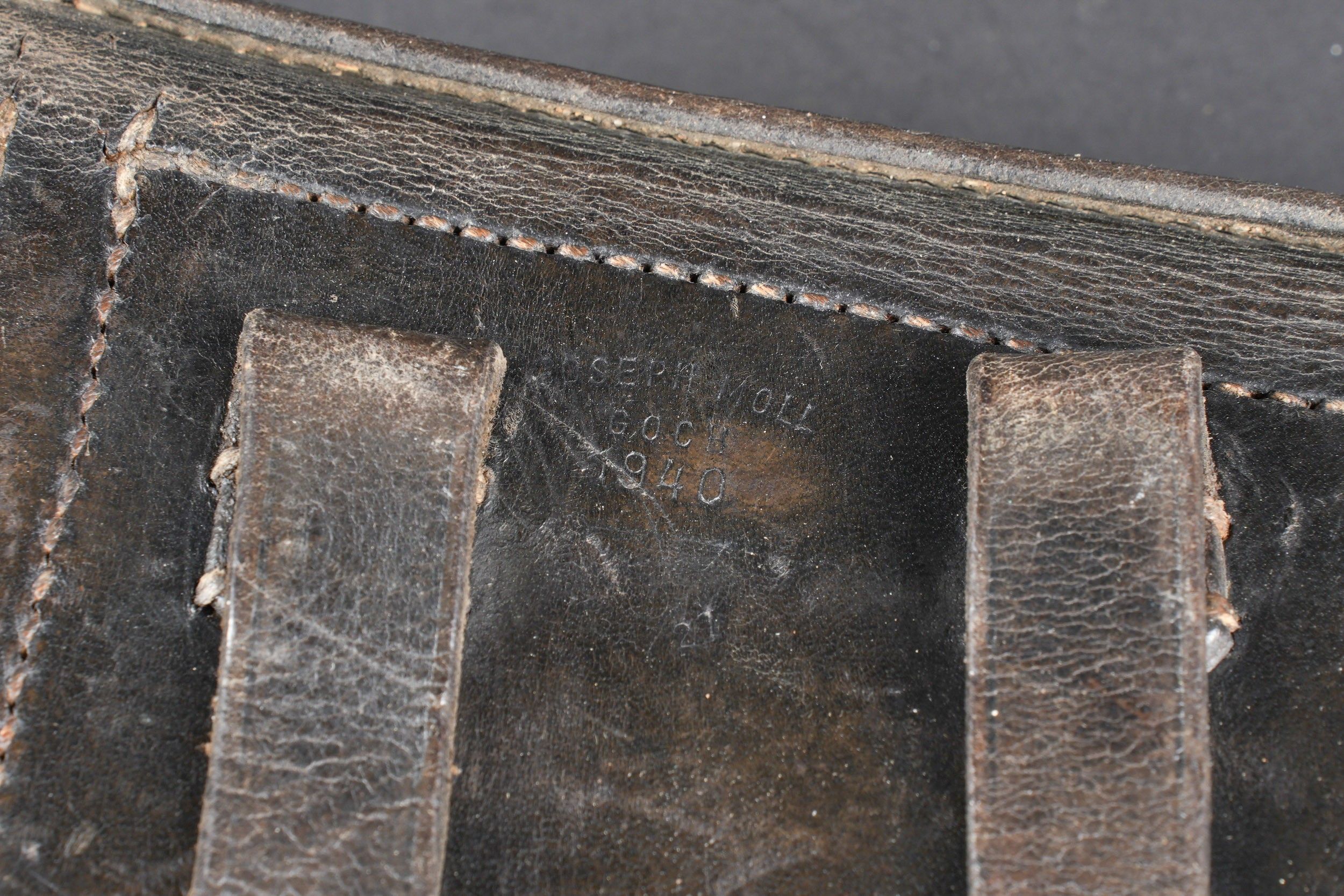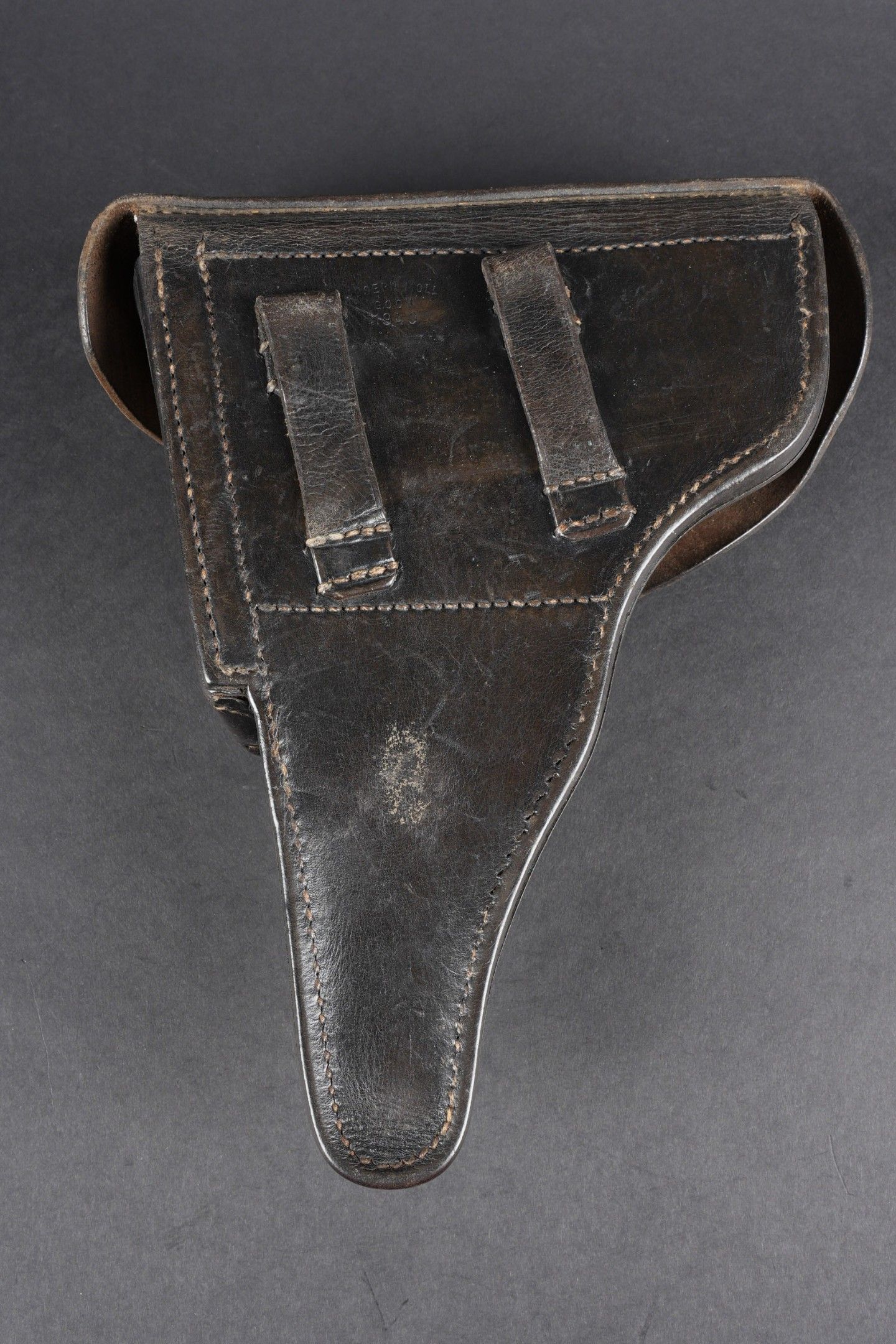 Holster de pistolet allemand P38. Premier modèle, en cuir noir. Sangle de fermeture complète. Les passants arrières sont complets. Fabrication Joseph Moll 1940. Indication régimentaire sous le rabat Fl.Div7.Stab. A noter une certaine usure et patine de la pièce. Etat II+. German P38 pistol holster. First model in black leather. Closure strap complete. Rear belt loops intact. Maker Joseph Moll 1940. Unit marking under the flap: Fl.Div.7.Stab. Shows some wear and patina. Condition II+.