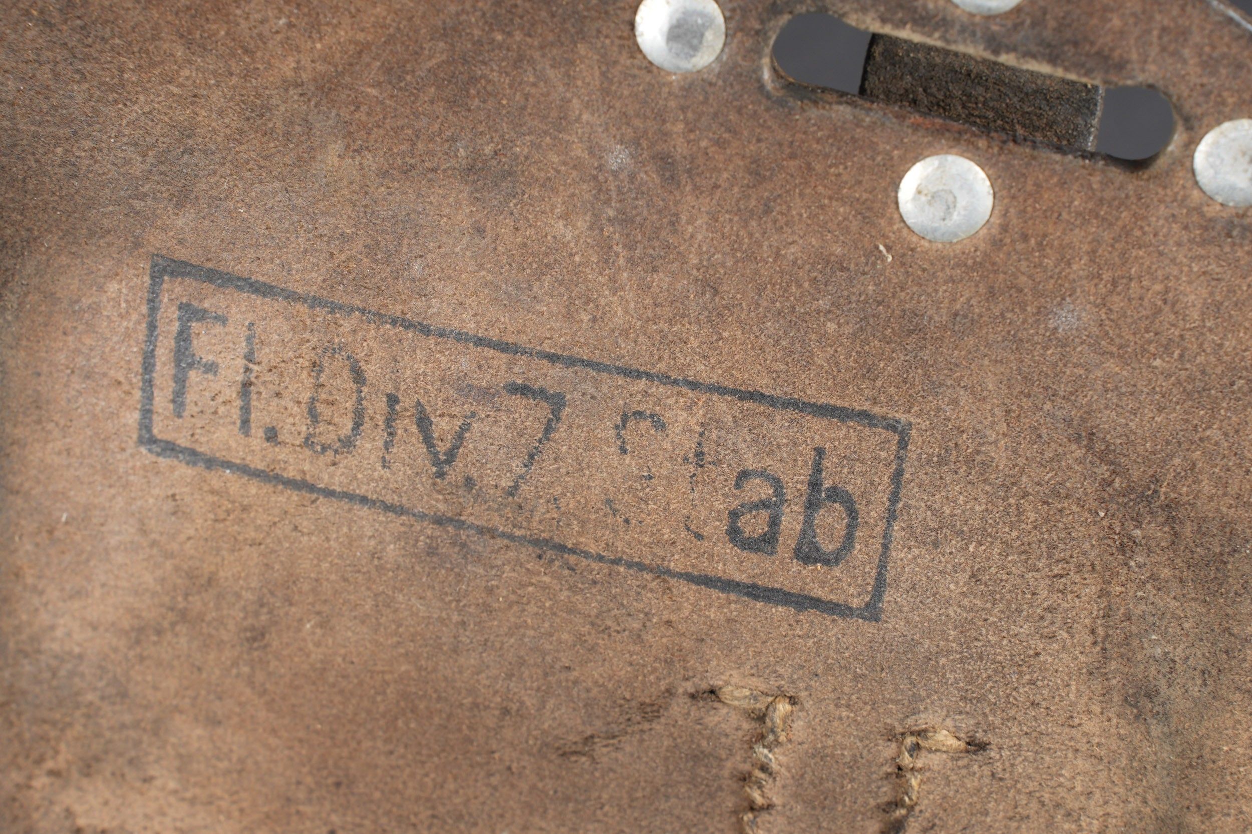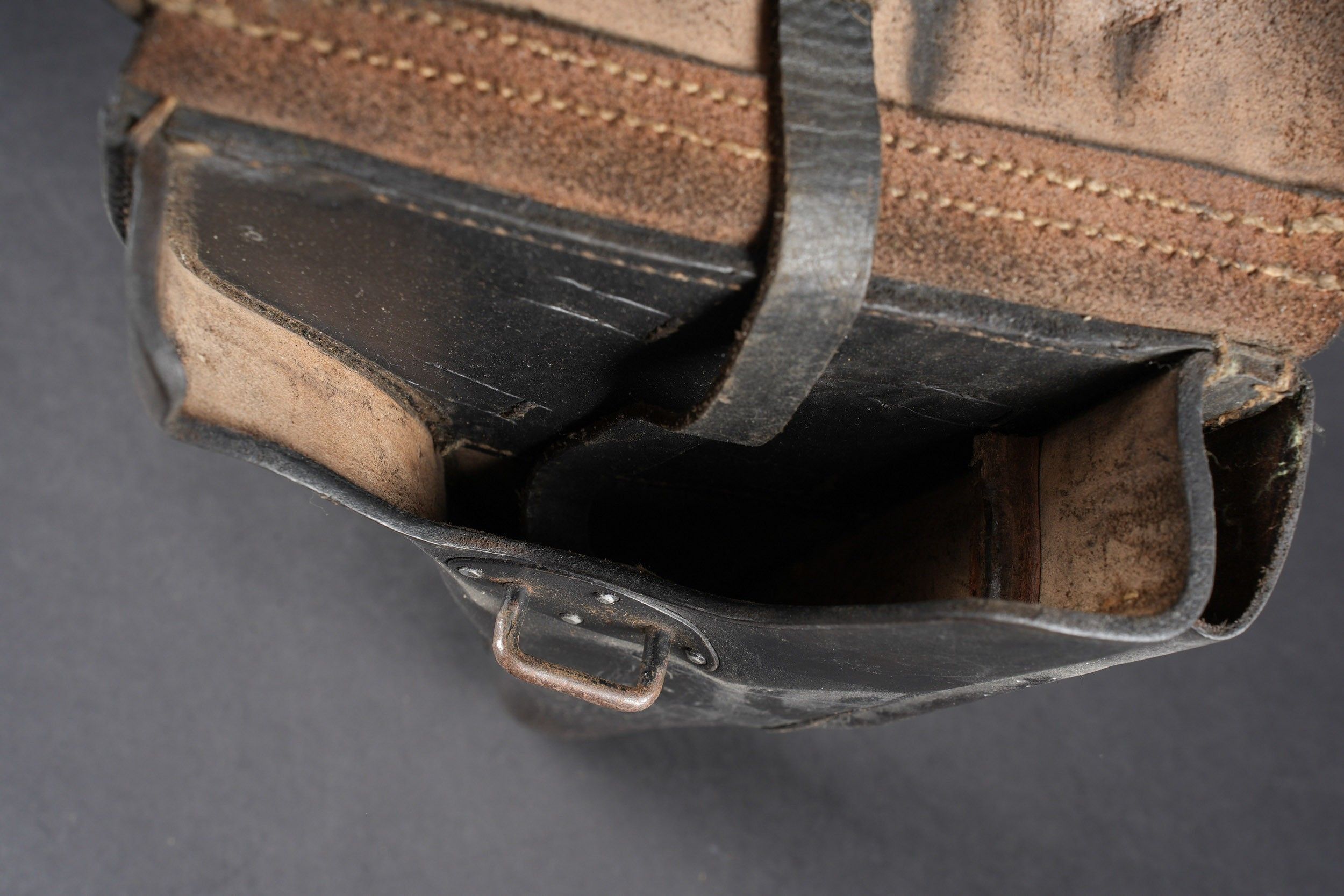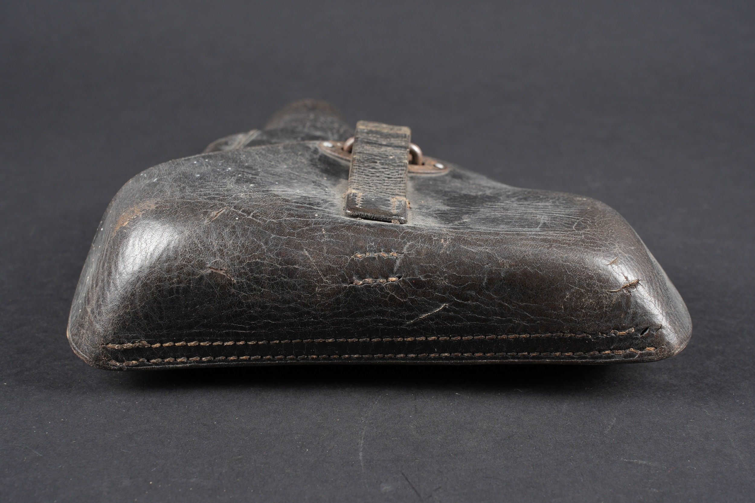 Holster de pistolet allemand P38. Premier modèle, en cuir noir. Sangle de fermeture complète. Les passants arrières sont complets. Fabrication Joseph Moll 1940. Indication régimentaire sous le rabat Fl.Div7.Stab. A noter une certaine usure et patine de la pièce. Etat II+. German P38 pistol holster. First model in black leather. Closure strap complete. Rear belt loops intact. Maker Joseph Moll 1940. Unit marking under the flap: Fl.Div.7.Stab. Shows some wear and patina. Condition II+.