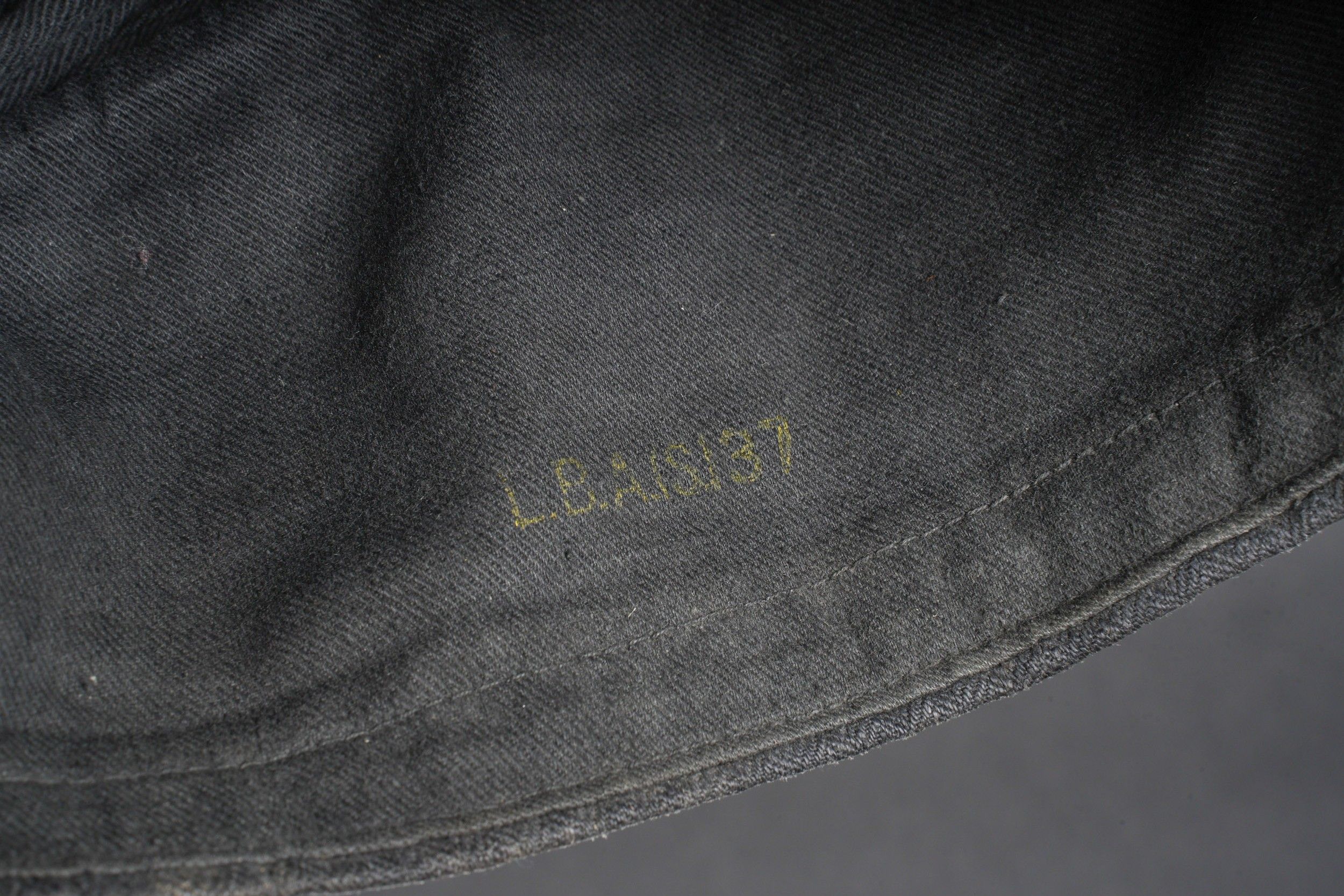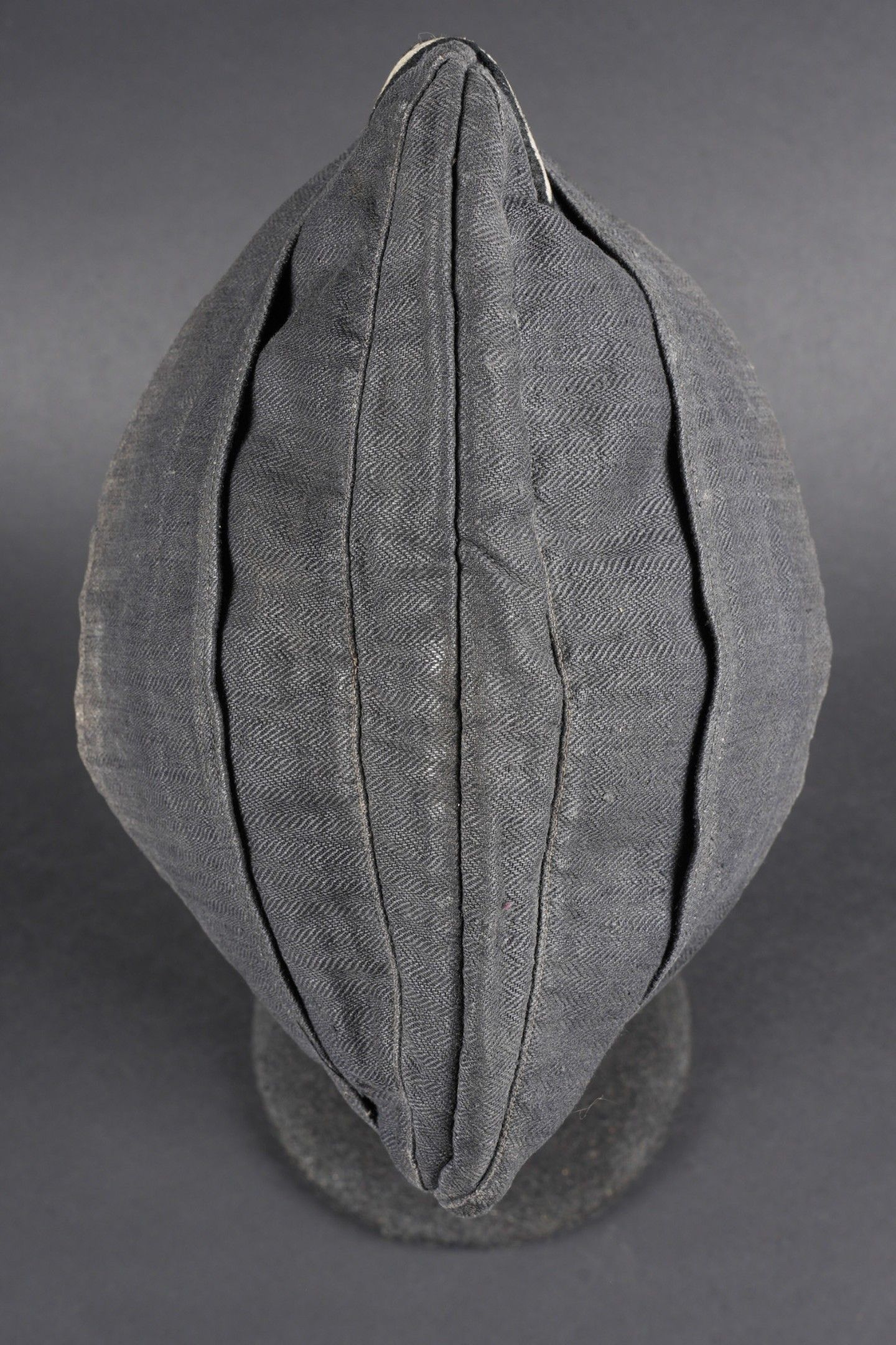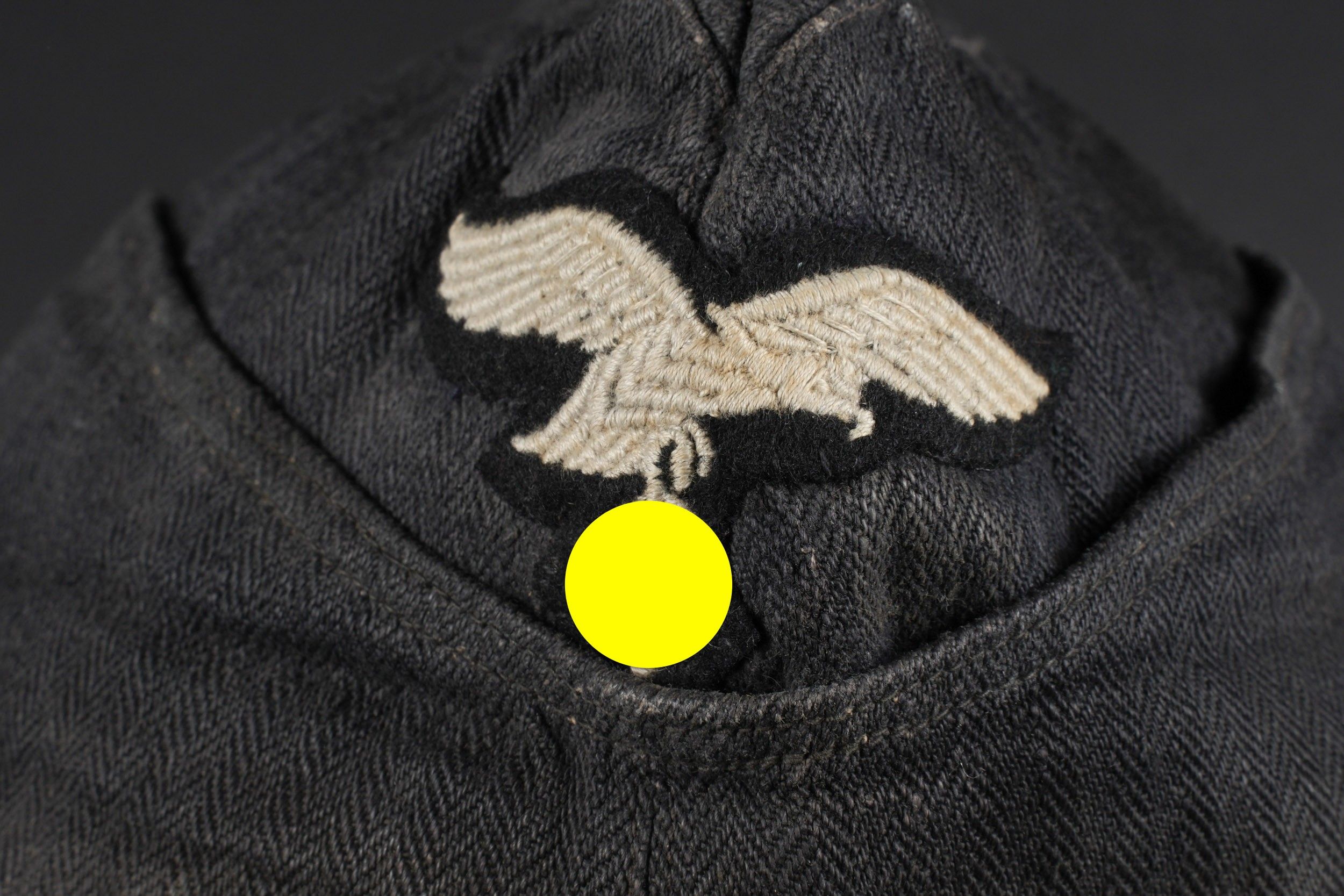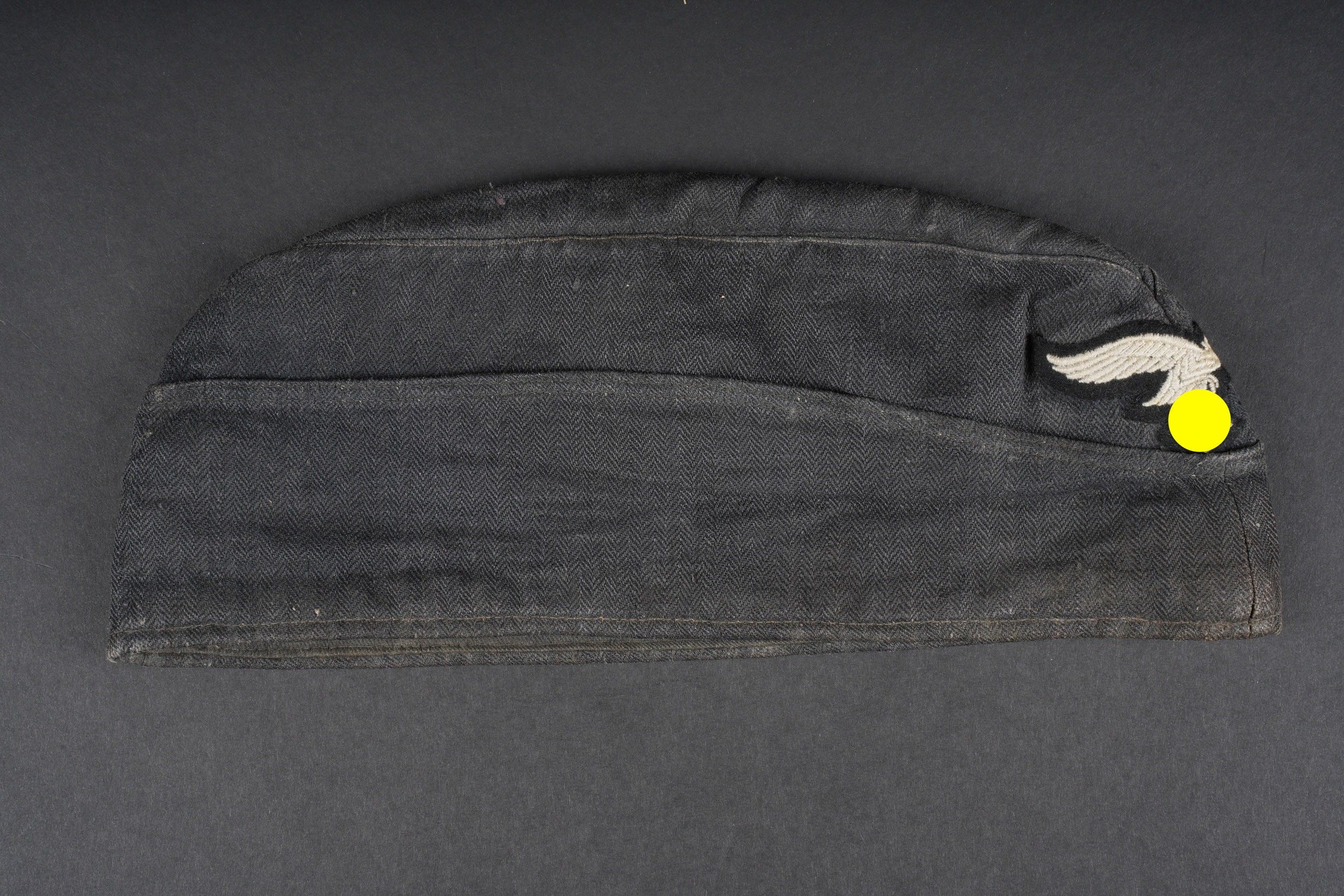 Calot de mécanicien de la Luftwaffe. En tissu coton treillis noir. Bel aigle brodé du second type, sur fond en drap noir, cousu main. Cocarde absente. Bandeau de sudation en tissu noir. Une partie des marquages sont illisibles. LBAS 37. A noter une certaine usure et patine de la pièce. Etat II+. Luftwaffe mechanic’s side cap. Made of black cotton twill. Features a hand-sewn second-type embroidered Luftwaffe eagle on a black wool backing. Cockade missing. Black cloth sweatband, partially legible markings LBAS 37. Shows signs of wear and patina consistent with use. Condition II+.