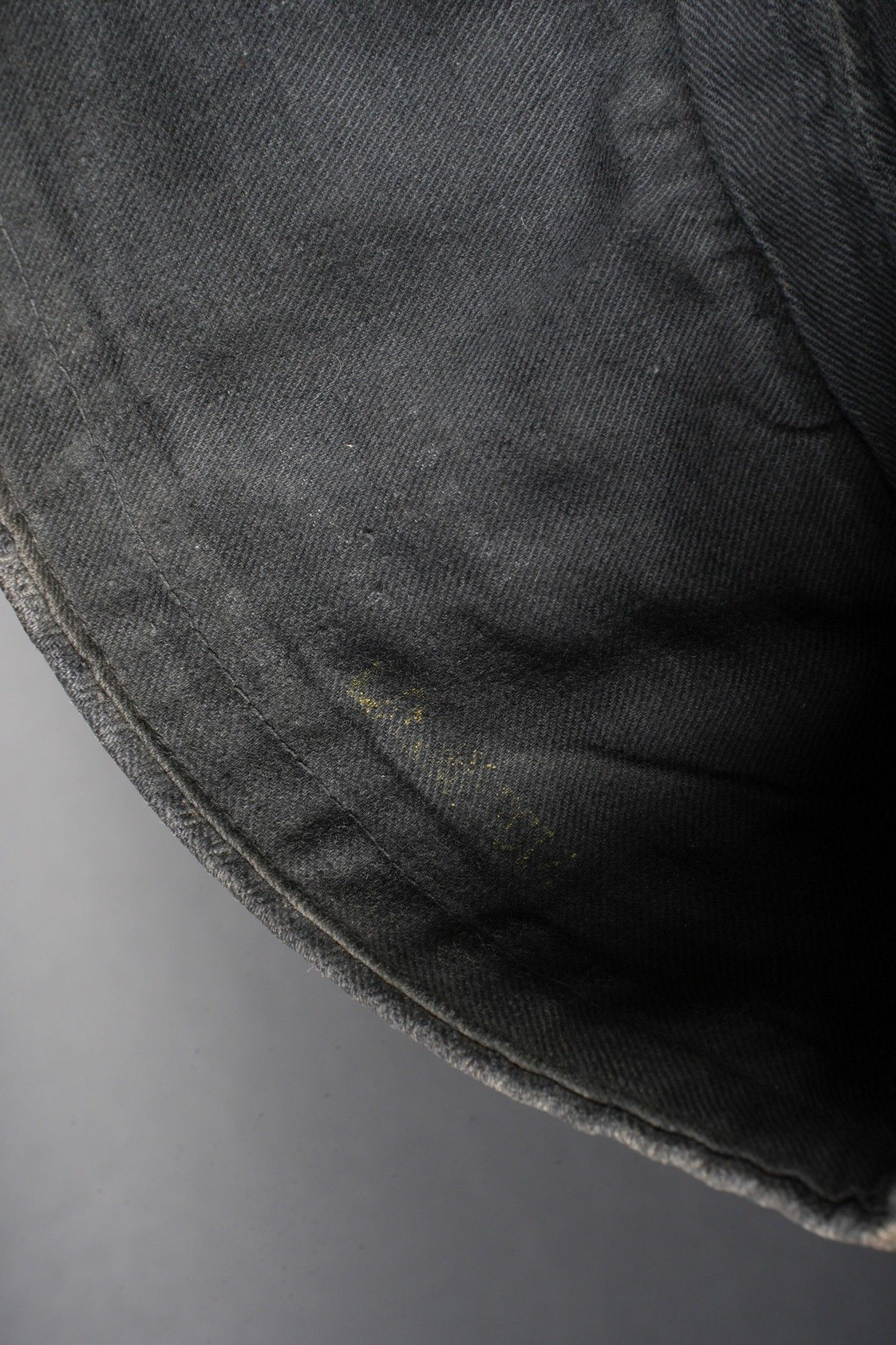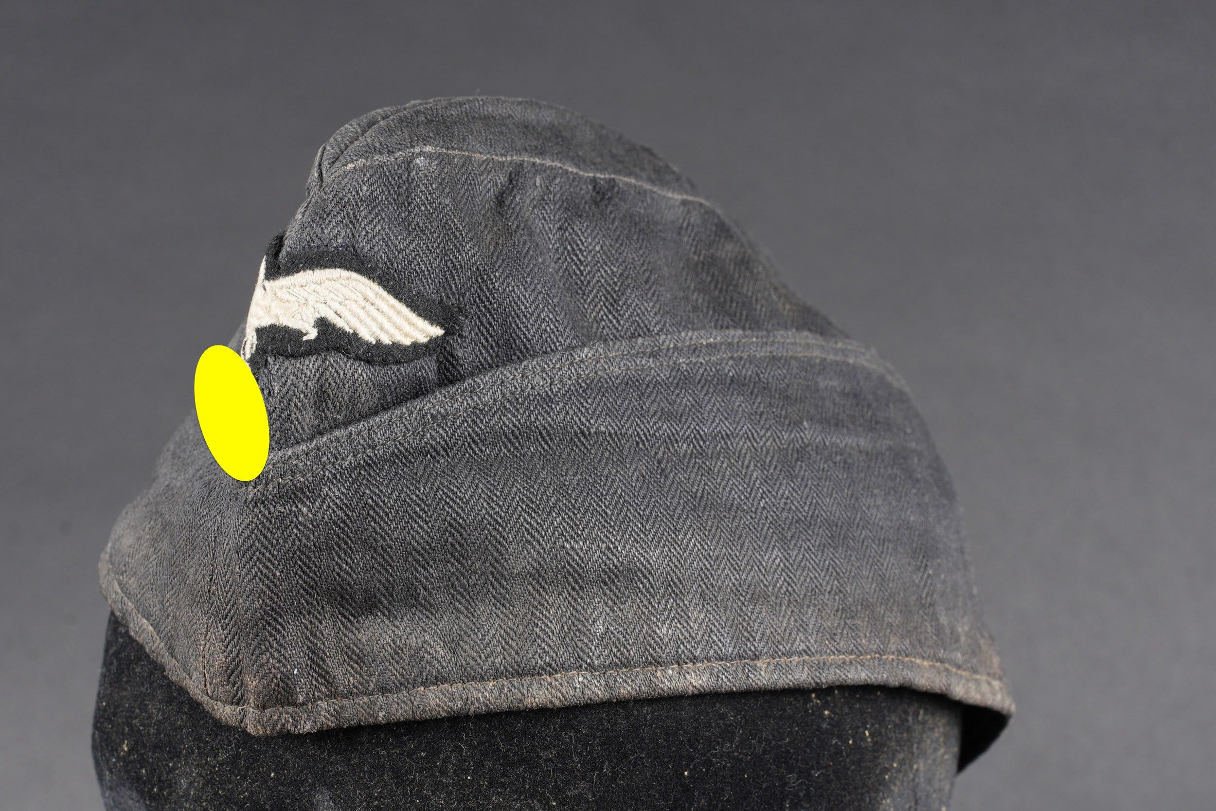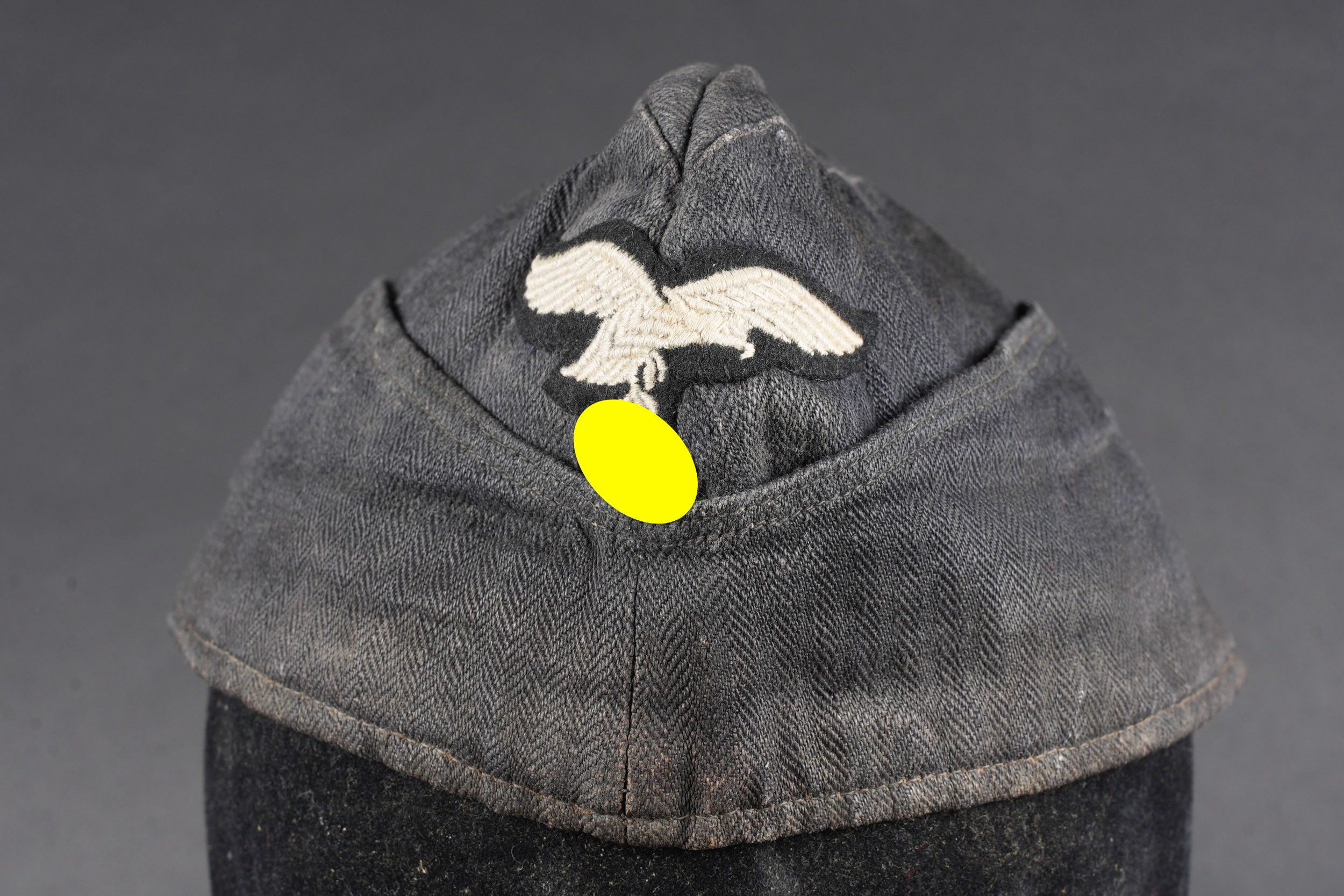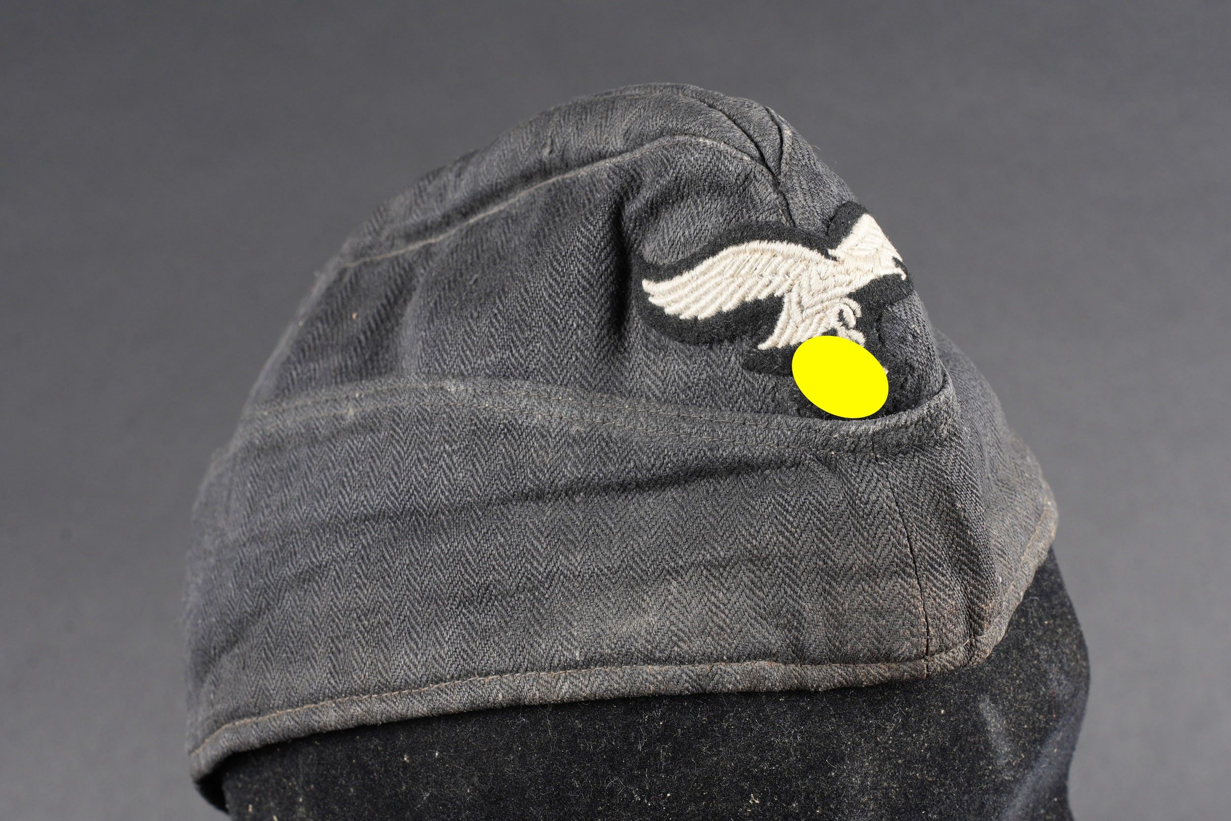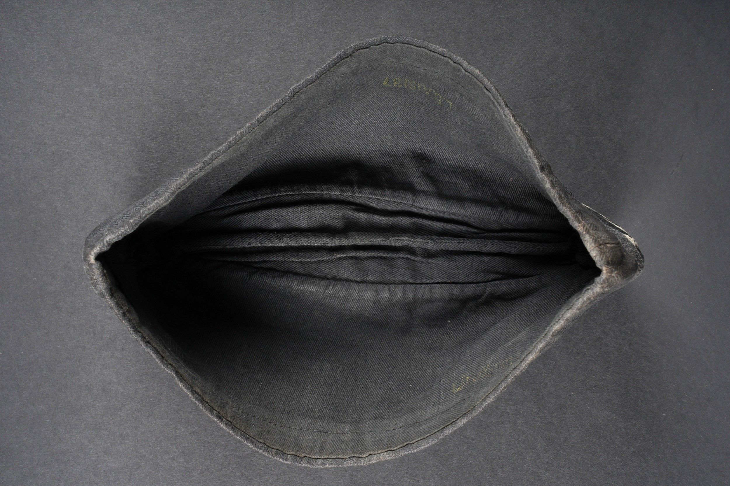 Calot de mécanicien de la Luftwaffe. En tissu coton treillis noir. Bel aigle brodé du second type, sur fond en drap noir, cousu main. Cocarde absente. Bandeau de sudation en tissu noir. Une partie des marquages sont illisibles. LBAS 37. A noter une certaine usure et patine de la pièce. Etat II+. Luftwaffe mechanic’s side cap. Made of black cotton twill. Features a hand-sewn second-type embroidered Luftwaffe eagle on a black wool backing. Cockade missing. Black cloth sweatband, partially legible markings LBAS 37. Shows signs of wear and patina consistent with use. Condition II+.