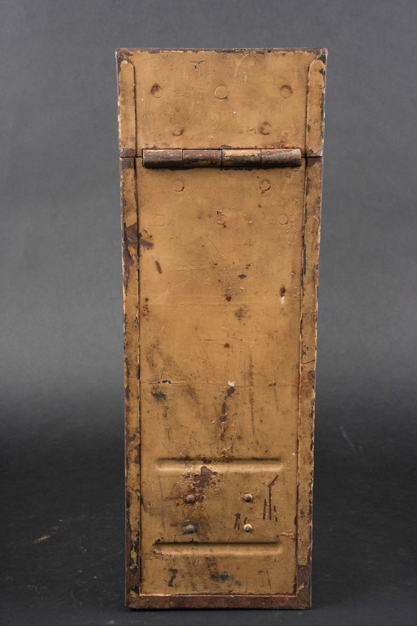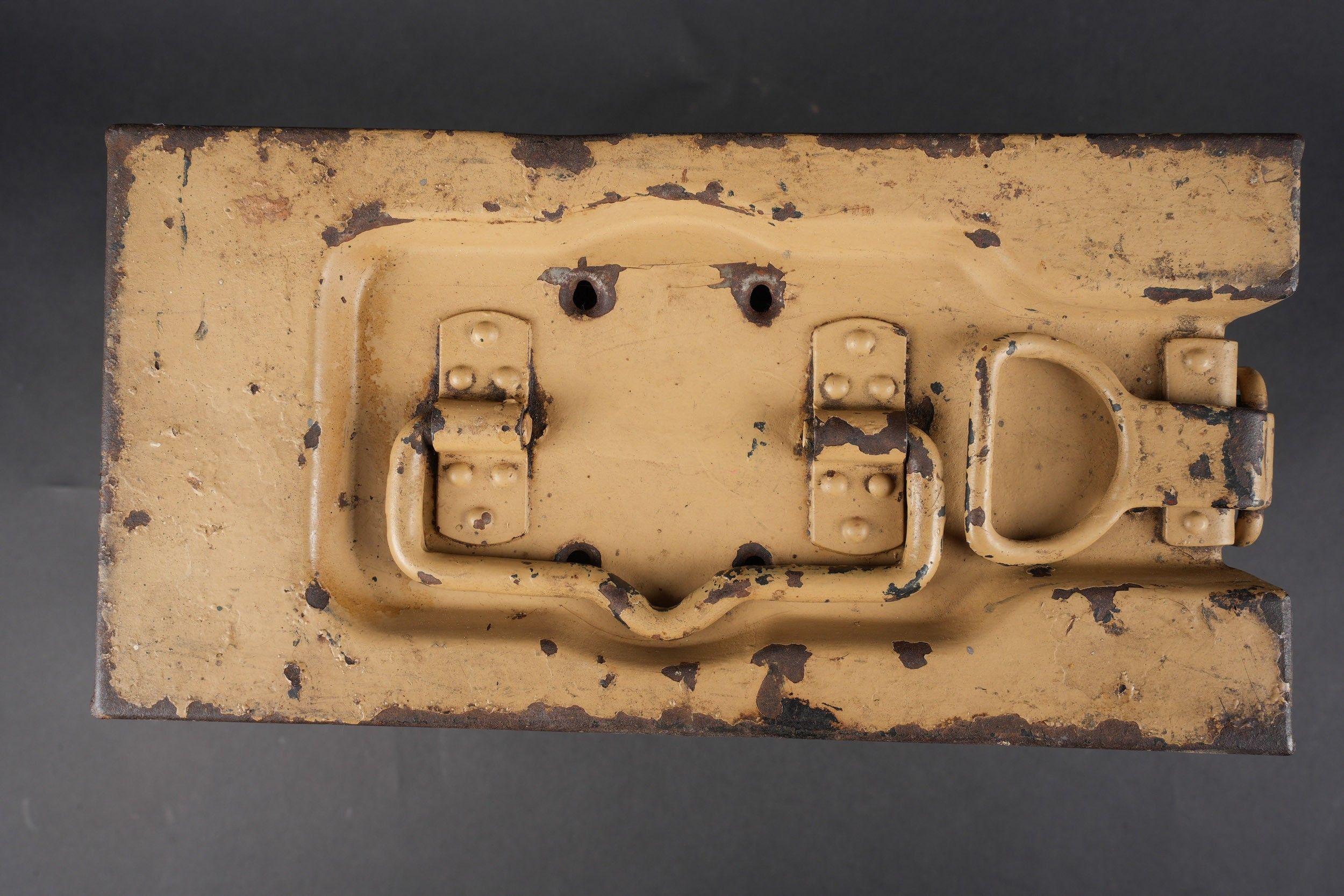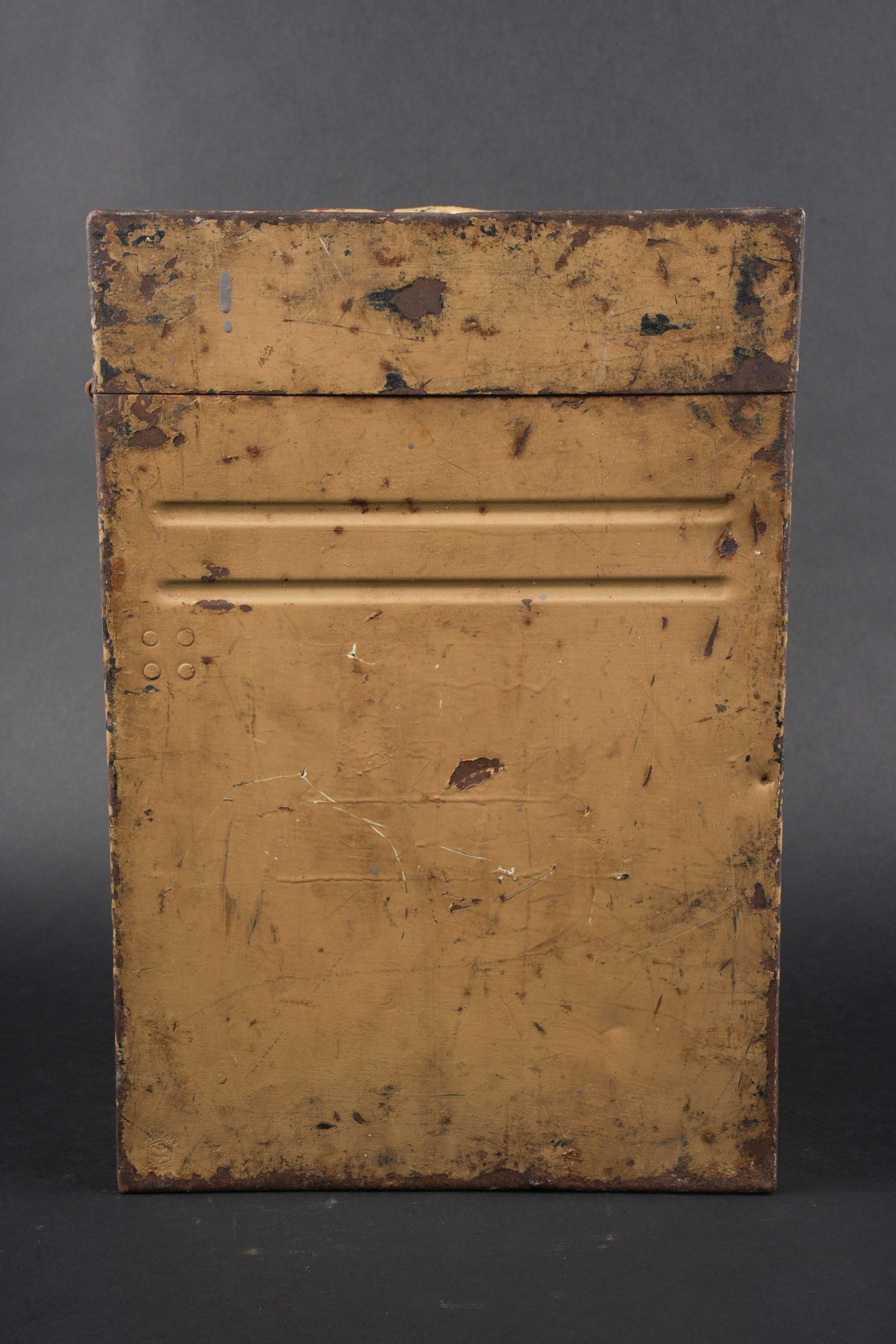 Caisse de chargeurs de Flak. En métal. Les poignées de transport sont présentes. Quatre perforations au niveau du couvercle. Le crochet de fermeture est fonctionnel. Peinture couleur jaune sable à 80%. Les racks interne sont absent. Intérieur oxydé. A noter une certaine usure et patine de la pièce. Etat II+. Flak Ammunition Box. Metal construction with carrying handles intact. Four small perforations visible on the lid. Closing latch functional. Retains approximately 80% of its original sand-yellow paint. Internal racks missing, interior surface oxidized. Displays age-consistent wear and patina. Condition II+.