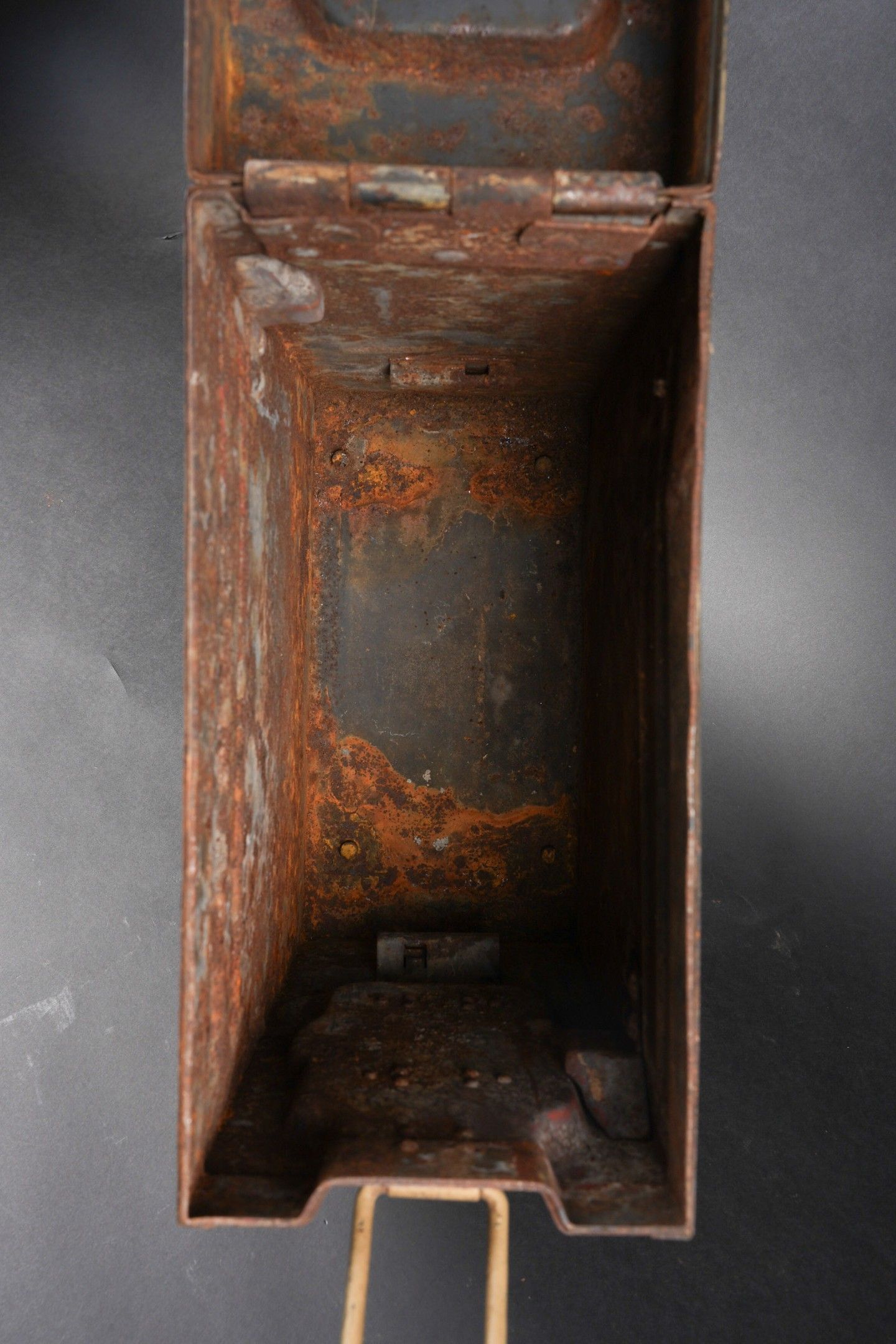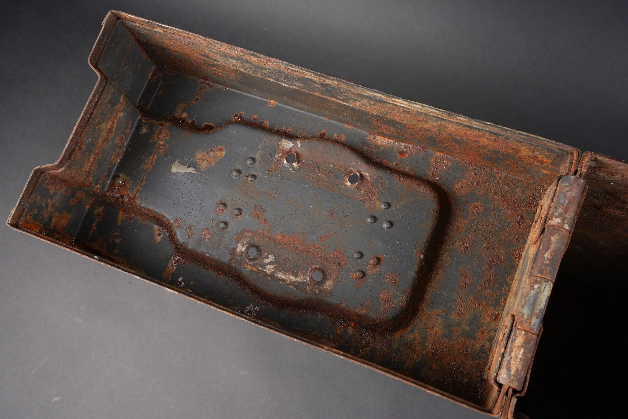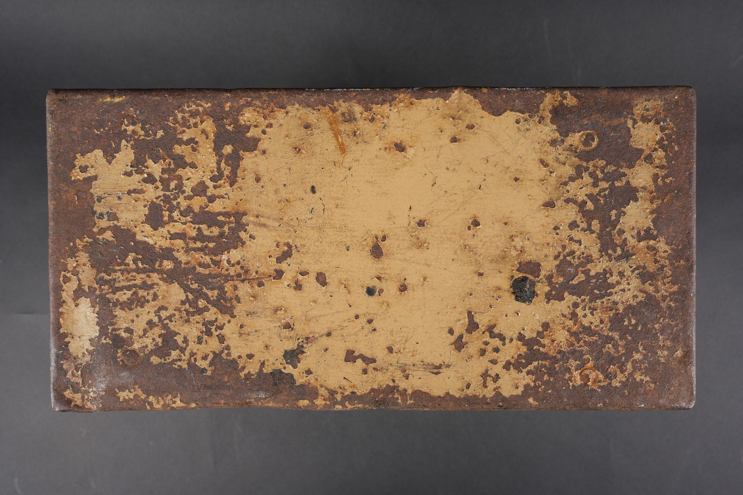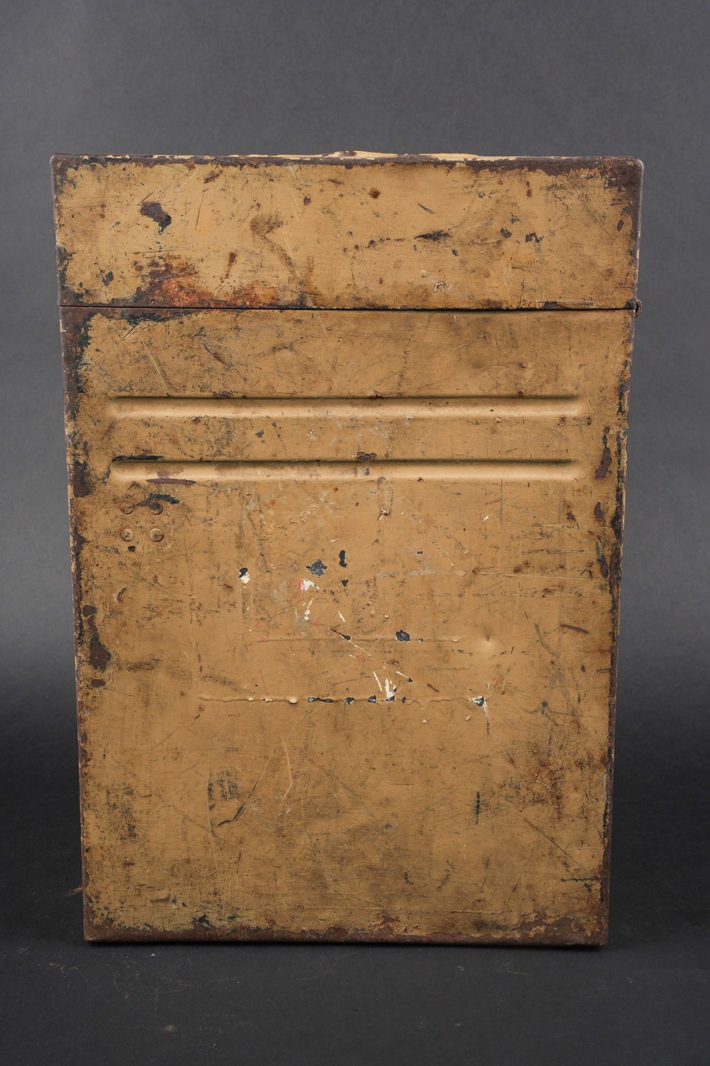 Caisse de chargeurs de Flak. En métal. Les poignées de transport sont présentes. Quatre perforations au niveau du couvercle. Le crochet de fermeture est fonctionnel. Peinture couleur jaune sable à 80%. Les racks interne sont absent. Intérieur oxydé. A noter une certaine usure et patine de la pièce. Etat II+. Flak Ammunition Box. Metal construction with carrying handles intact. Four small perforations visible on the lid. Closing latch functional. Retains approximately 80% of its original sand-yellow paint. Internal racks missing, interior surface oxidized. Displays age-consistent wear and patina. Condition II+.