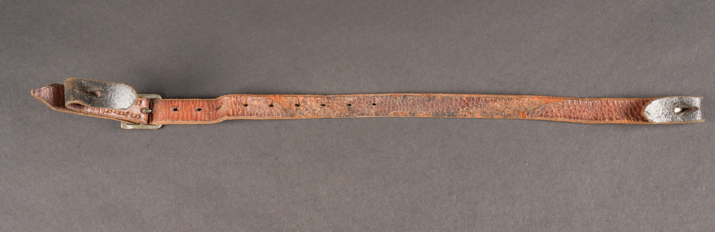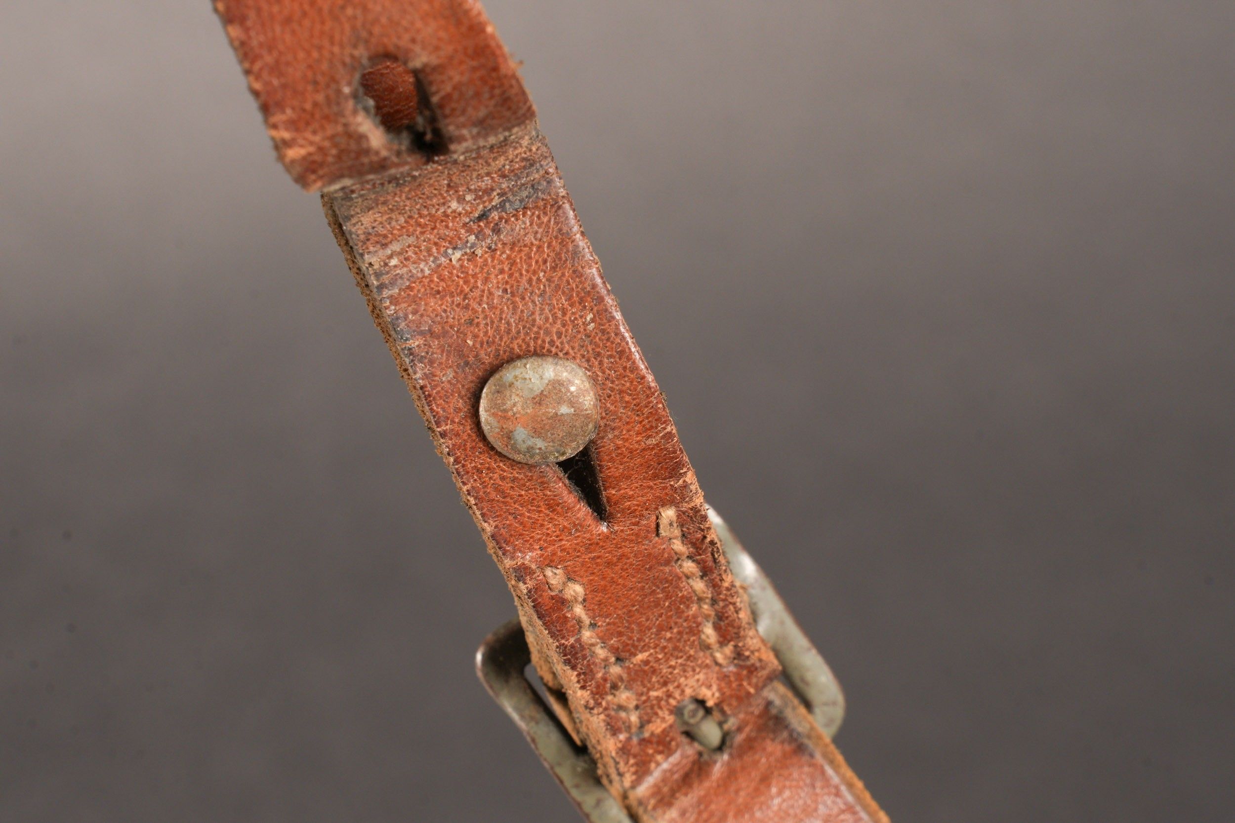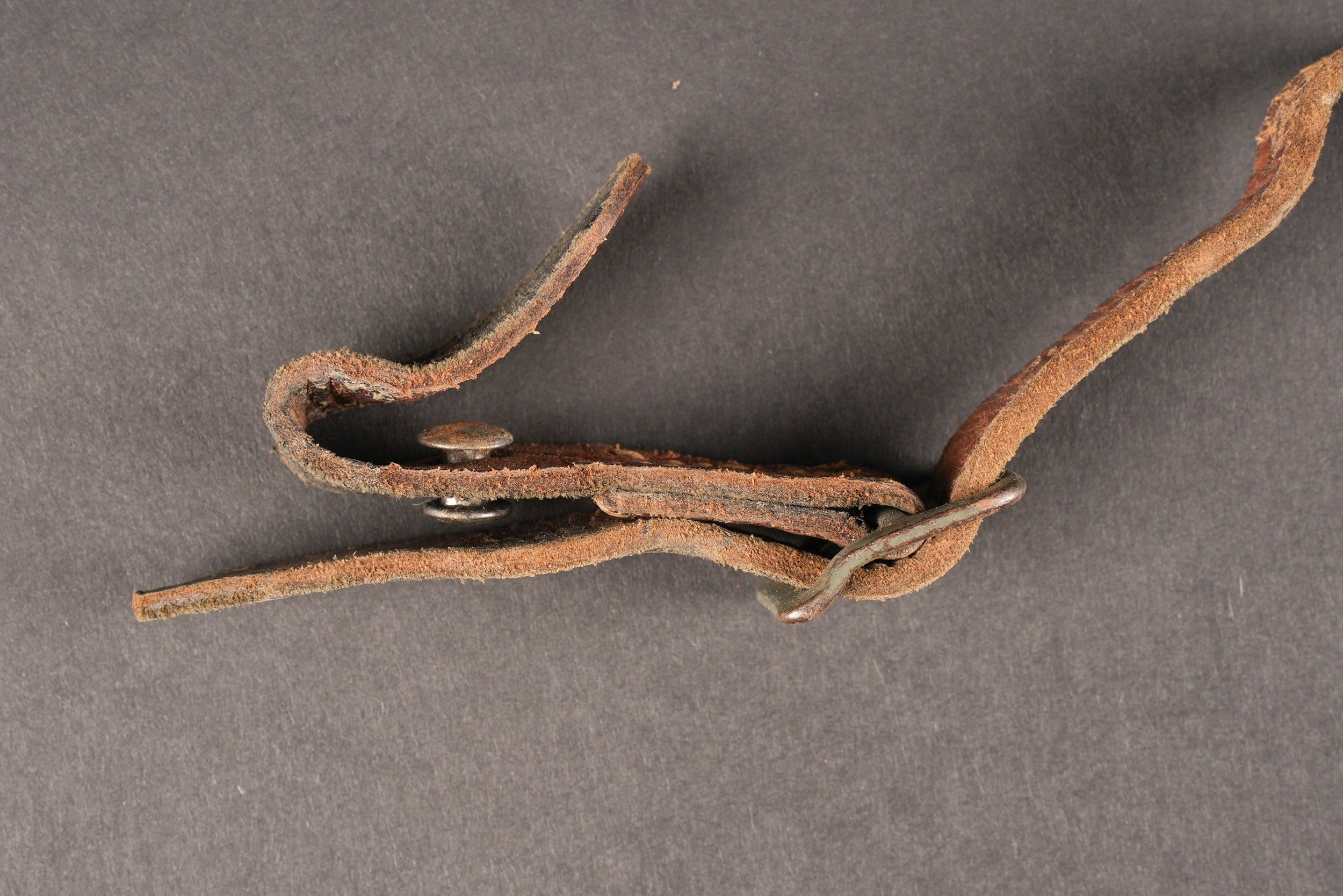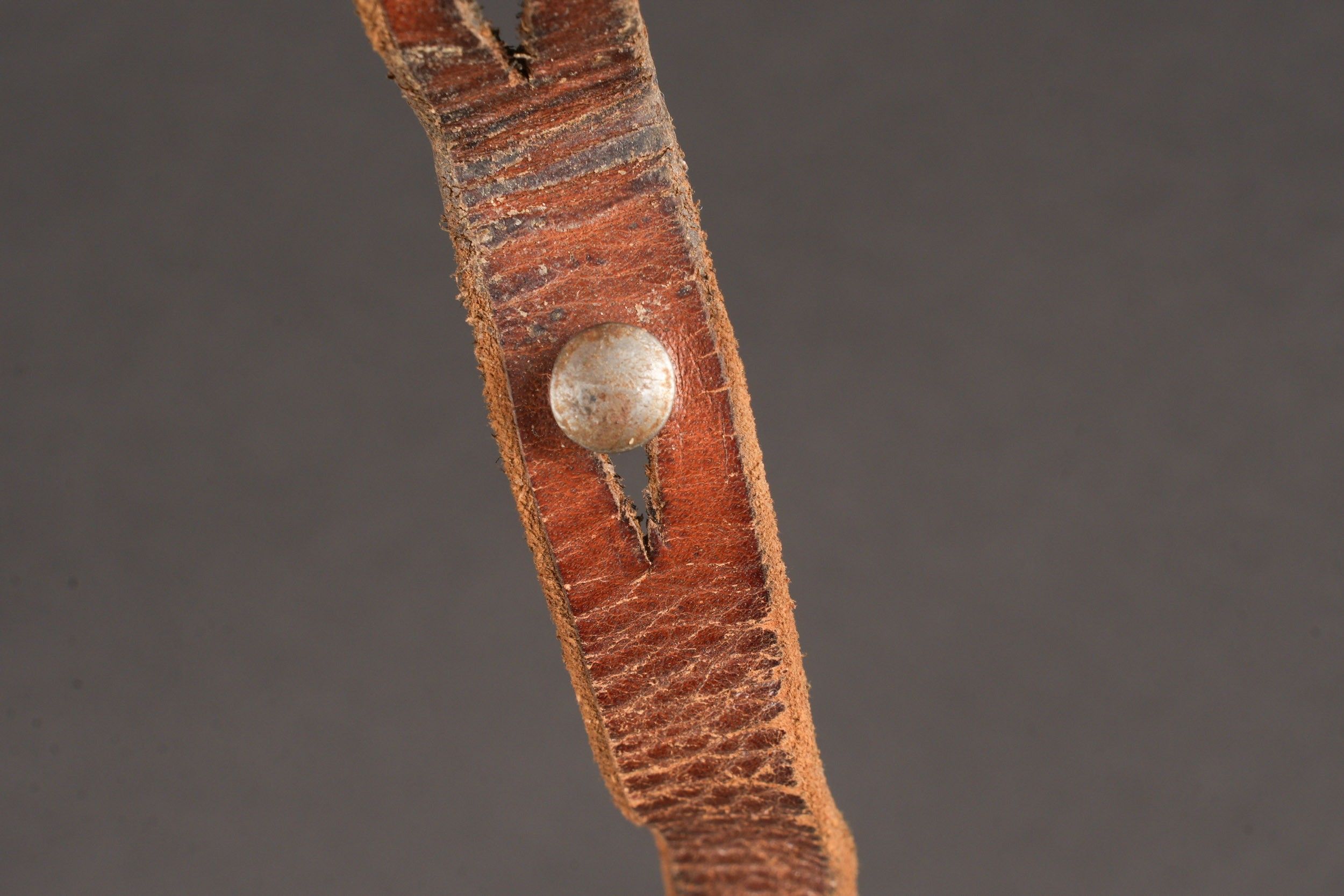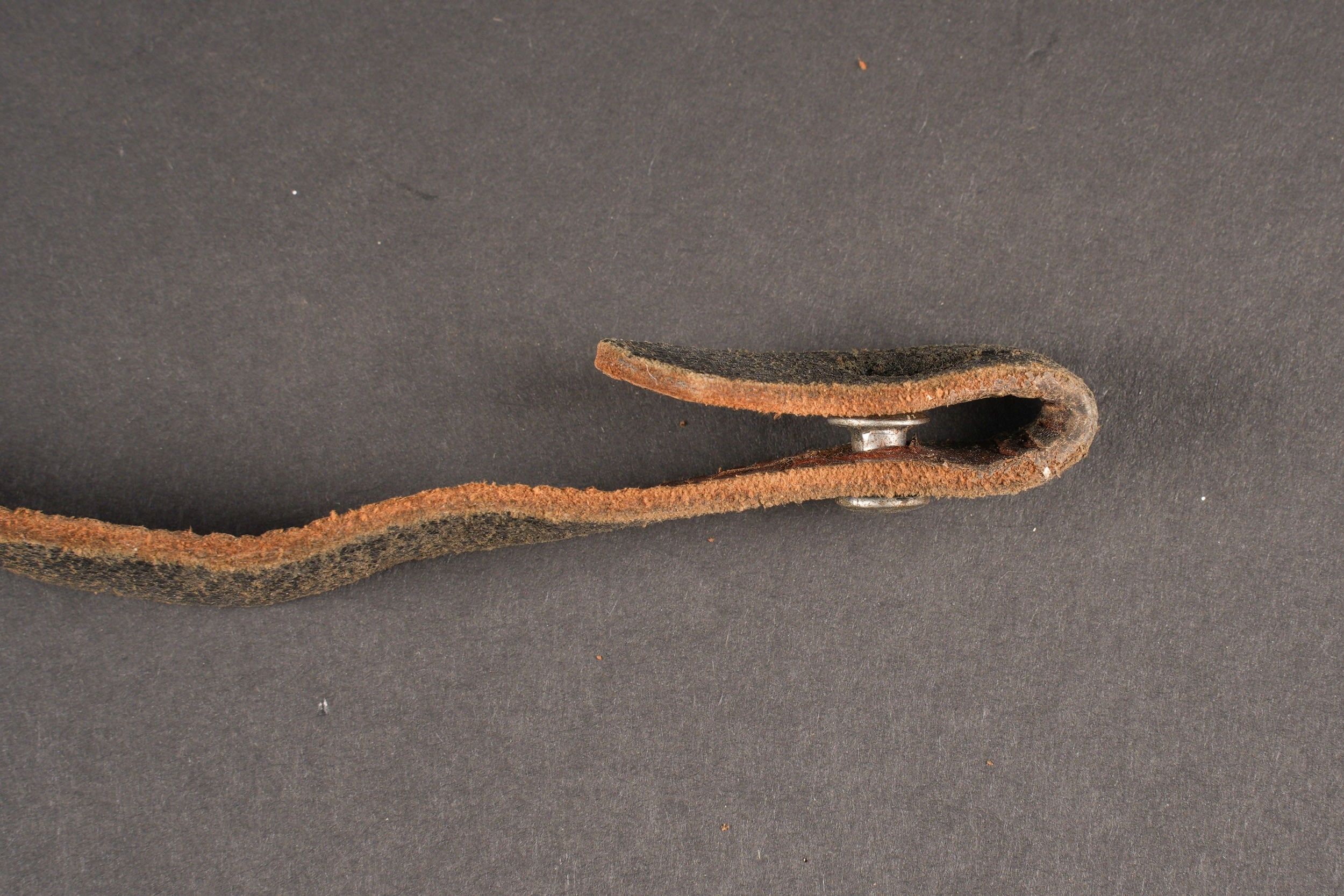 Jugulaire de casque allemand. En cuir noir, complète avec ses deux tétons métallique. Les marquages sont illisibles. A noter une certaine usure et patine de la pièce. Etat II+. German helmet chinstrap. Black leather, complete with its two metal studs. Markings illegible. Shows some wear and patina. Condition II+.