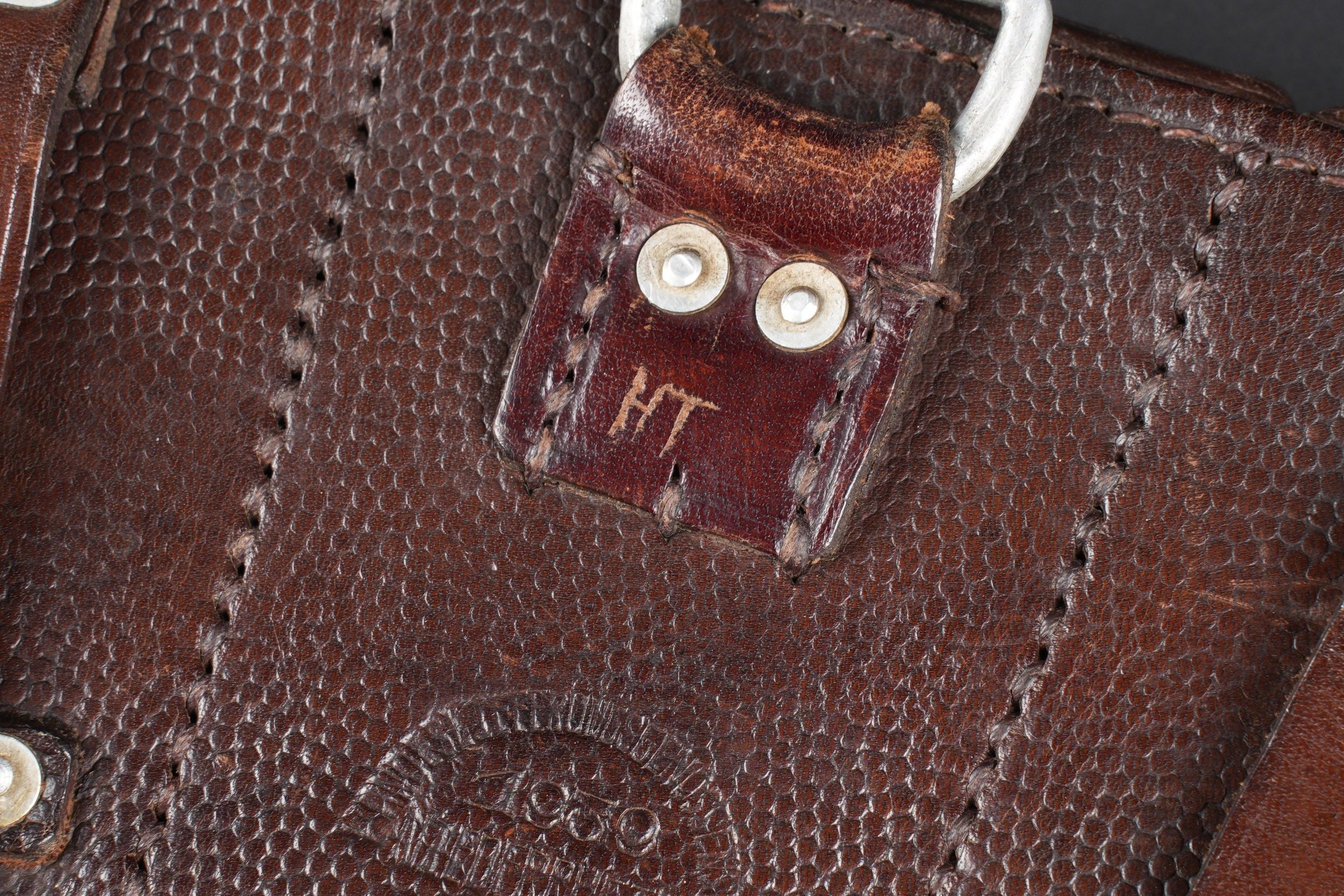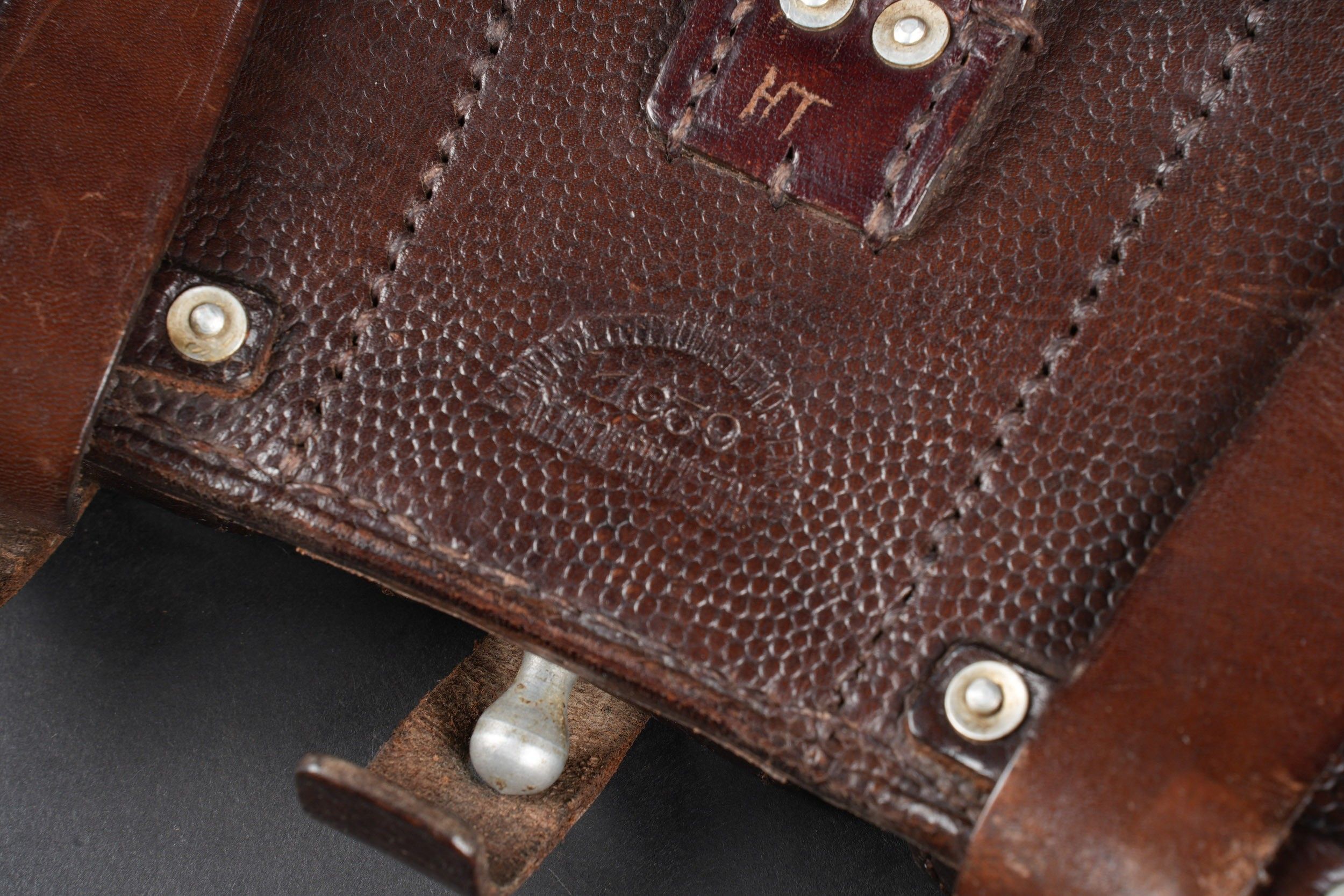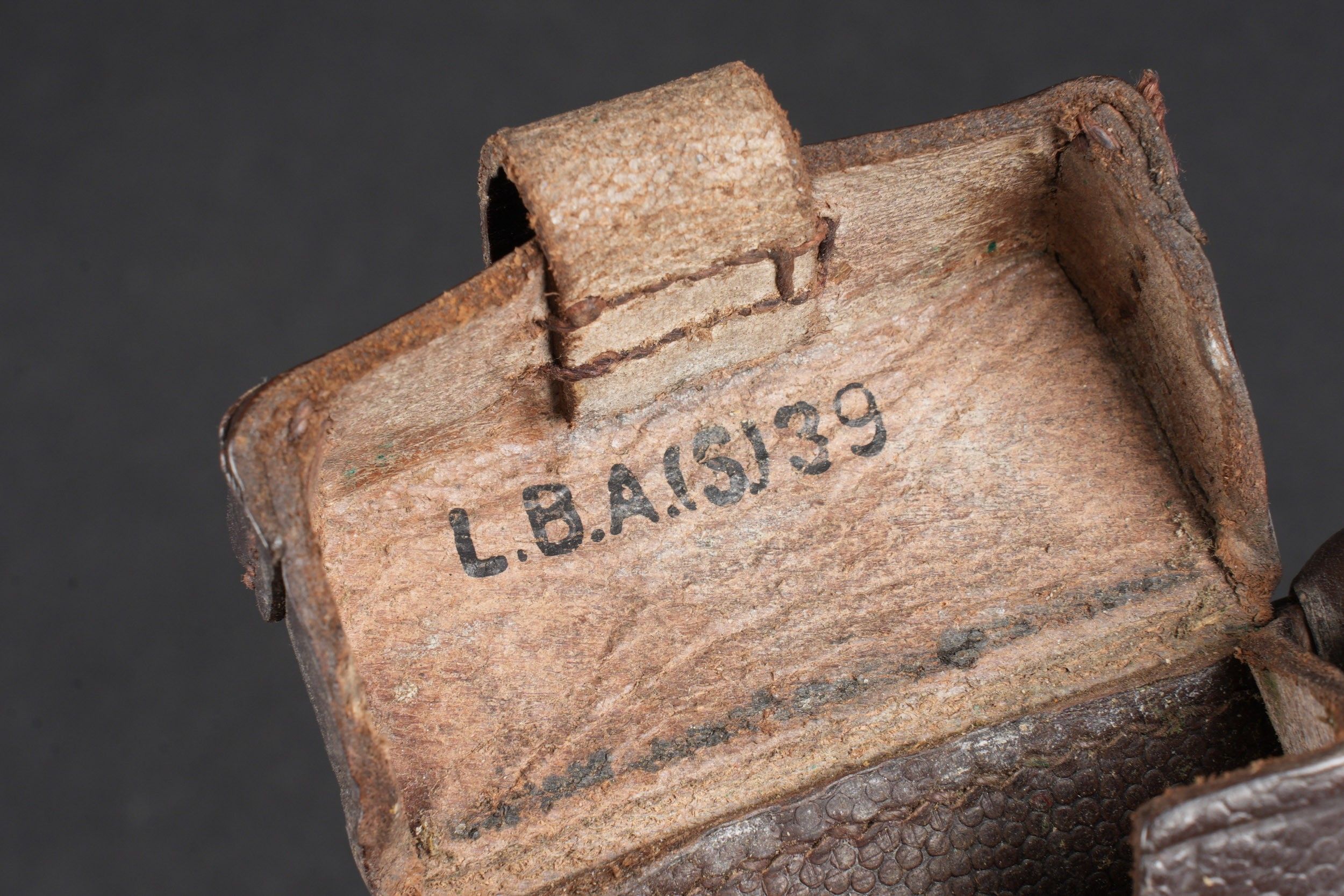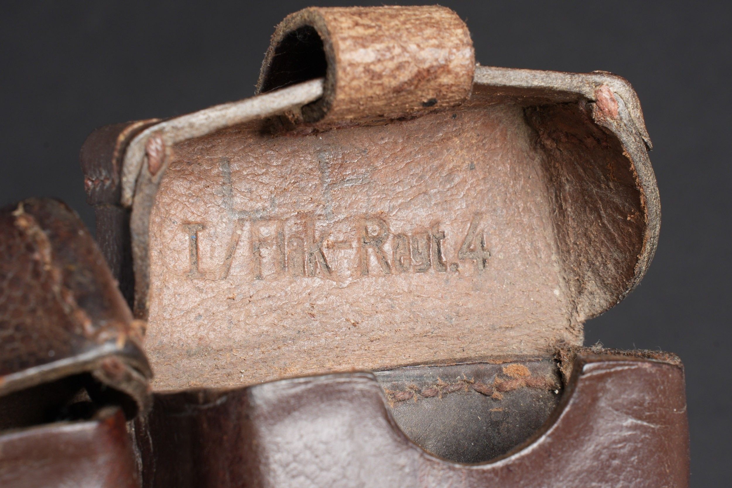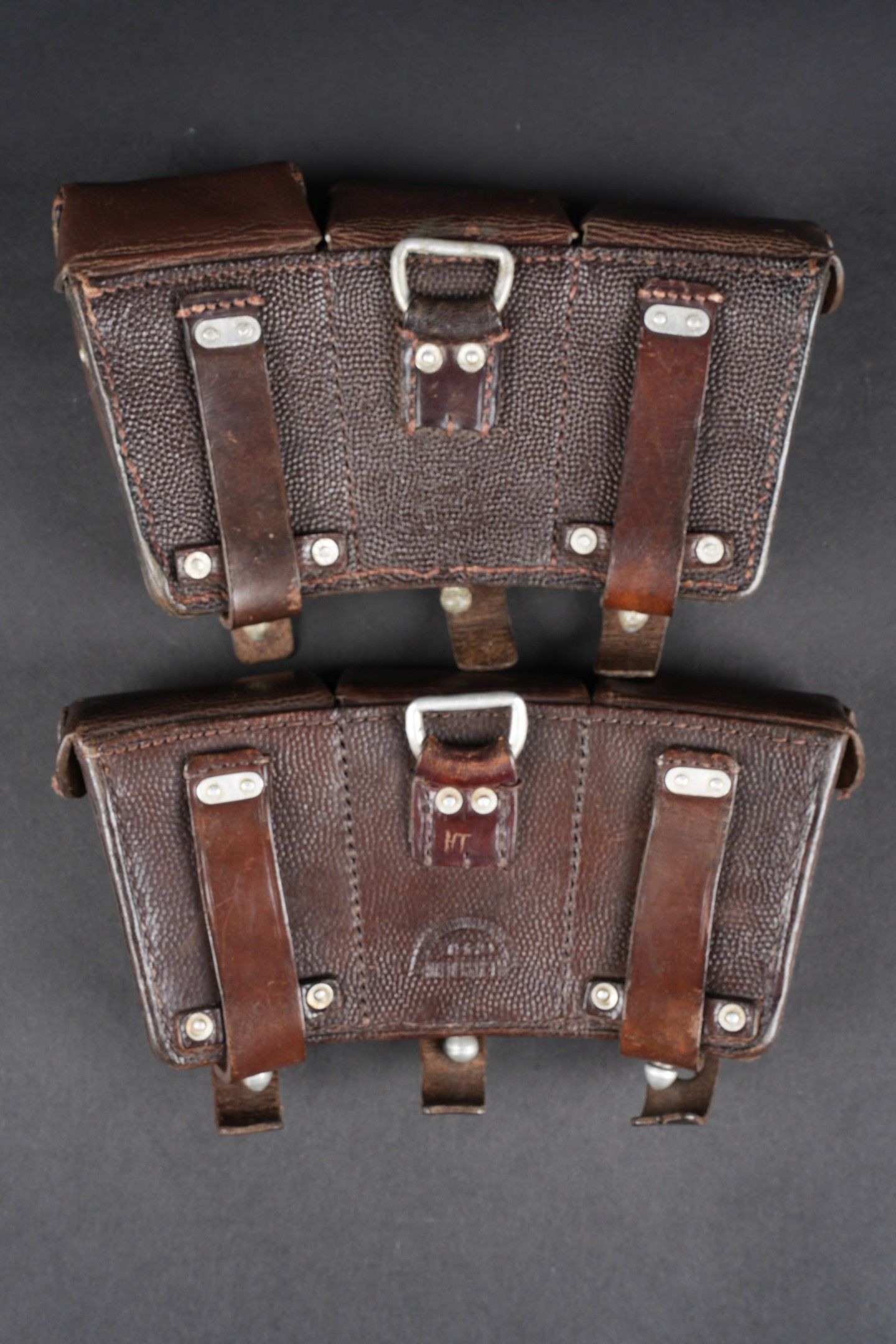 Cartouchières de Mauser 98K. Paire non homogène en cuir grenelé marron. Toutes les sangle sont présentes et complètes. Les anneaux arrières sont présents. Marquages Niederhein 1939, et illisibles sur la seconde. Un rabat porte le marquage LBAB 38 et la mention I/Flak Regt 4. Sur la seconde LBAS 39. A noter une certaine usure et patine des pièces. Etat II+. Mauser 98K pouches. Non-matching pair in brown pebbled leather. All straps and rear D-rings present. Marked Niederrhein 1939 and partly illegible on the second. One flap stamped LBAB 38 I/Flak Regt 4, the other LBAS 39. Shows some wear and patina. Condition II+.