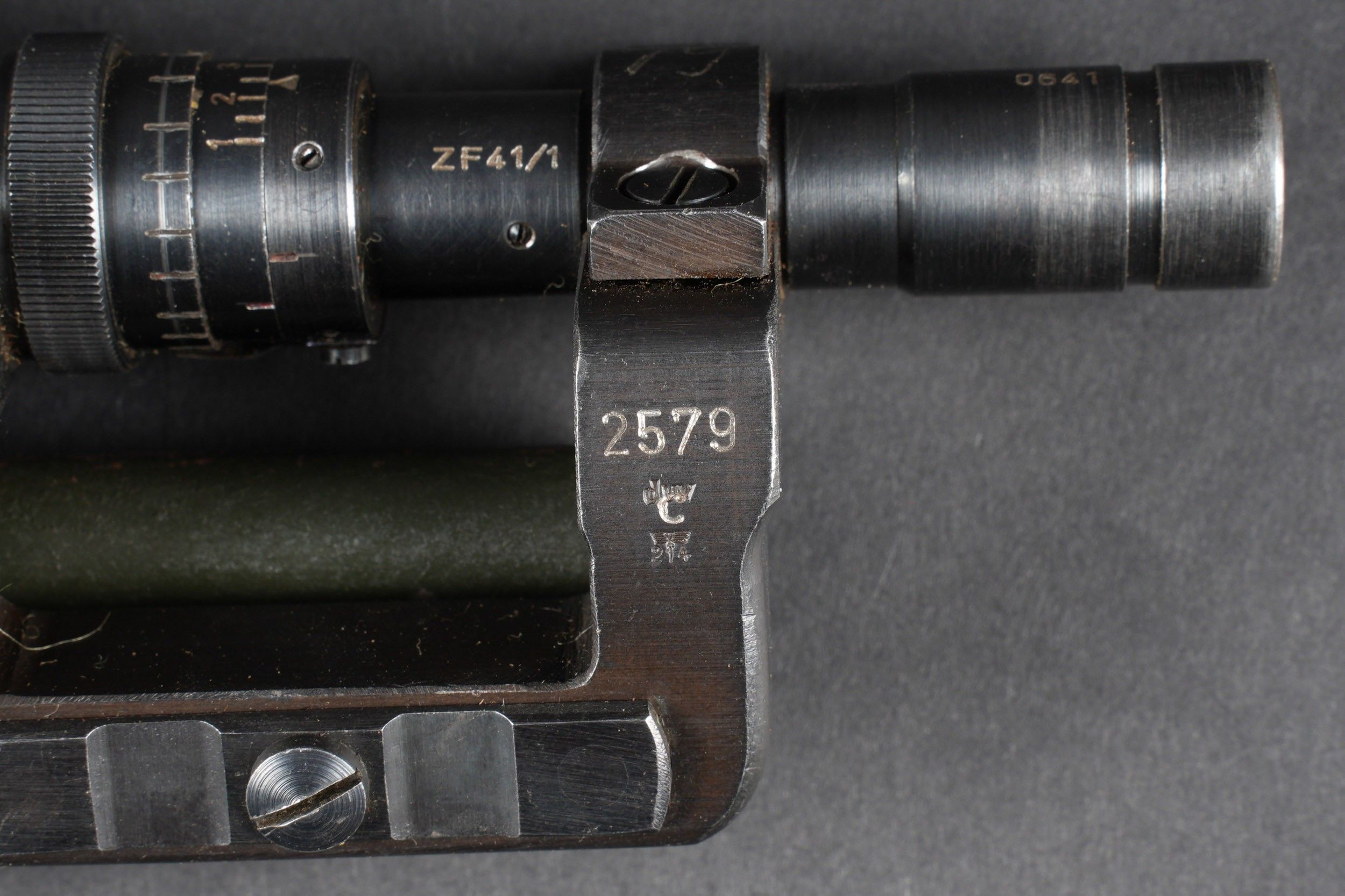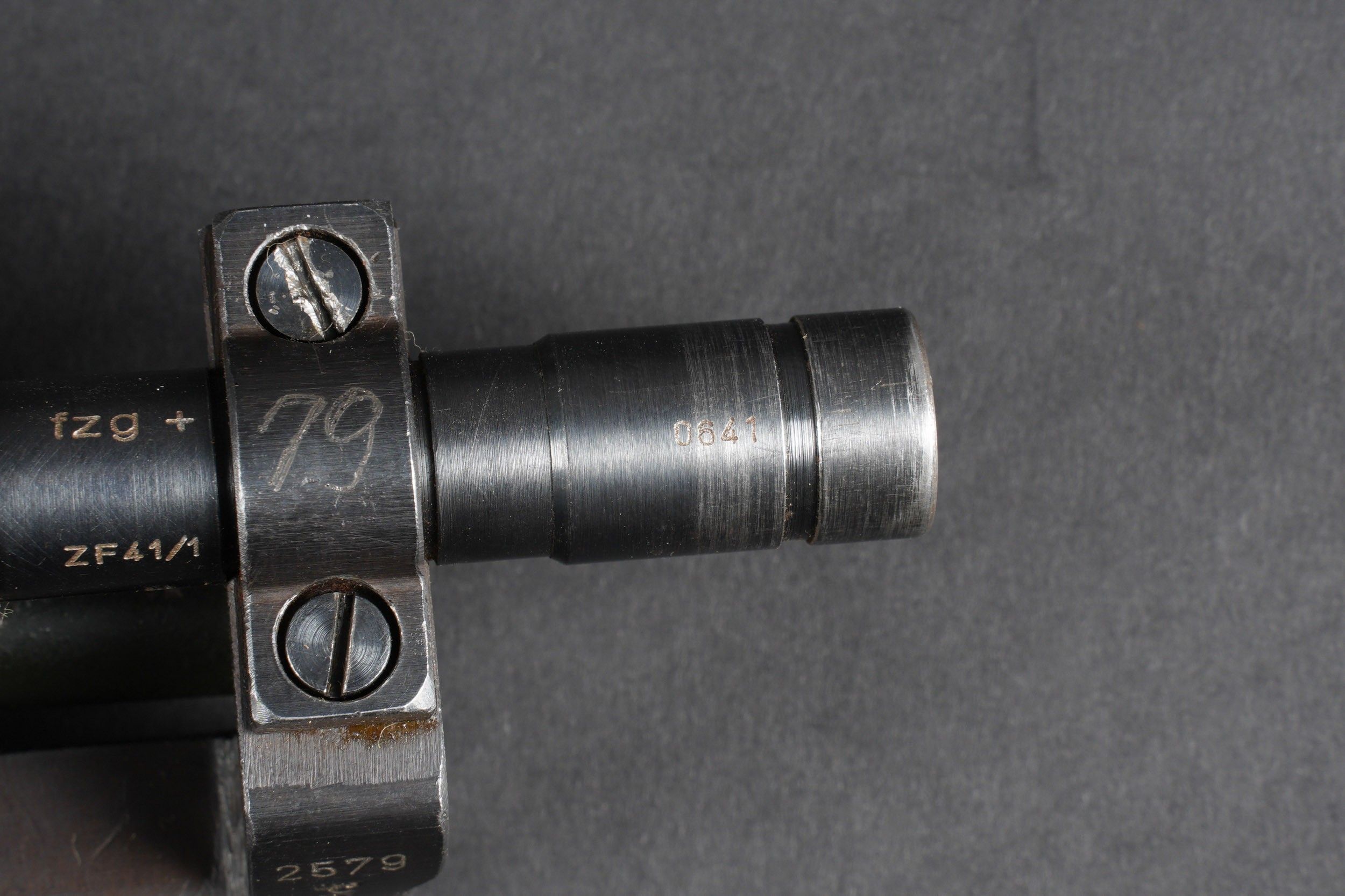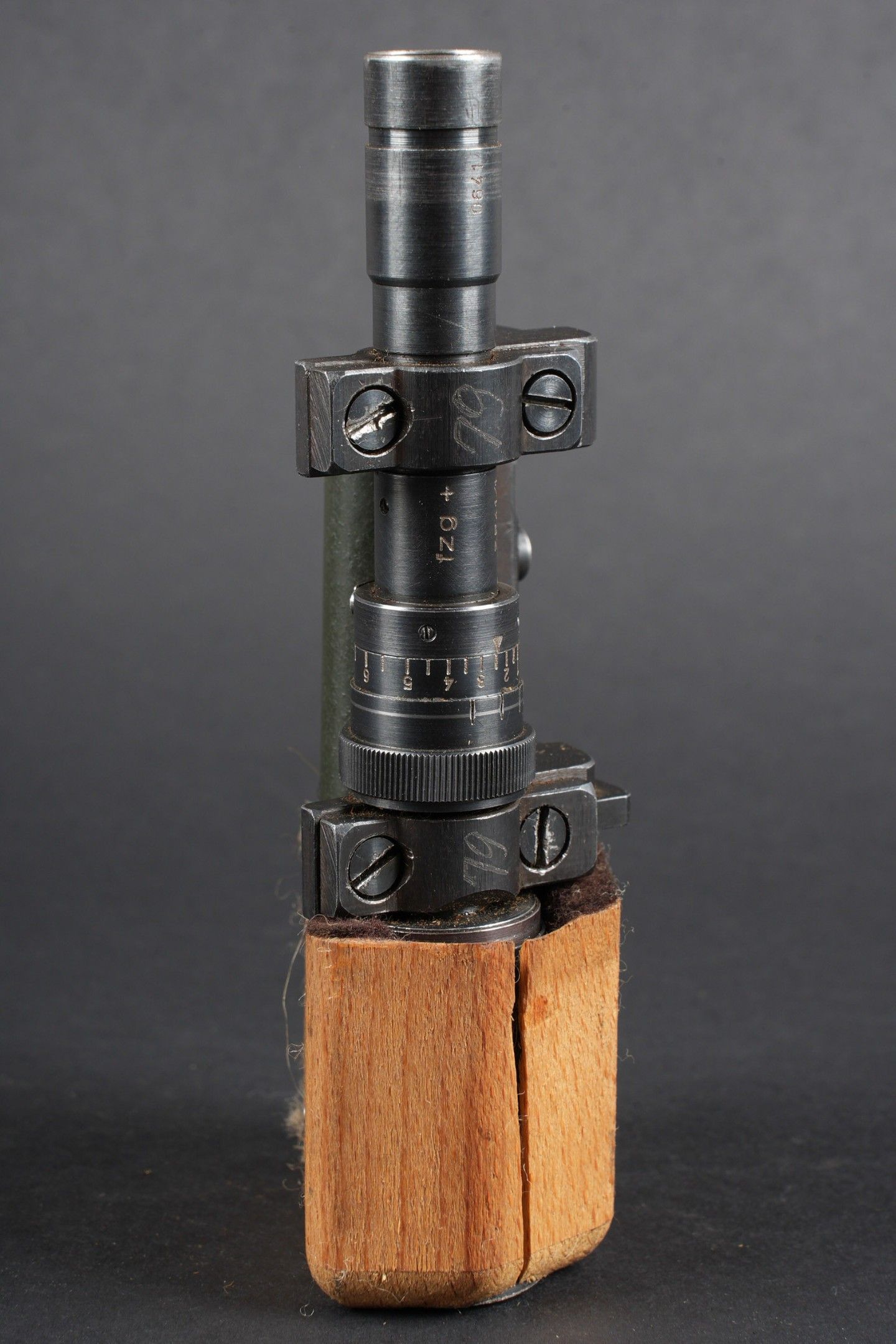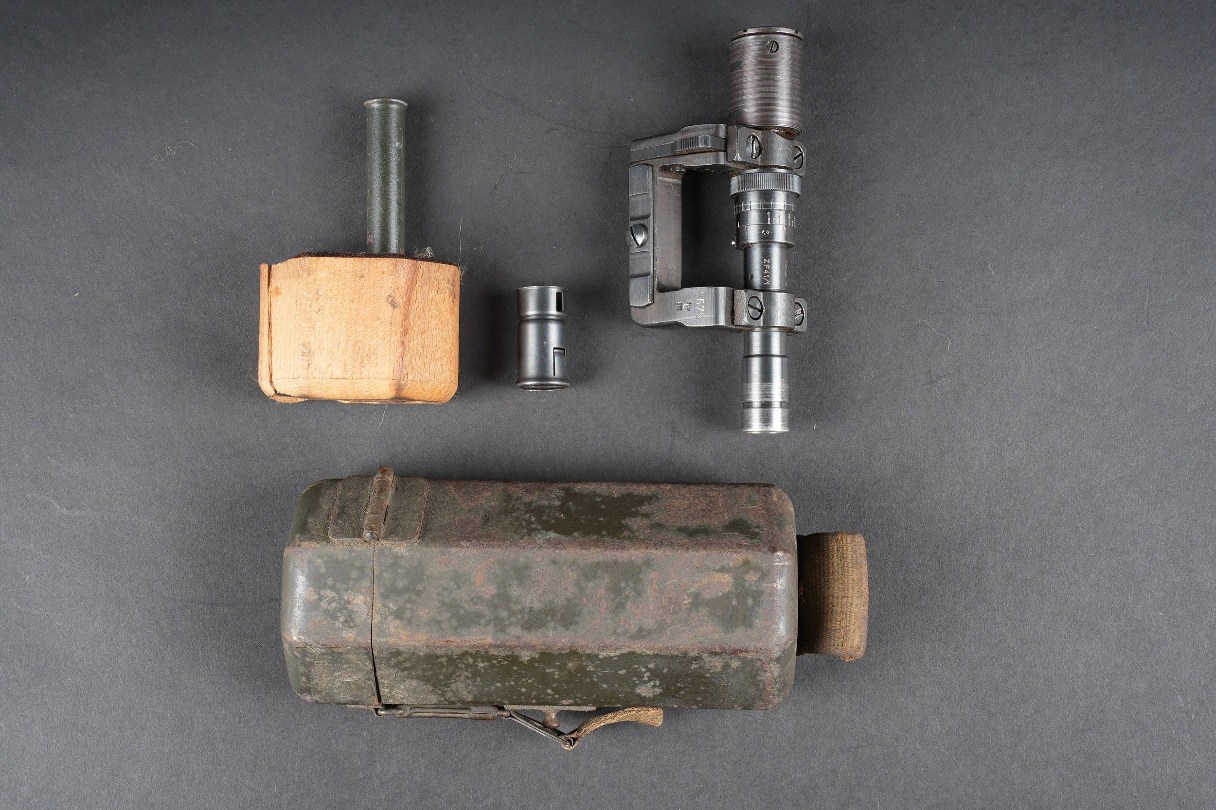 Lunette ZF 41. Boitier en métal, peinture Feldgrau à 50%. Patte en toile complète. La tirette est fonctionnelle. Marquages JVB, avec aigle Waa. Lunette en métal, marquée ZD 41/1. Fabrication FZG. Numéro 0641. Optique en parfait état. Support en métal, numéro 2579, aigle waa présent. Les bonnettes en métal sont présentes. A noter une certaine usure et patine des pièces. Etat II+. ZF 41 scope. Metal case with 50% Feldgrau paint. Complete web pull strap, functional closure. Marked JVB with Waa eagle. Scope marked ZD 41/1, maker FZG, serial 0641, optics in perfect condition. Metal mount numbered 2579 with Waa eagle. Metal lens caps present. Show some wear and patina. Condition II+.
