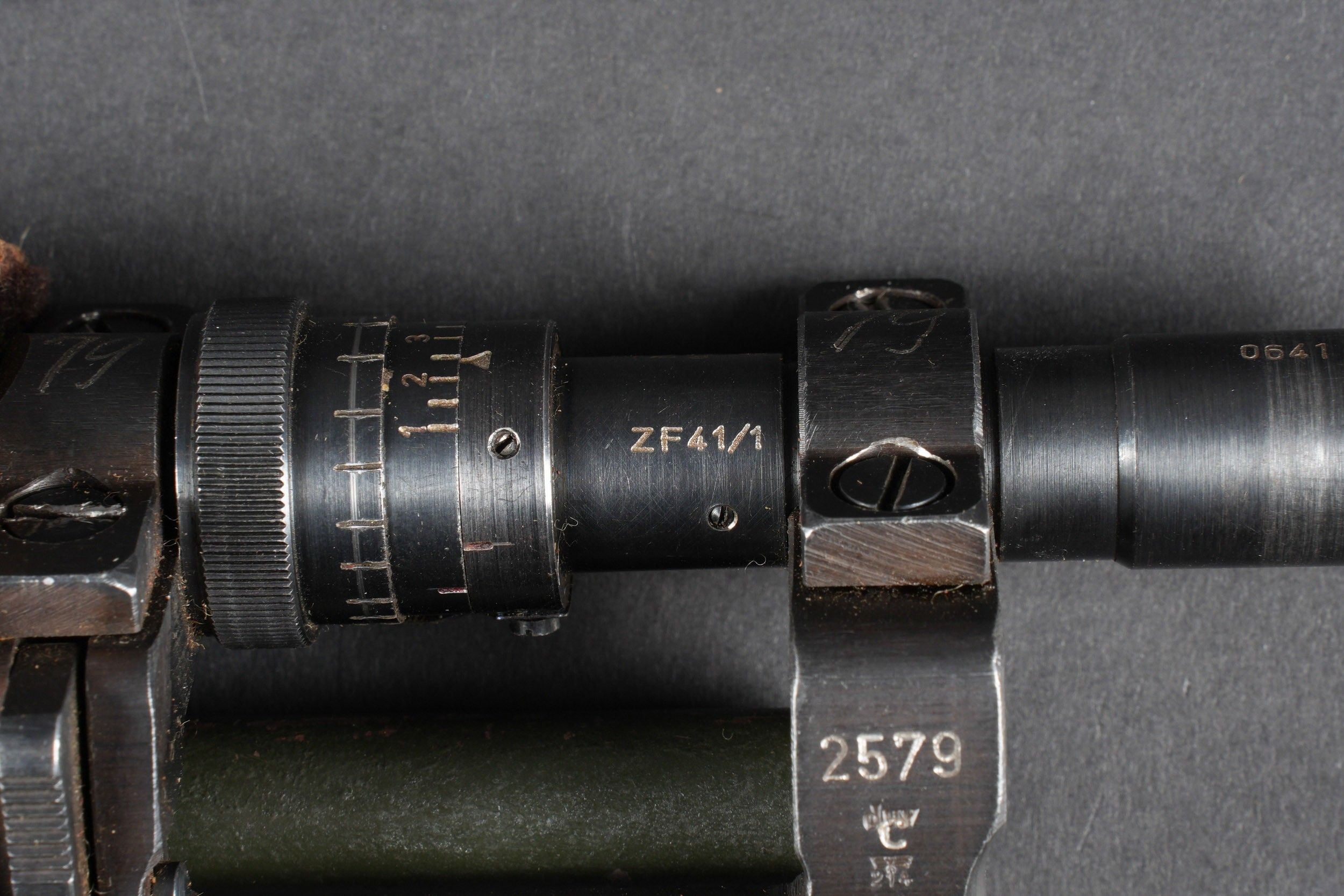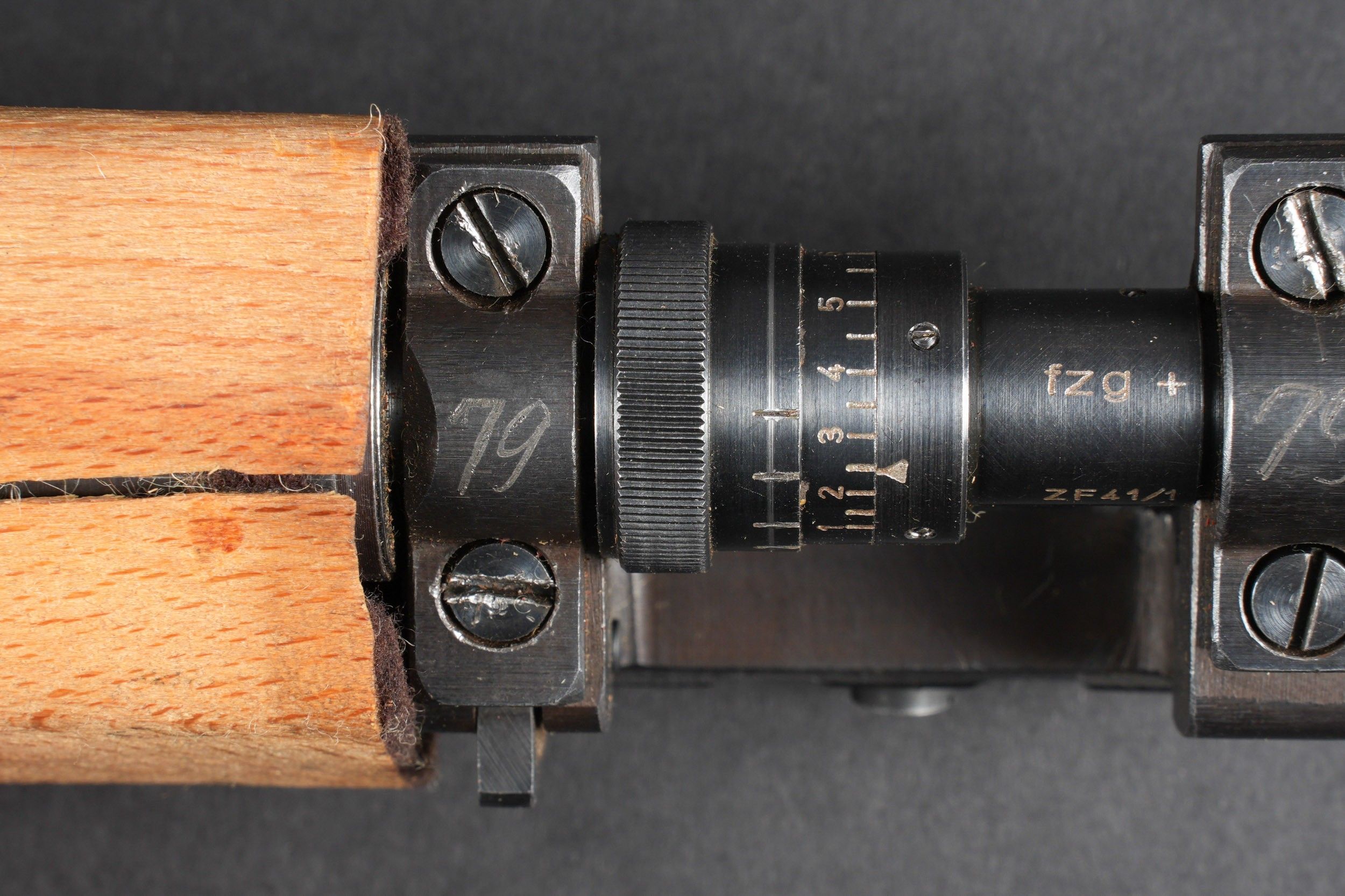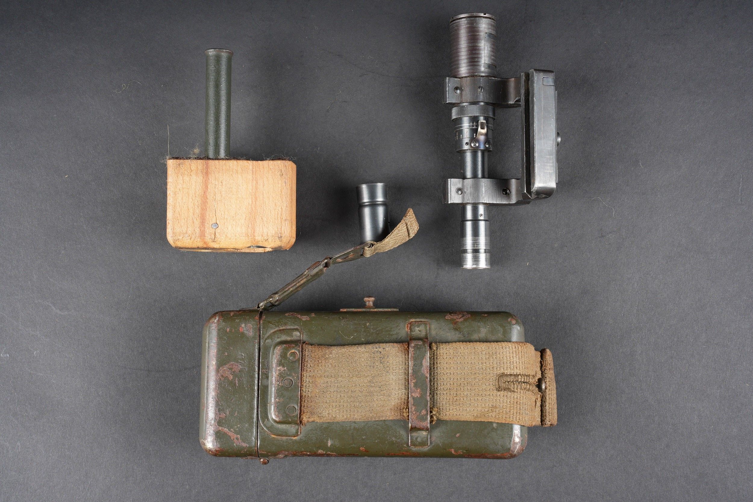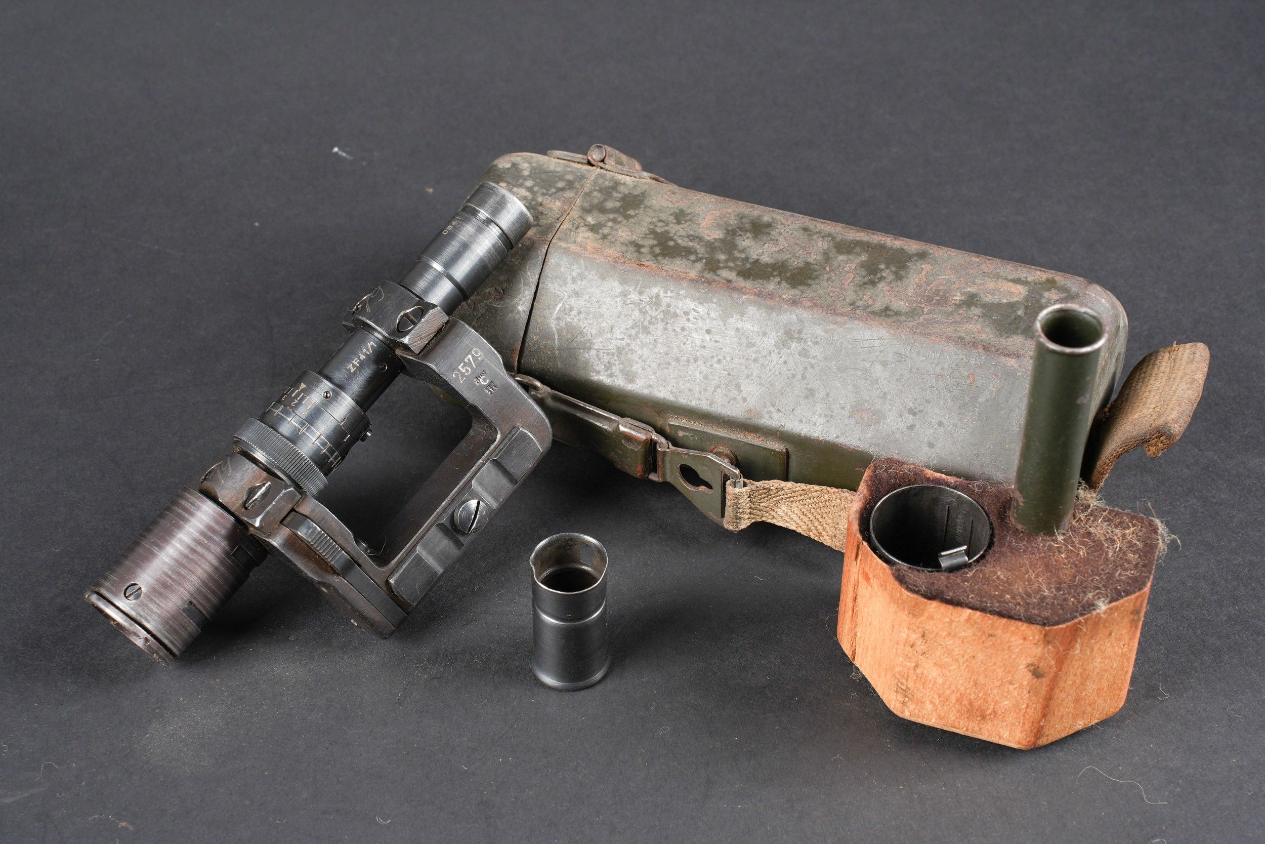 Lunette ZF 41. Boitier en métal, peinture Feldgrau à 50%. Patte en toile complète. La tirette est fonctionnelle. Marquages JVB, avec aigle Waa. Lunette en métal, marquée ZD 41/1. Fabrication FZG. Numéro 0641. Optique en parfait état. Support en métal, numéro 2579, aigle waa présent. Les bonnettes en métal sont présentes. A noter une certaine usure et patine des pièces. Etat II+. ZF 41 scope. Metal case with 50% Feldgrau paint. Complete web pull strap, functional closure. Marked JVB with Waa eagle. Scope marked ZD 41/1, maker FZG, serial 0641, optics in perfect condition. Metal mount numbered 2579 with Waa eagle. Metal lens caps present. Show some wear and patina. Condition II+.
