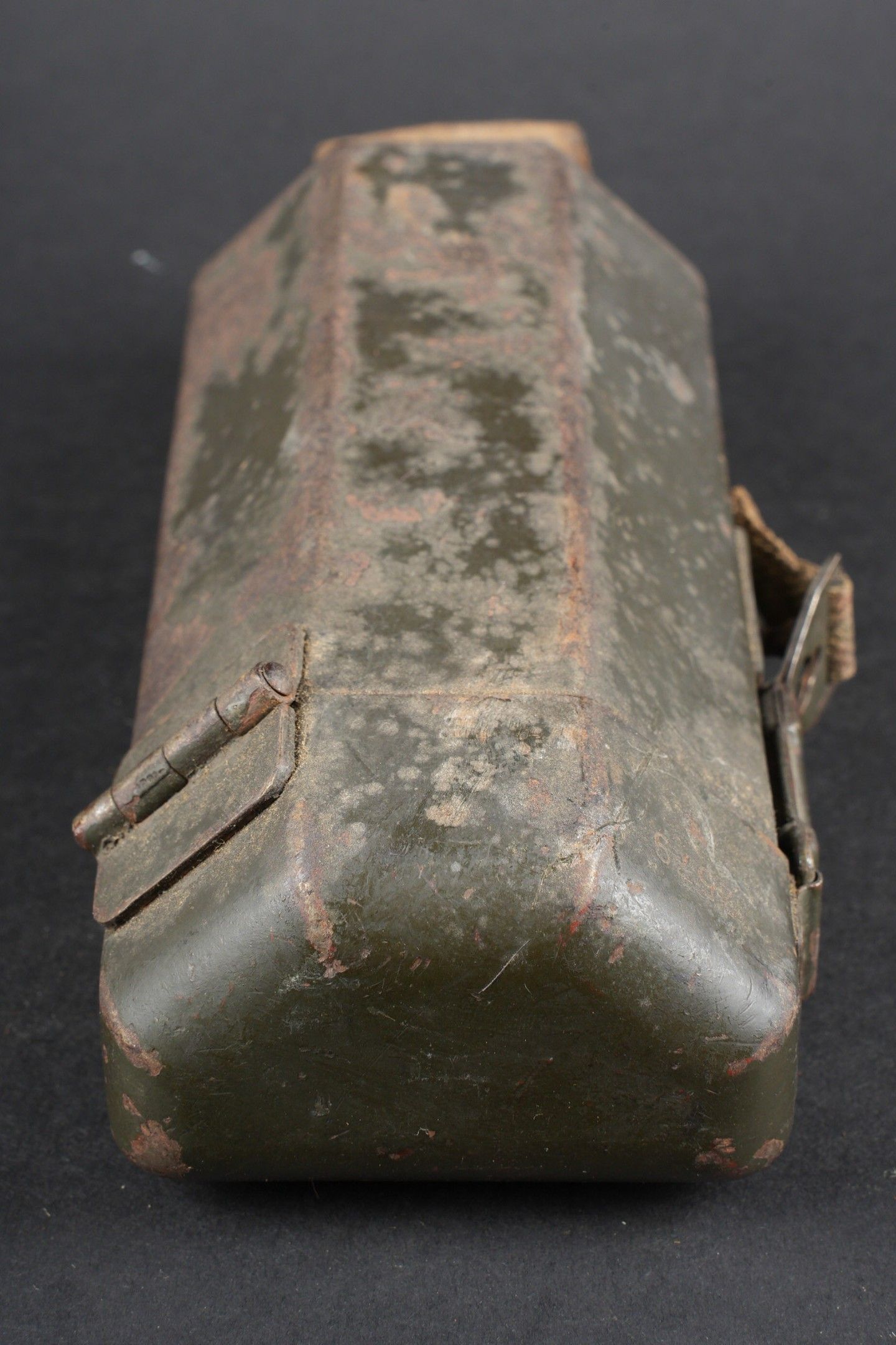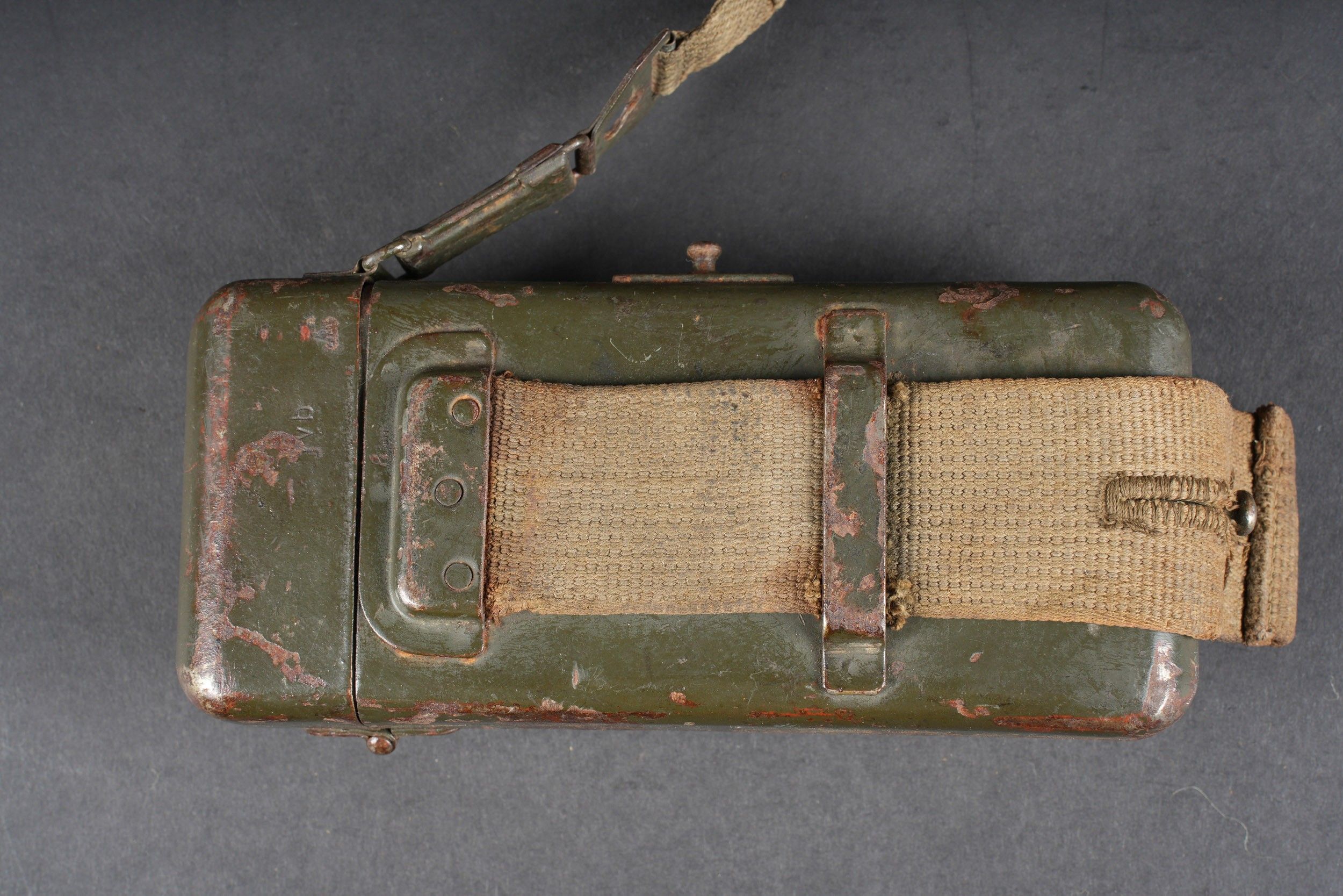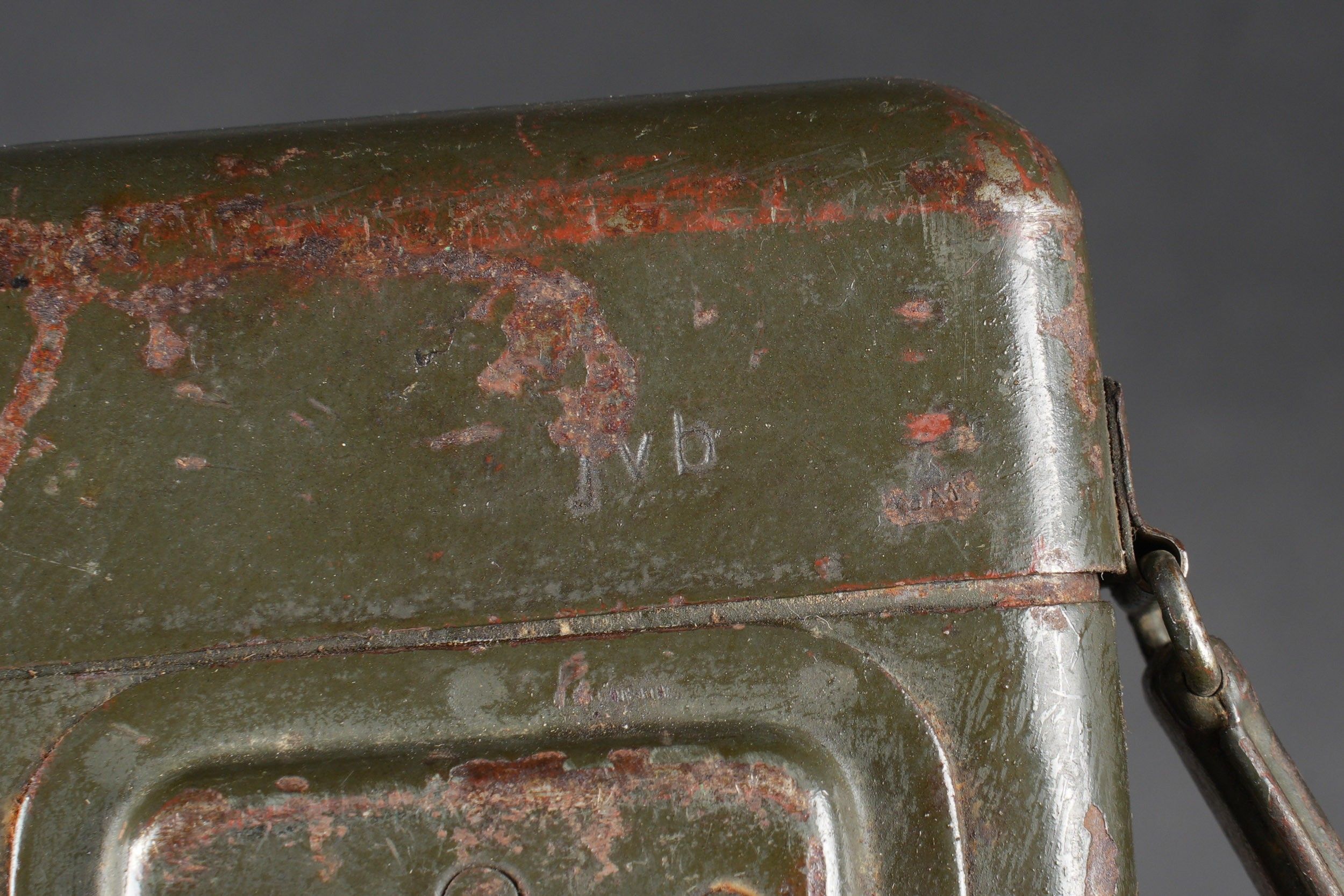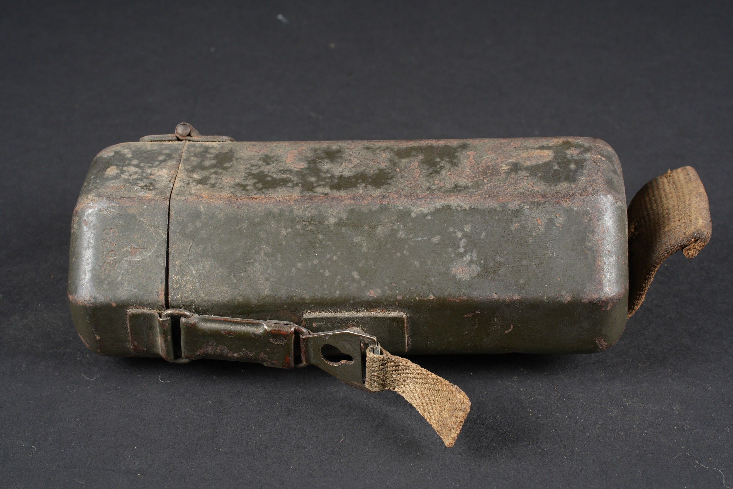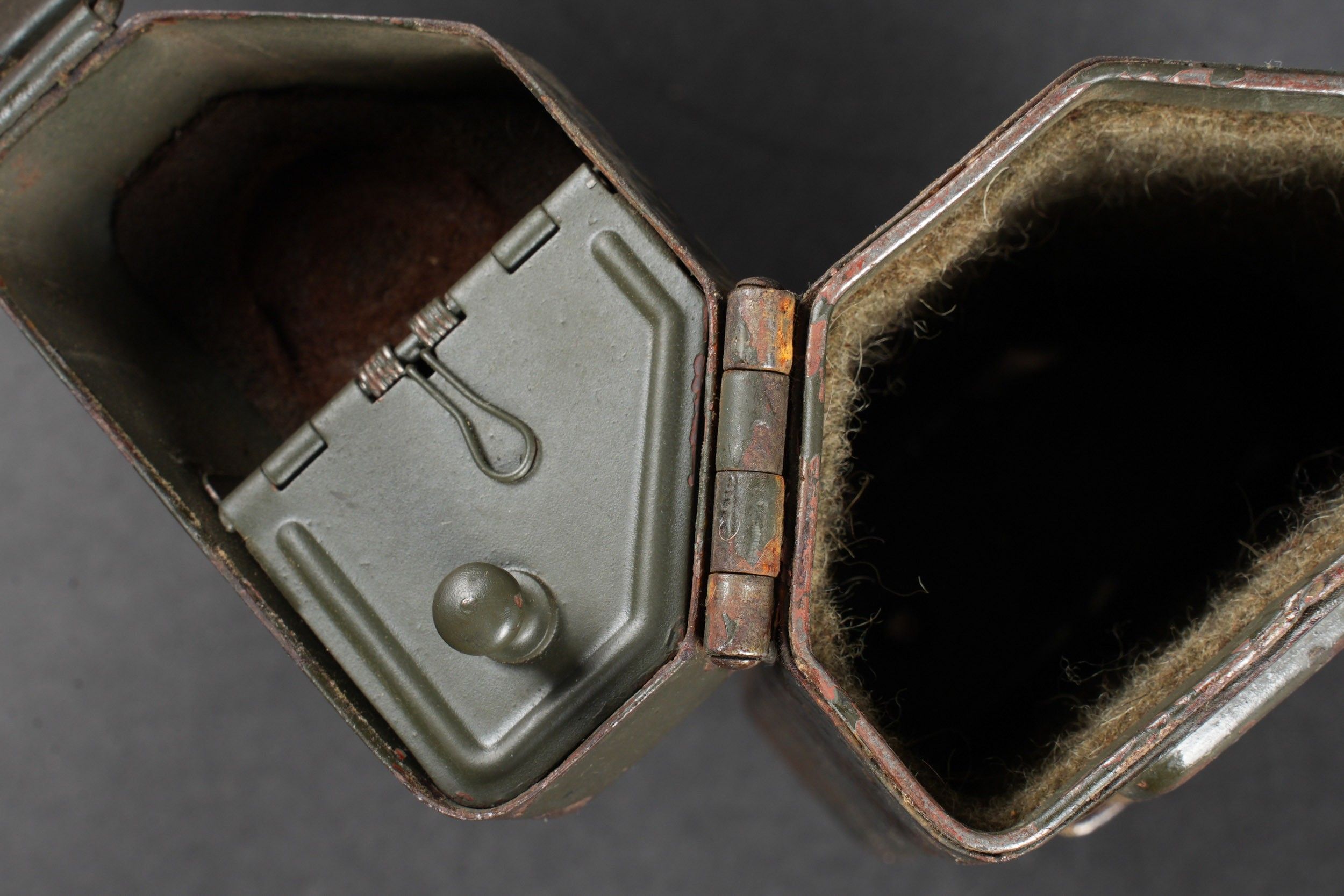Lunette ZF 41. Boitier en métal, peinture Feldgrau à 50%. Patte en toile complète. La tirette est fonctionnelle. Marquages JVB, avec aigle Waa. Lunette en métal, marquée ZD 41/1. Fabrication FZG. Numéro 0641. Optique en parfait état. Support en métal, numéro 2579, aigle waa présent. Les bonnettes en métal sont présentes. A noter une certaine usure et patine des pièces. Etat II+. ZF 41 scope. Metal case with 50% Feldgrau paint. Complete web pull strap, functional closure. Marked JVB with Waa eagle. Scope marked ZD 41/1, maker FZG, serial 0641, optics in perfect condition. Metal mount numbered 2579 with Waa eagle. Metal lens caps present. Show some wear and patina. Condition II+.