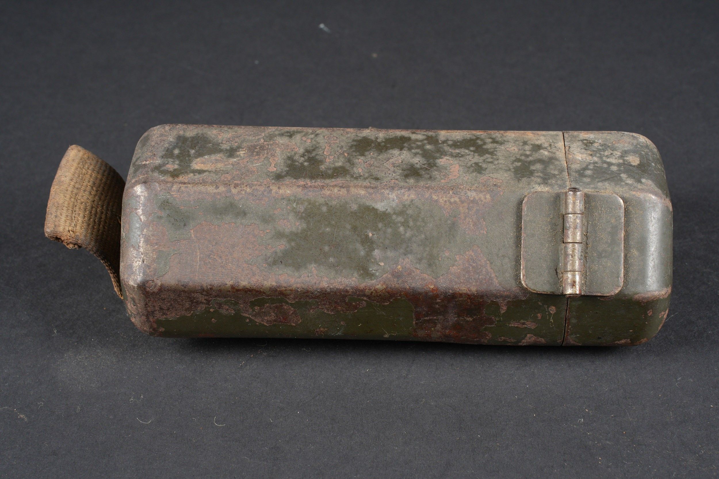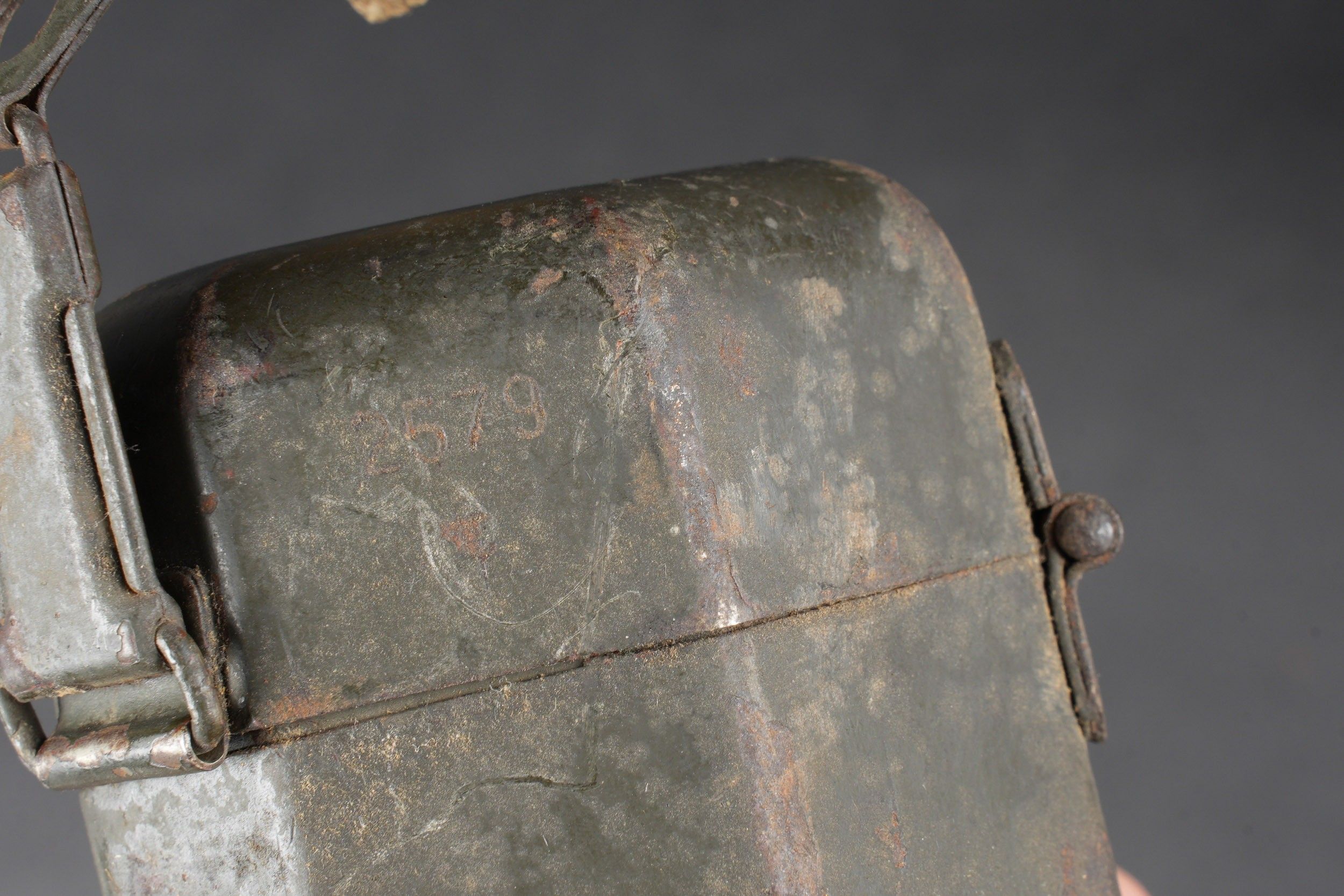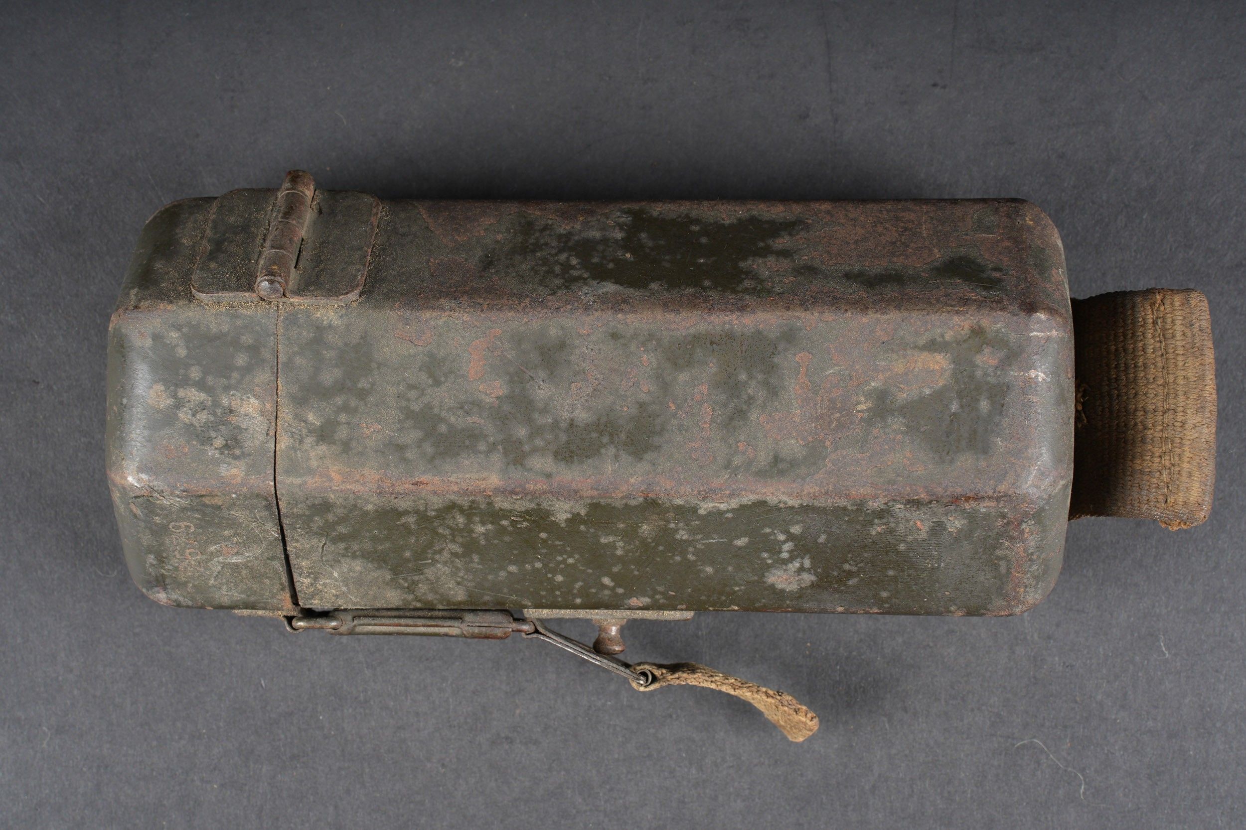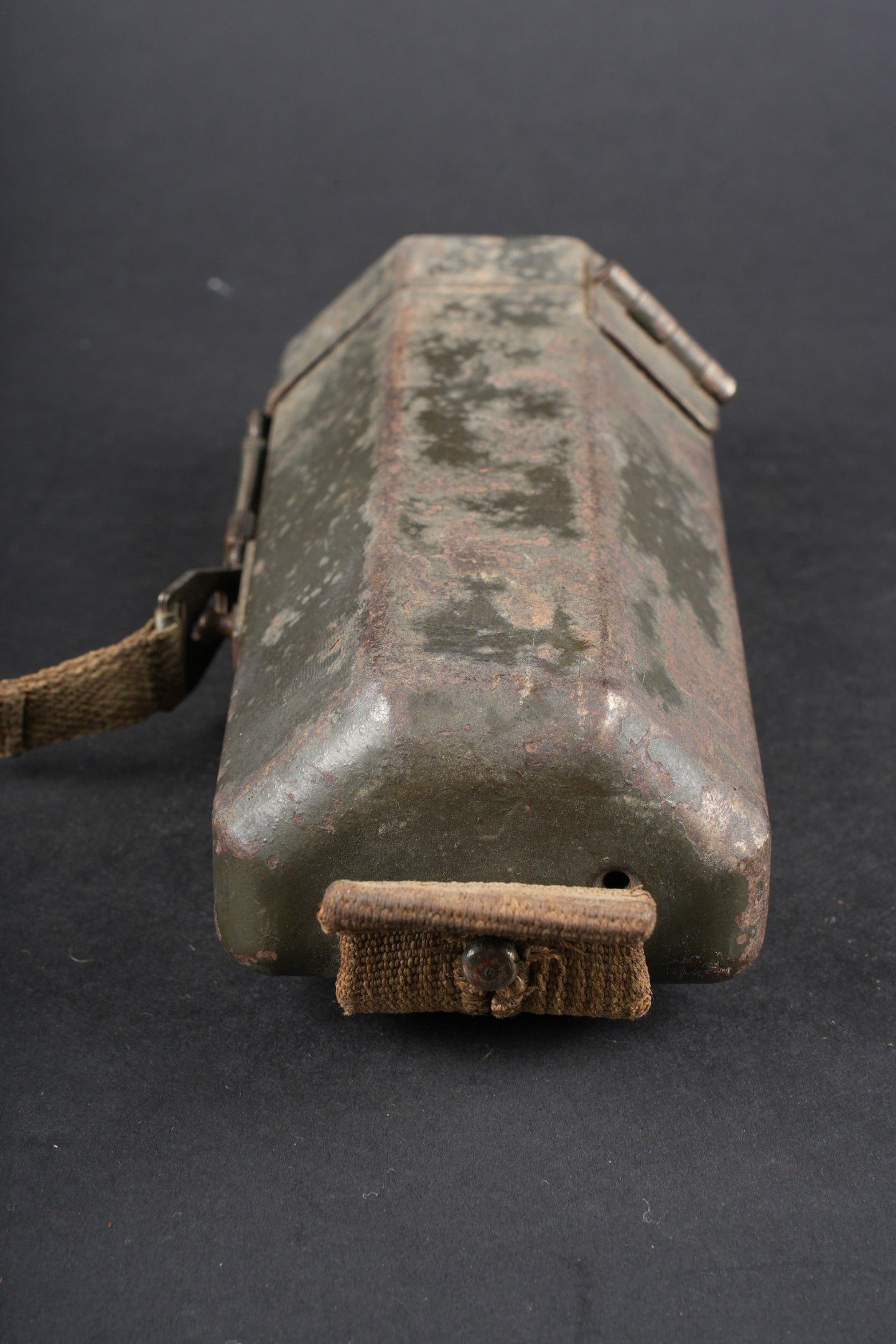 Lunette ZF 41. Boitier en métal, peinture Feldgrau à 50%. Patte en toile complète. La tirette est fonctionnelle. Marquages JVB, avec aigle Waa. Lunette en métal, marquée ZD 41/1. Fabrication FZG. Numéro 0641. Optique en parfait état. Support en métal, numéro 2579, aigle waa présent. Les bonnettes en métal sont présentes. A noter une certaine usure et patine des pièces. Etat II+. ZF 41 scope. Metal case with 50% Feldgrau paint. Complete web pull strap, functional closure. Marked JVB with Waa eagle. Scope marked ZD 41/1, maker FZG, serial 0641, optics in perfect condition. Metal mount numbered 2579 with Waa eagle. Metal lens caps present. Show some wear and patina. Condition II+.