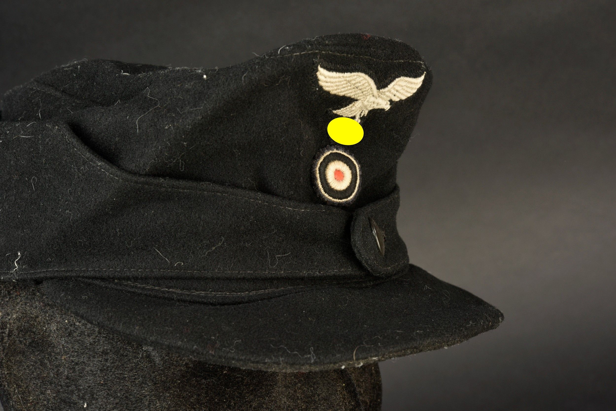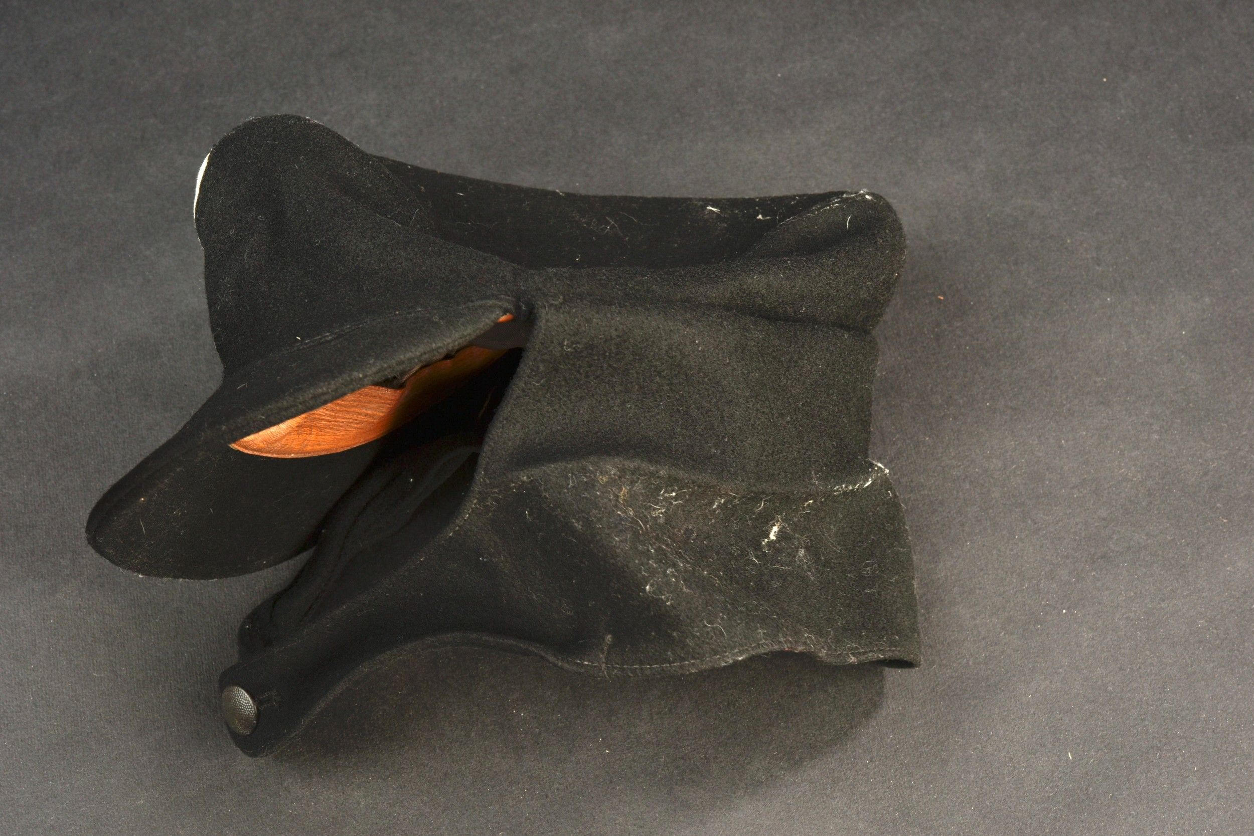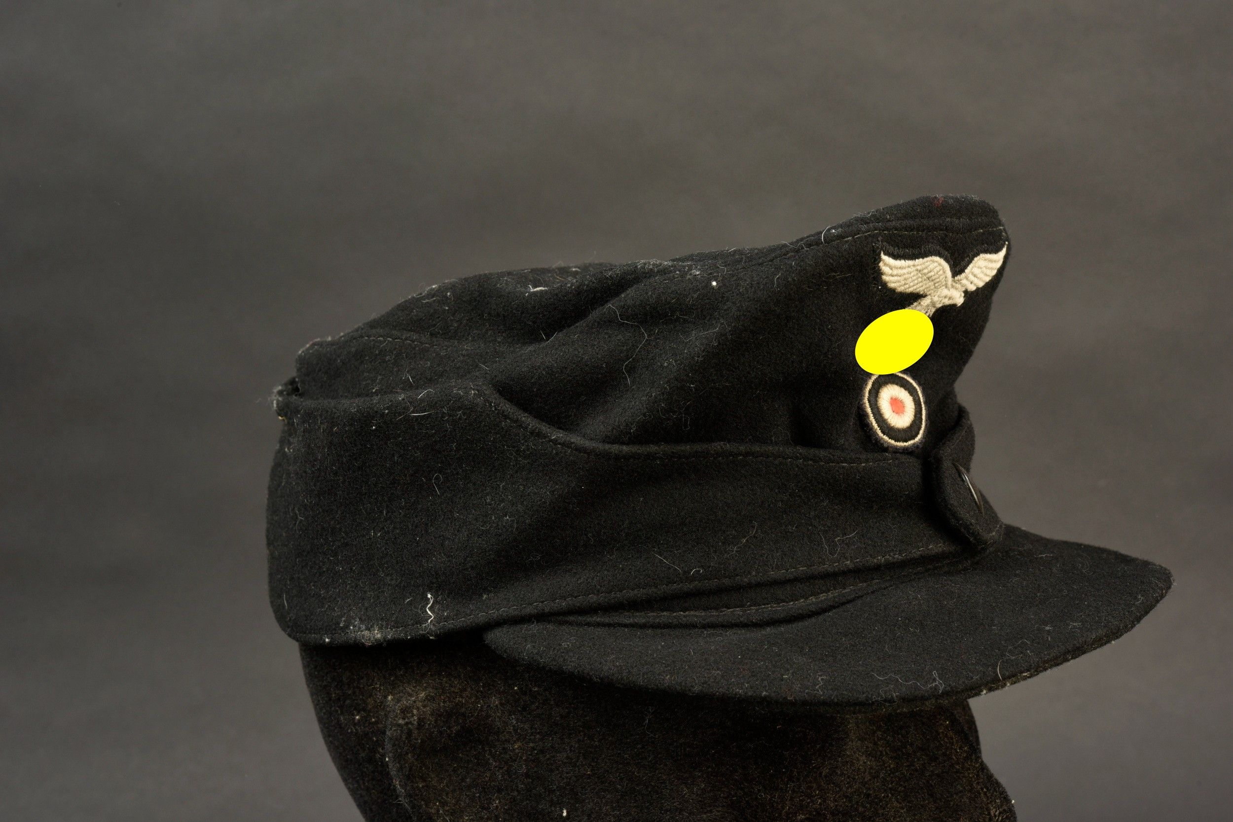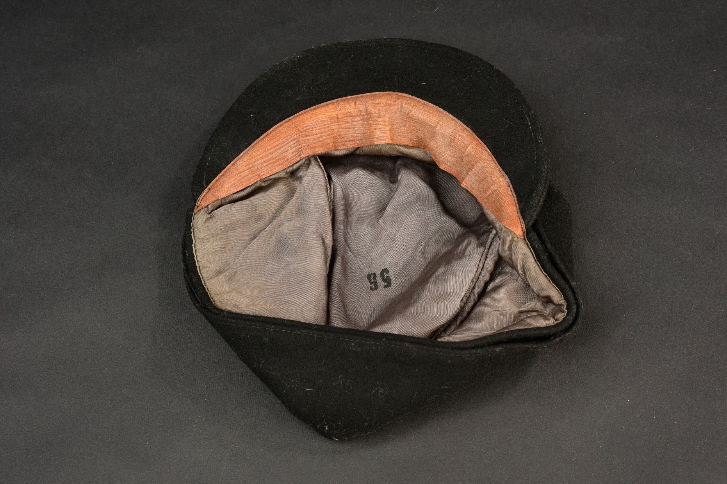 Casquette Hermann Göring. En drap noir. Un bouton lisse fermant le rabat. Aigle de la Luftwaffe et cocarde sur fond noir, cousus main. Visière présentant quelques craquelures. Demi bandeau de sudation en cuir marron. Intérieur doublé en tissu soyeux gris. Taille 56. L'authenticité de la pièce n'est pas garantie. A noter une certaine usure et patine de la pièce. Etat II+. Hermann Göring visor cap. Black wool construction with smooth button closing the front flap. Hand-sewn Luftwaffe eagle and cockade on black backing. Visor shows minor cracking. Partial brown leather sweatband and grey silk lining. Size 56. Authenticity of the piece not guaranteed. Shows some wear and patina. Condition II+.