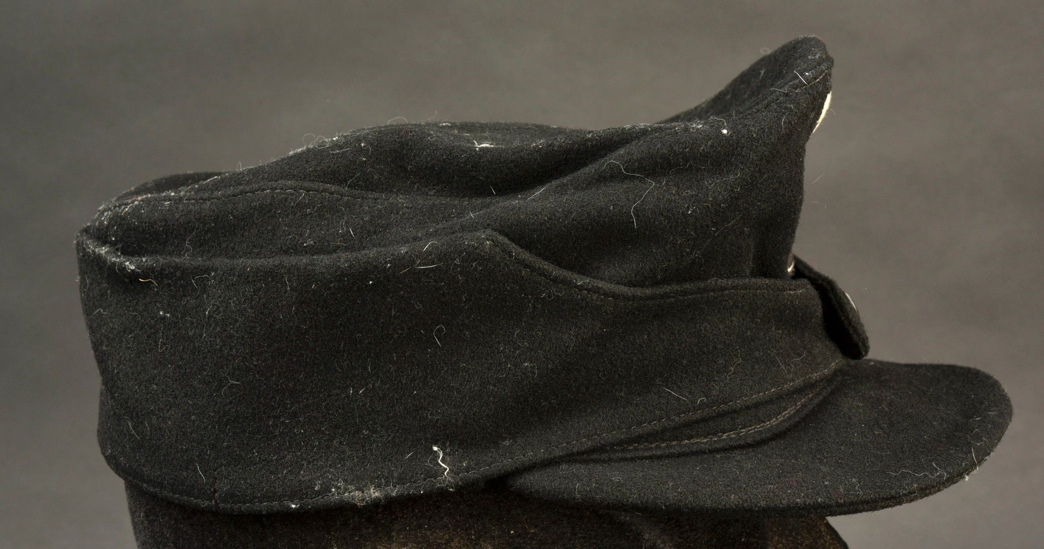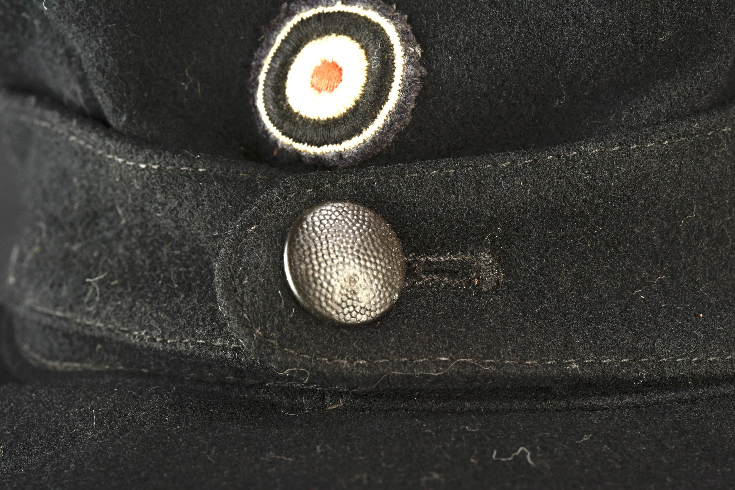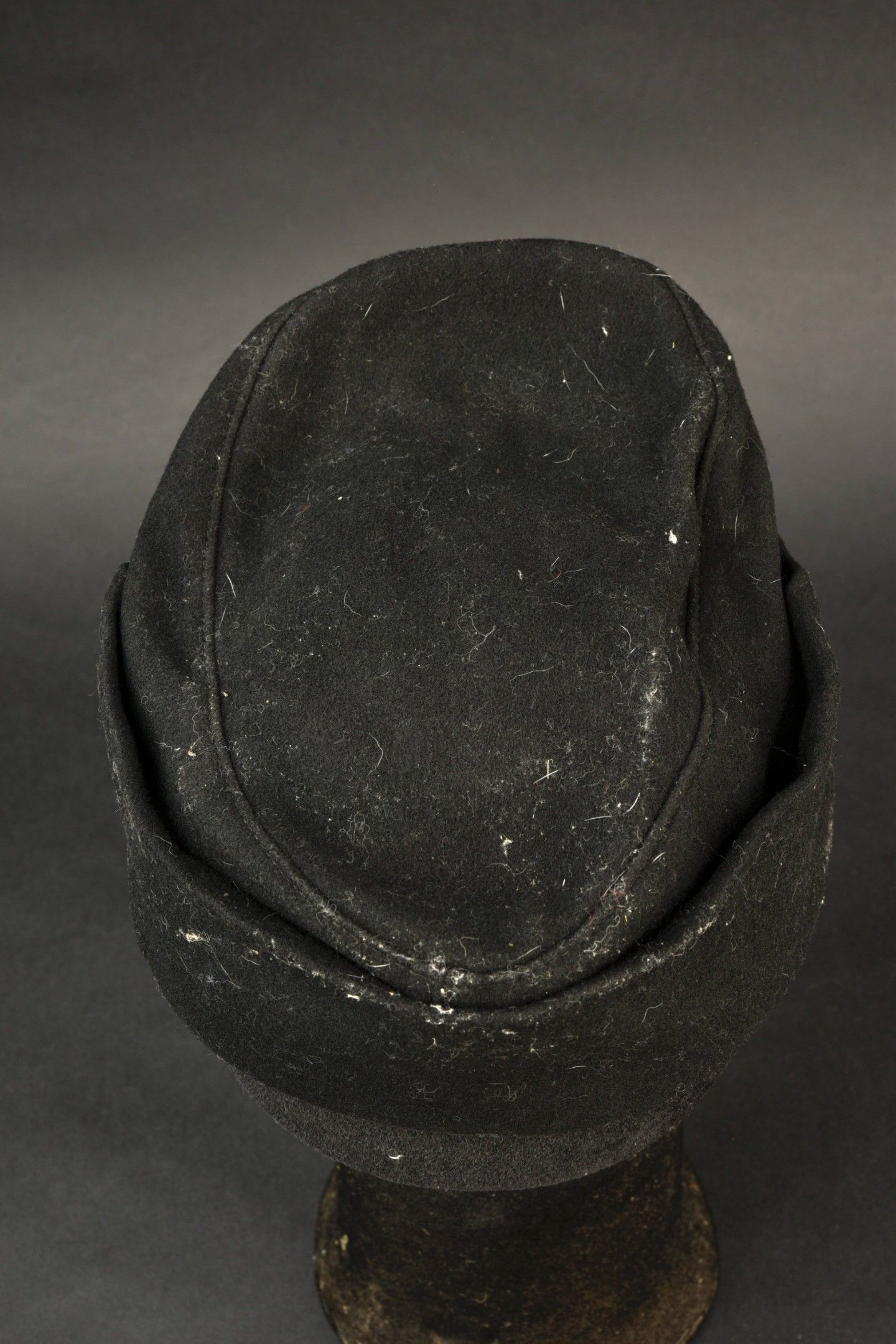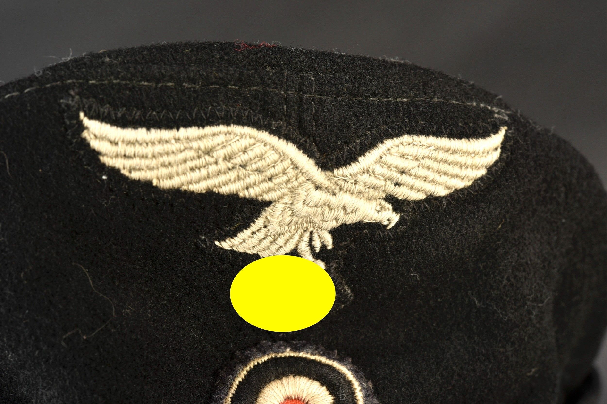 Casquette Hermann Göring. En drap noir. Un bouton lisse fermant le rabat. Aigle de la Luftwaffe et cocarde sur fond noir, cousus main. Visière présentant quelques craquelures. Demi bandeau de sudation en cuir marron. Intérieur doublé en tissu soyeux gris. Taille 56. L'authenticité de la pièce n'est pas garantie. A noter une certaine usure et patine de la pièce. Etat II+. Hermann Göring visor cap. Black wool construction with smooth button closing the front flap. Hand-sewn Luftwaffe eagle and cockade on black backing. Visor shows minor cracking. Partial brown leather sweatband and grey silk lining. Size 56. Authenticity of the piece not guaranteed. Shows some wear and patina. Condition II+.