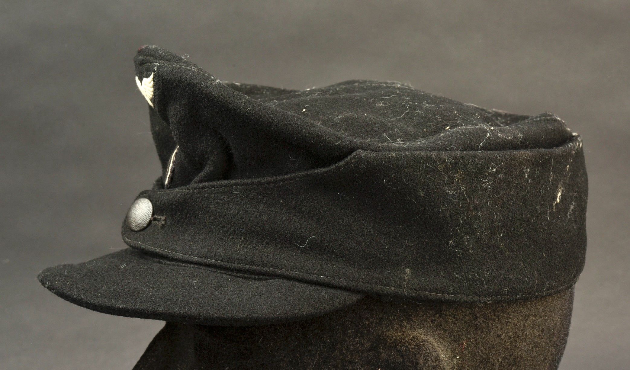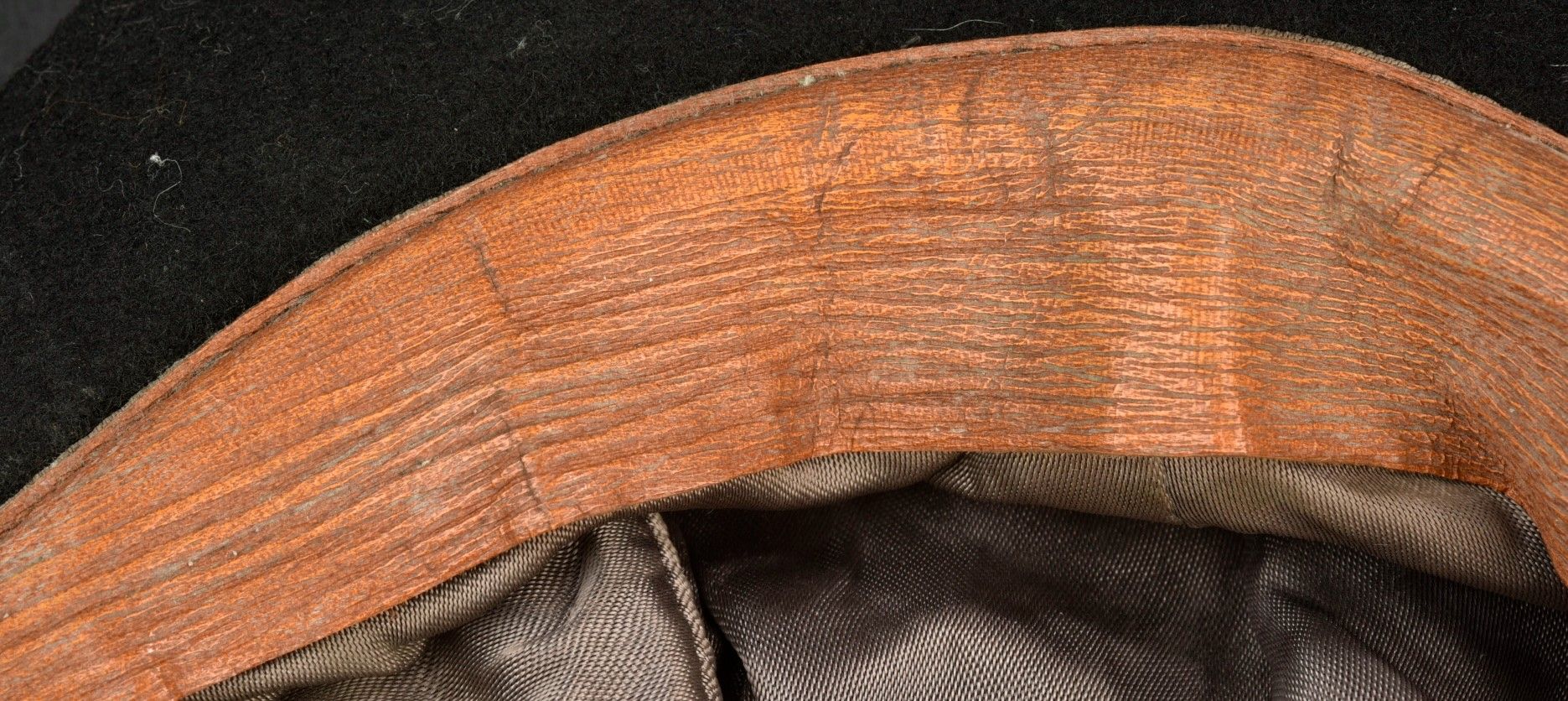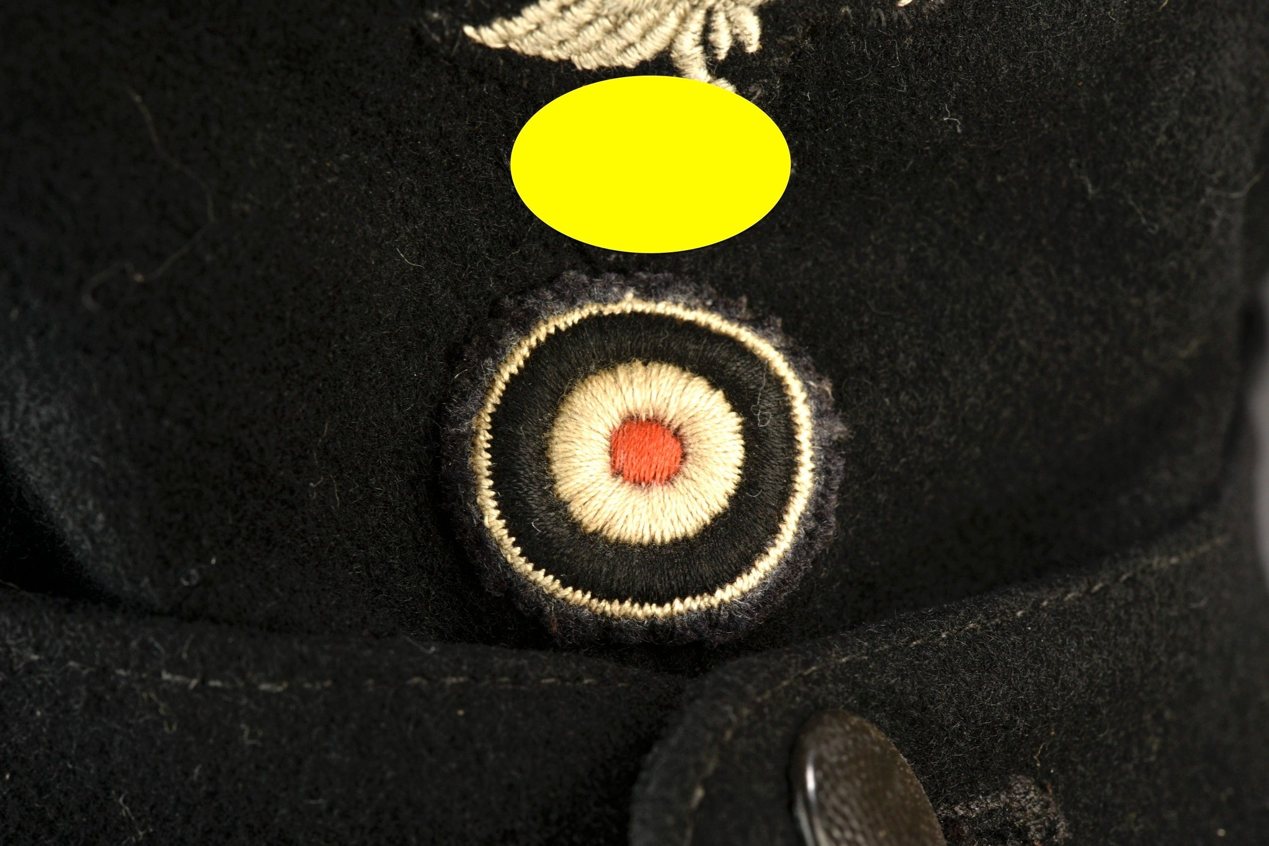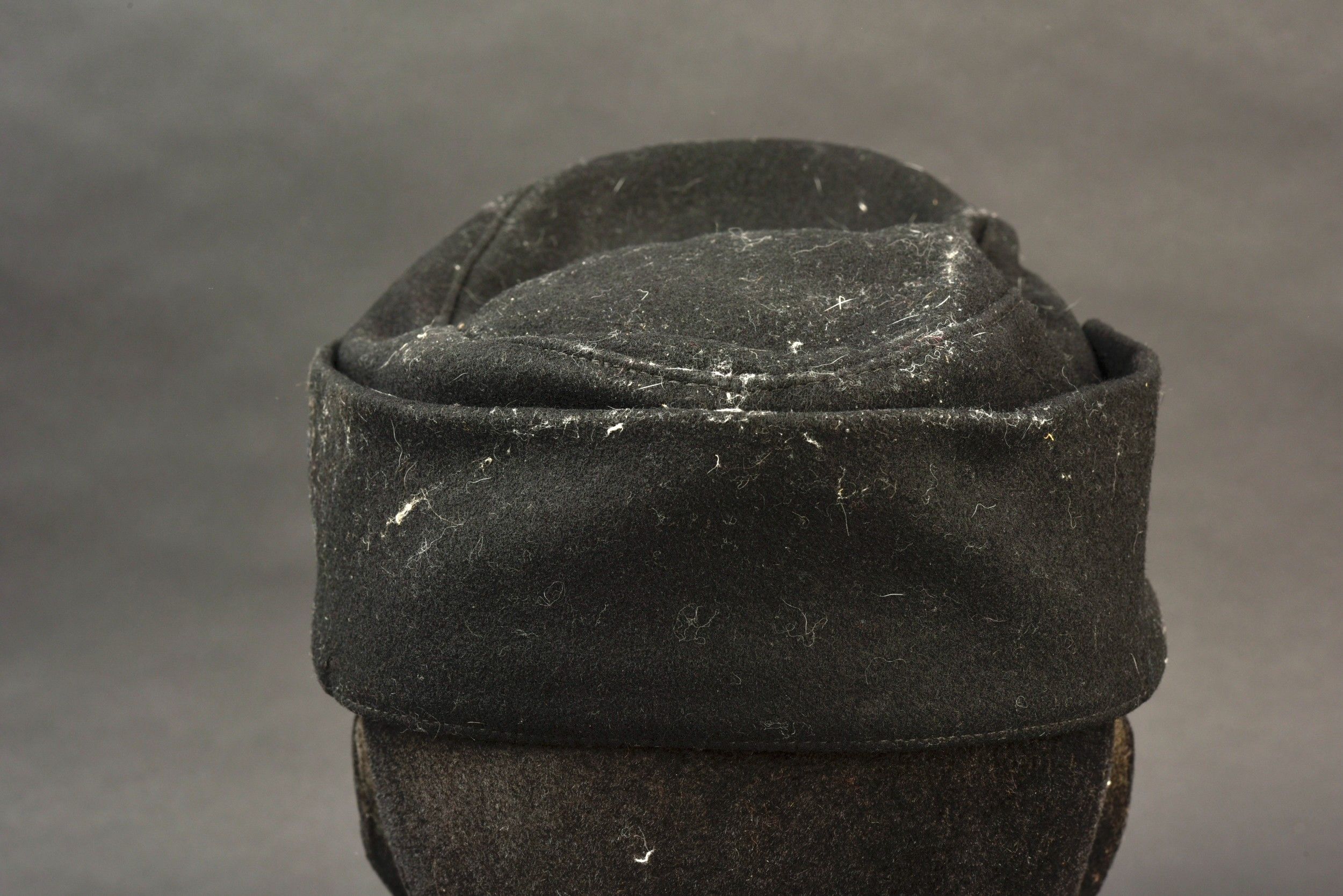 Casquette Hermann Göring. En drap noir. Un bouton lisse fermant le rabat. Aigle de la Luftwaffe et cocarde sur fond noir, cousus main. Visière présentant quelques craquelures. Demi bandeau de sudation en cuir marron. Intérieur doublé en tissu soyeux gris. Taille 56. L'authenticité de la pièce n'est pas garantie. A noter une certaine usure et patine de la pièce. Etat II+. Hermann Göring visor cap. Black wool construction with smooth button closing the front flap. Hand-sewn Luftwaffe eagle and cockade on black backing. Visor shows minor cracking. Partial brown leather sweatband and grey silk lining. Size 56. Authenticity of the piece not guaranteed. Shows some wear and patina. Condition II+.