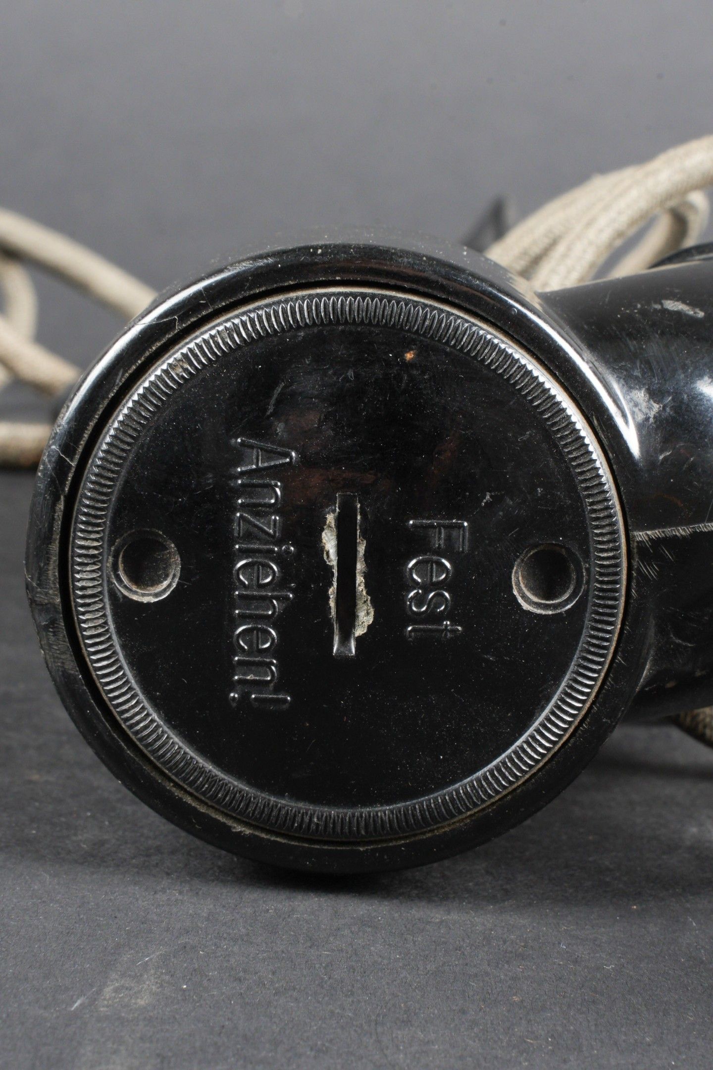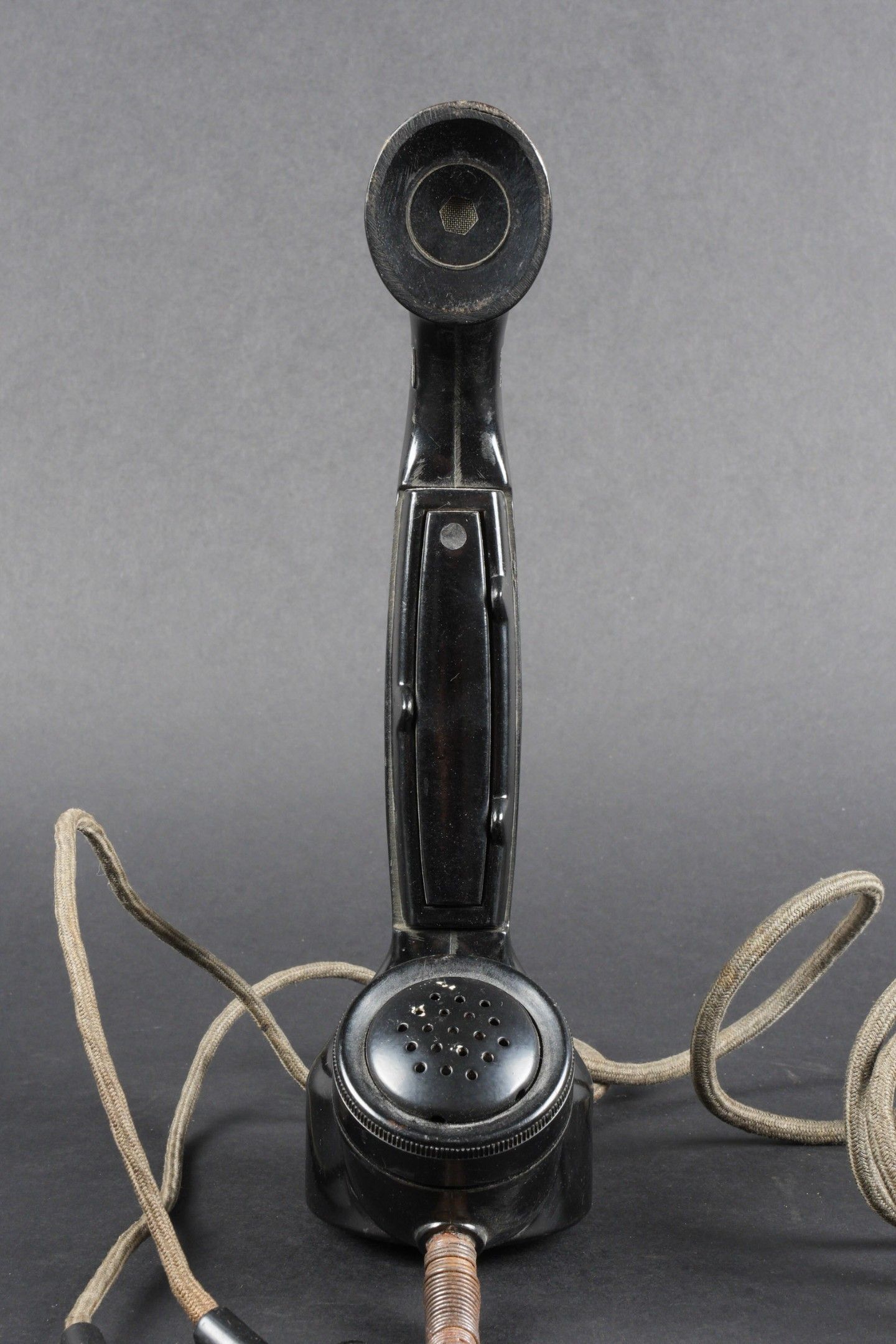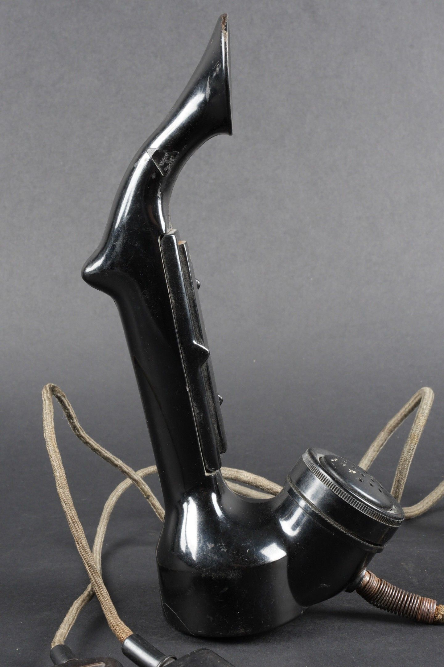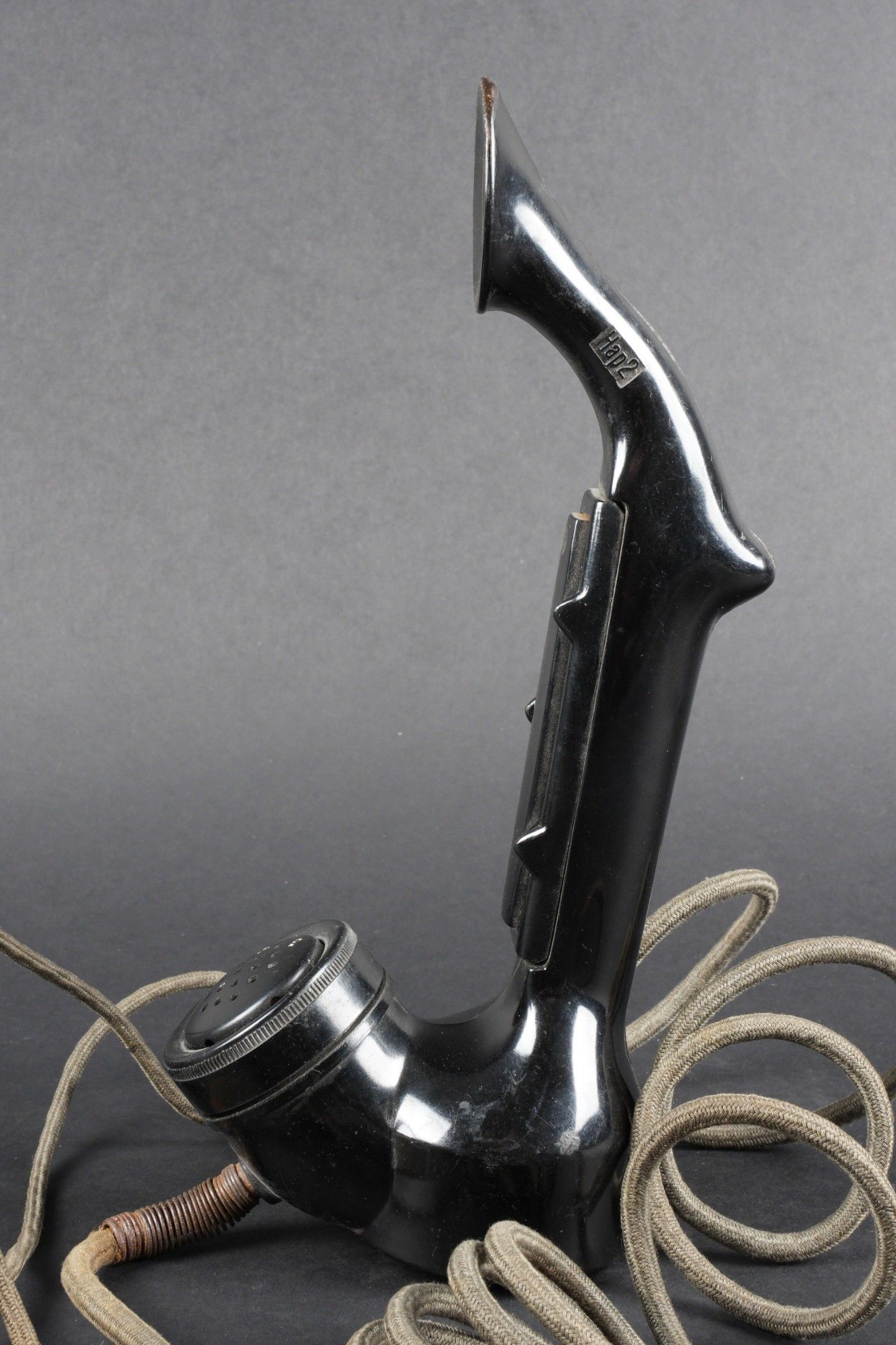 Combiné téléphonique allemand. En bakélite noire. Marquage Hap 2, avec aigle Waa. Le câble et les deux prises sont présents. Ce modèle fut conçu pour pouvoir communiquer sur le front durant les combats sans avoir à retirer le casque en acier. Rare pièce d’équipement de transmission. A noter une légère usure et patine de la pièce. Etat I-. German telephone handset. Black Bakelite marked Hap 2 with Waffenamt eagle. Cable and both plugs intact. Designed for front-line communication during combat without removing the steel helmet. Rare communications equipment. Light wear and patina consistent with age. Condition I–.