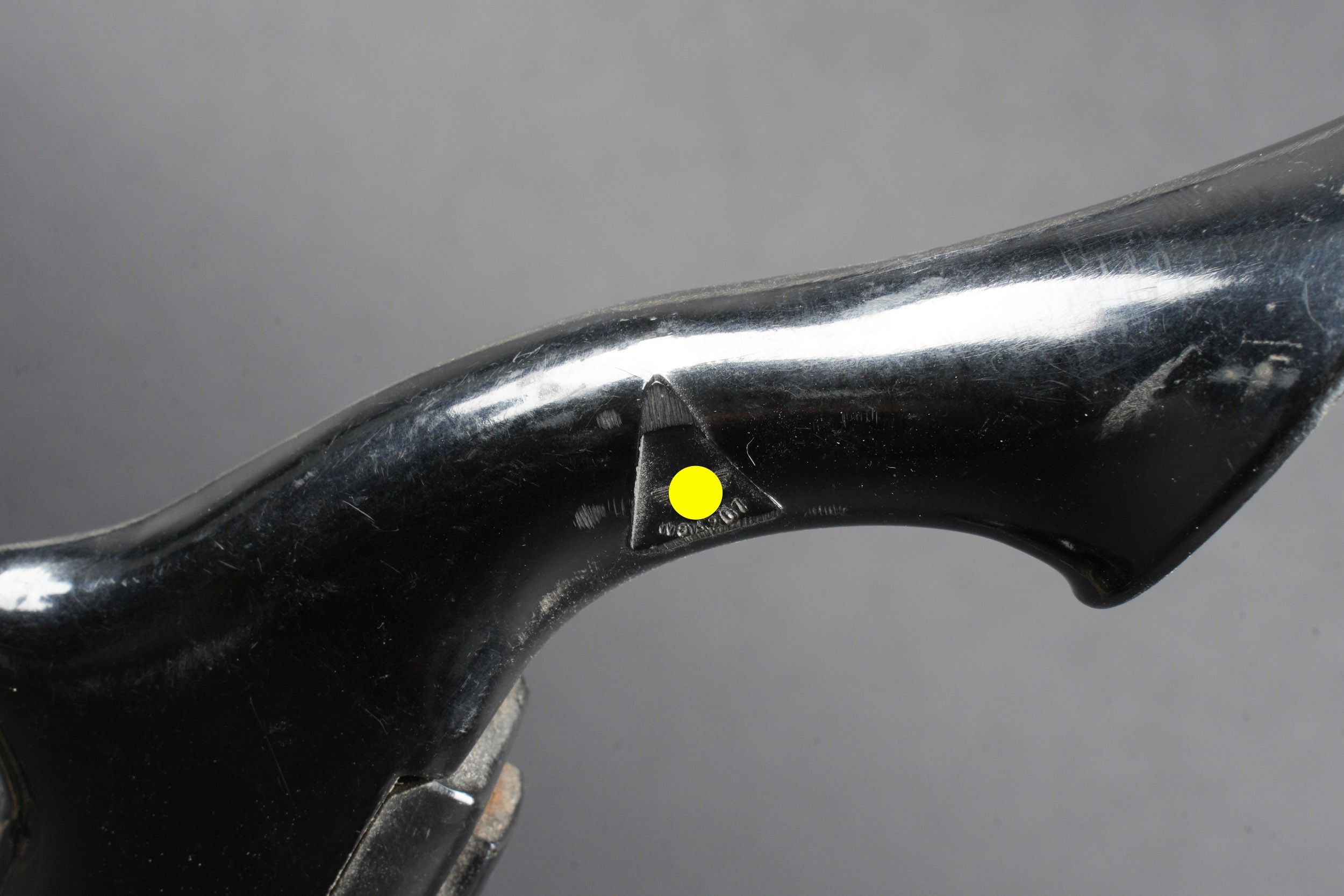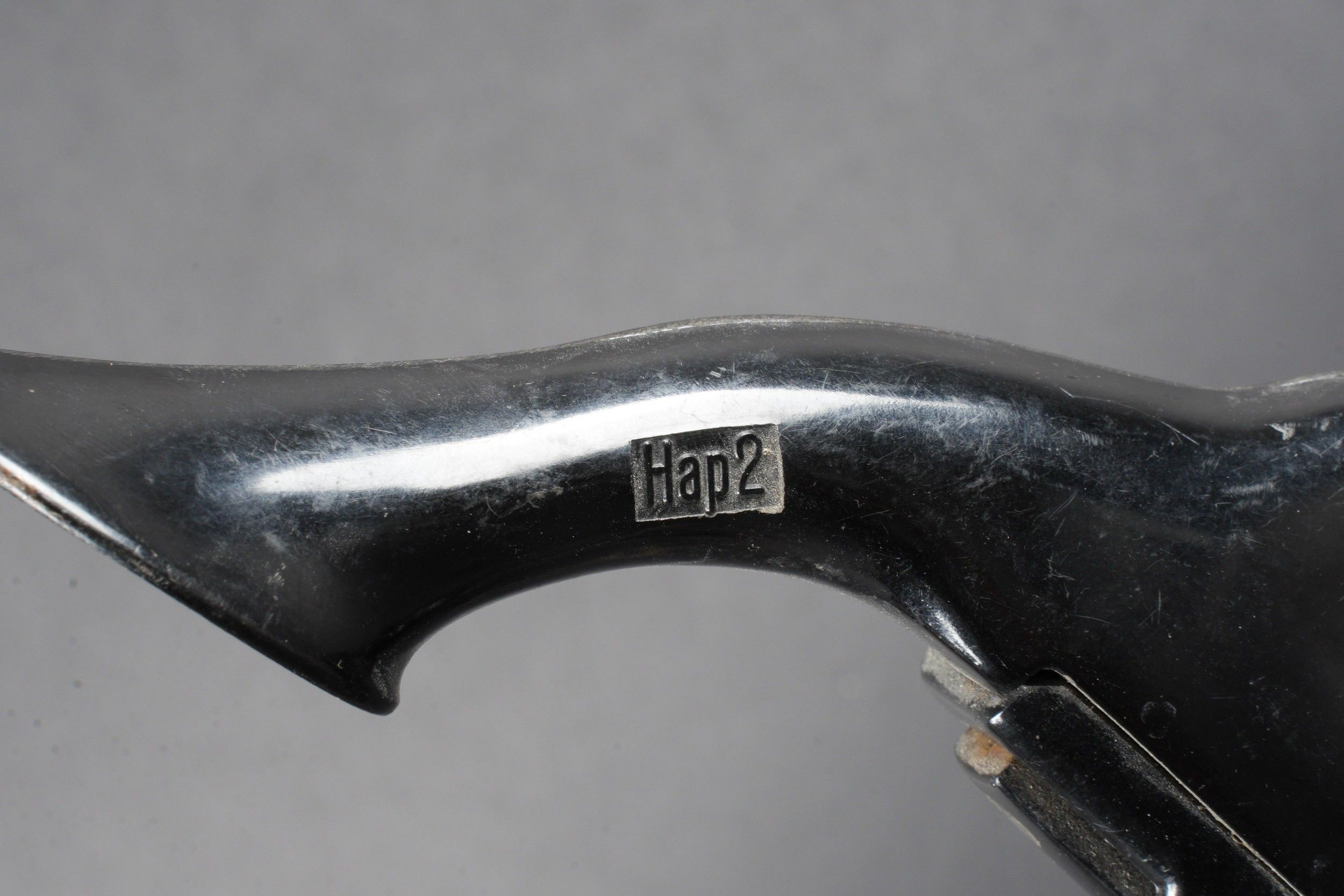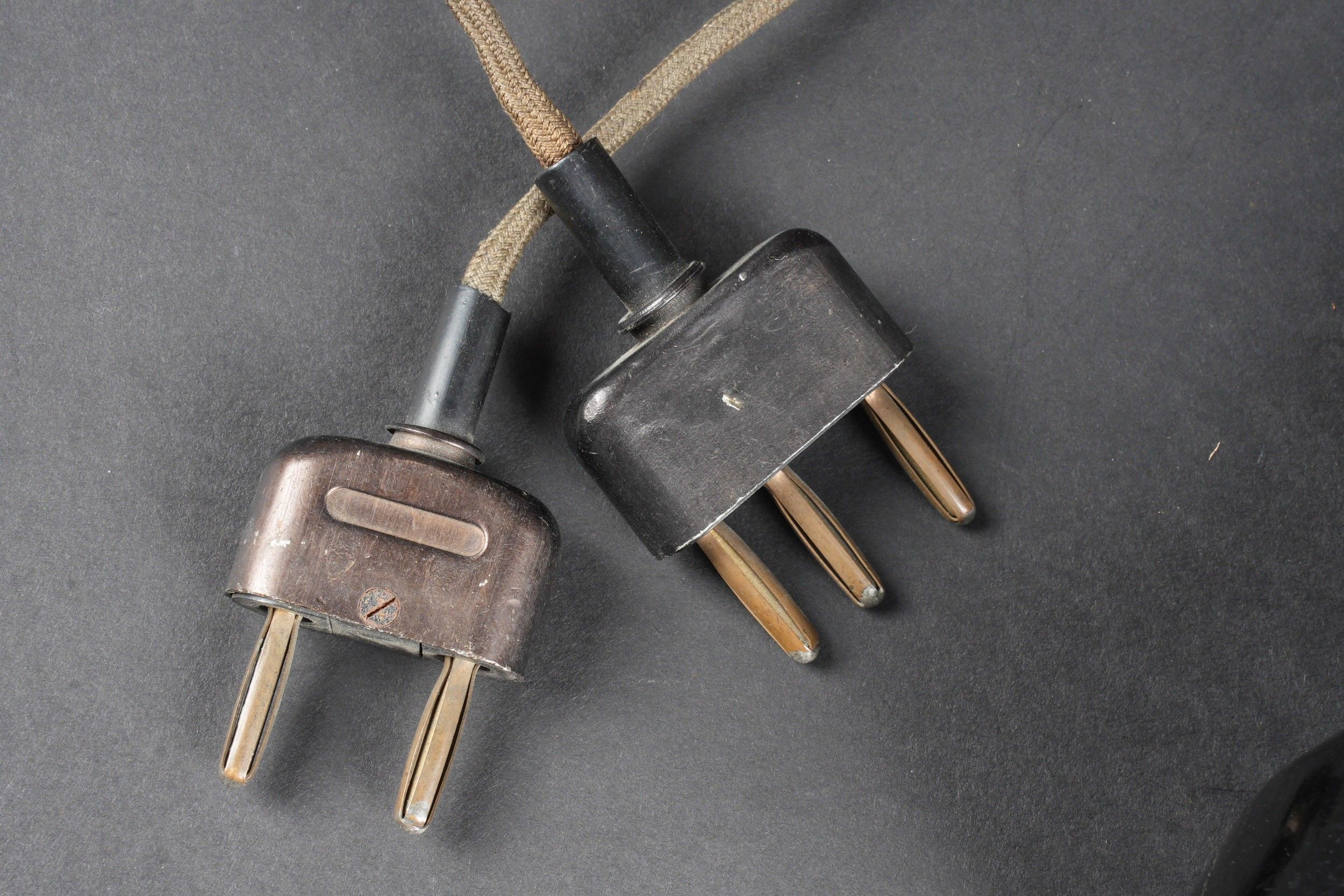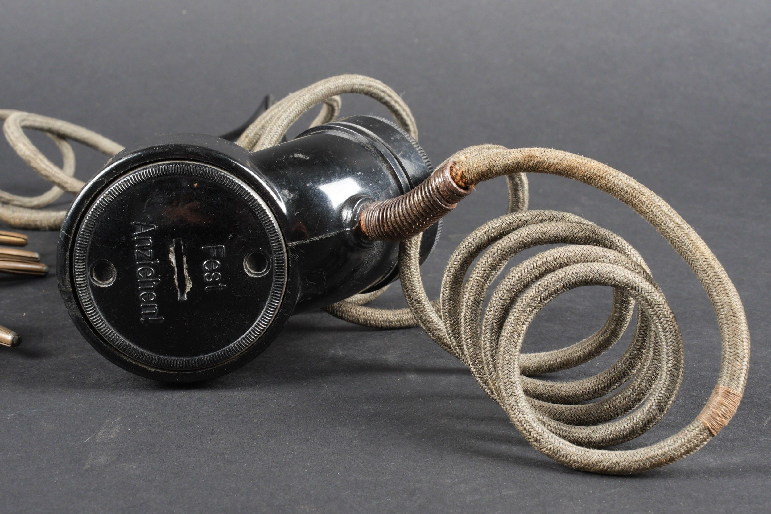 Combiné téléphonique allemand. En bakélite noire. Marquage Hap 2, avec aigle Waa. Le câble et les deux prises sont présents. Ce modèle fut conçu pour pouvoir communiquer sur le front durant les combats sans avoir à retirer le casque en acier. Rare pièce d’équipement de transmission. A noter une légère usure et patine de la pièce. Etat I-. German telephone handset. Black Bakelite marked Hap 2 with Waffenamt eagle. Cable and both plugs intact. Designed for front-line communication during combat without removing the steel helmet. Rare communications equipment. Light wear and patina consistent with age. Condition I–.