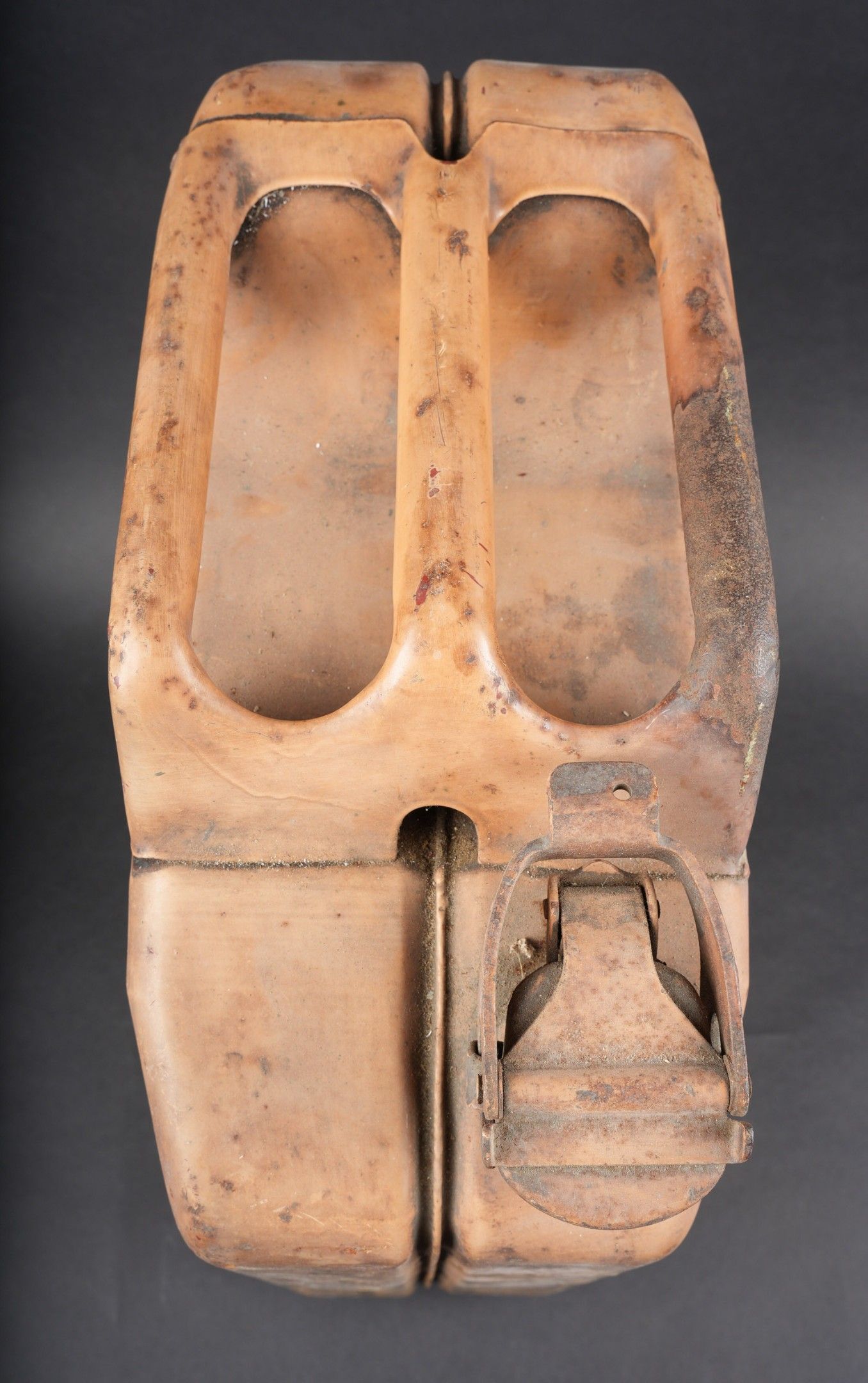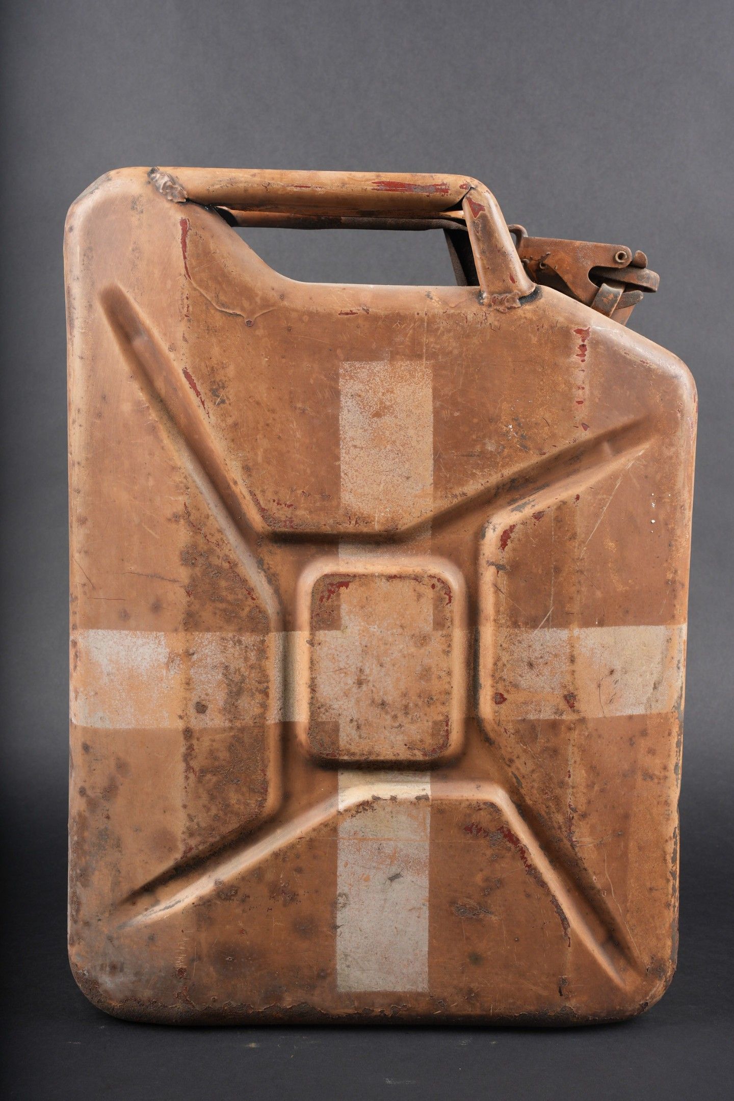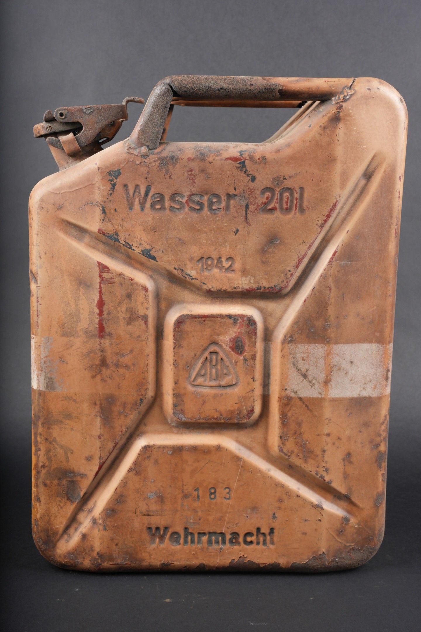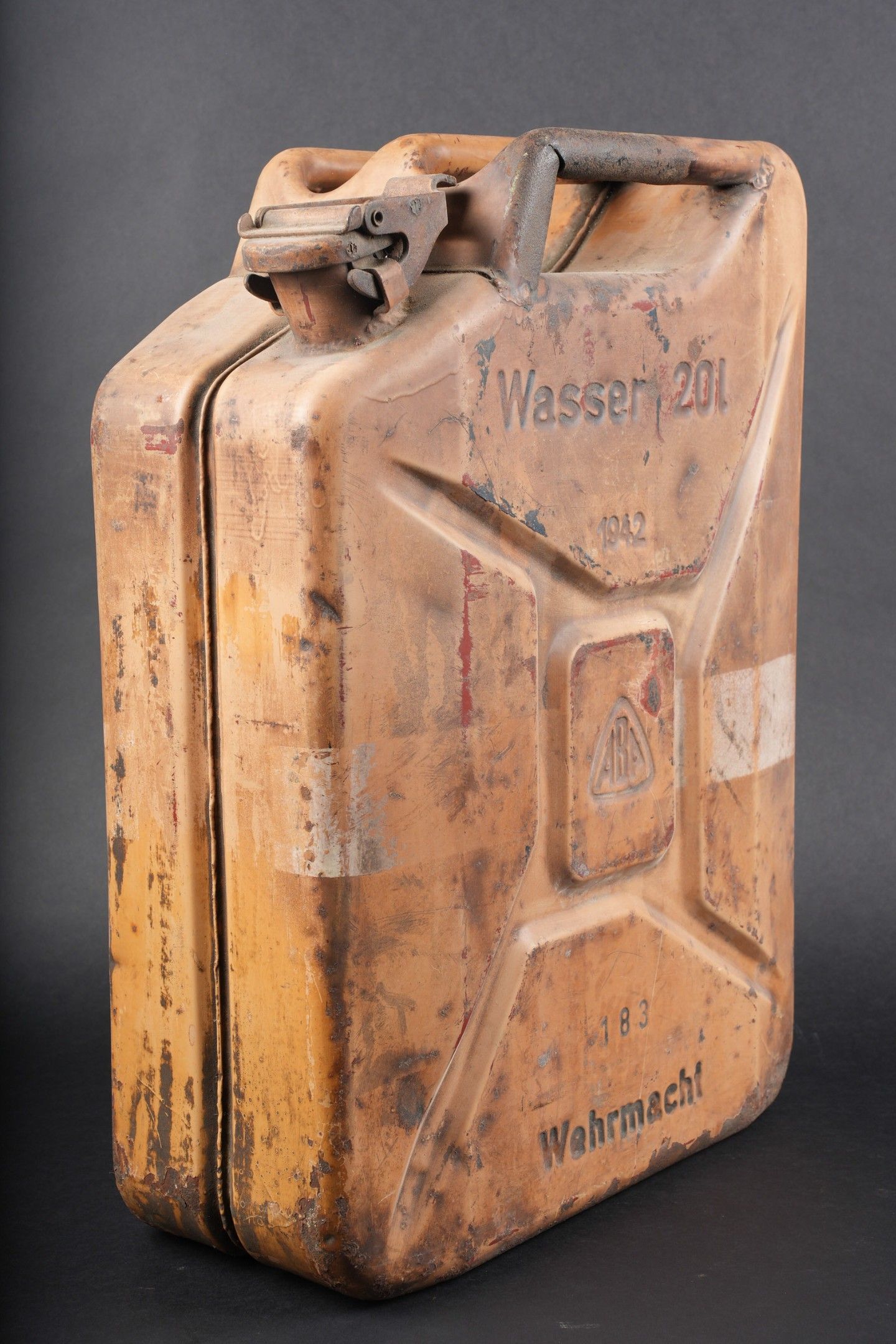 Jerrycan Wasser. En métal. Peinture jaune sable à 80%. Belle croix blanche sur les deux côtés du jerrycan. Bouchon complet et fonctionnel. Marquages Wasser 20L 1942 ABA 183 Wehrmacht. A noter une certaine usure et oxydation de la pièce. Etat II+. Jerrycan Wasser. Metal construction with 80% original sand-yellow paint and white cross on both sides. Complete and functional cap. Marked Wasser 20L 1942 ABA 183 Wehrmacht. Some wear and light oxidation consistent with age. Condition II+.