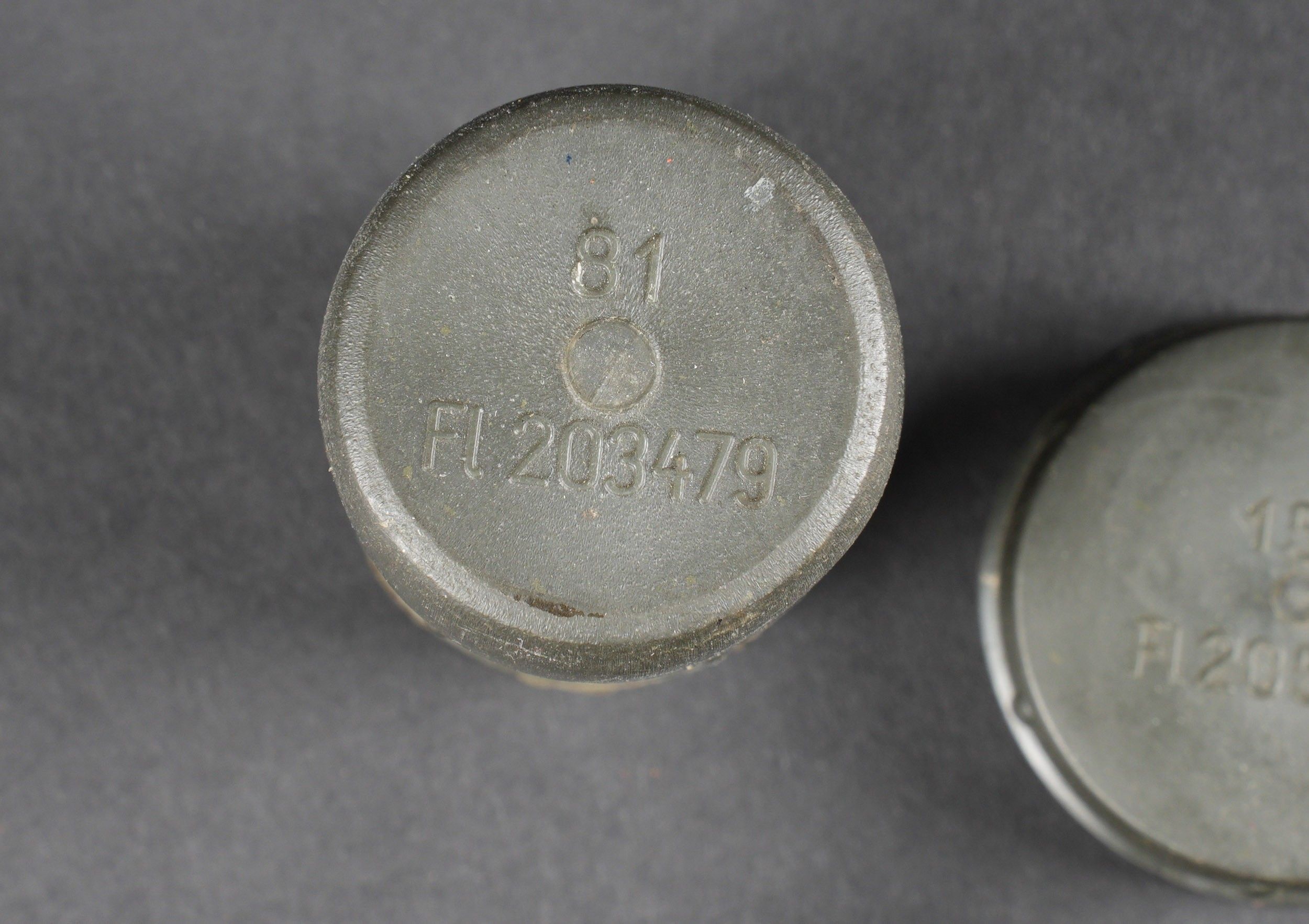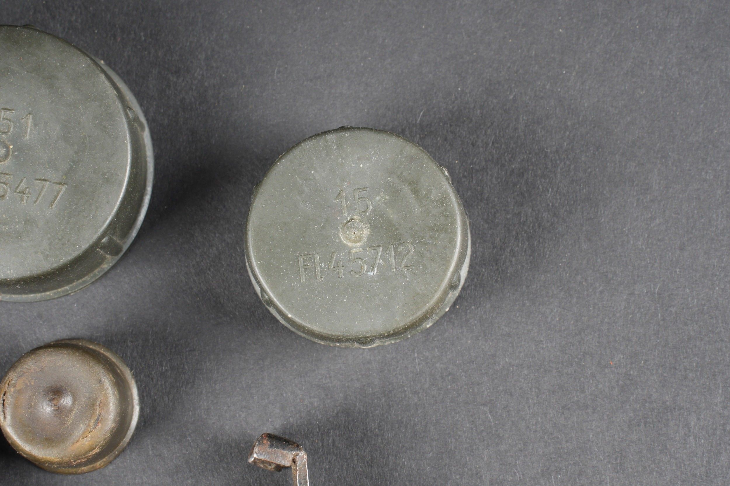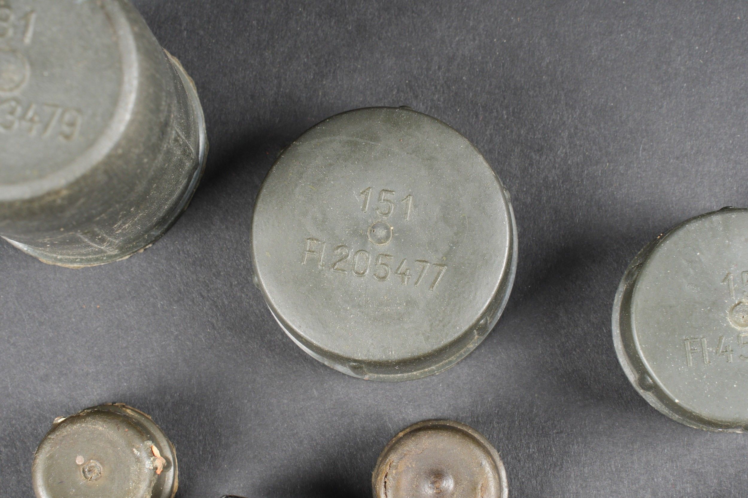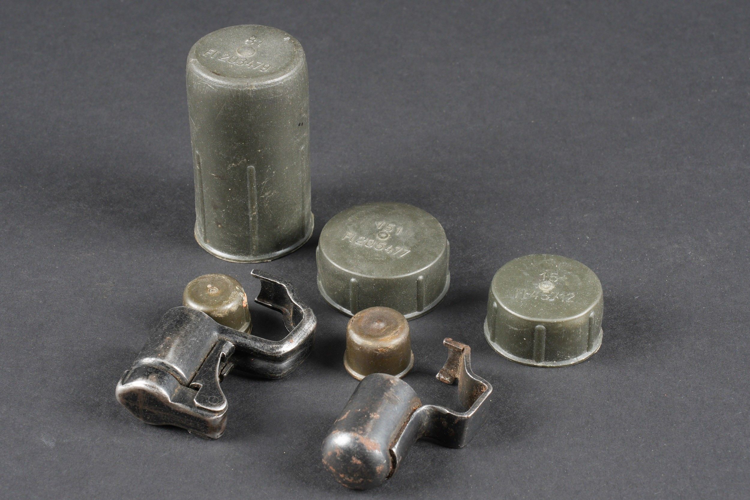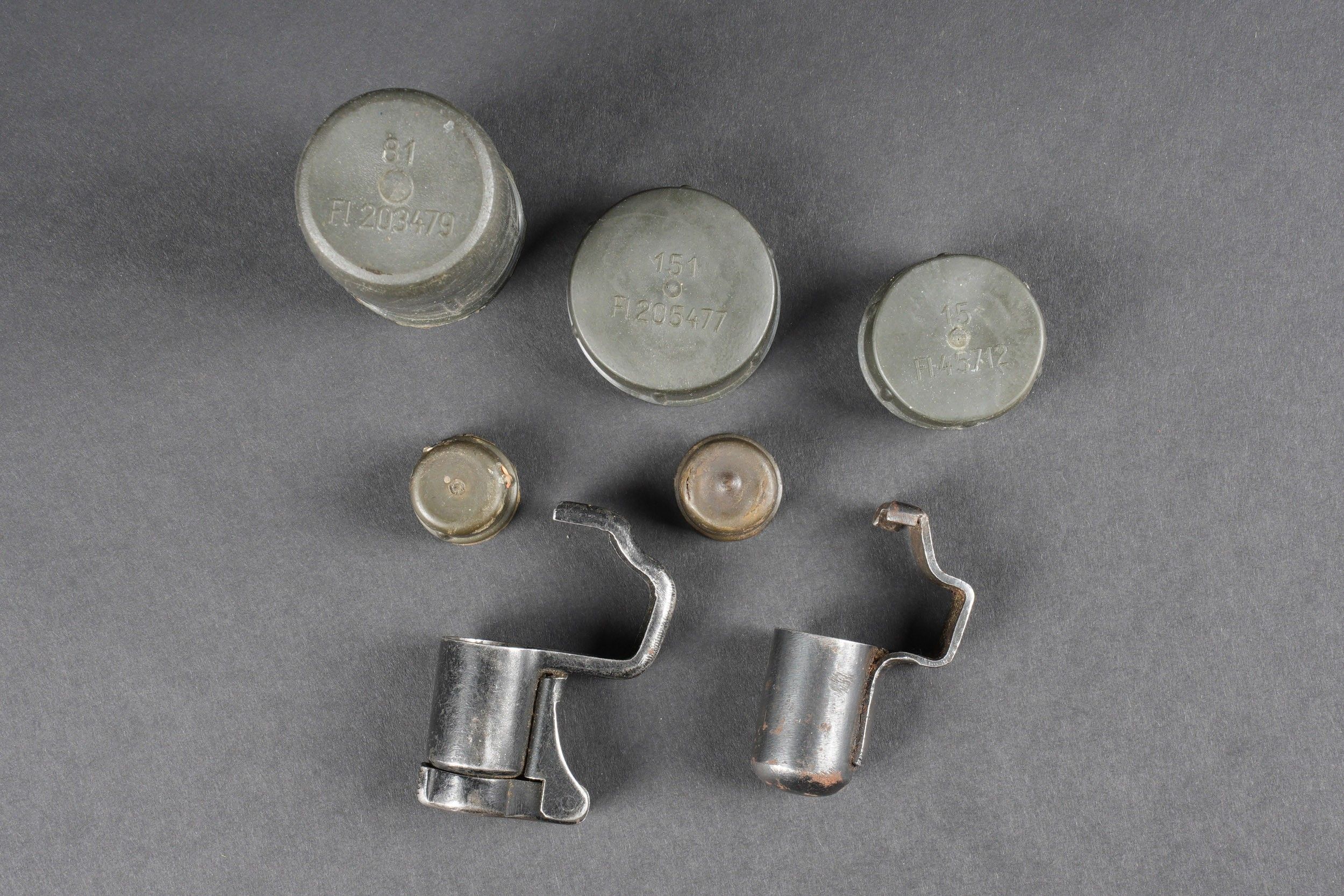 Accessoires d'armement. Comprenant deux bouchons en caoutchouc pour fusil mauser 98K. Deux modèles différents de bouchons de Mauser 98K en métal, sans marquages visibles. Un bouchon en caoutchouc pour canon de MG 131 marqué 15 FL 45712. Un bouchon en caoutchouc pour canon d'aviation, marqué 151 FL205477. Un bouchon pour canon d'aviation, marqué 81 FL 203479. A noter une certaine usure et patine des pièces. Etat II+. Weapon accessories. Comprising two rubber muzzle covers for the Mauser 98K rifle and two metal variants without visible markings. One rubber muzzle cover for the MG 131 cannon marked 15 FL 45712, one rubber muzzle cover for aircraft cannon marked 151 FL 205477, and one metal muzzle cover for aircraft cannon marked 81 FL 203479. Some wear and patina consistent with age. Condition II+.